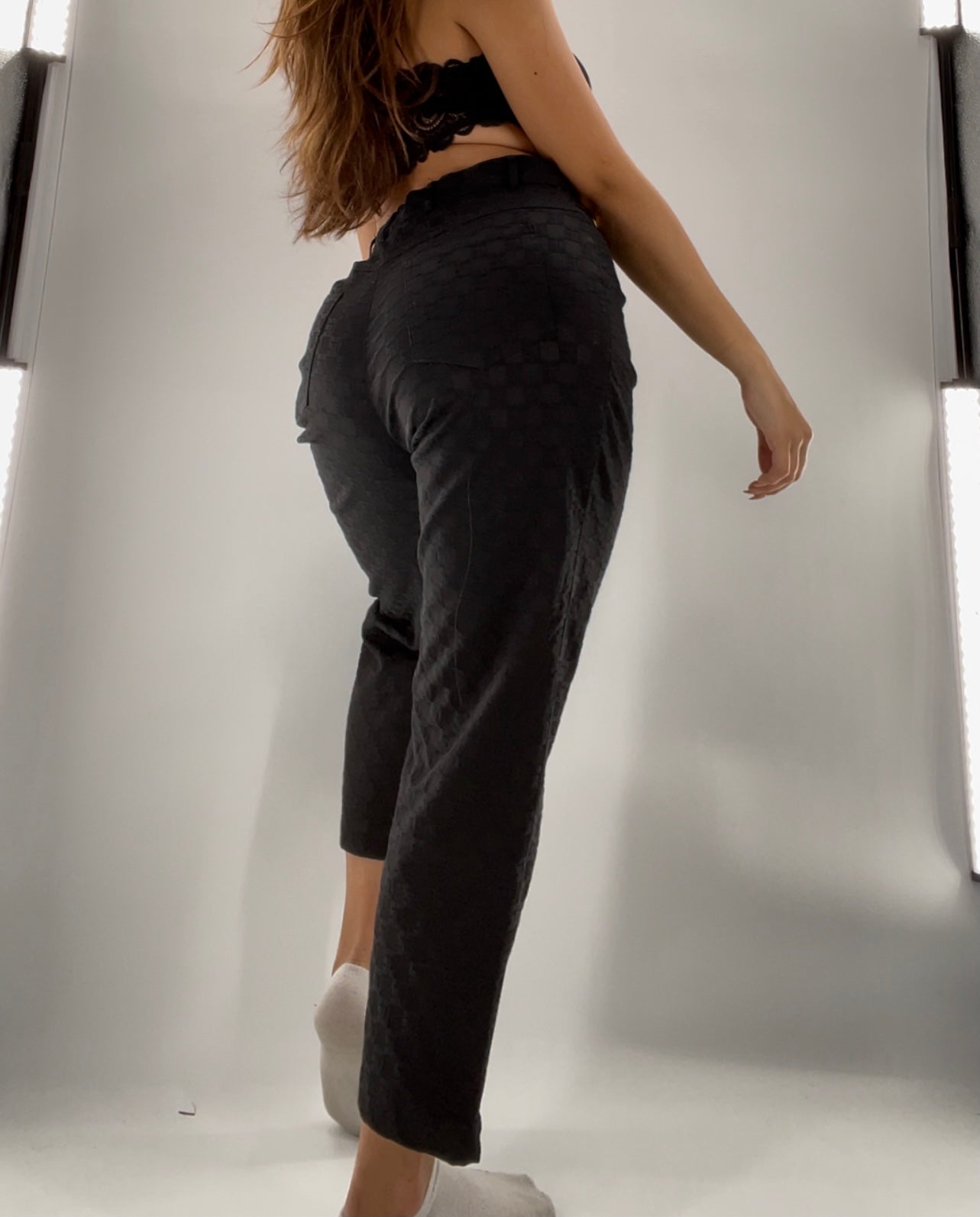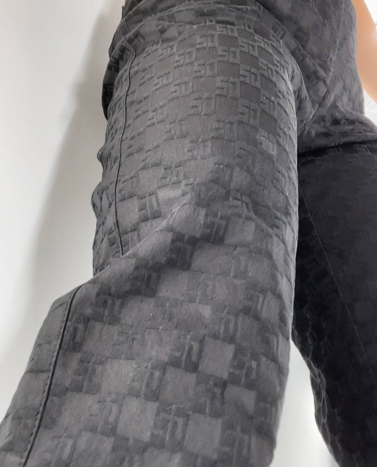Vintage SAINT JOHN satin black high waisted, All over SJ checker printed trousers with gold button detailing