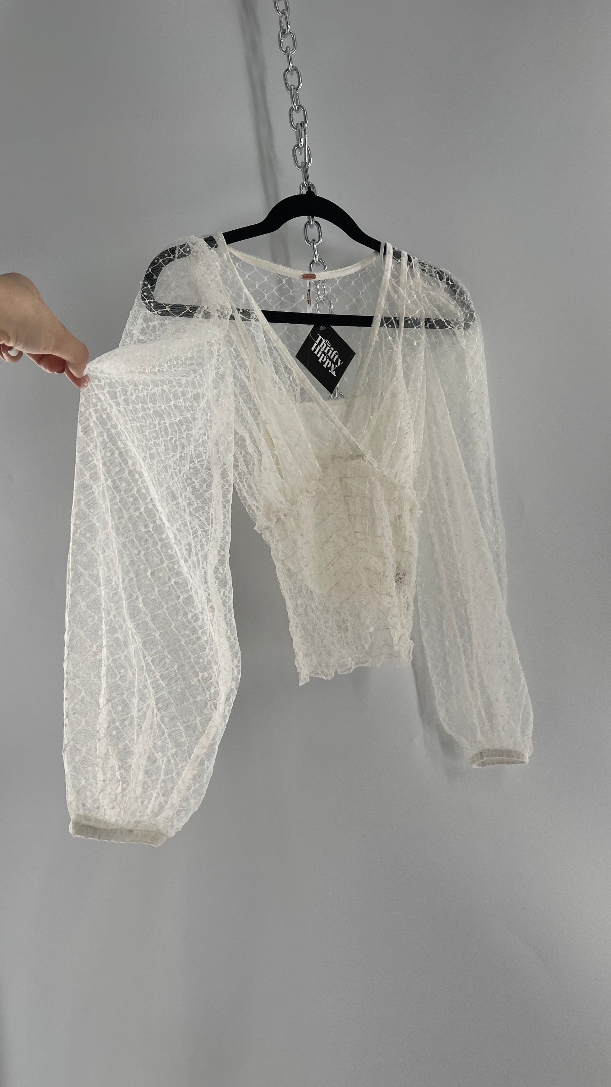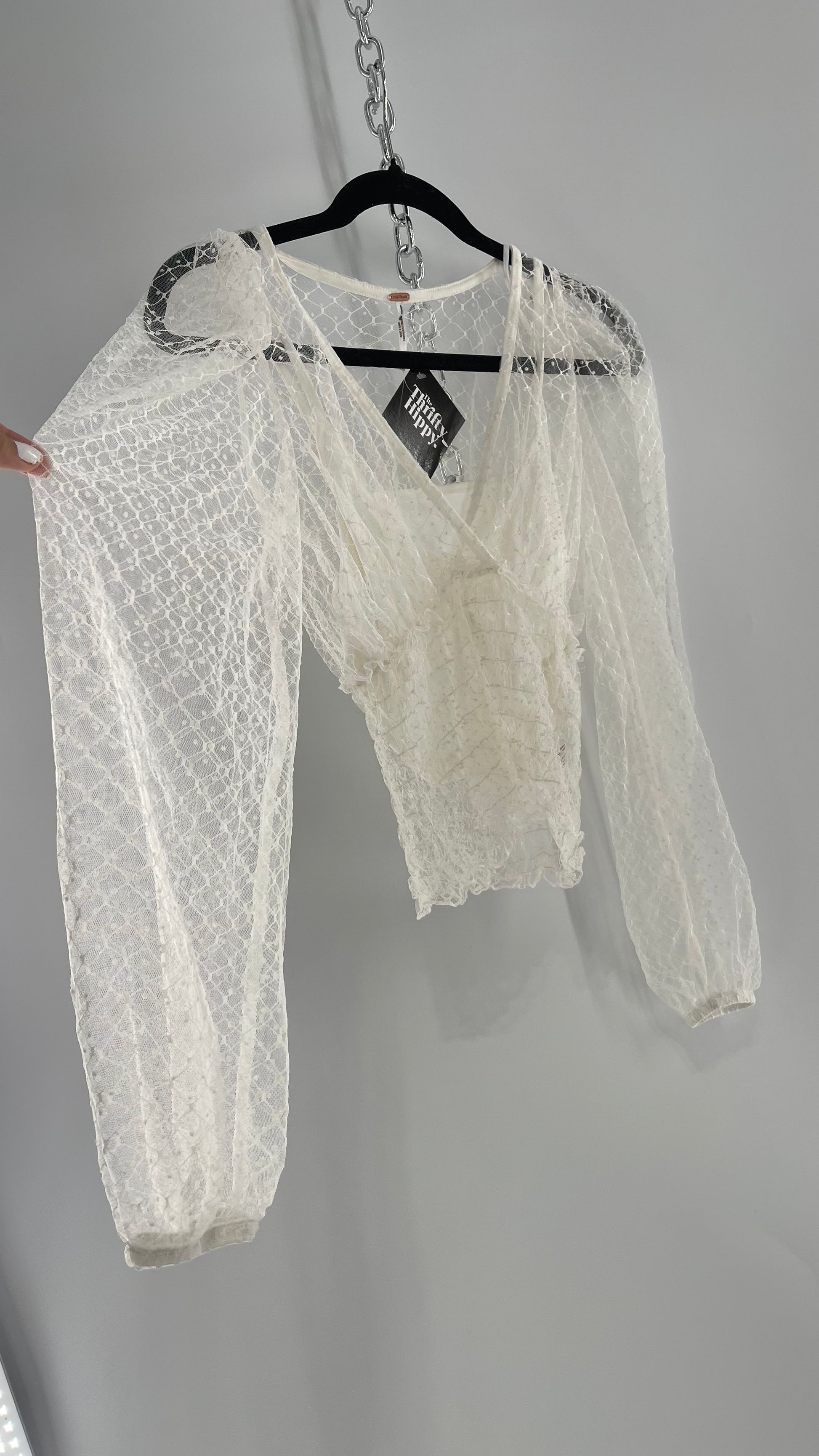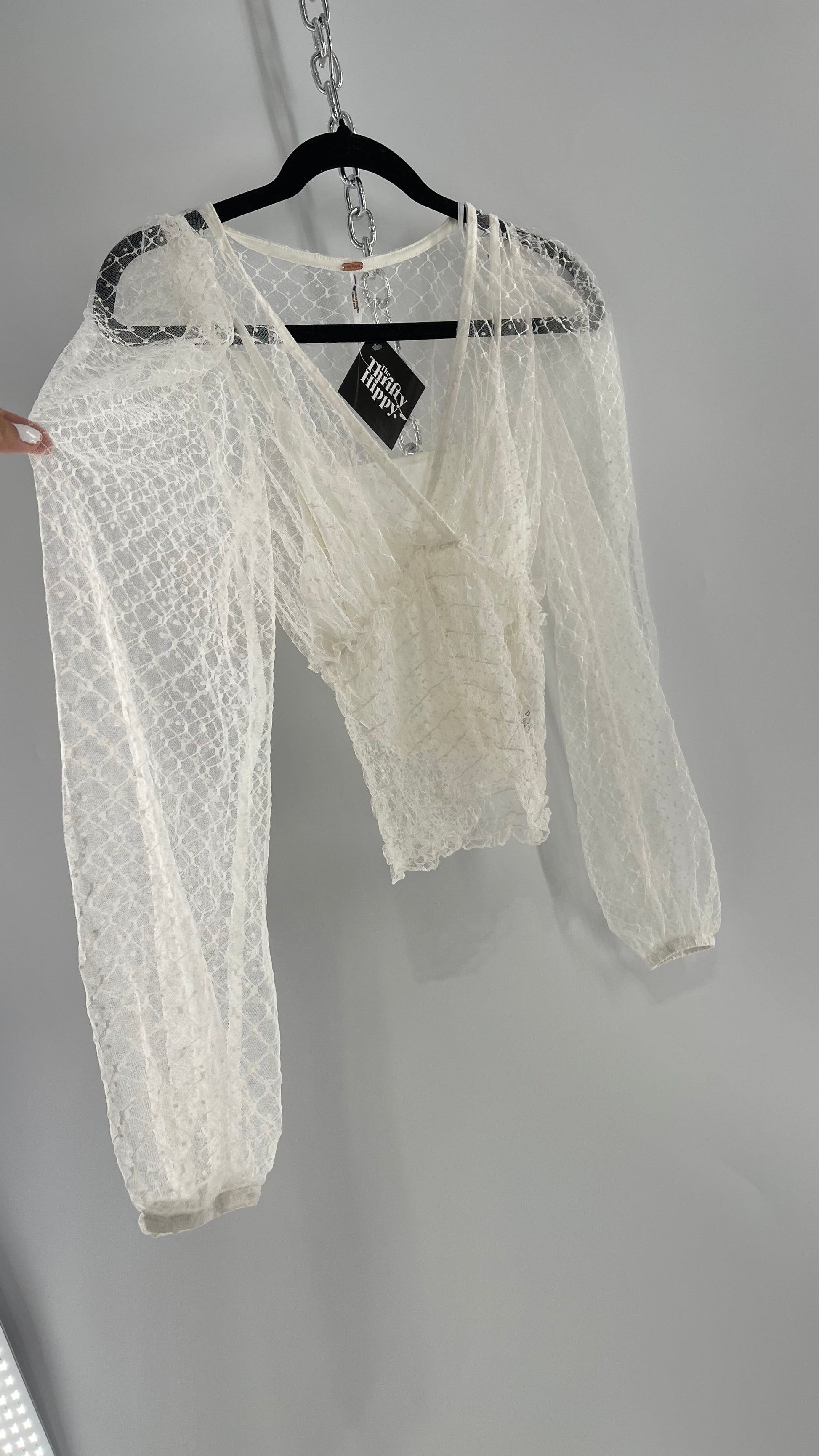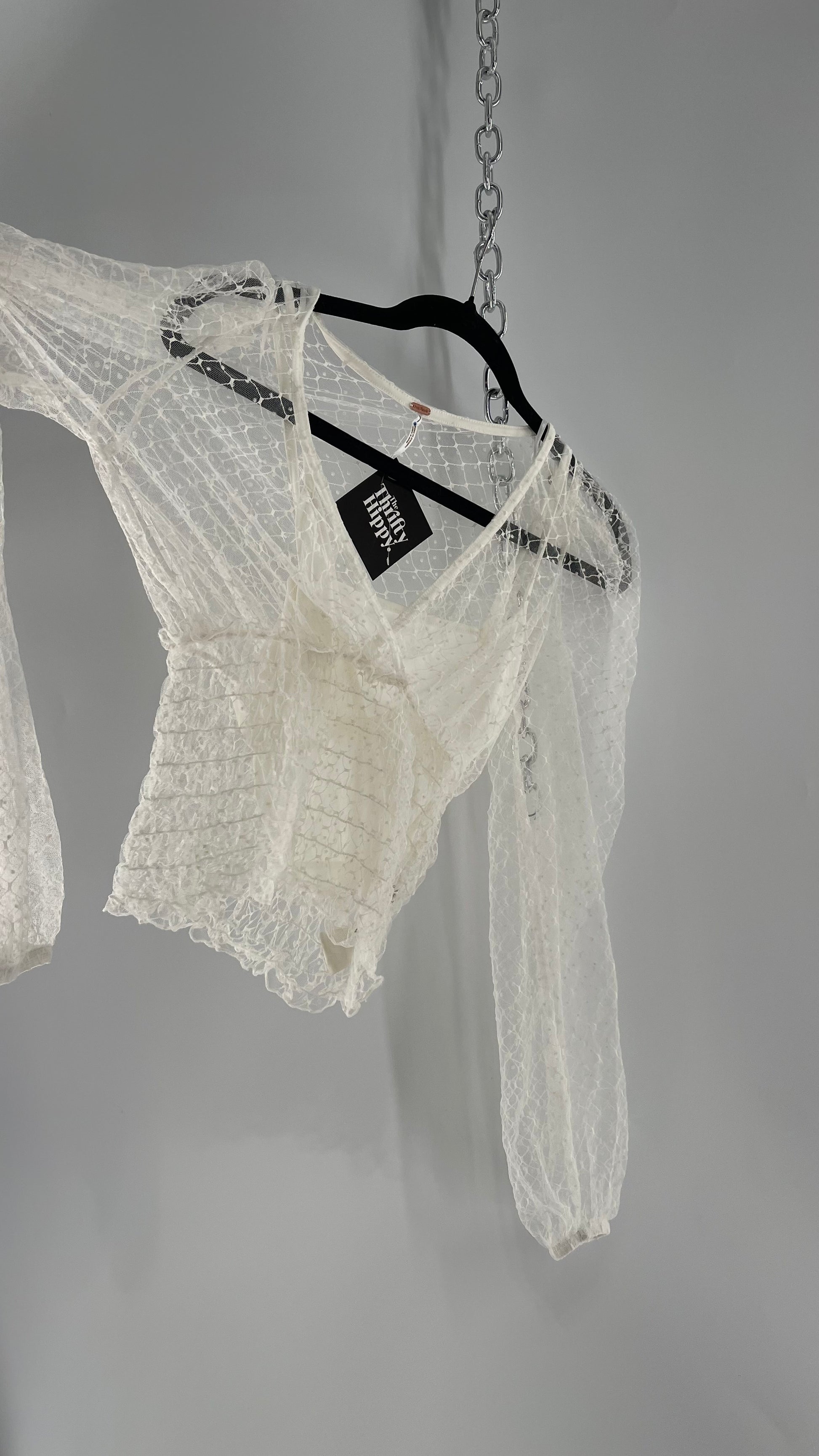 Free People White Embroidered Mesh Blouse with Keyhole Back and Balloon Sleeves
