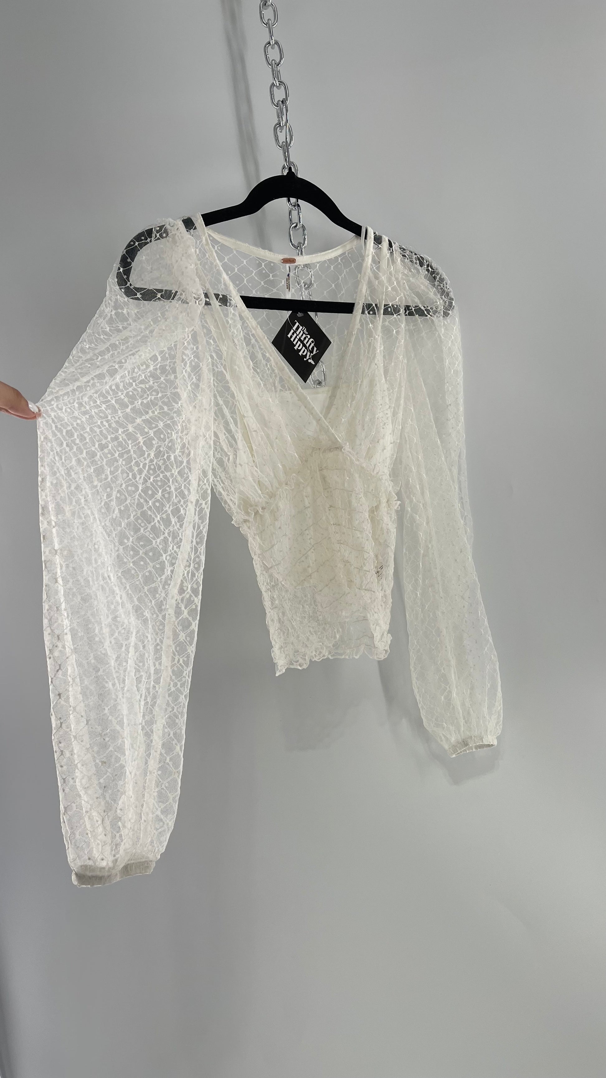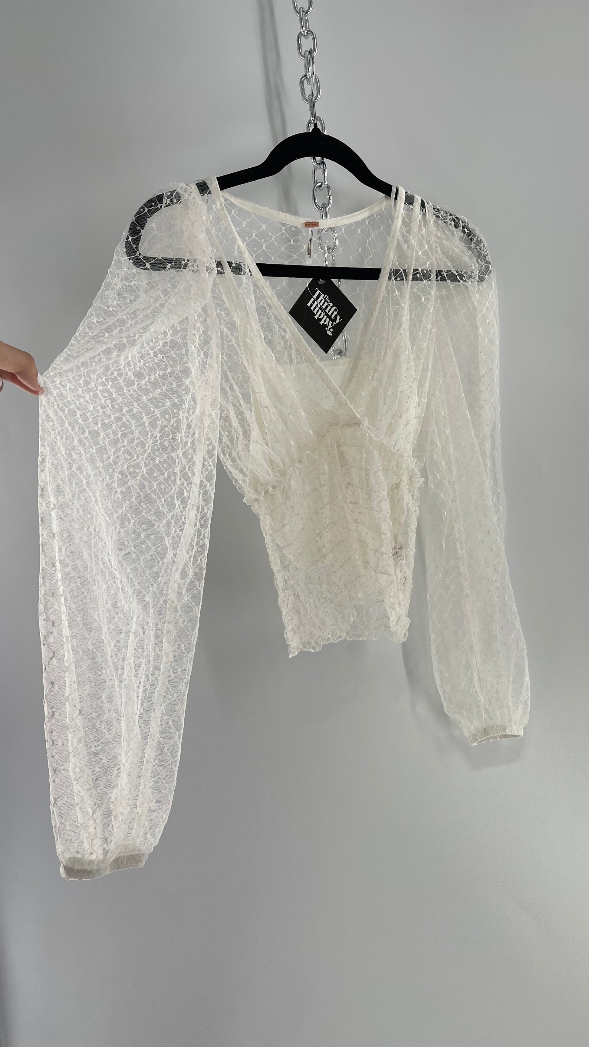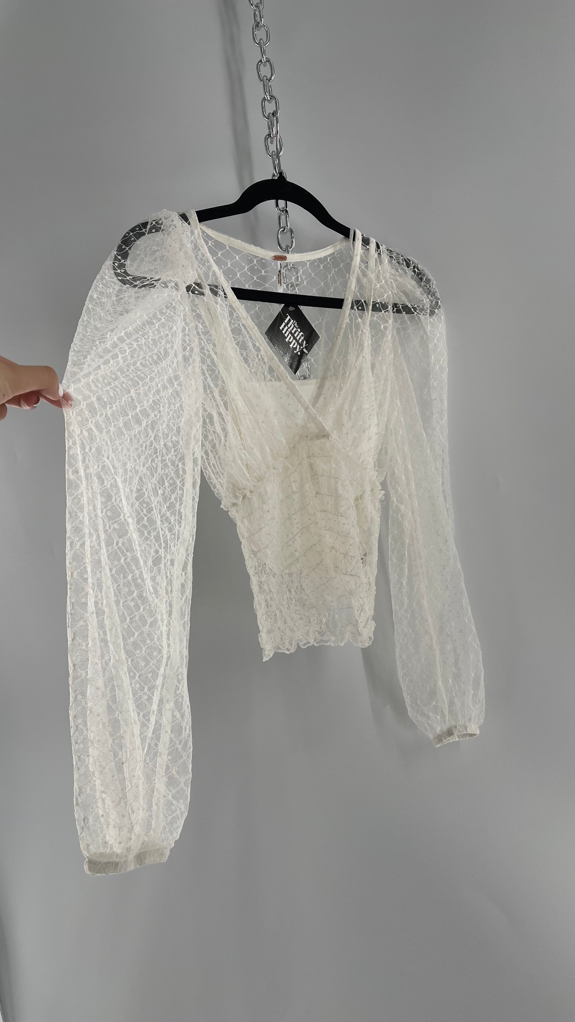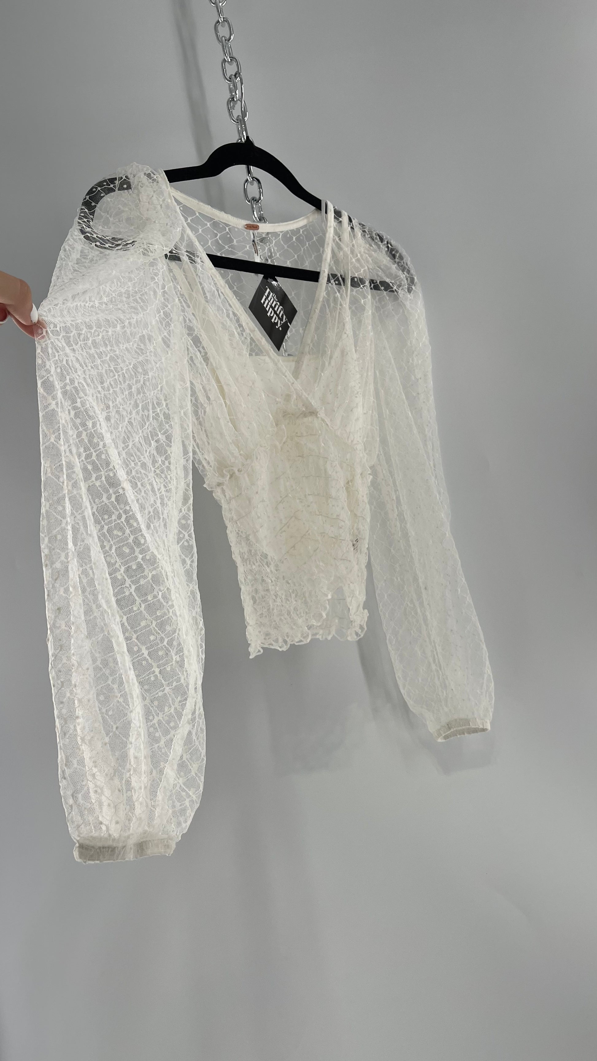 Free People White Embroidered Mesh Blouse with Keyhole Back and Balloon Sleeves