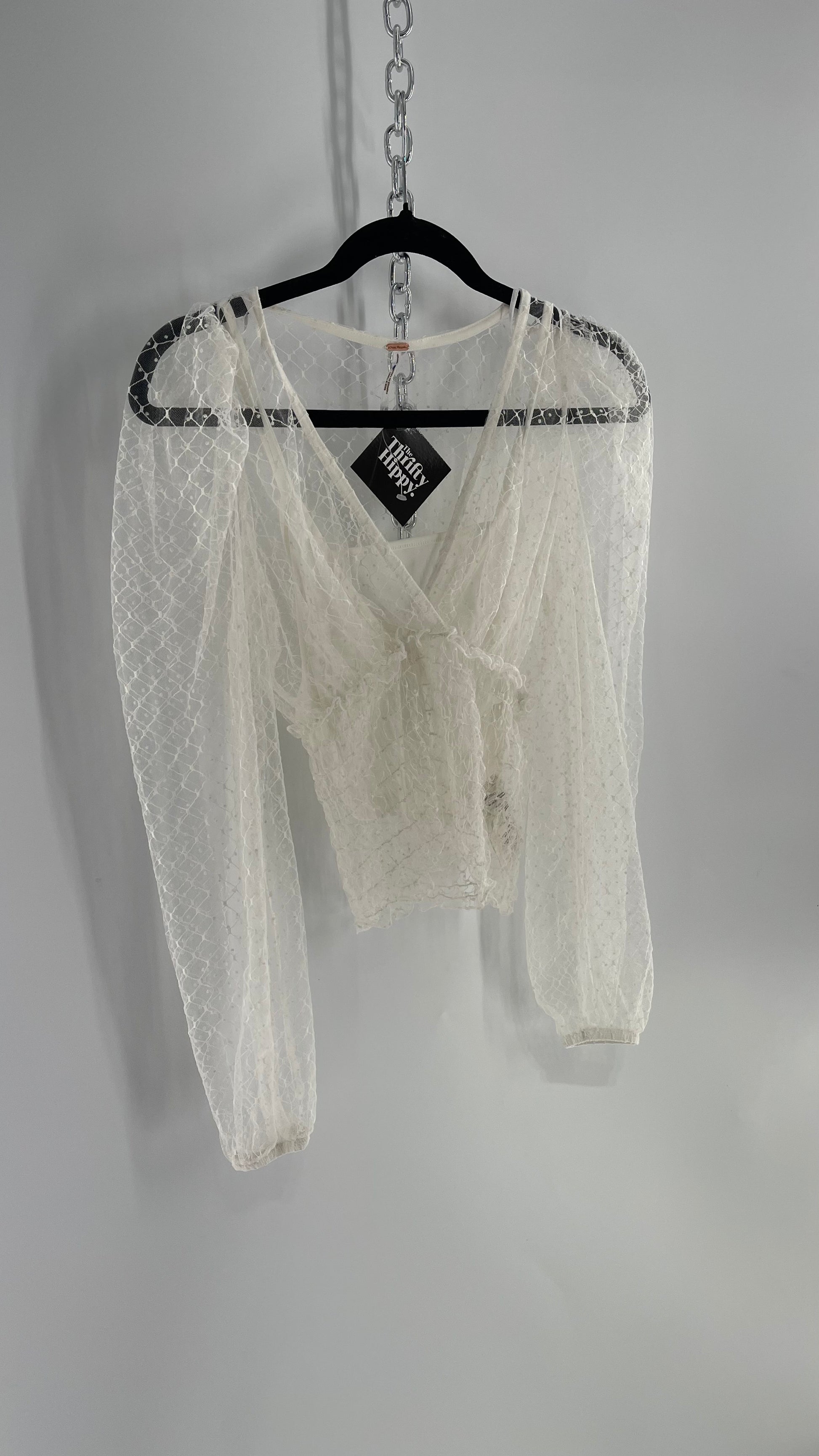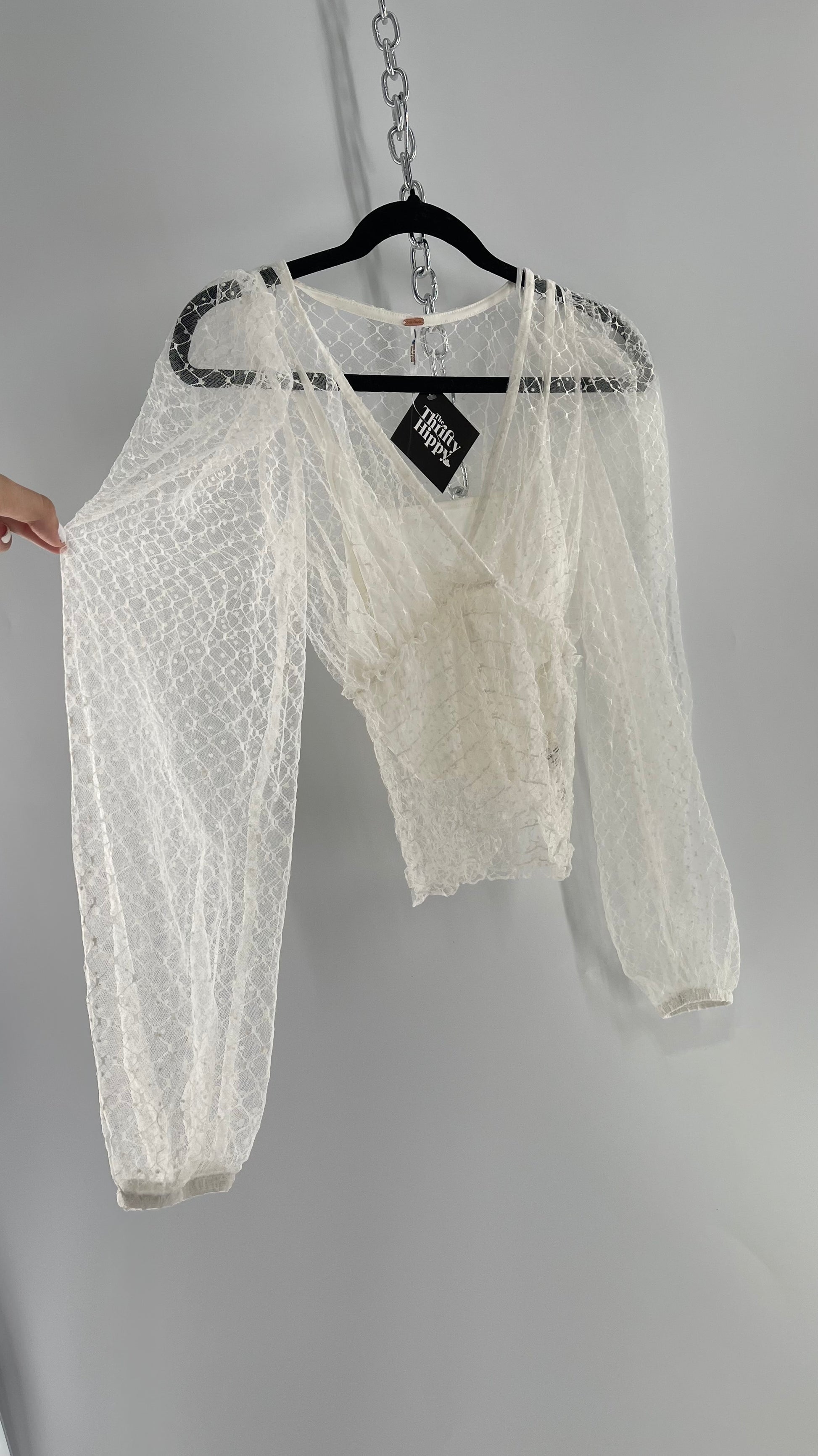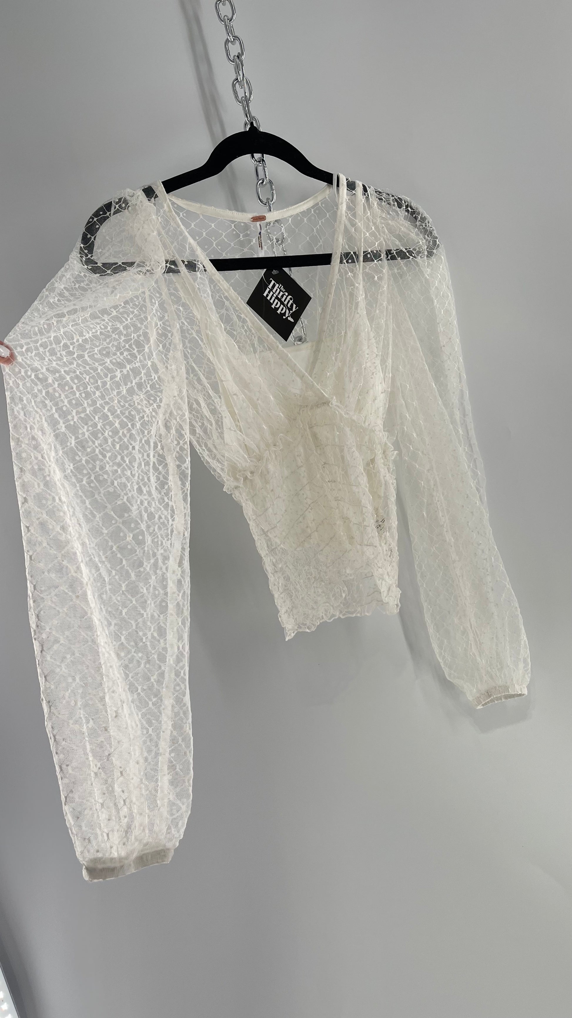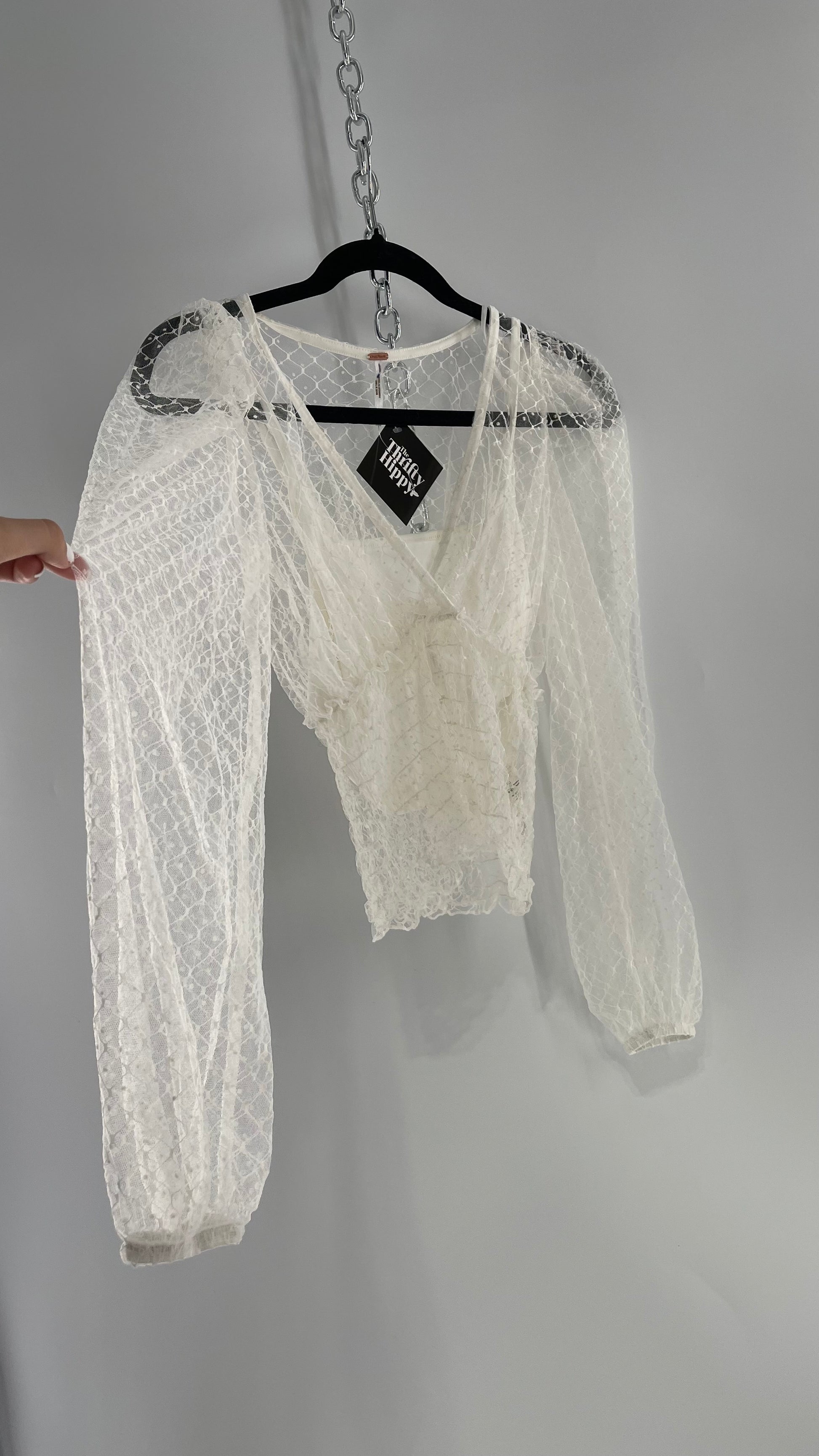 Free People White Embroidered Mesh Blouse with Keyhole Back and Balloon Sleeves
