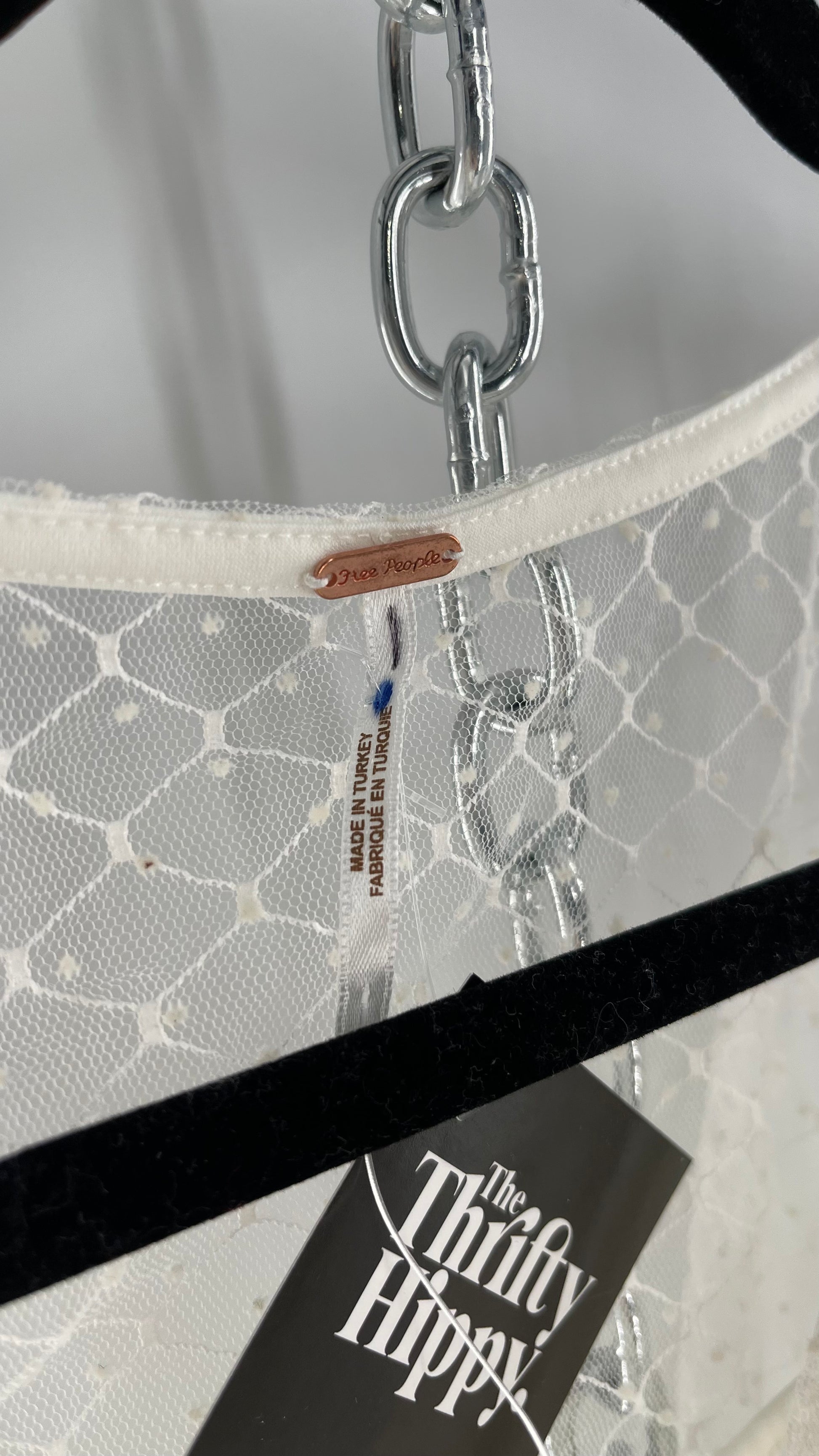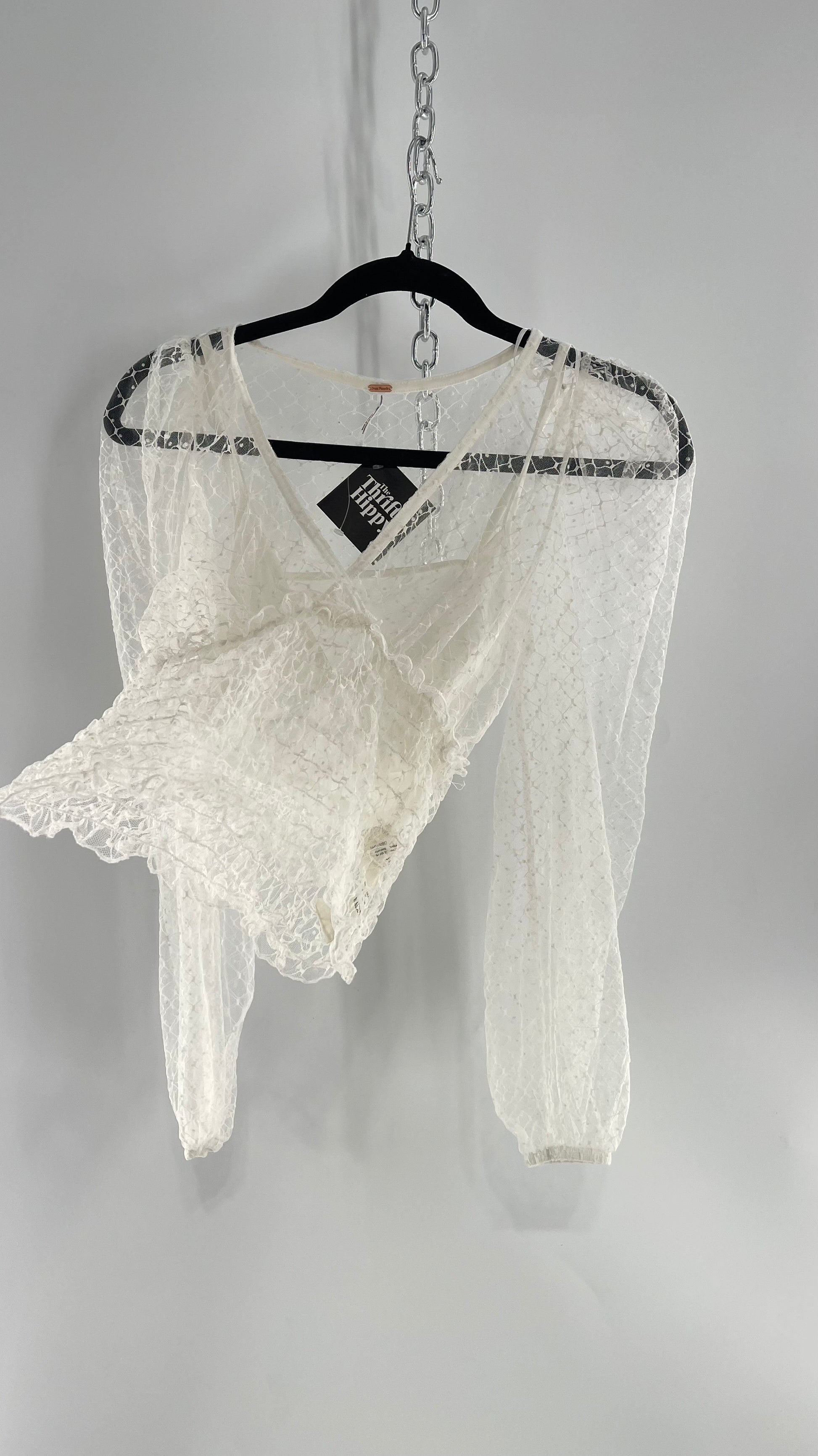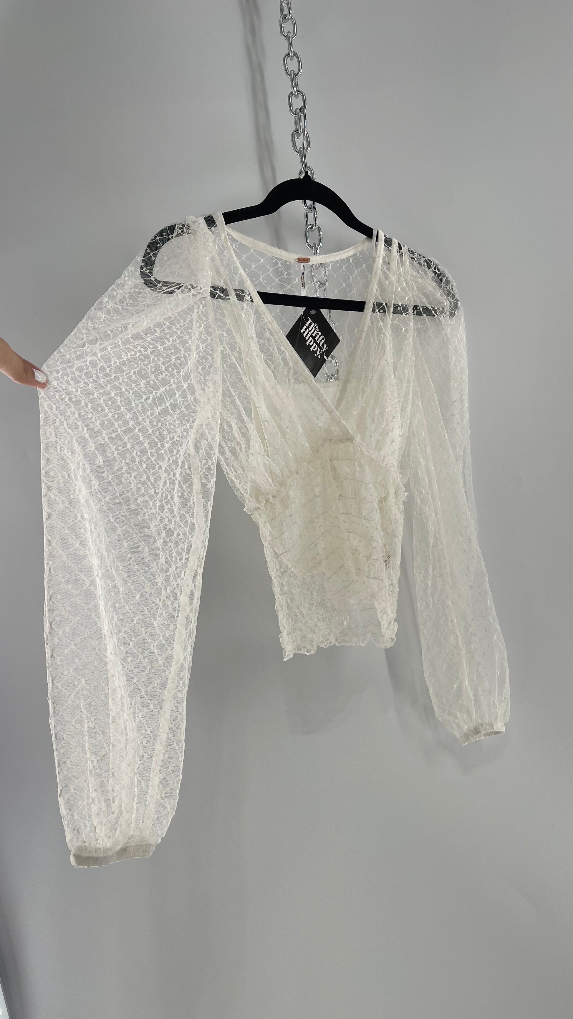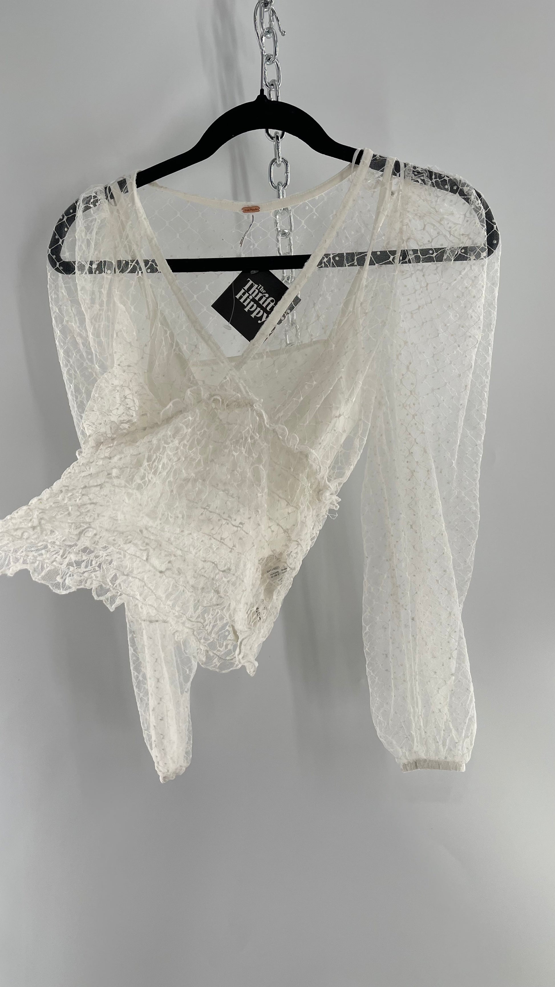 Free People White Embroidered Mesh Blouse with Keyhole Back and Balloon Sleeves