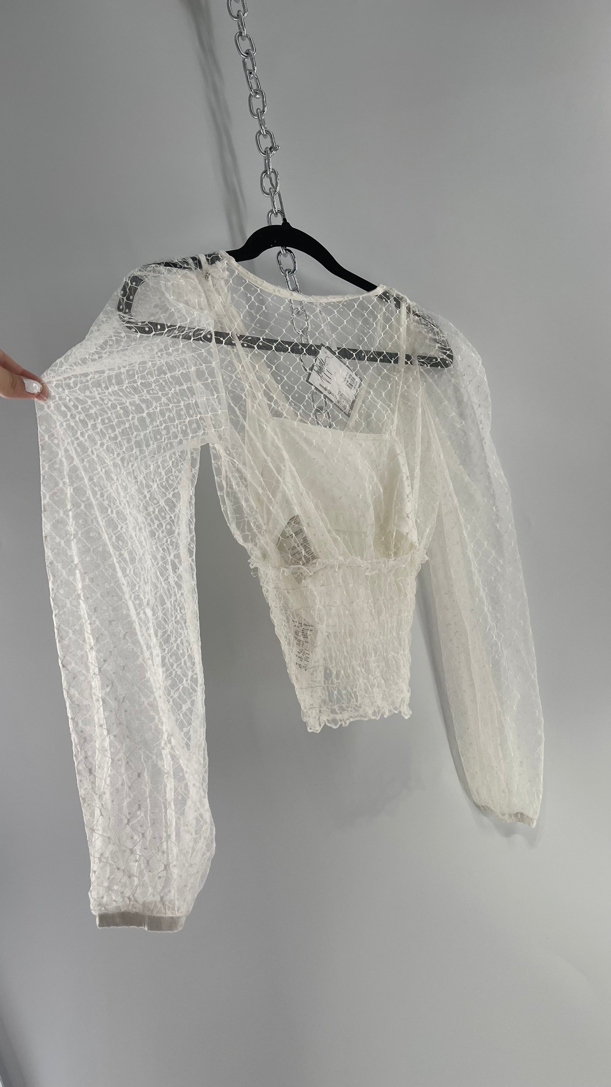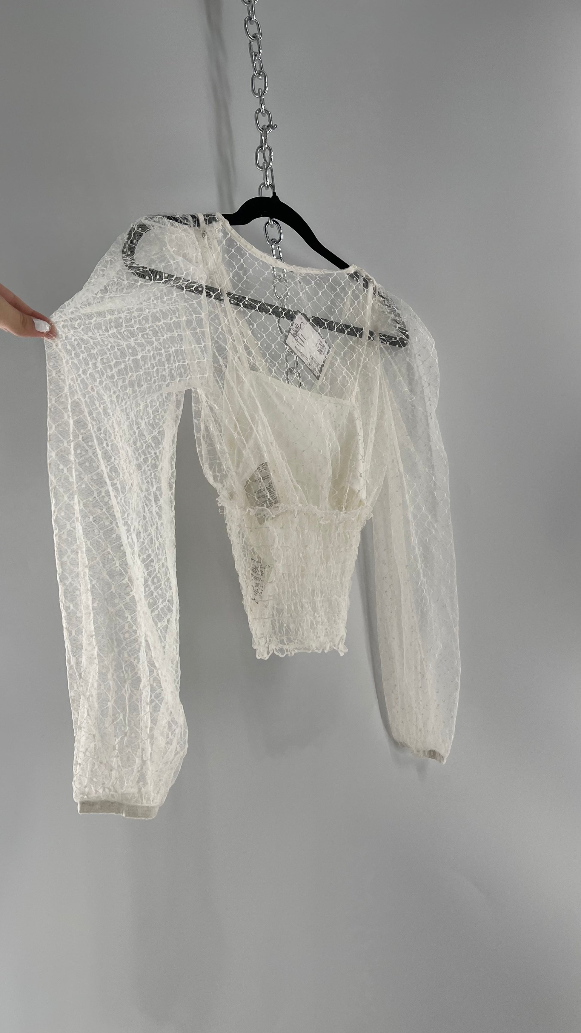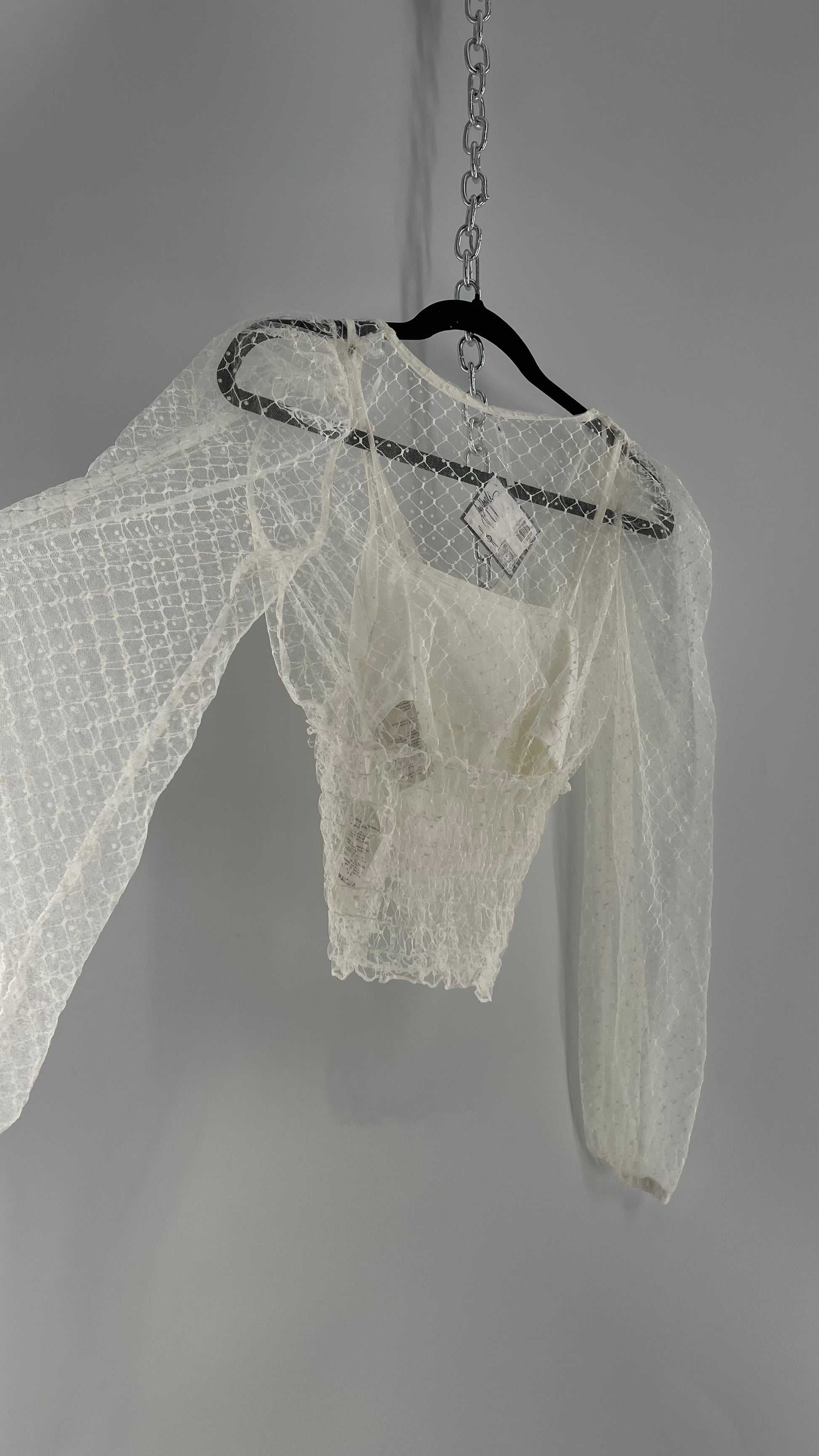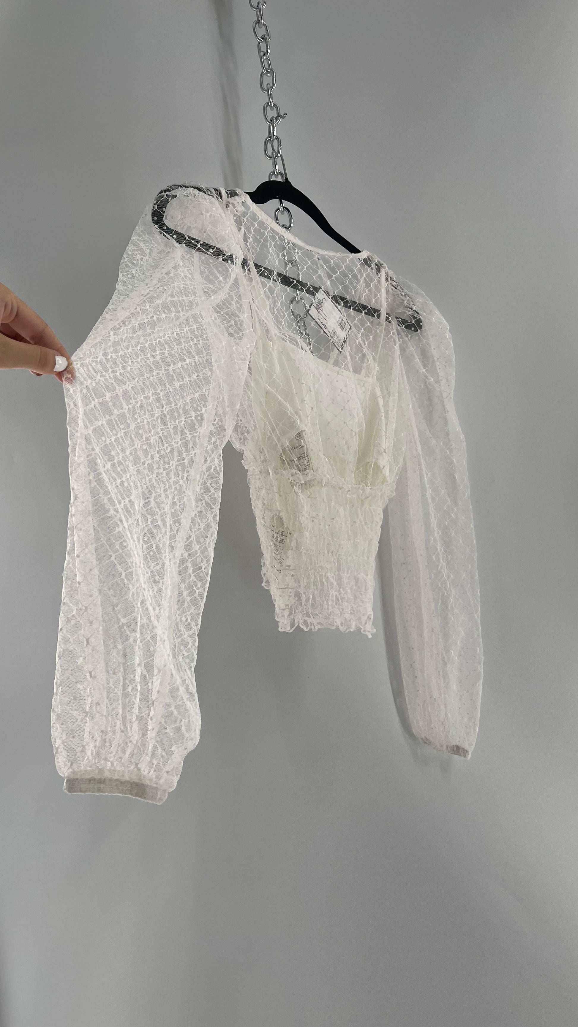 Free People White Embroidered Mesh Blouse with Keyhole Back and Balloon Sleeves (XS)