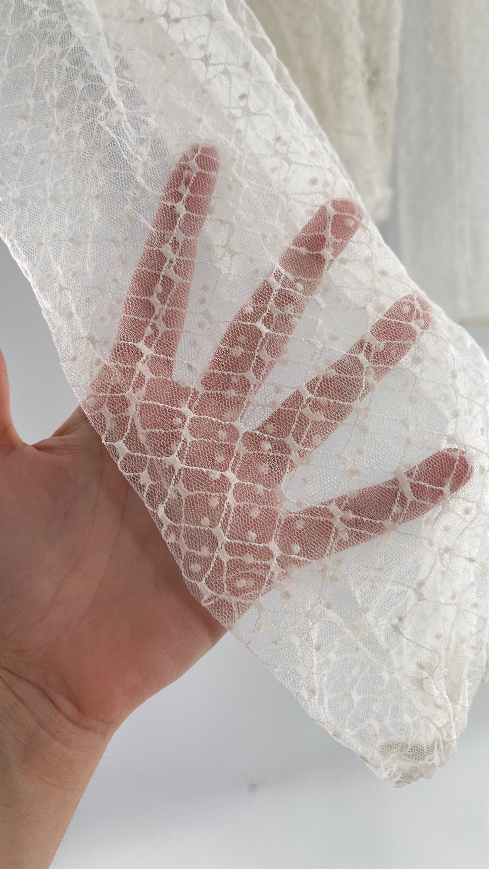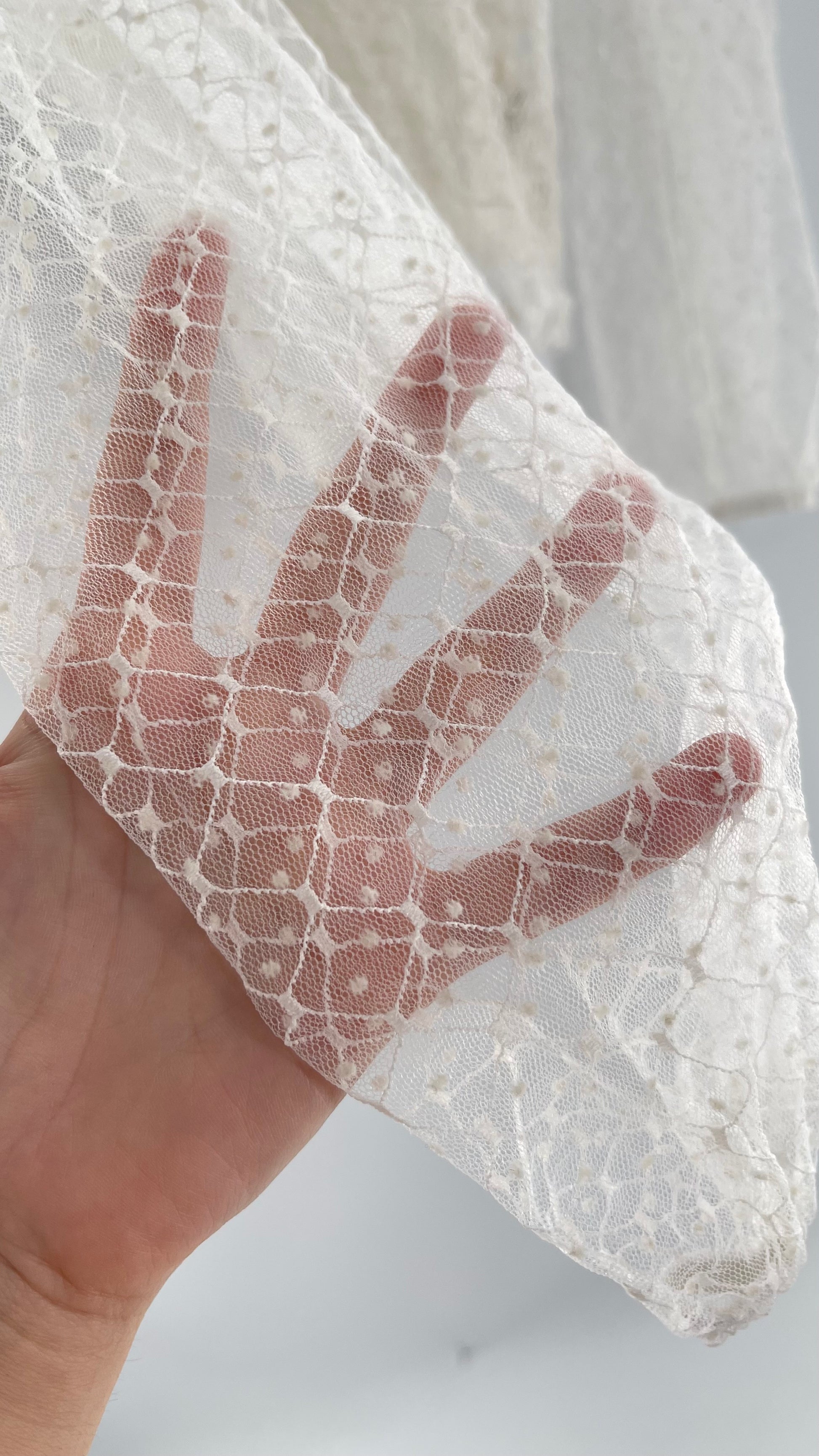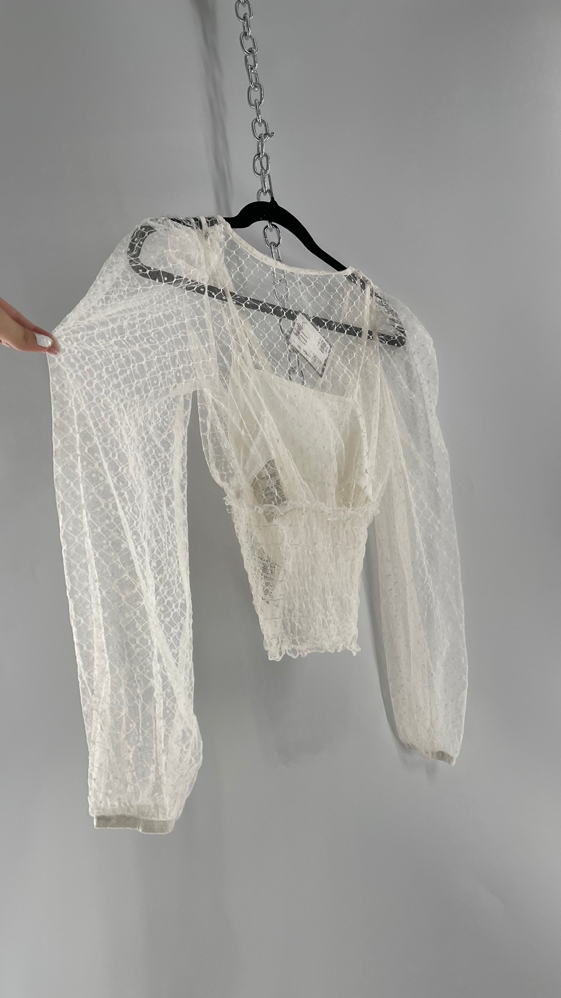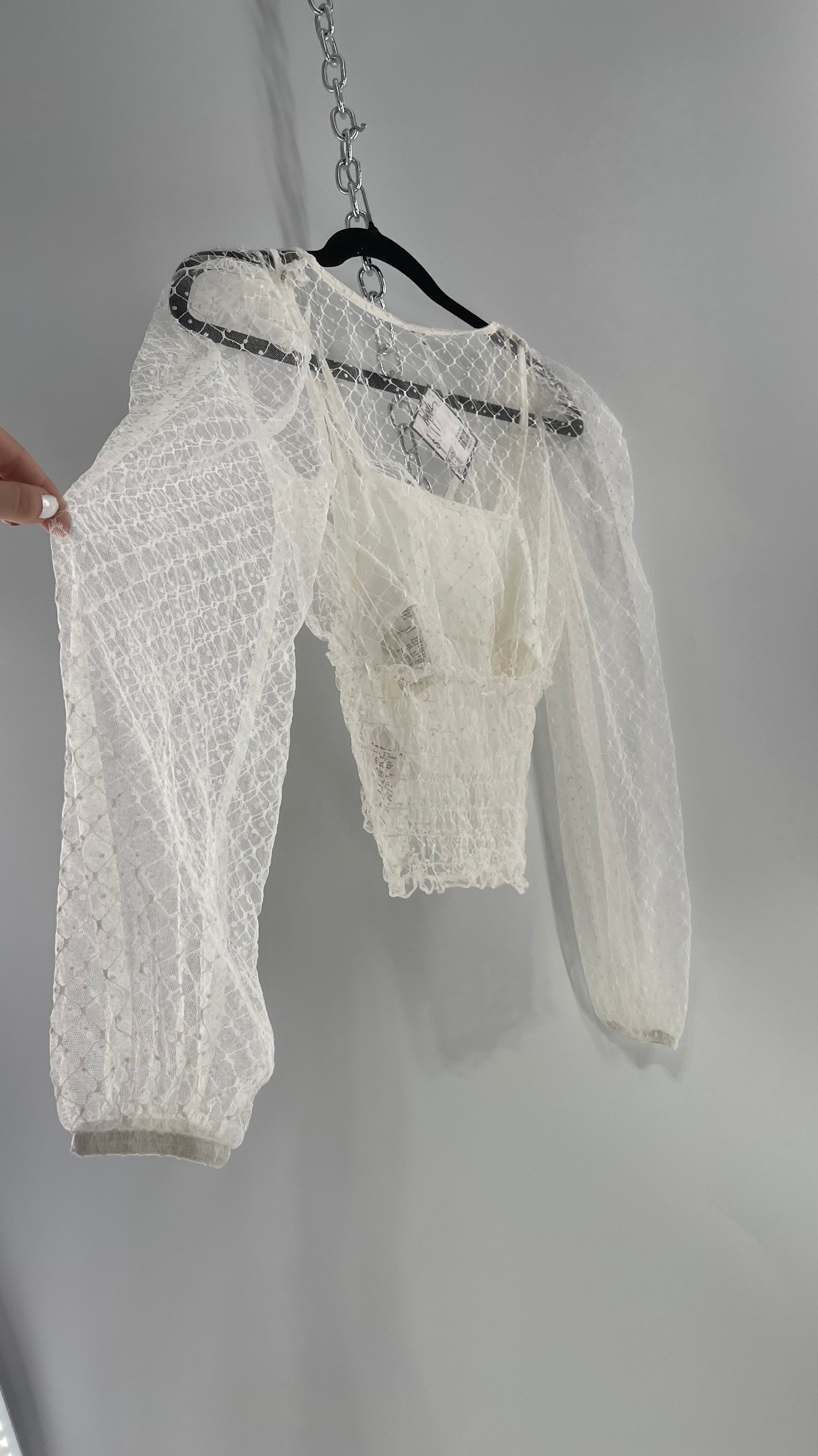 Free People White Embroidered Mesh Blouse with Keyhole Back and Balloon Sleeves (XS)