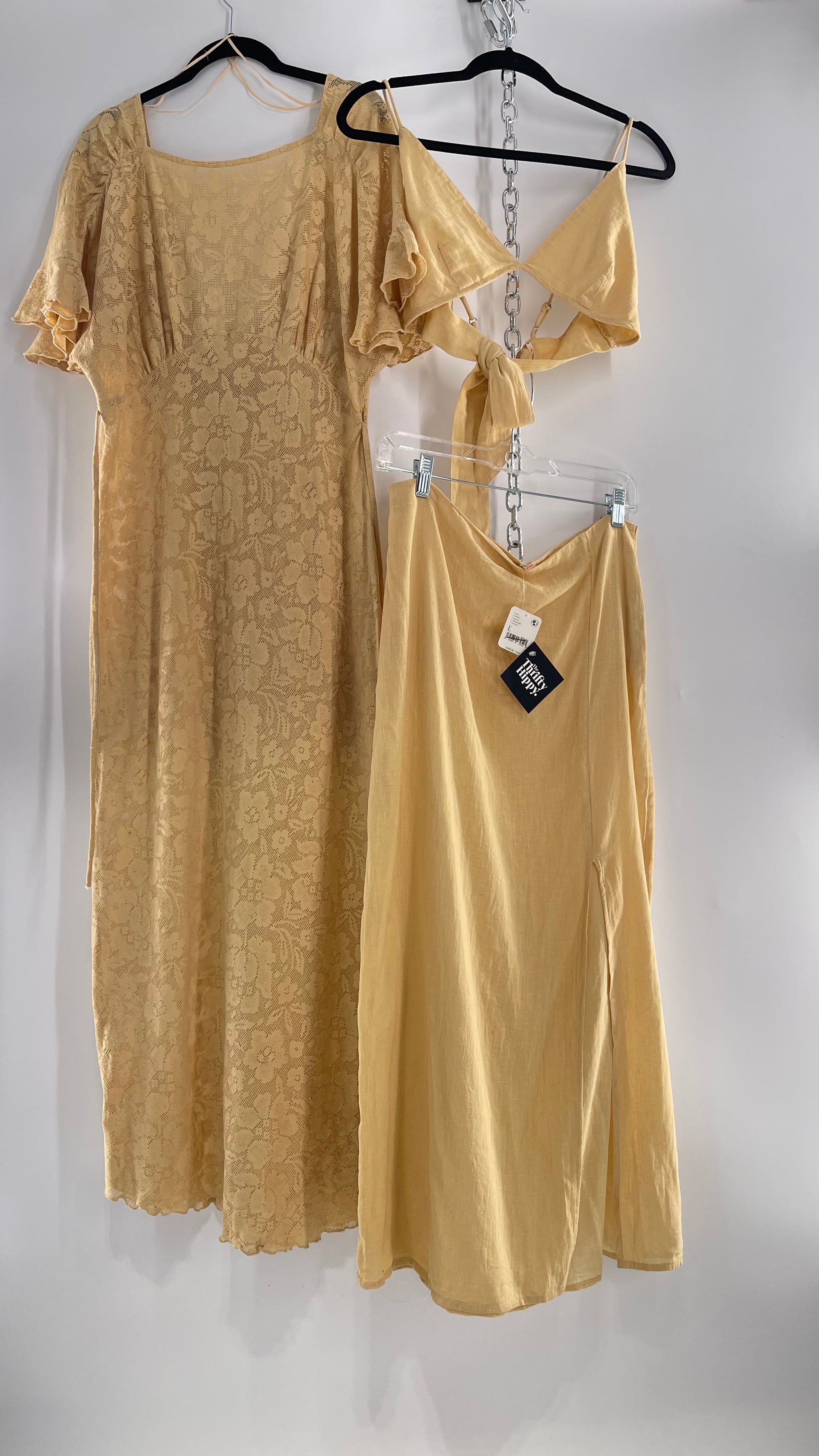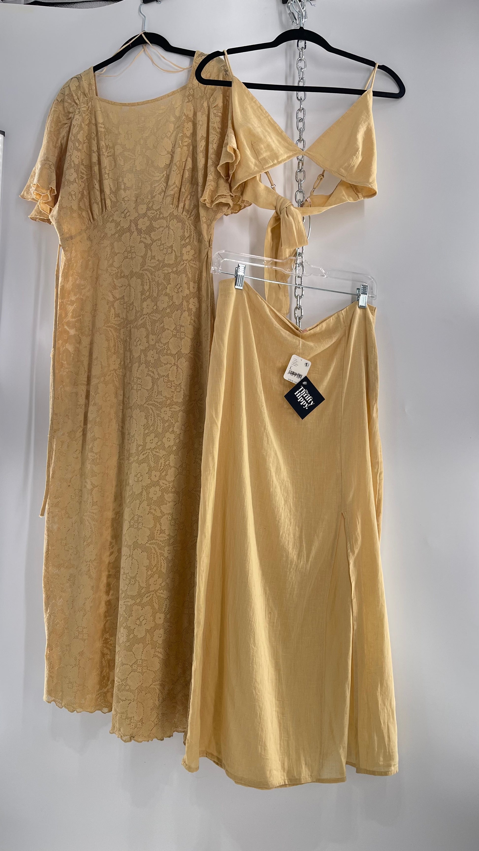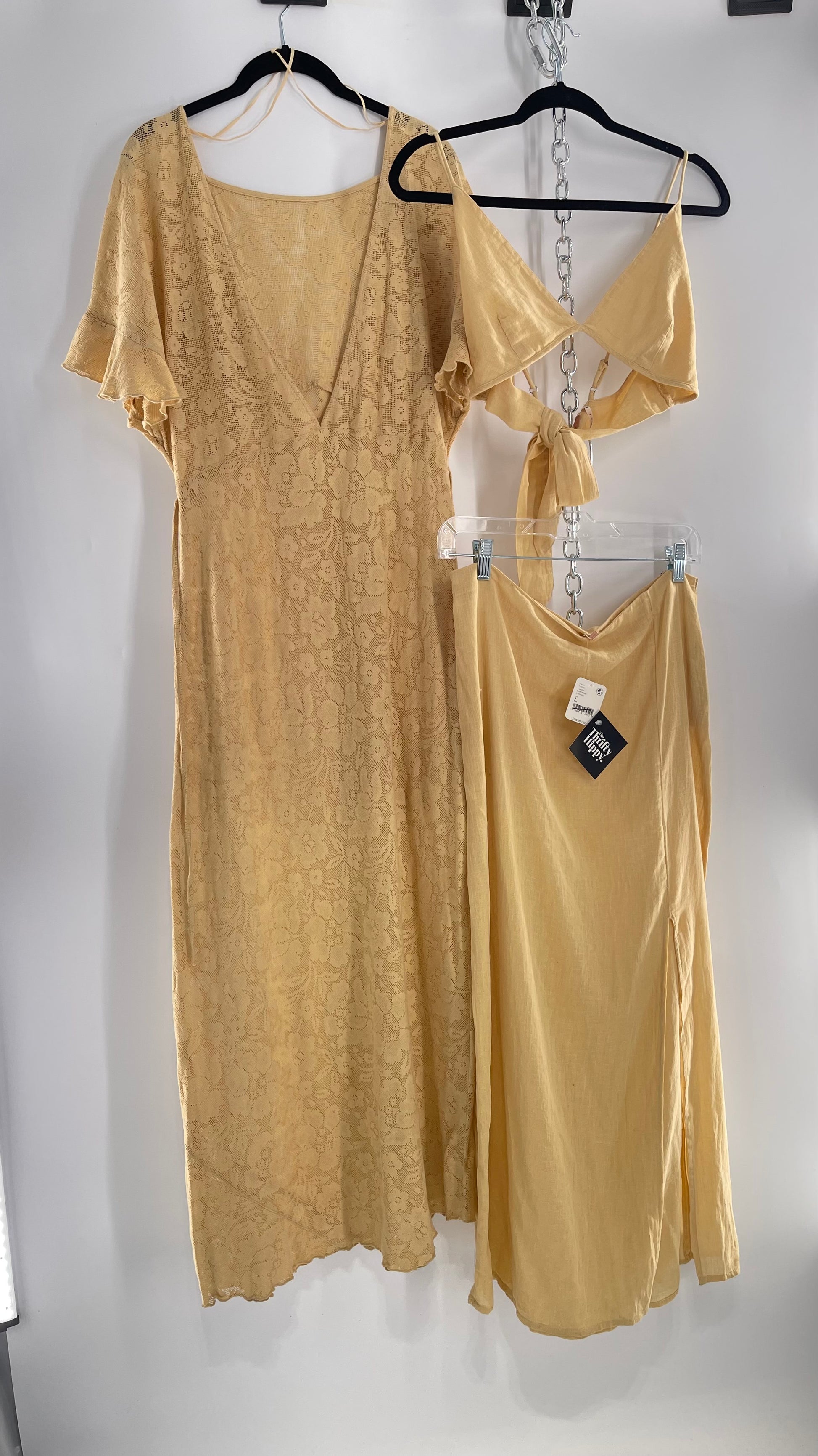 Free People Yellow Lace Gauze Maxi Dress Set with matching yellow Cotton bra and long skirt (Large)