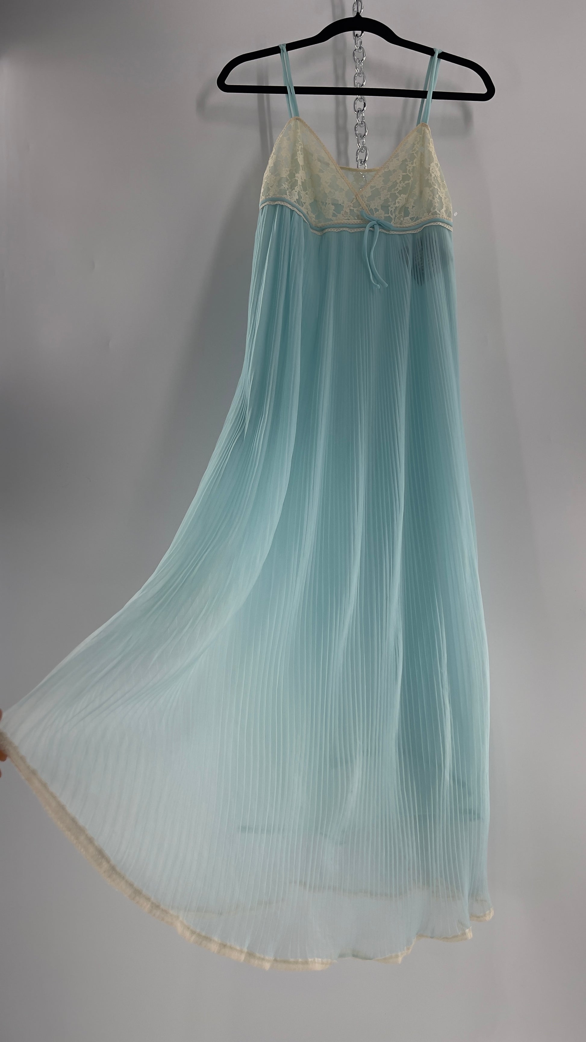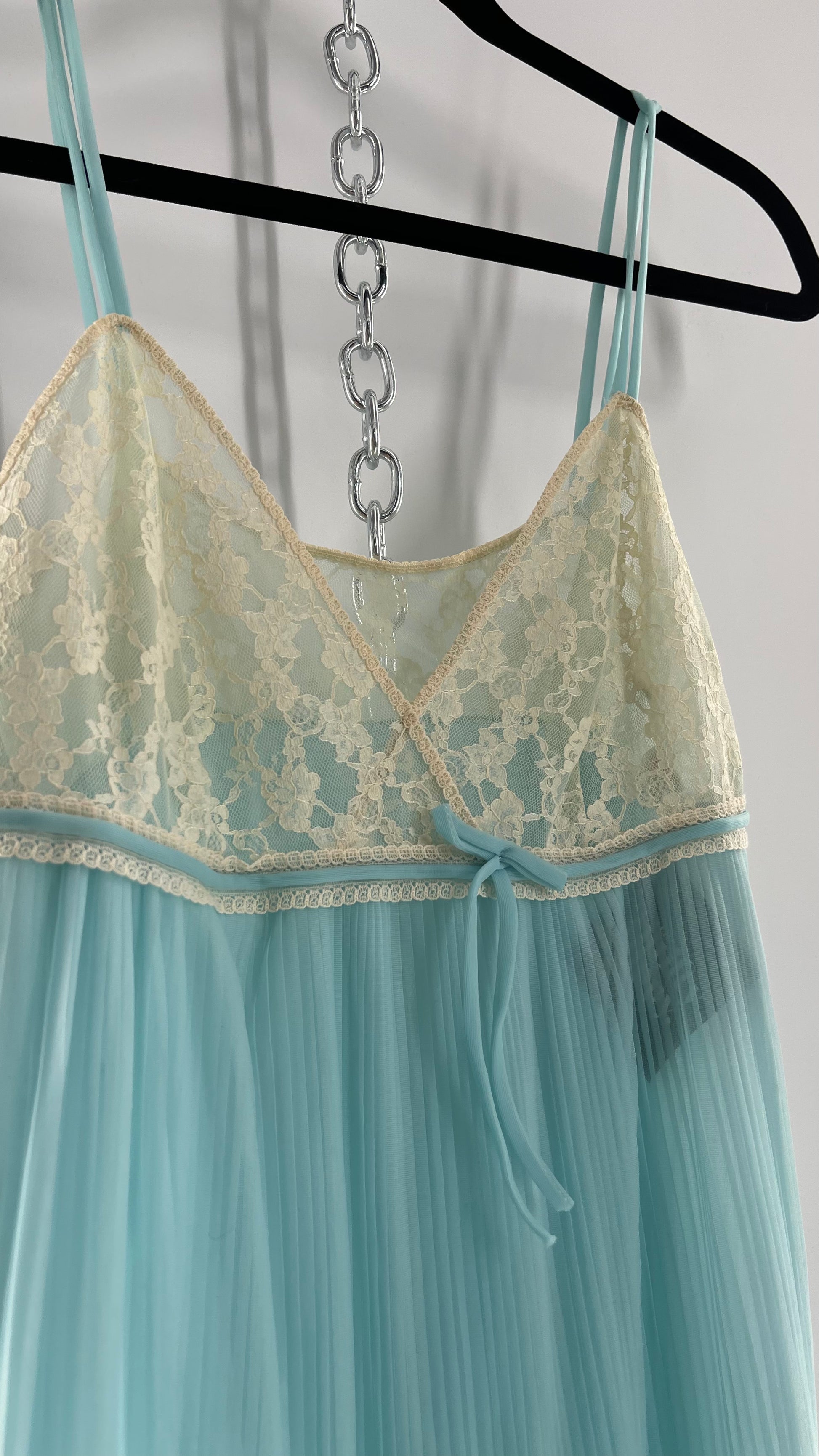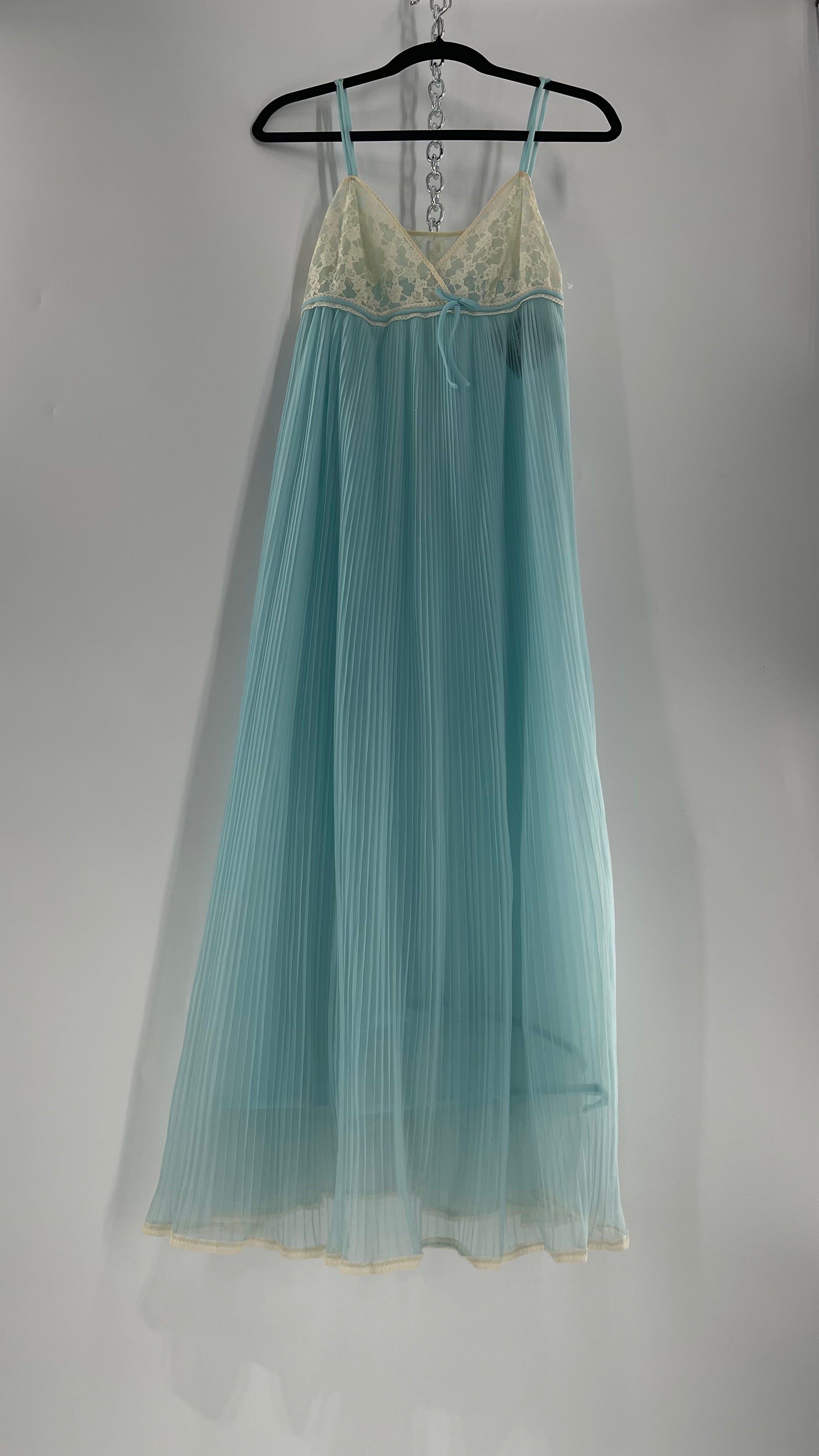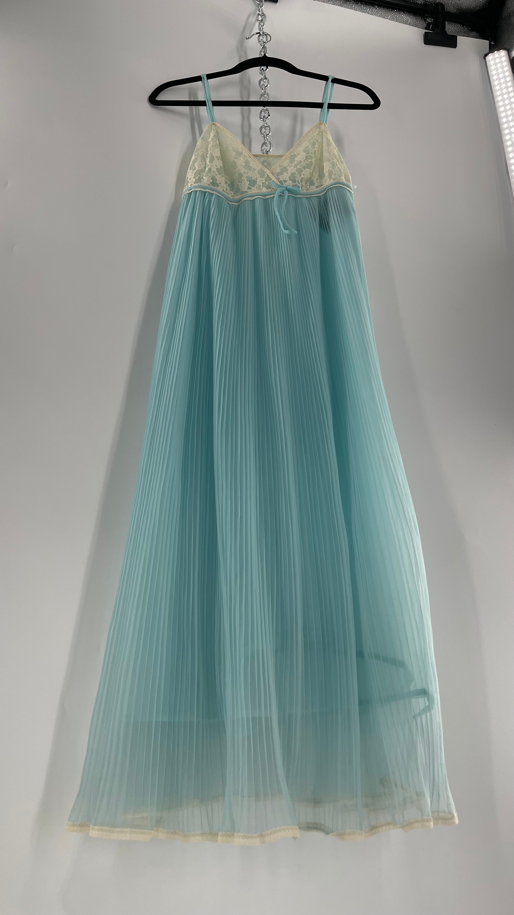 Vintage 1960s baby blue nightgown maxi dress with lace bust and pleated body