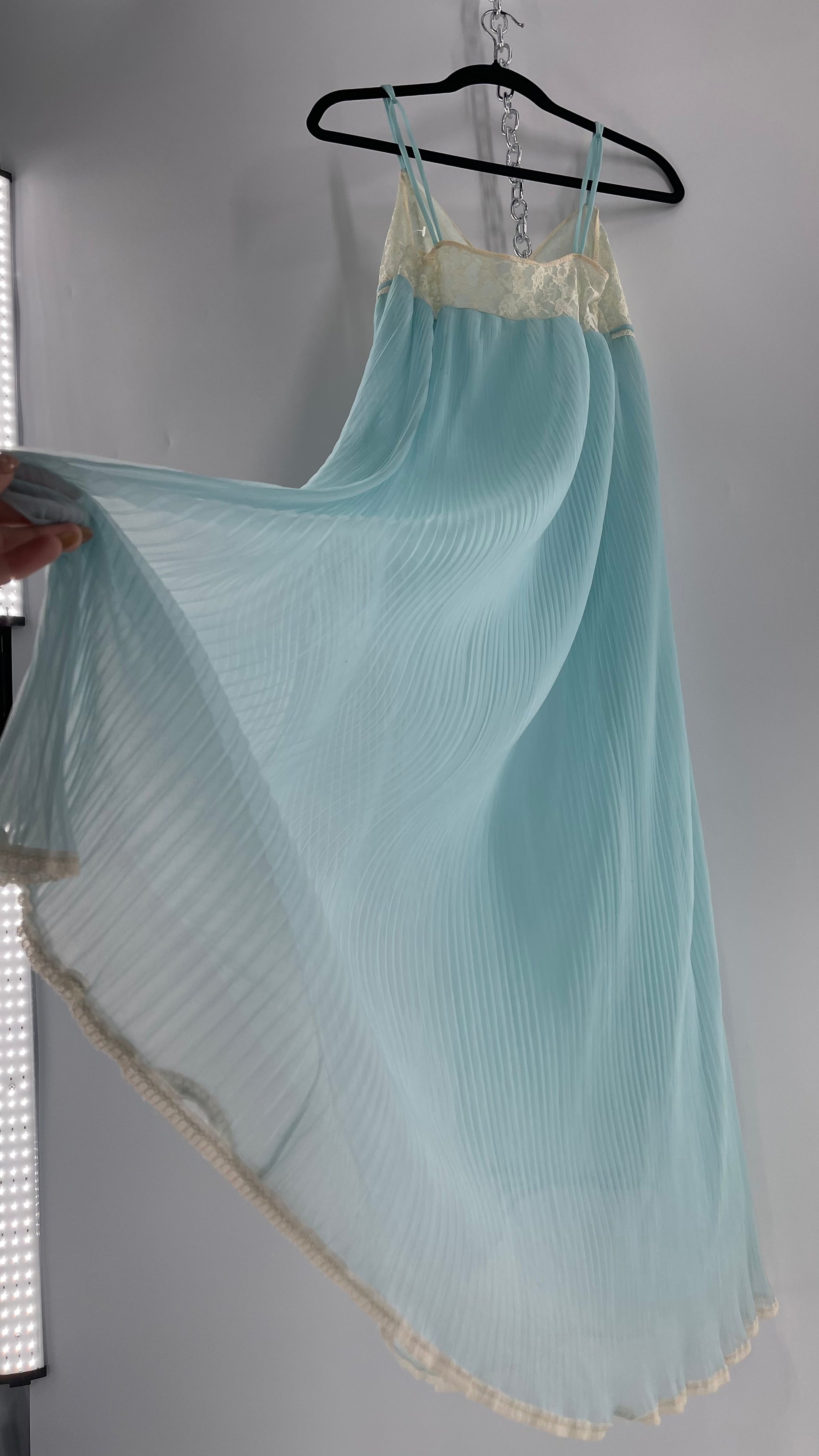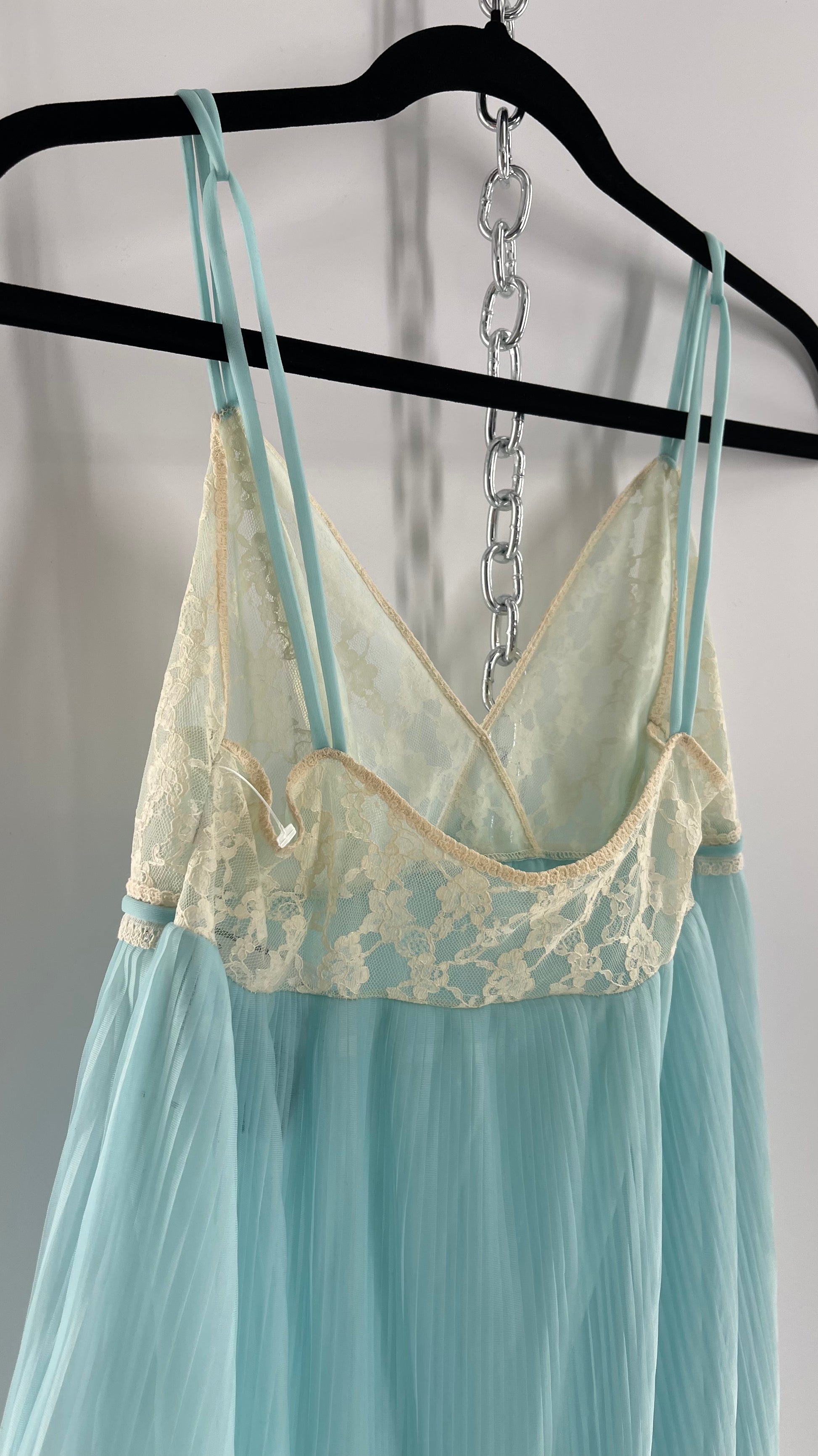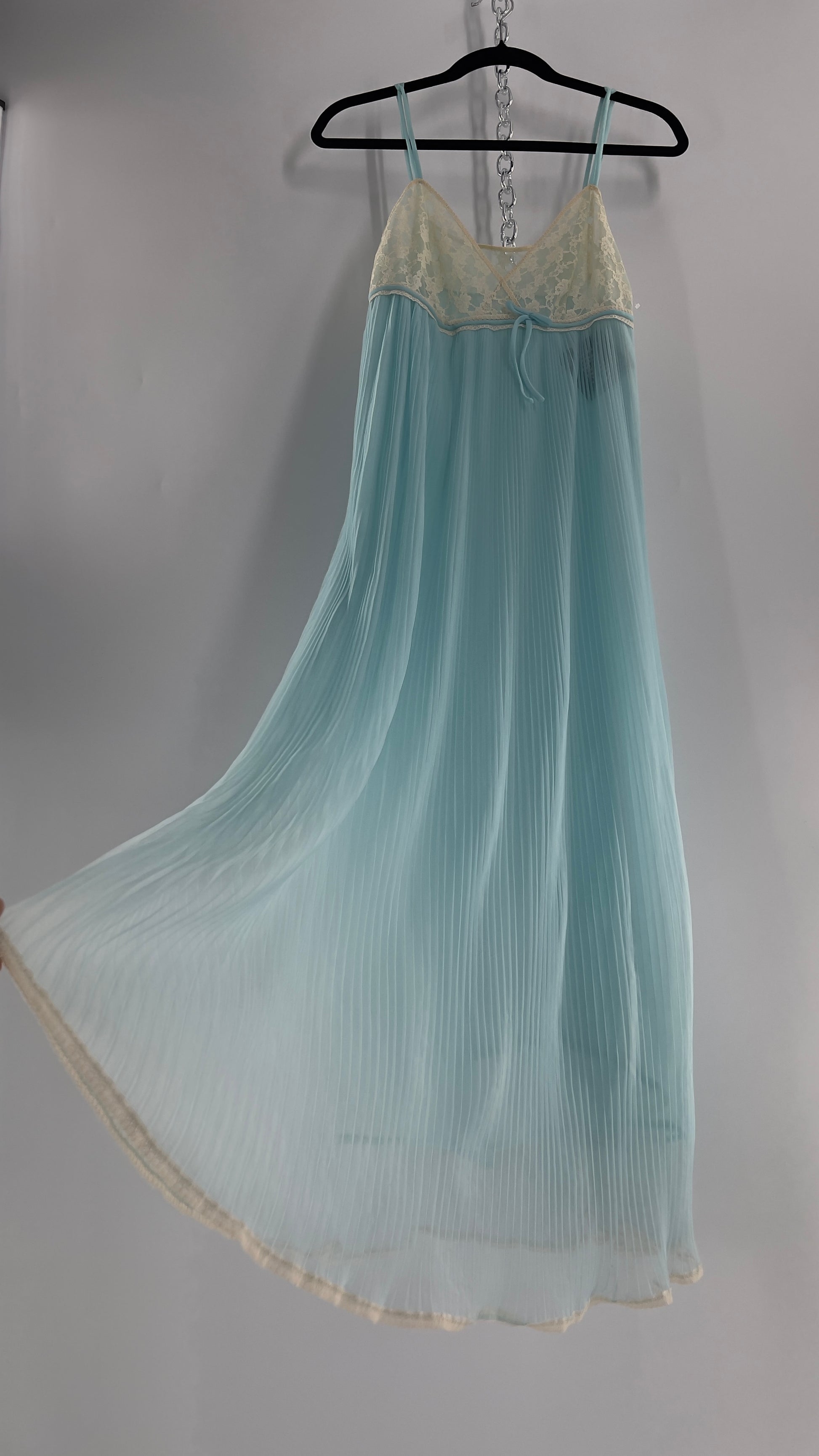Vintage 1960s baby blue nightgown maxi dress with lace bust and pleated body