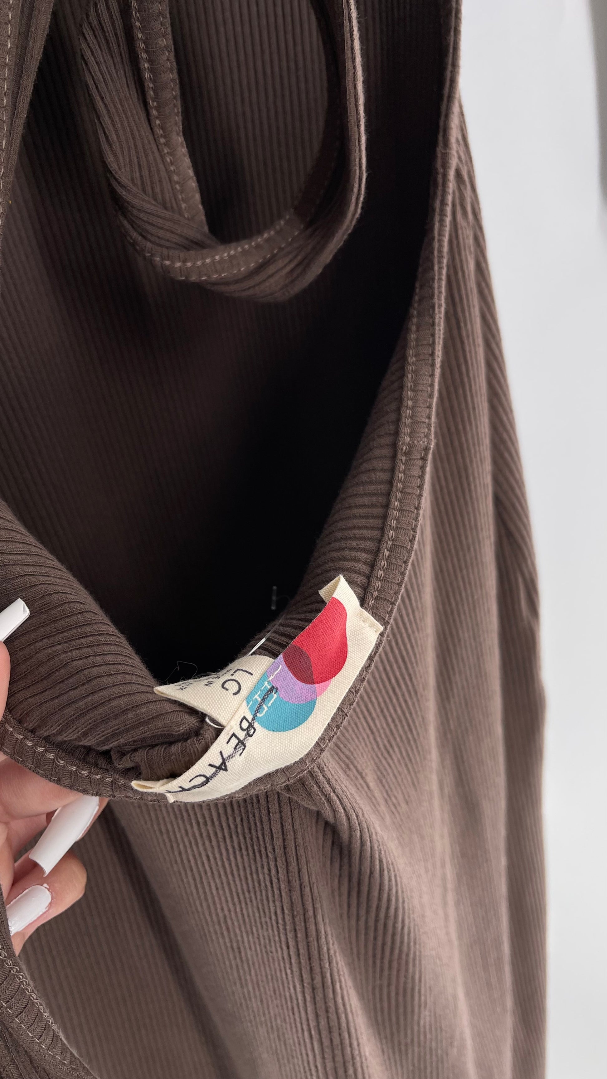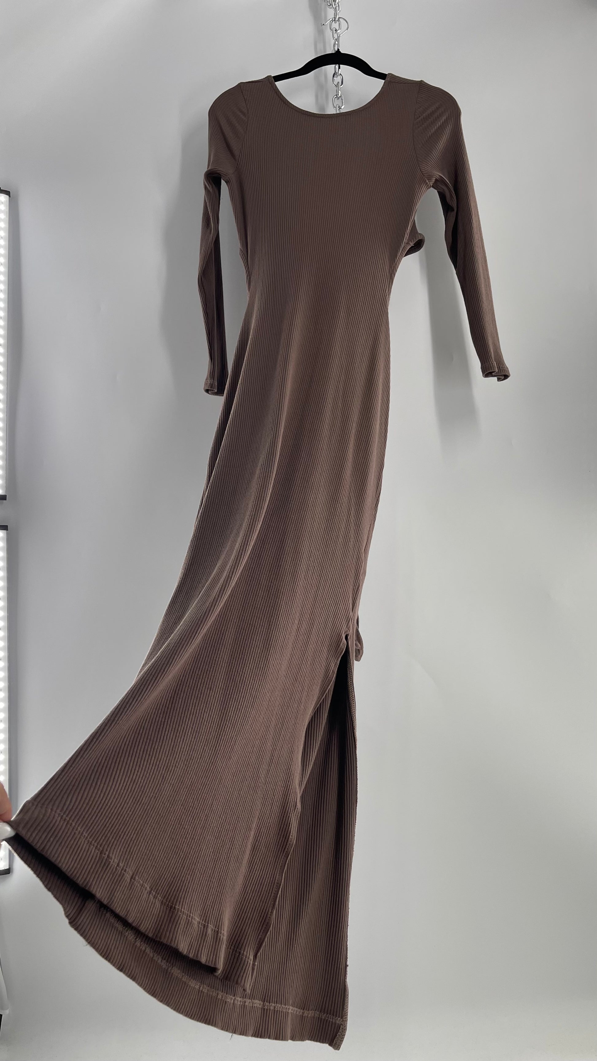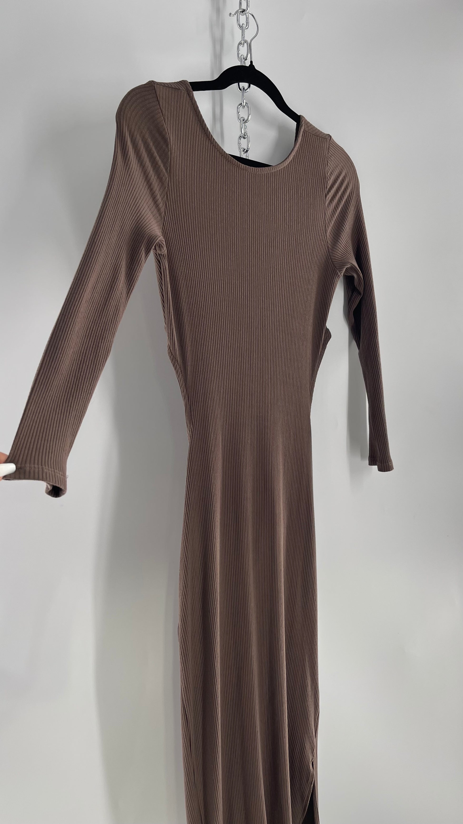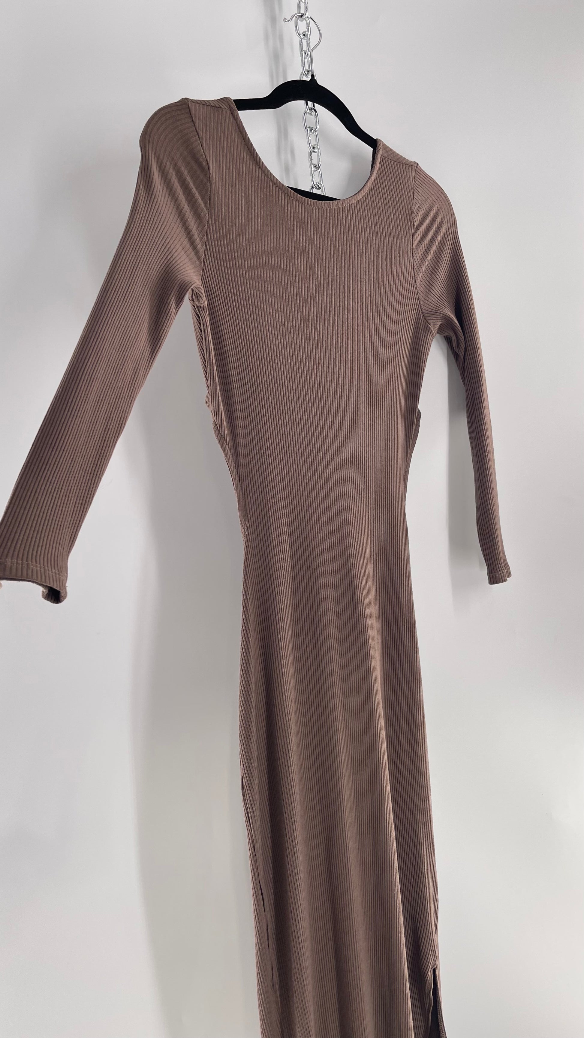 Free People Brown Ribbed Maxi Dress with Low Open Back and Dramatic Tie Detail