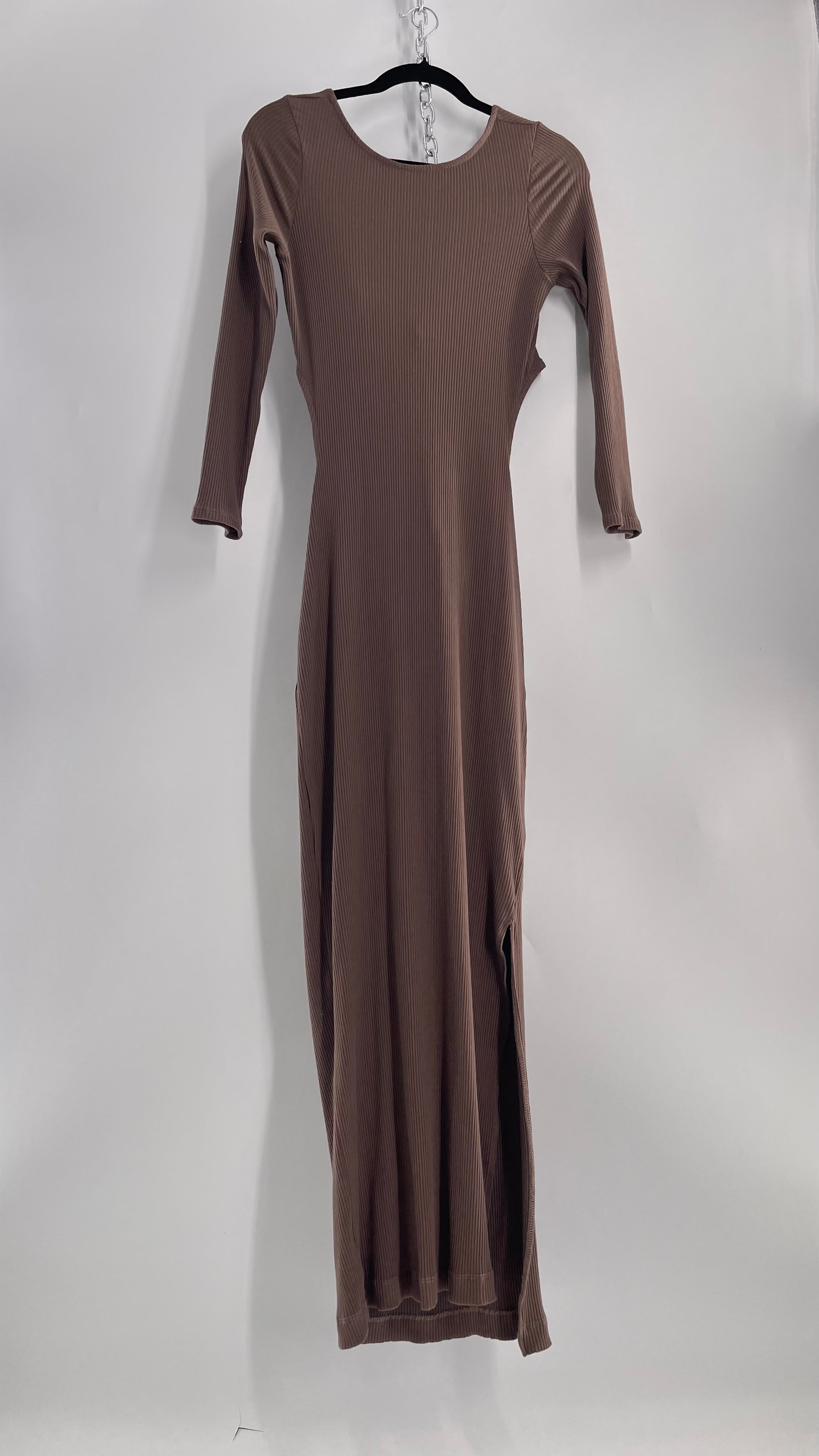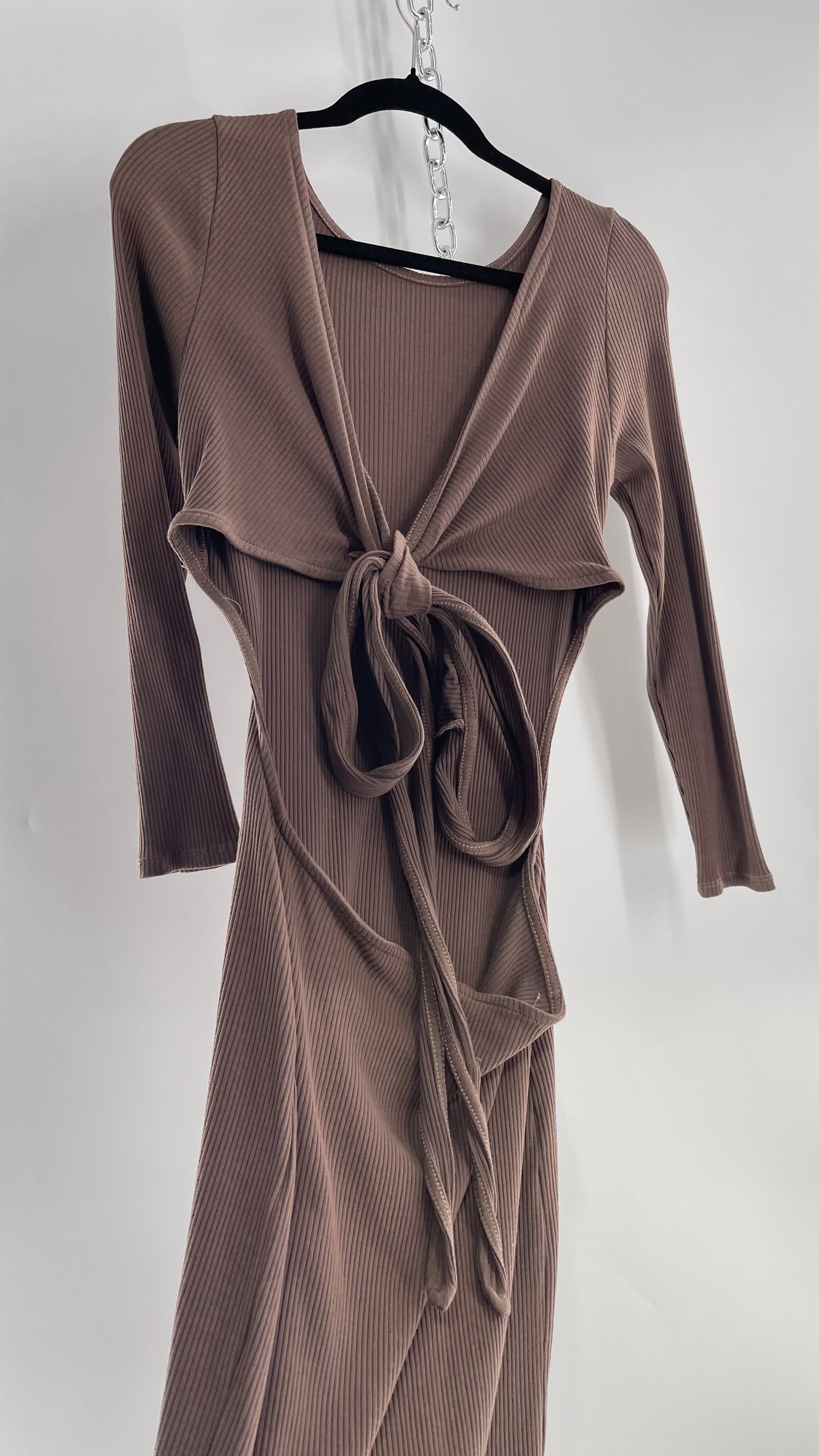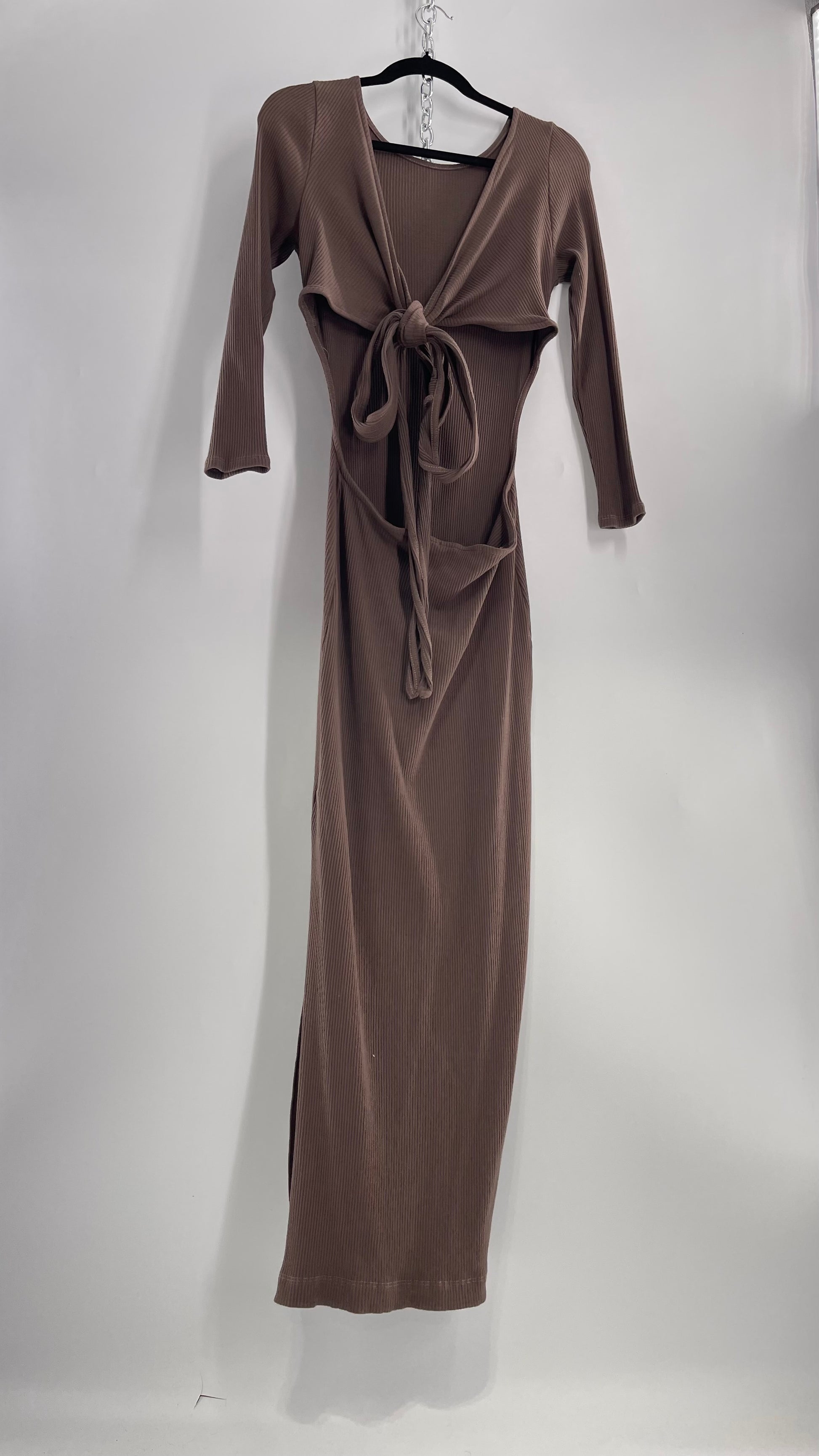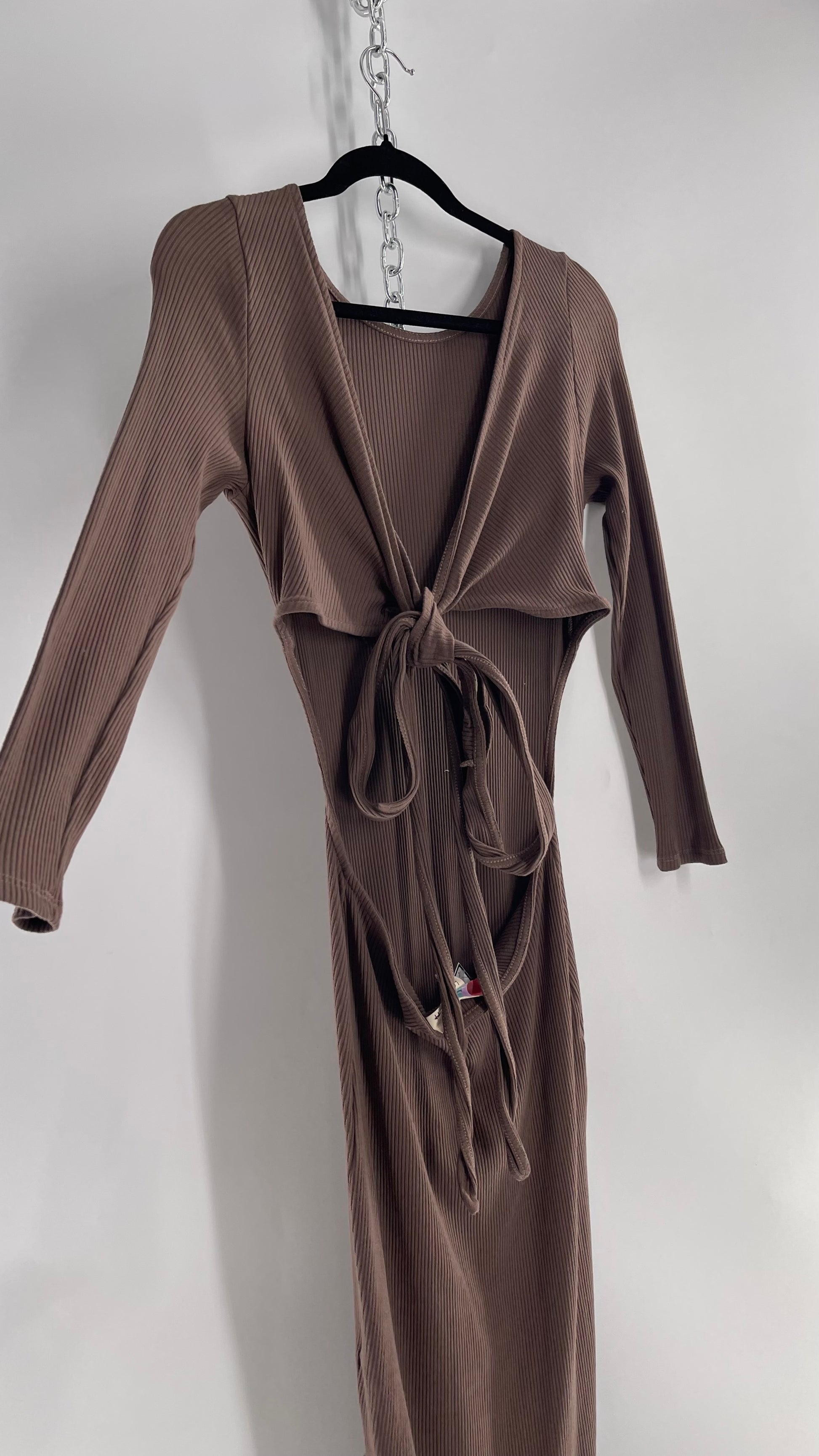 Free People Brown Ribbed Maxi Dress with Low Open Back and Dramatic Tie Detail (Large)