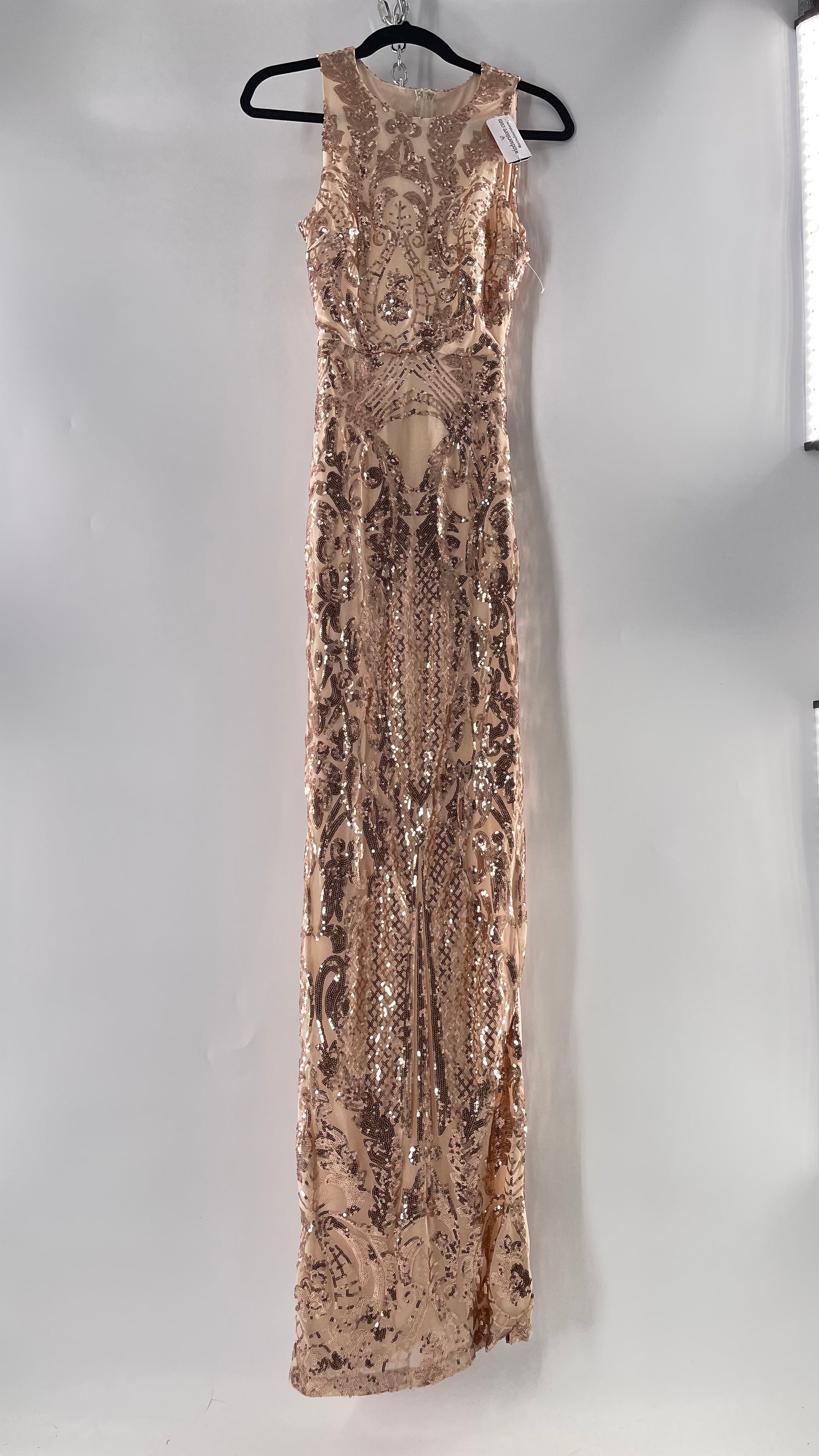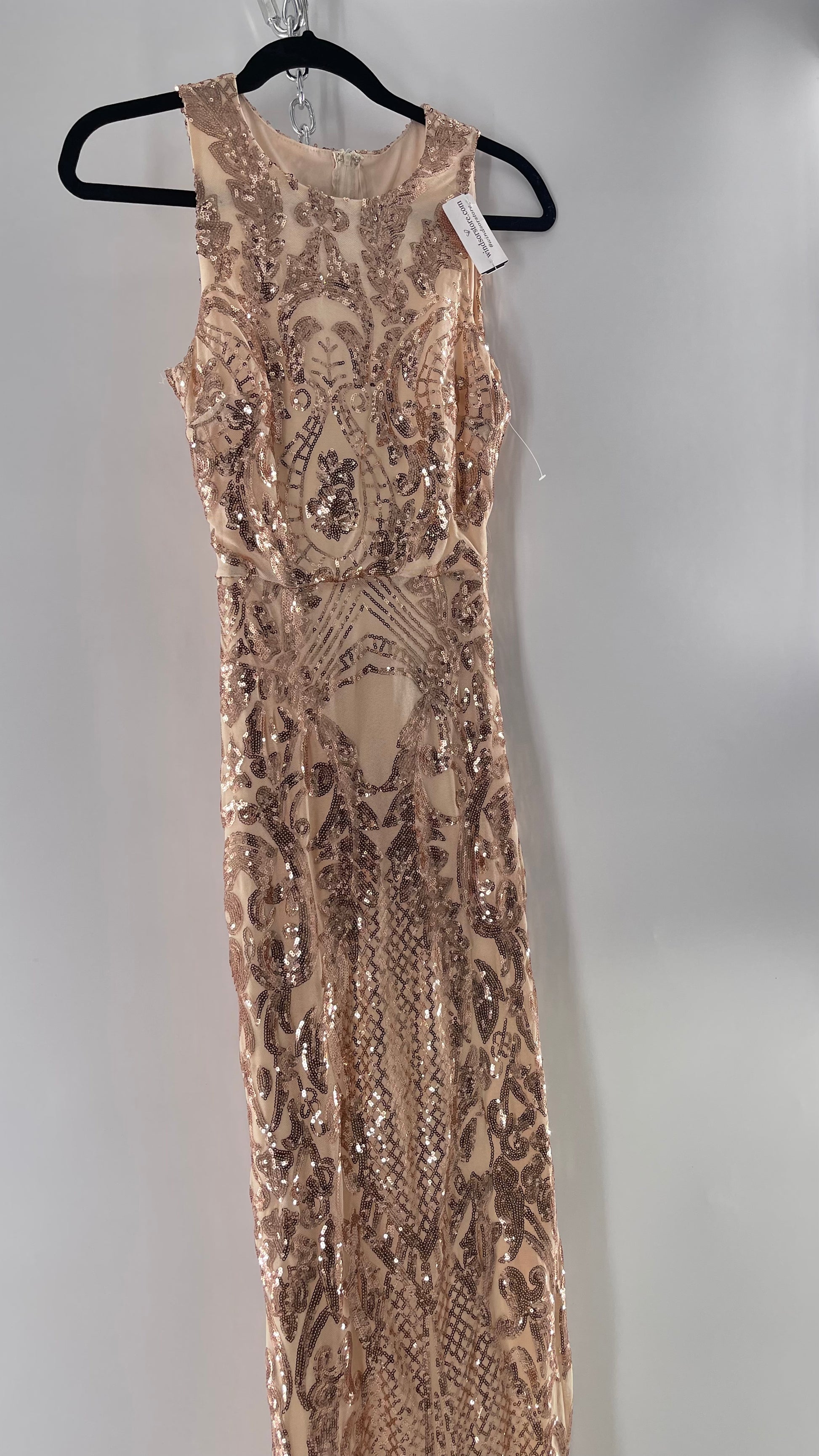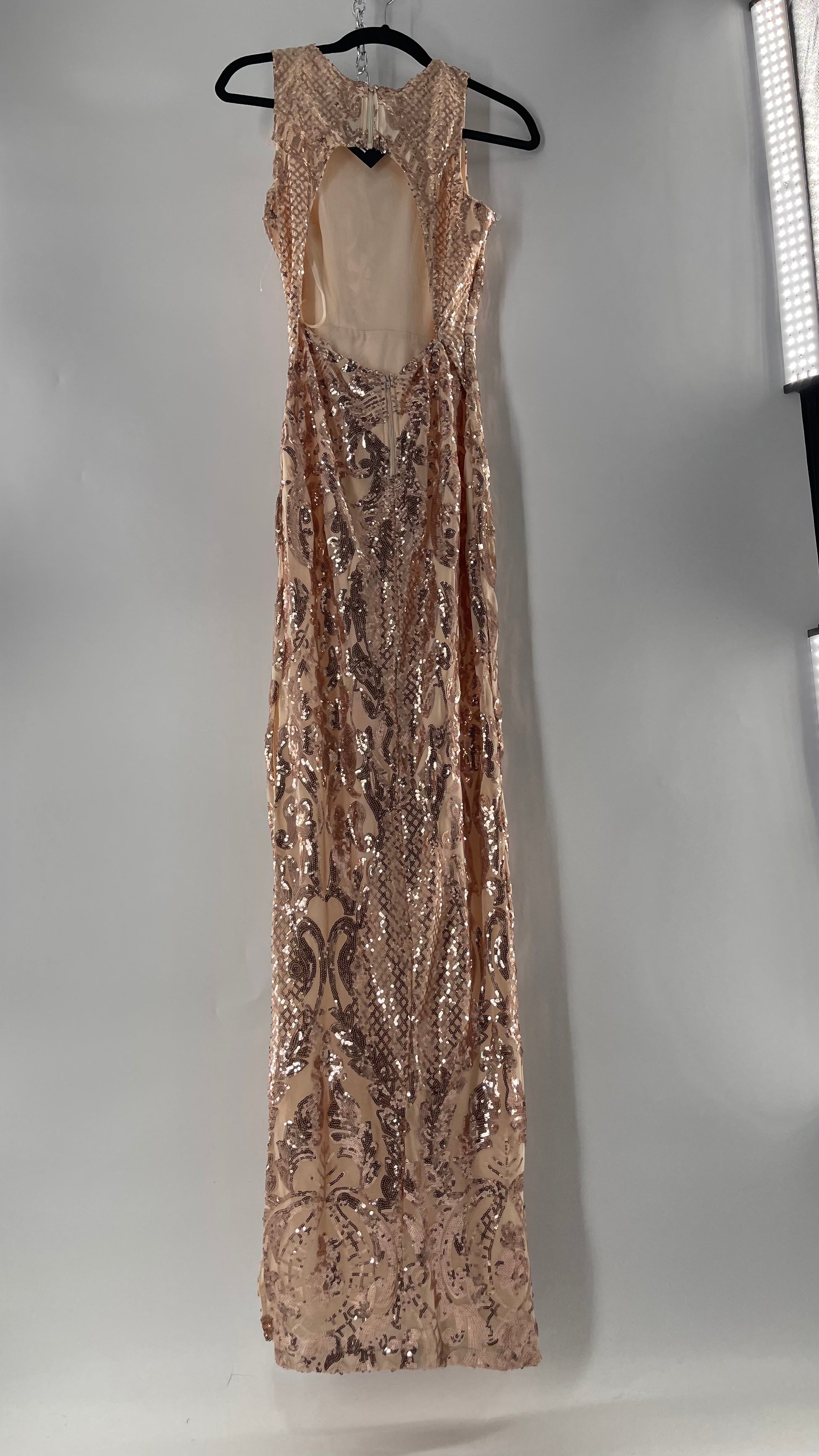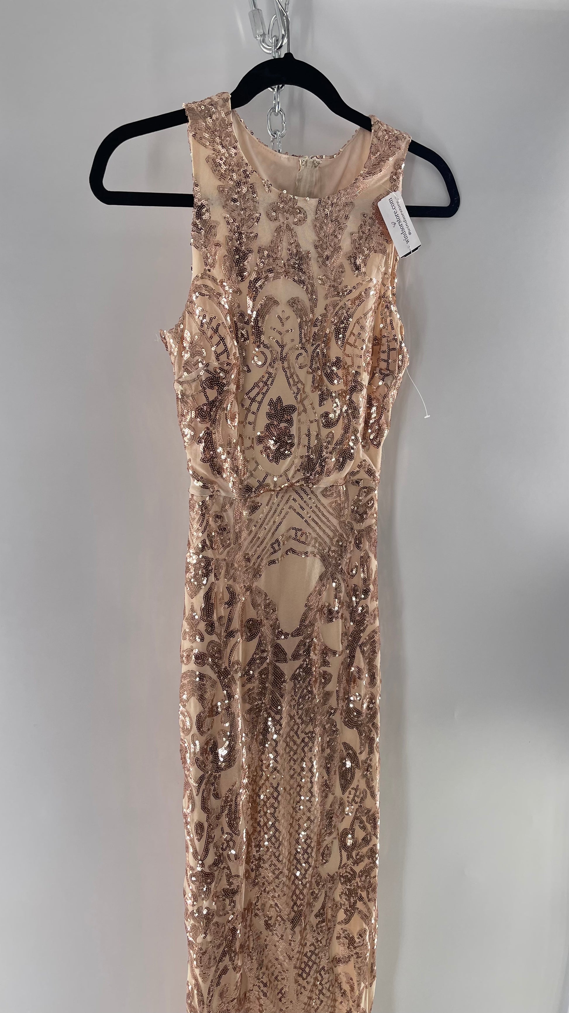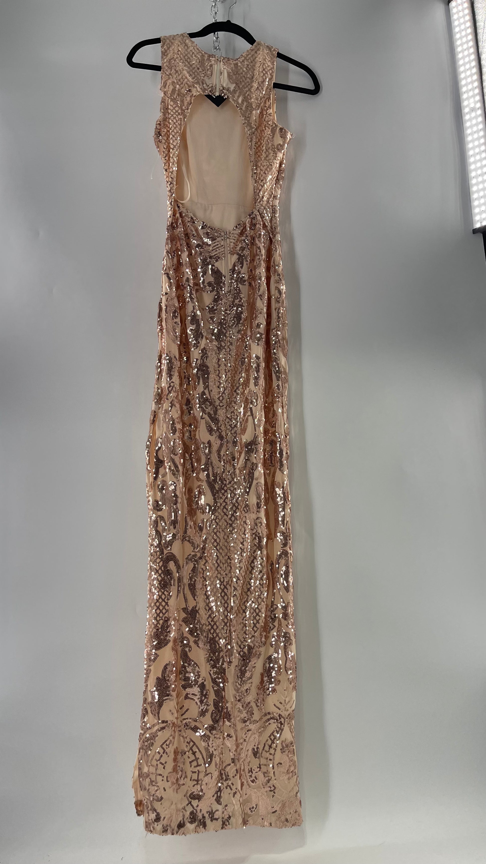 Windsor Rose Gold Sequin Maxi Dress with Side Slit Detail and Open Back (Small)