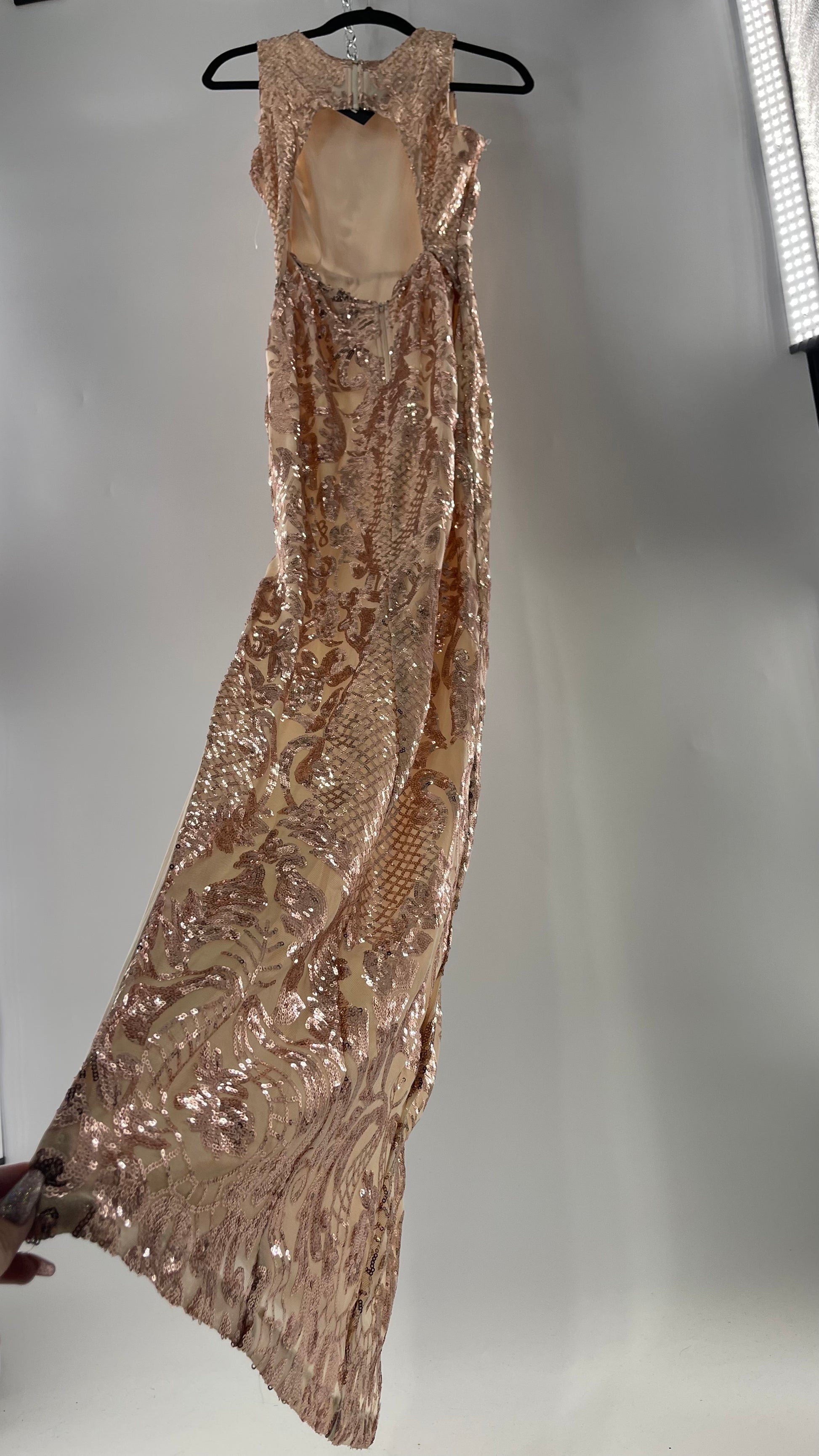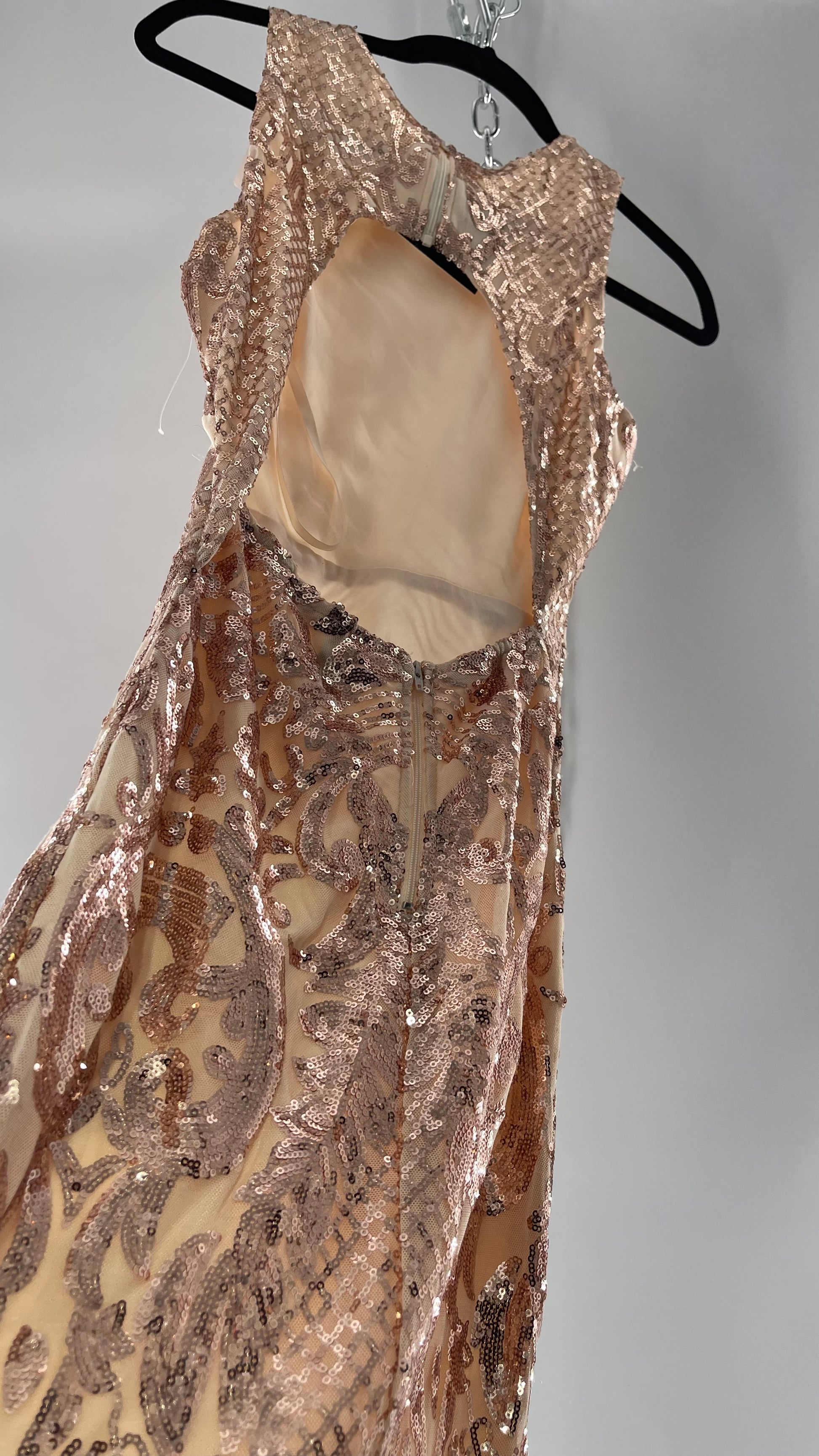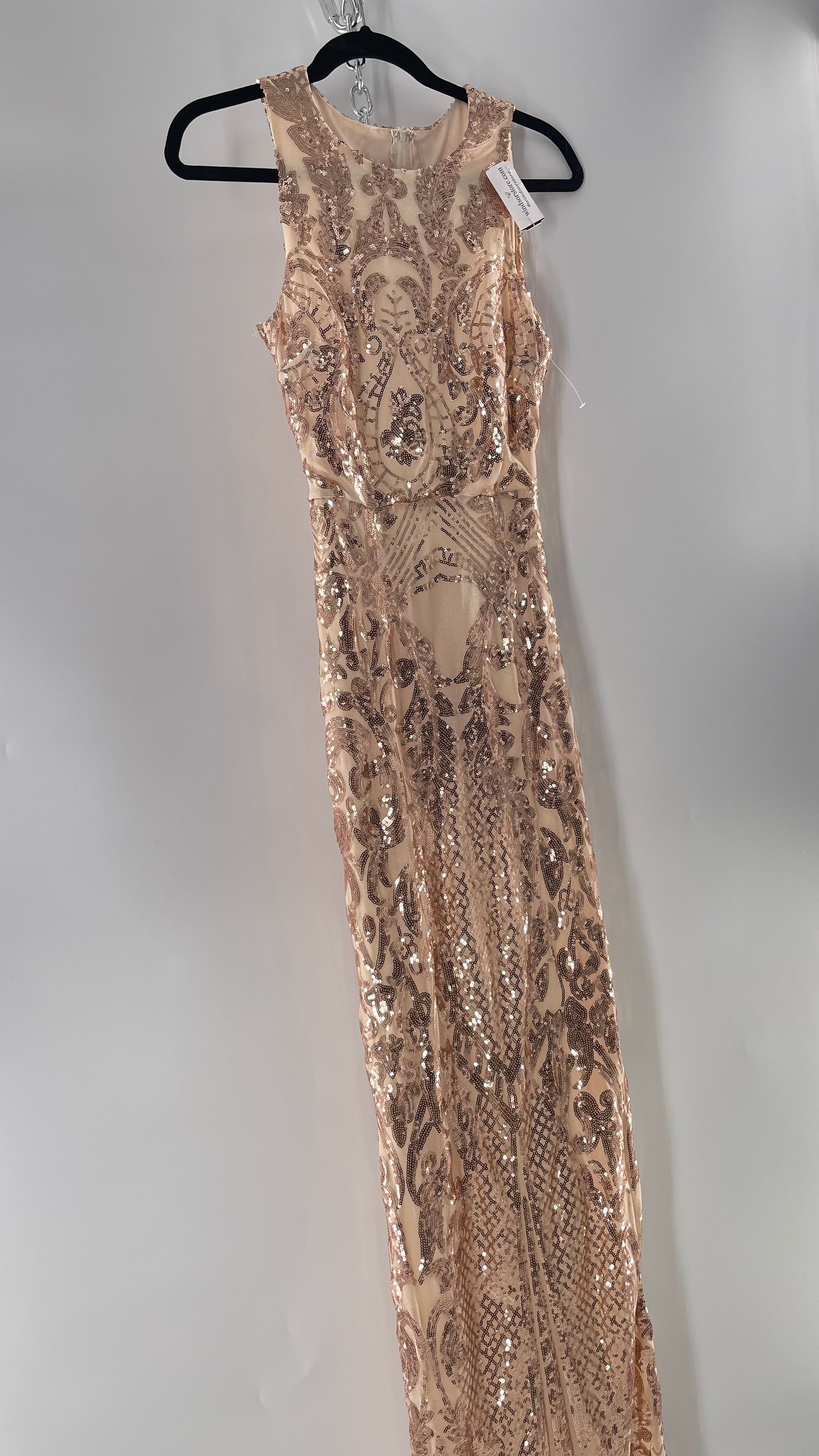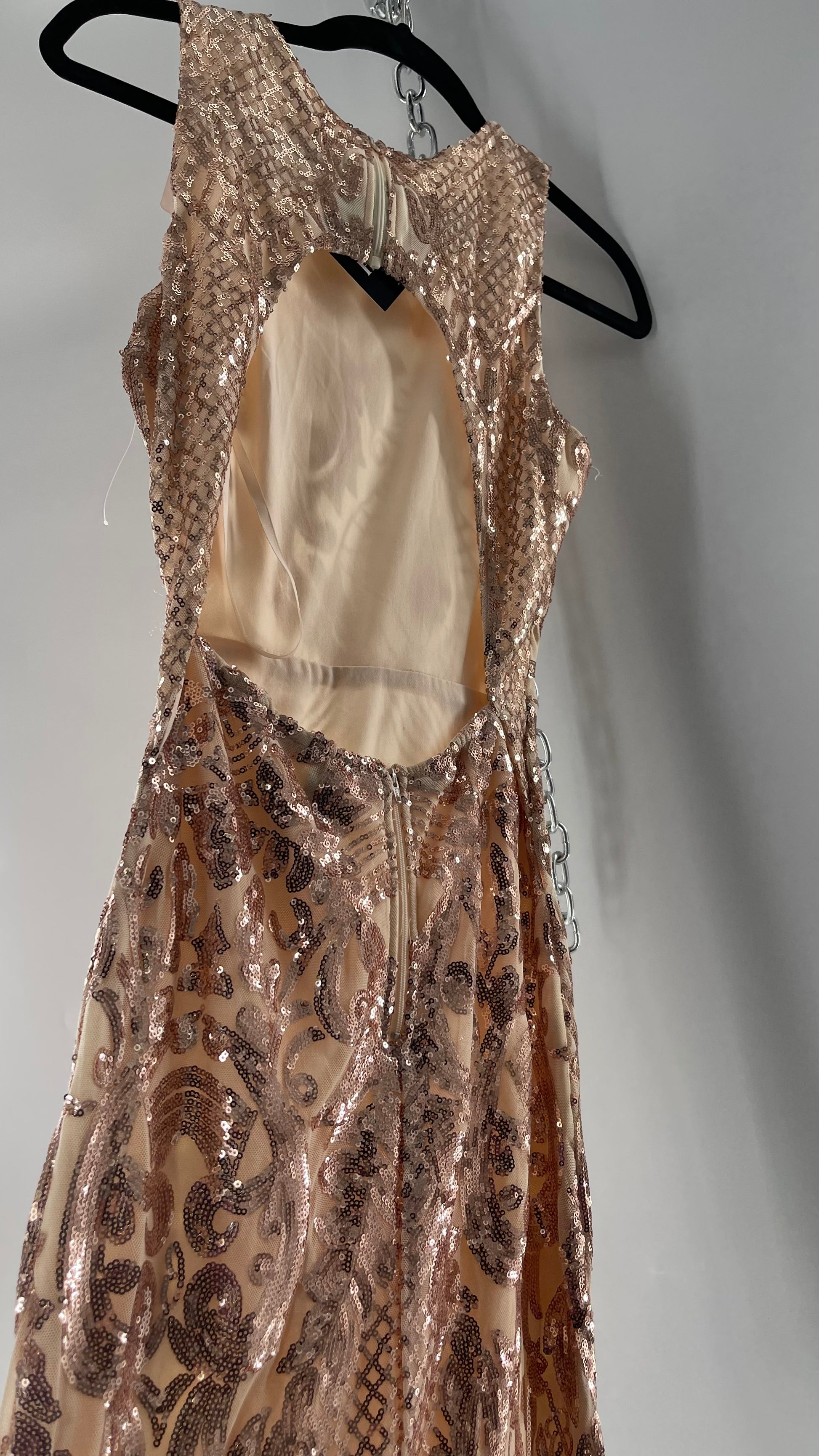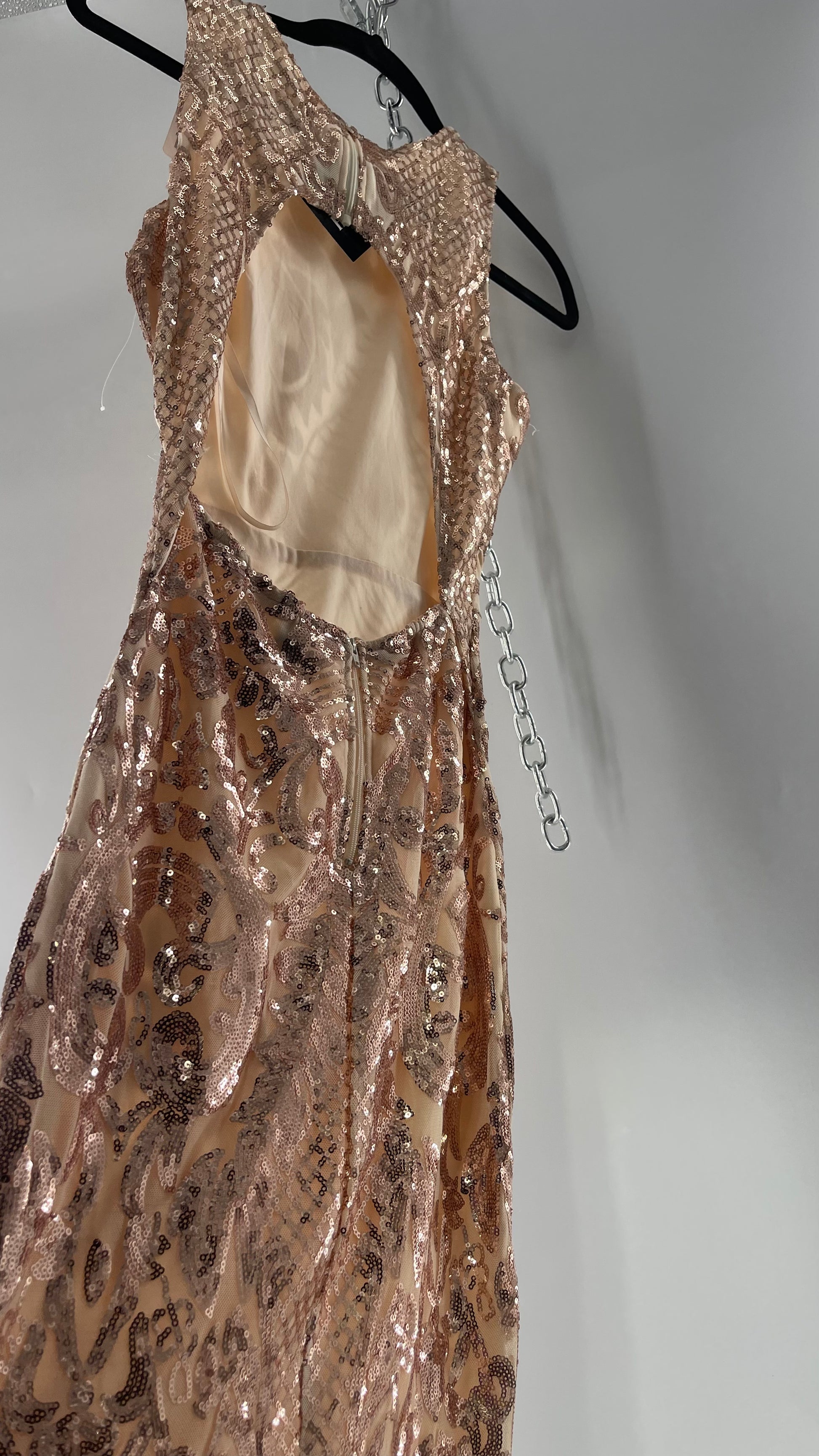 Windsor Rose Gold Sequin Maxi Dress with Side Slit Detail and Open Back (Small)
