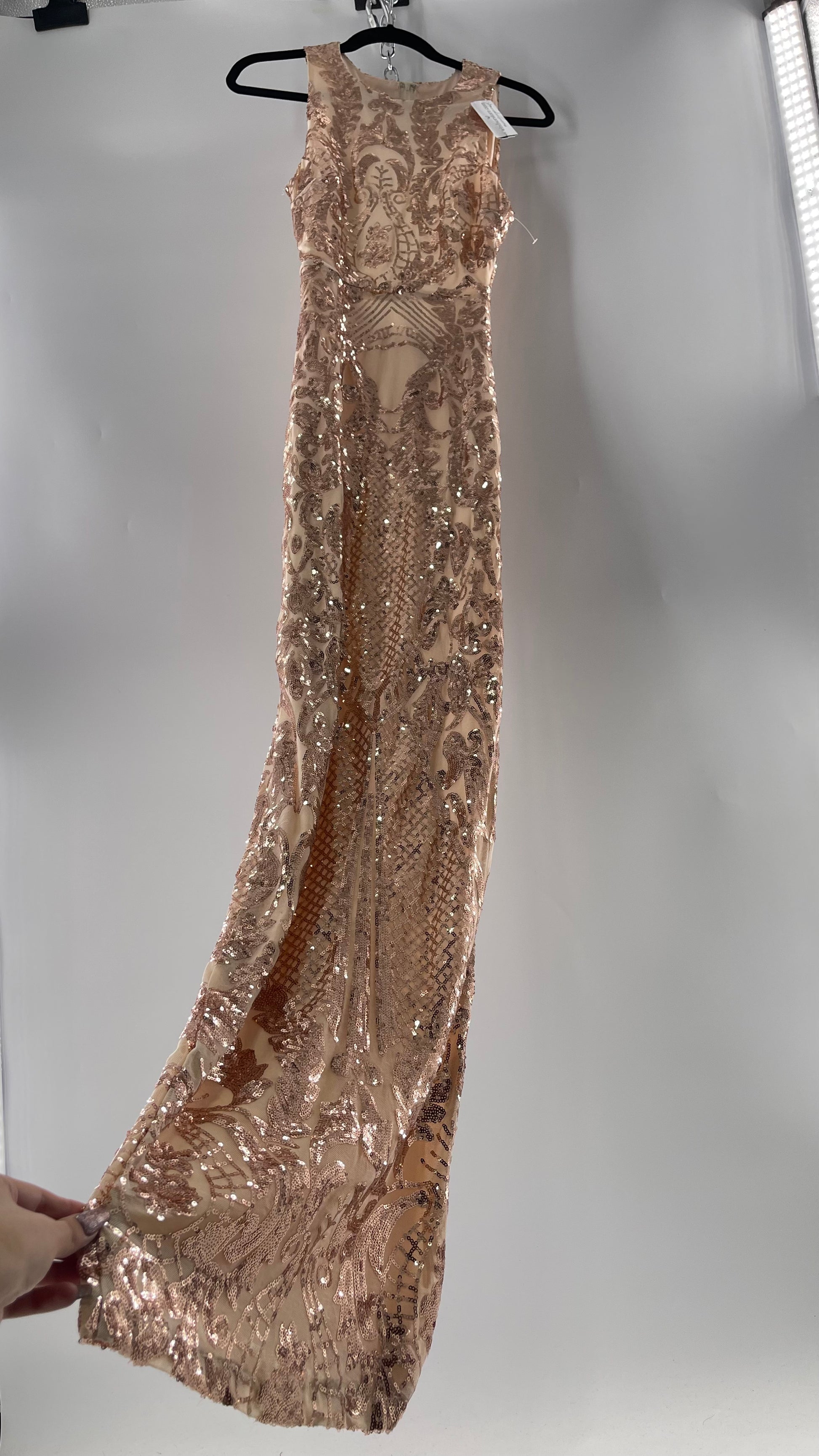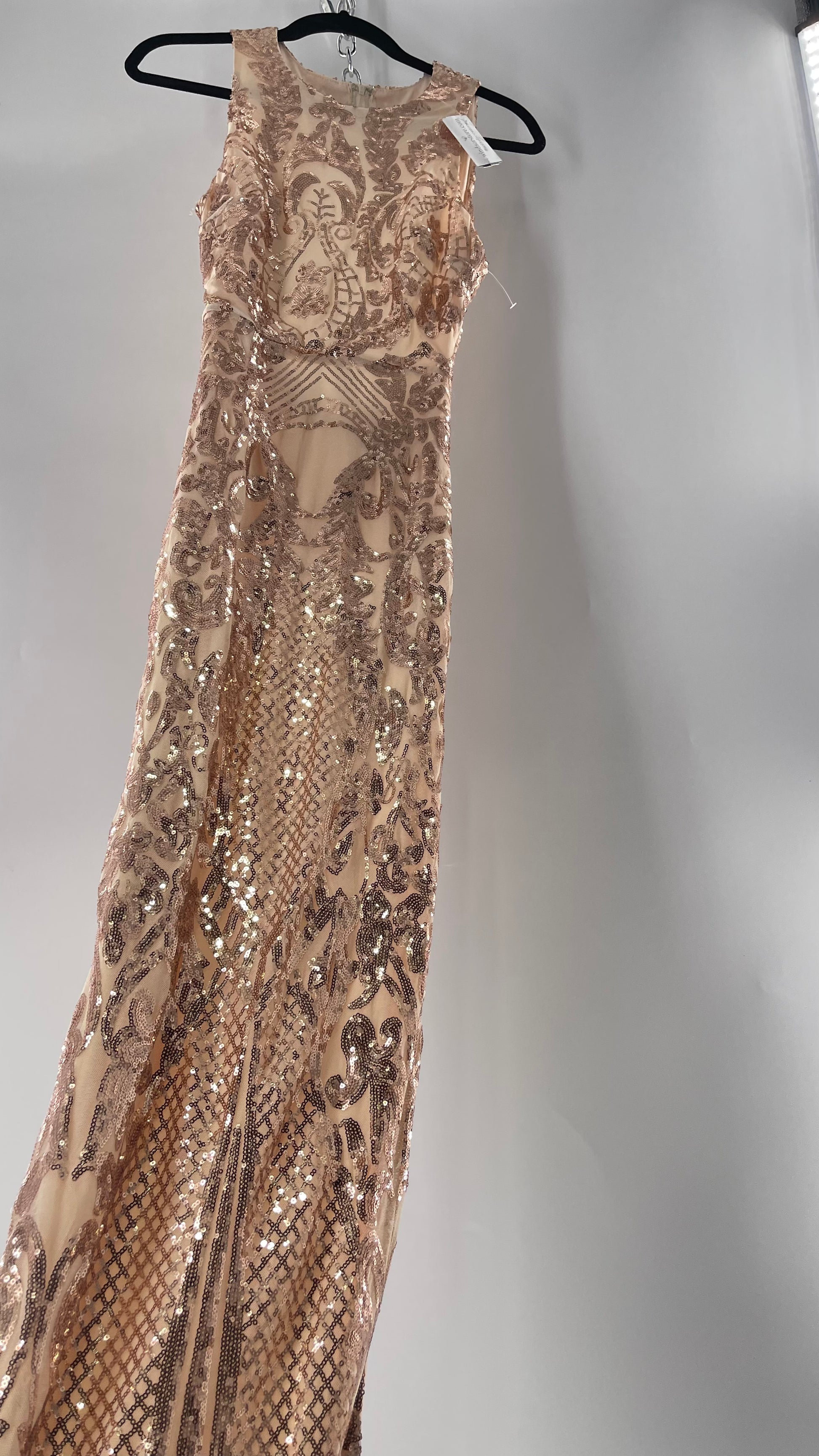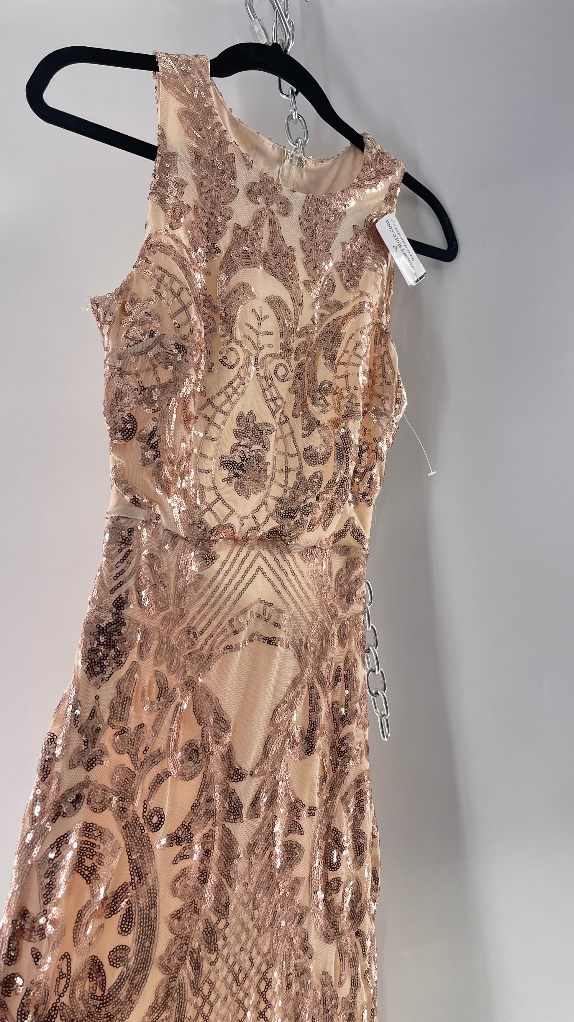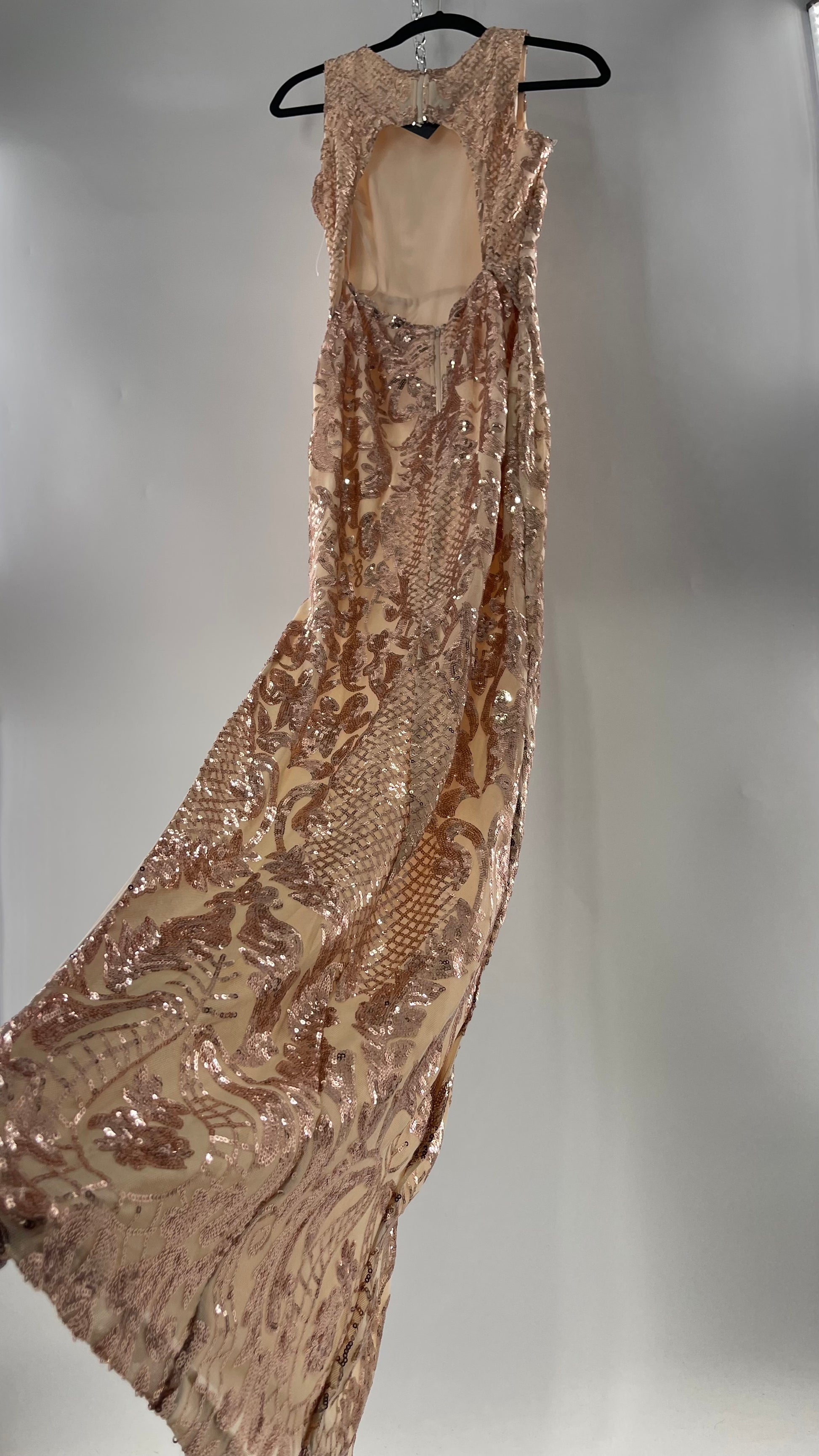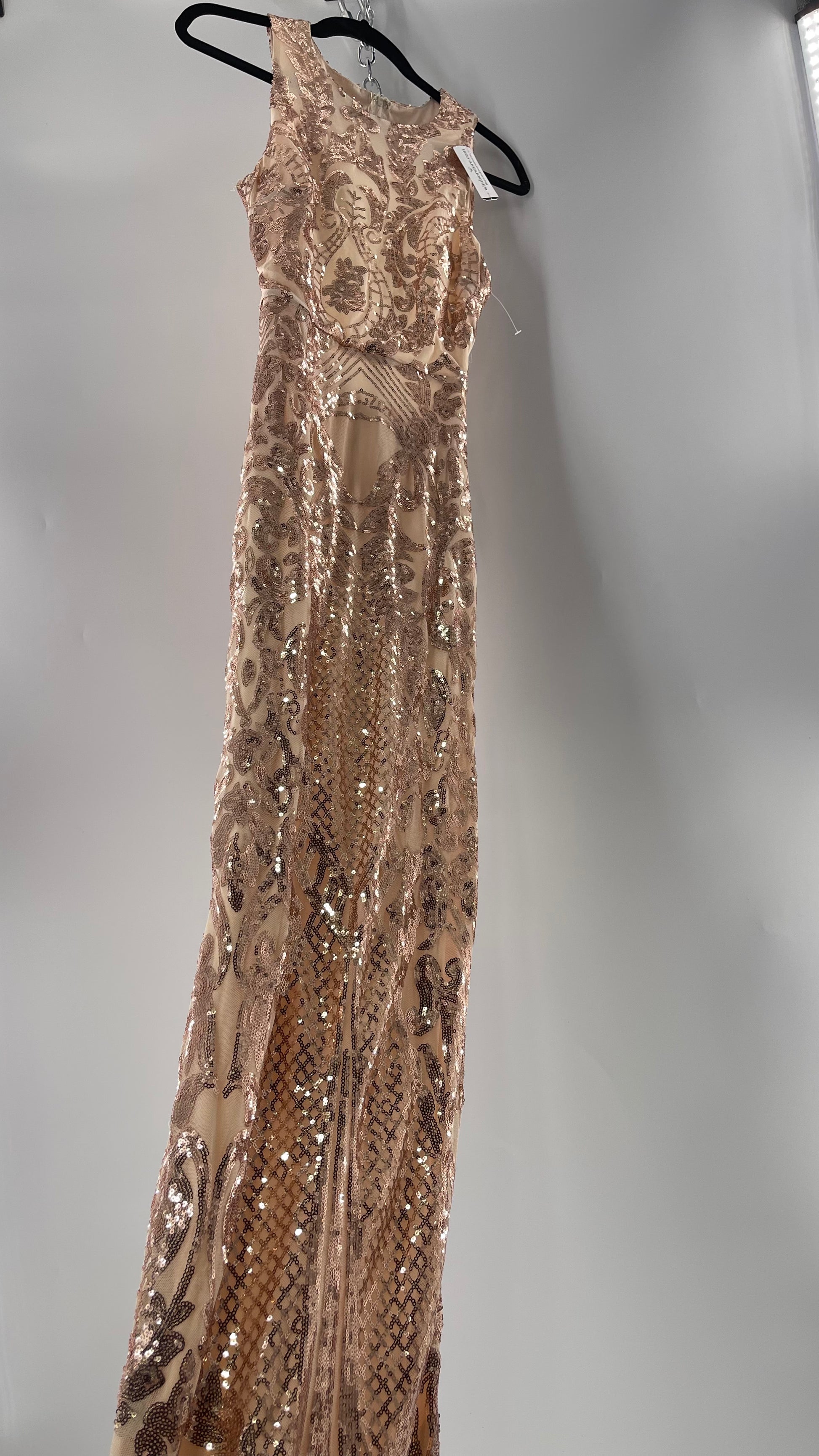 Windsor Rose Gold Sequin Maxi Dress with Side Slit Detail and Open Back (Small)