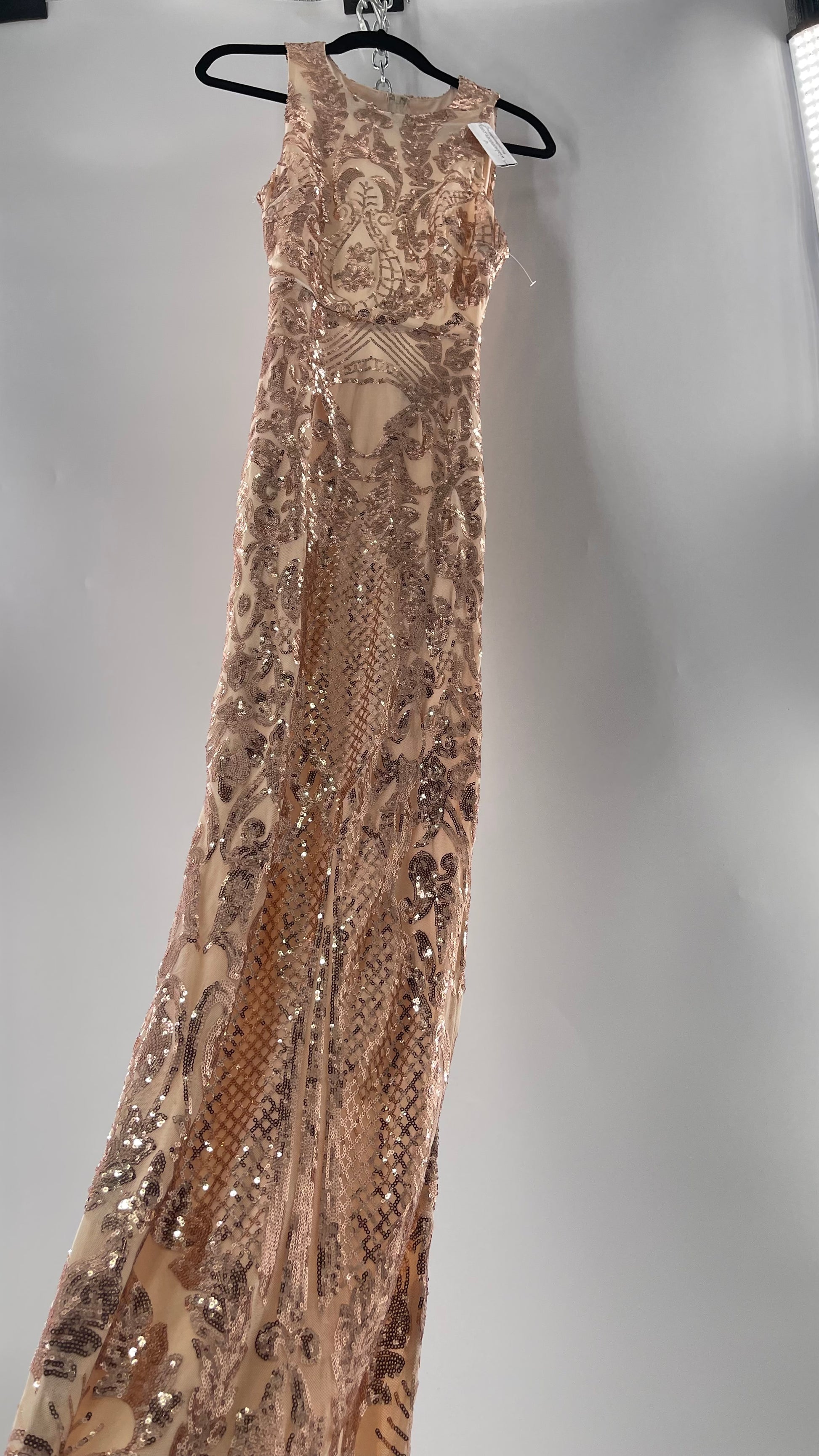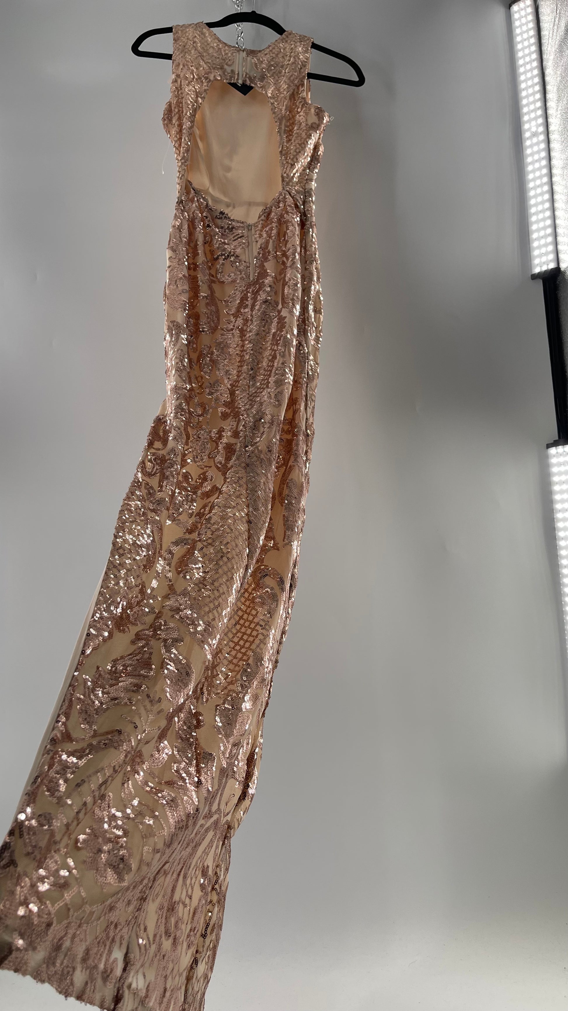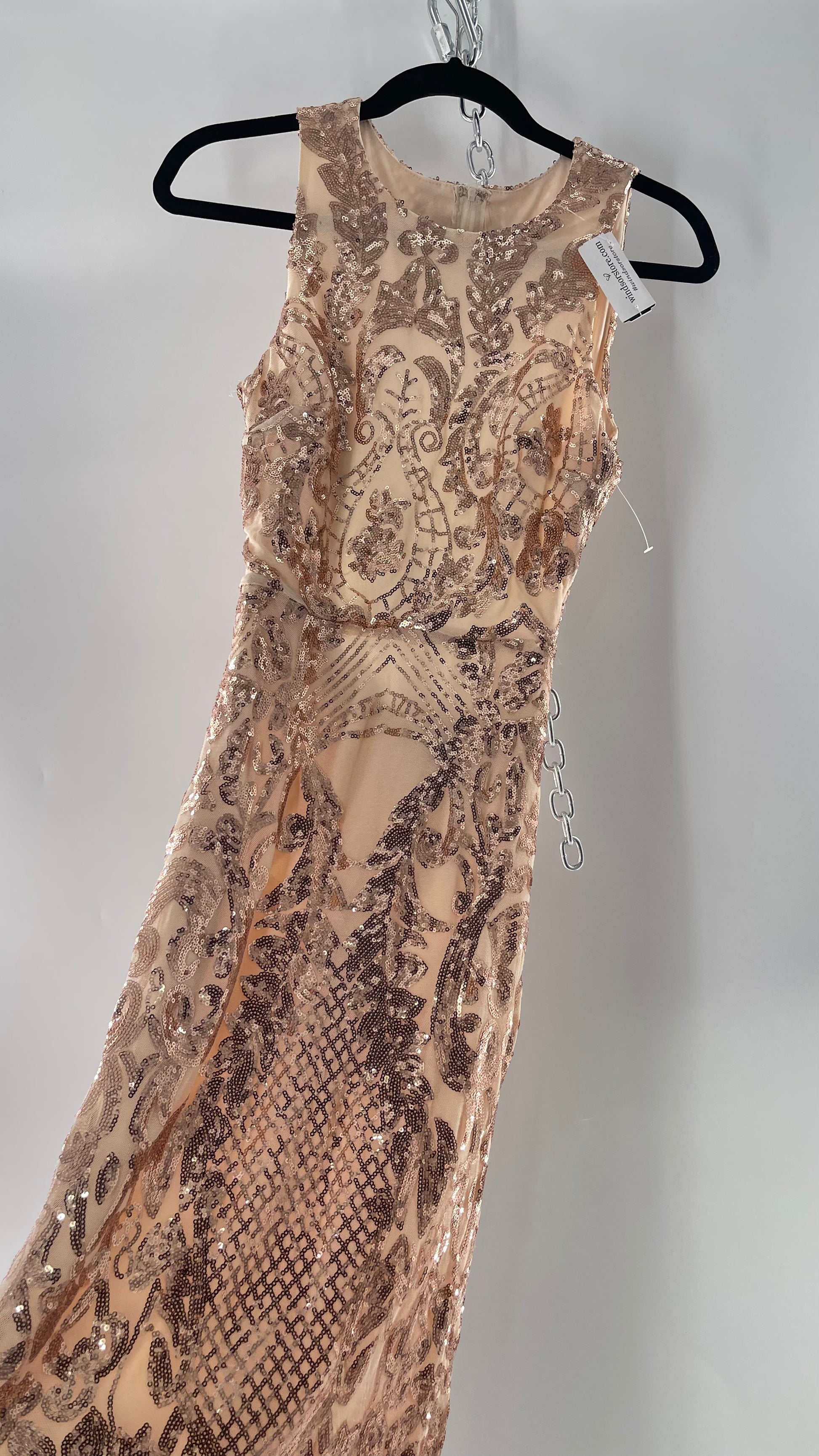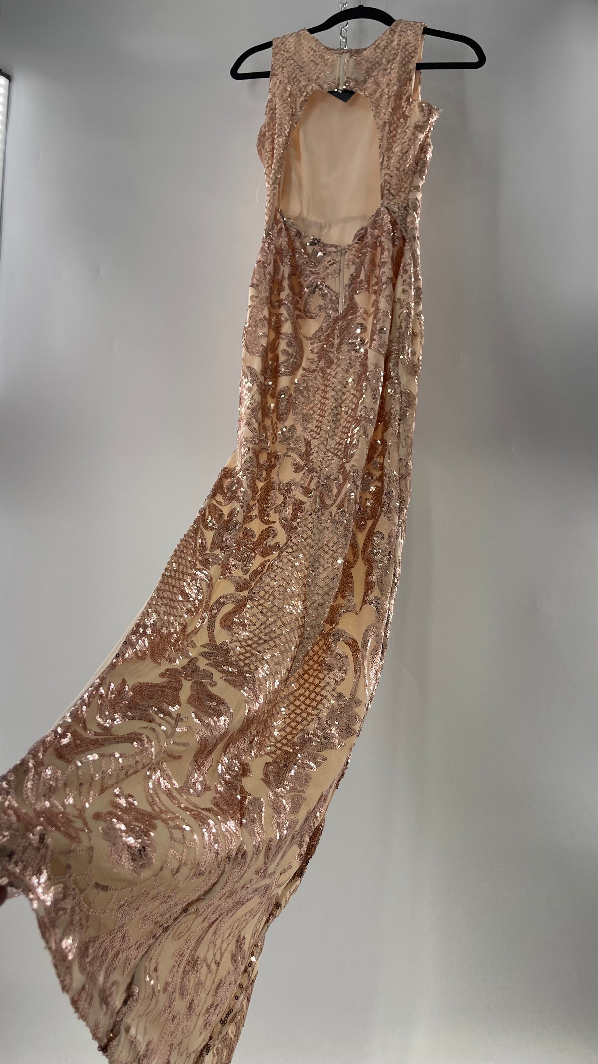 Windsor Rose Gold Sequin Maxi Dress with Side Slit Detail and Open Back (Small)