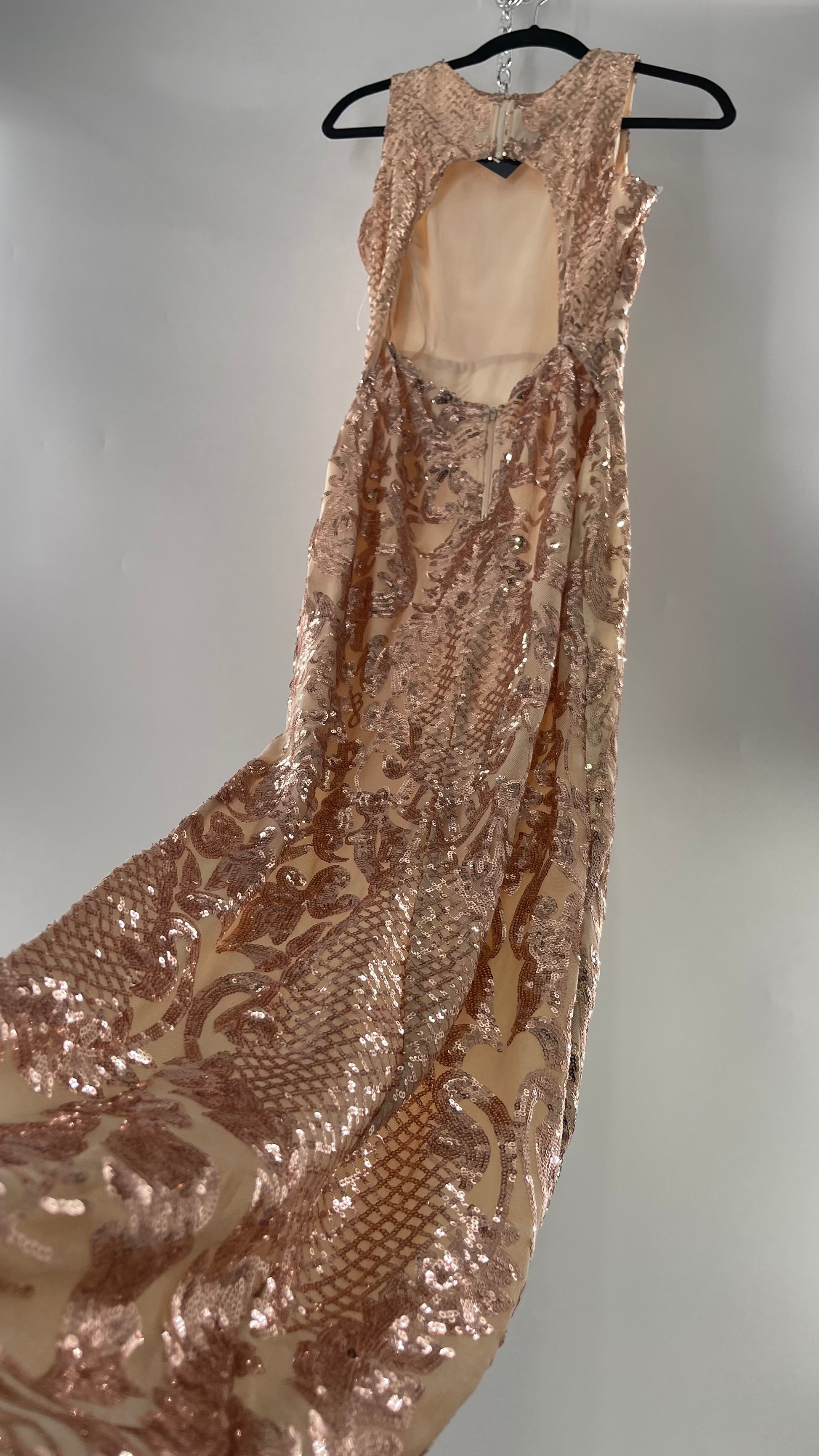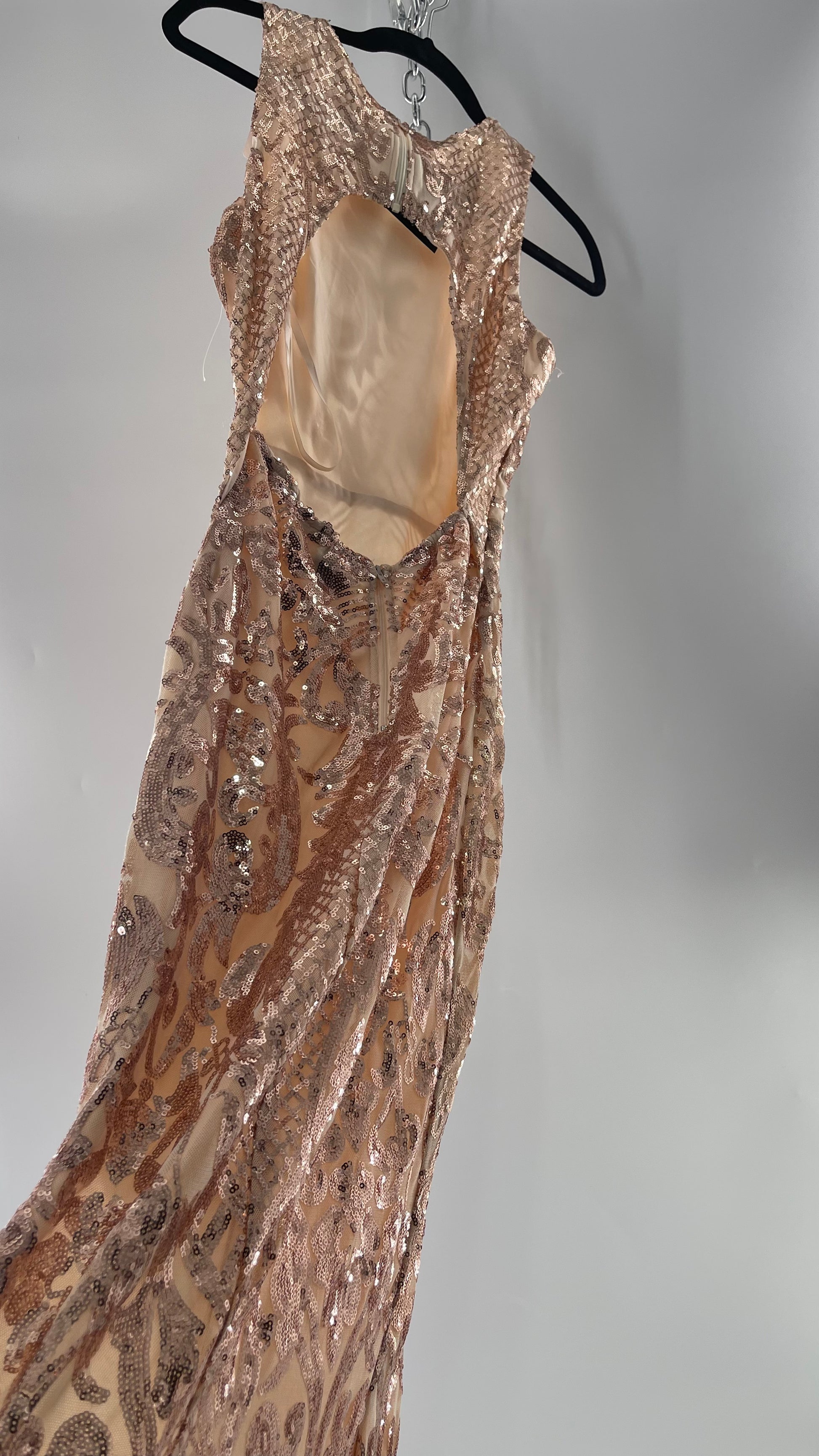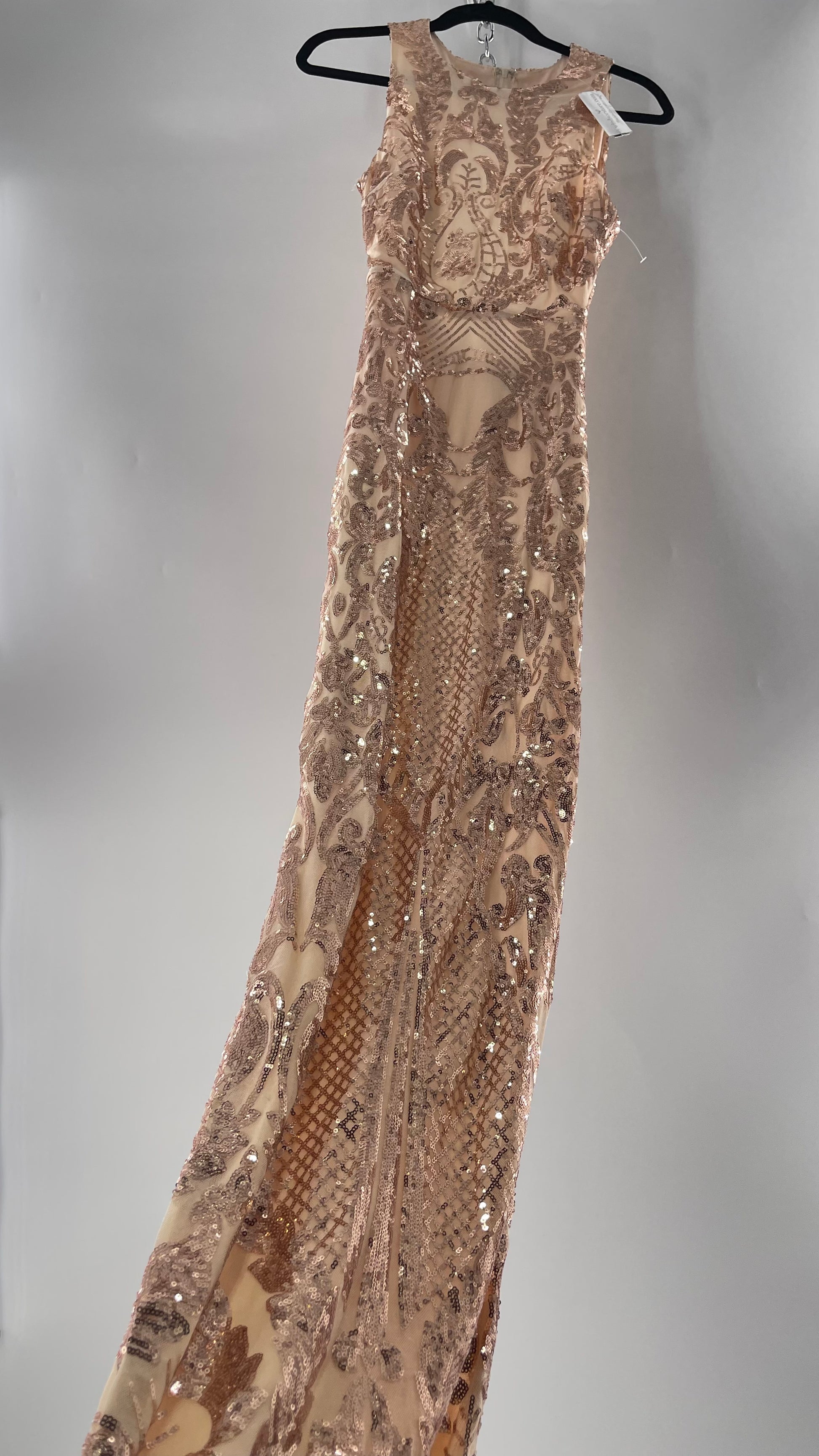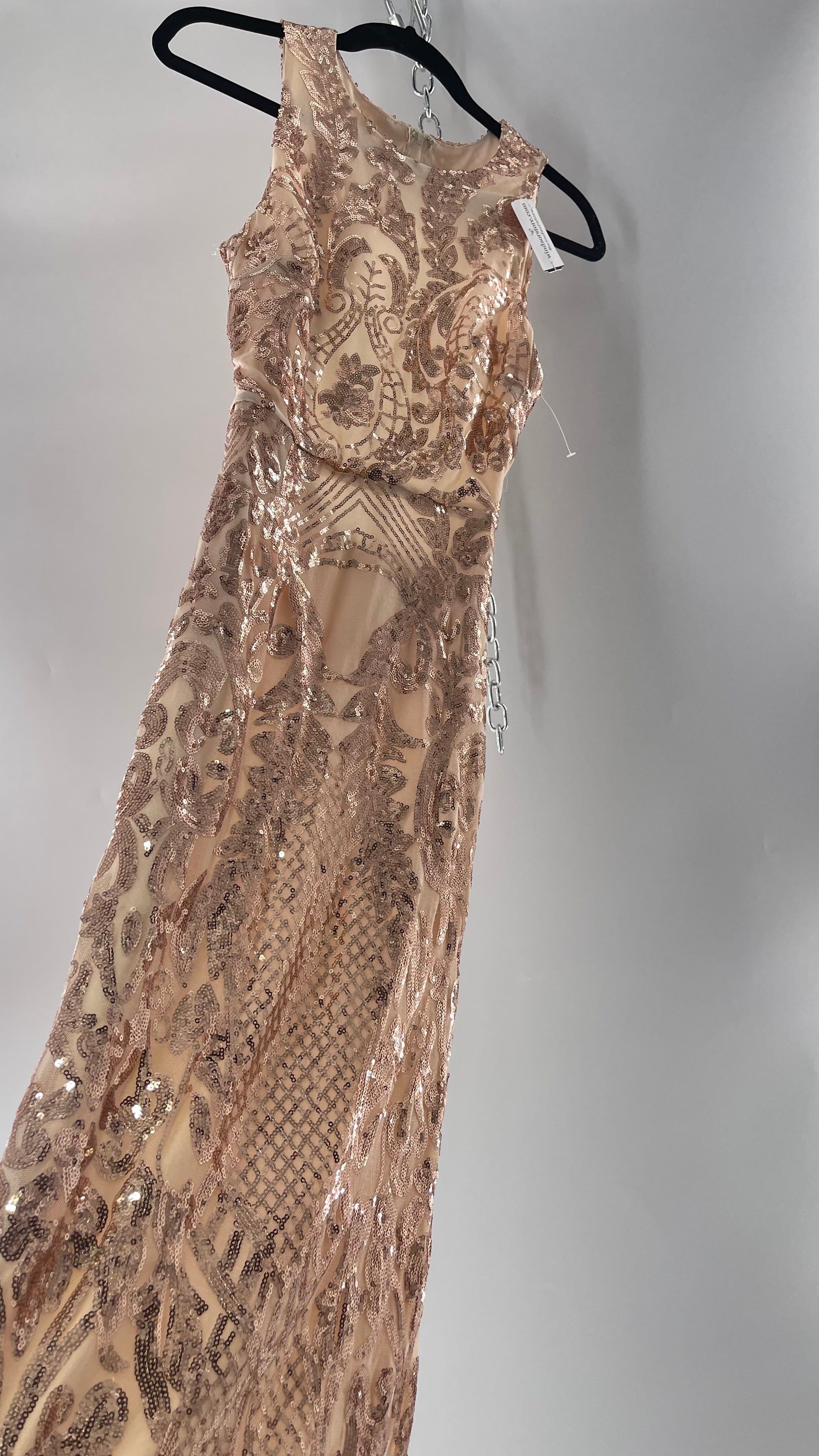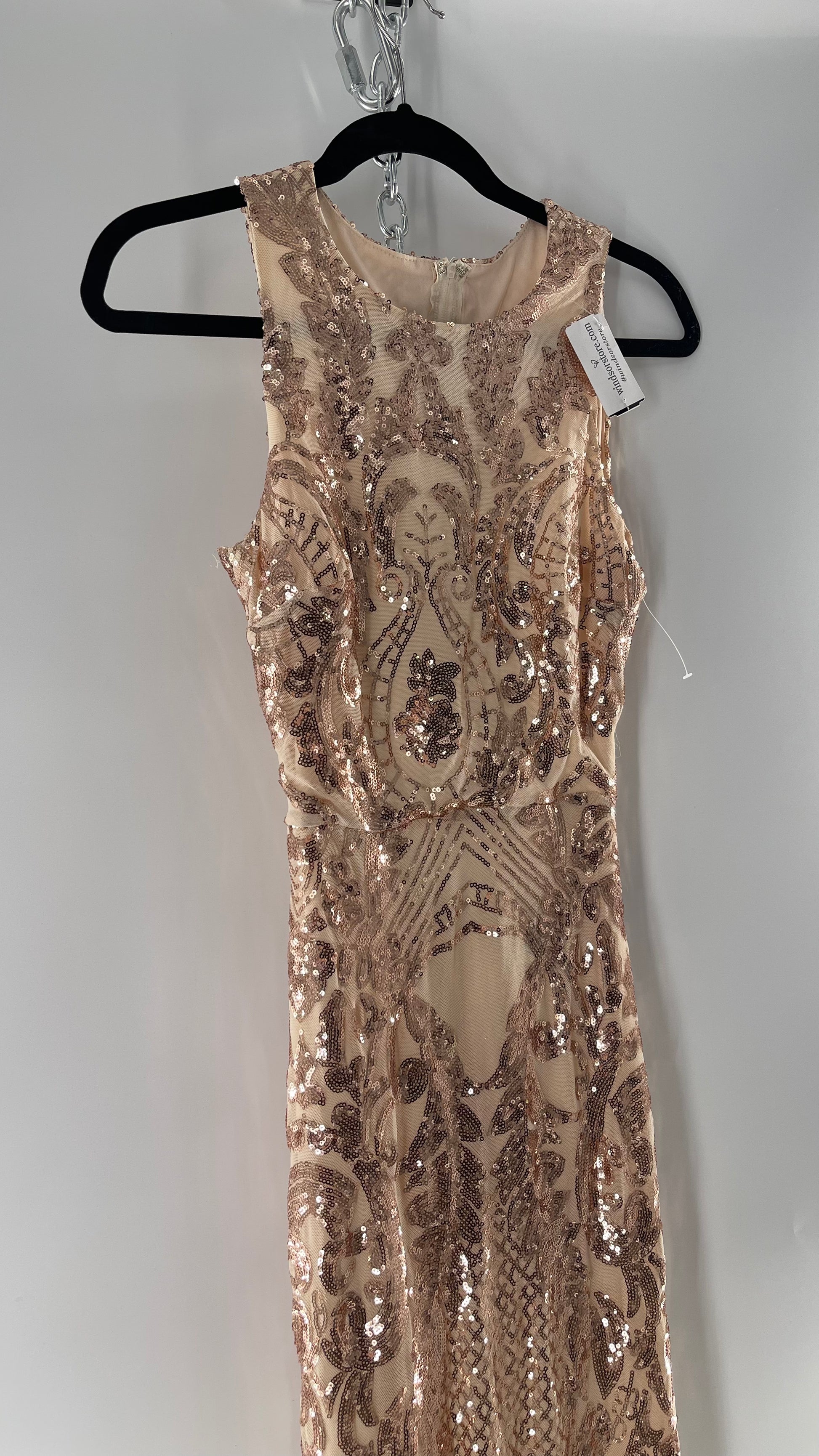 Windsor Rose Gold Sequin Maxi Dress with Side Slit Detail and Open Back (Small)
