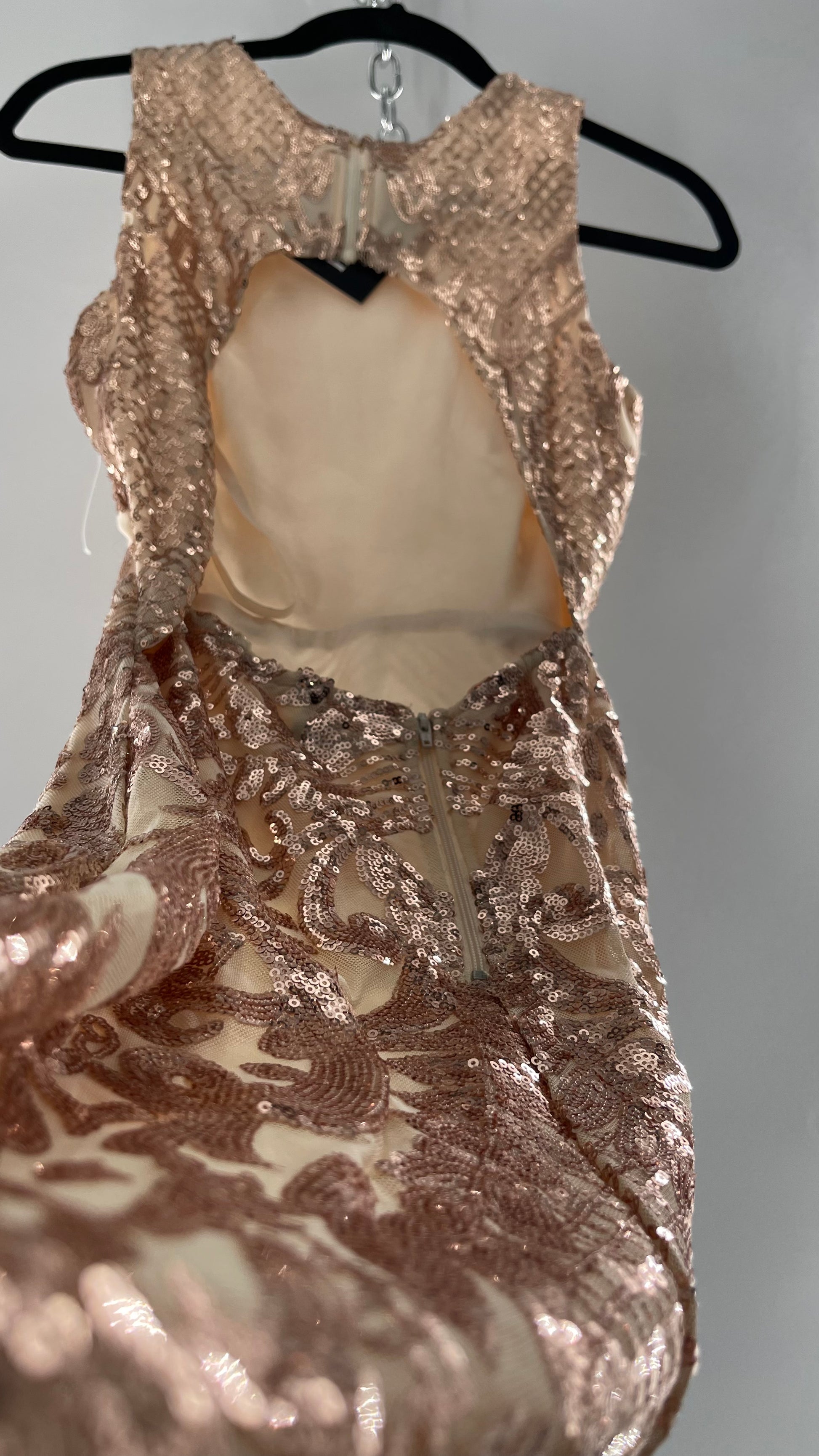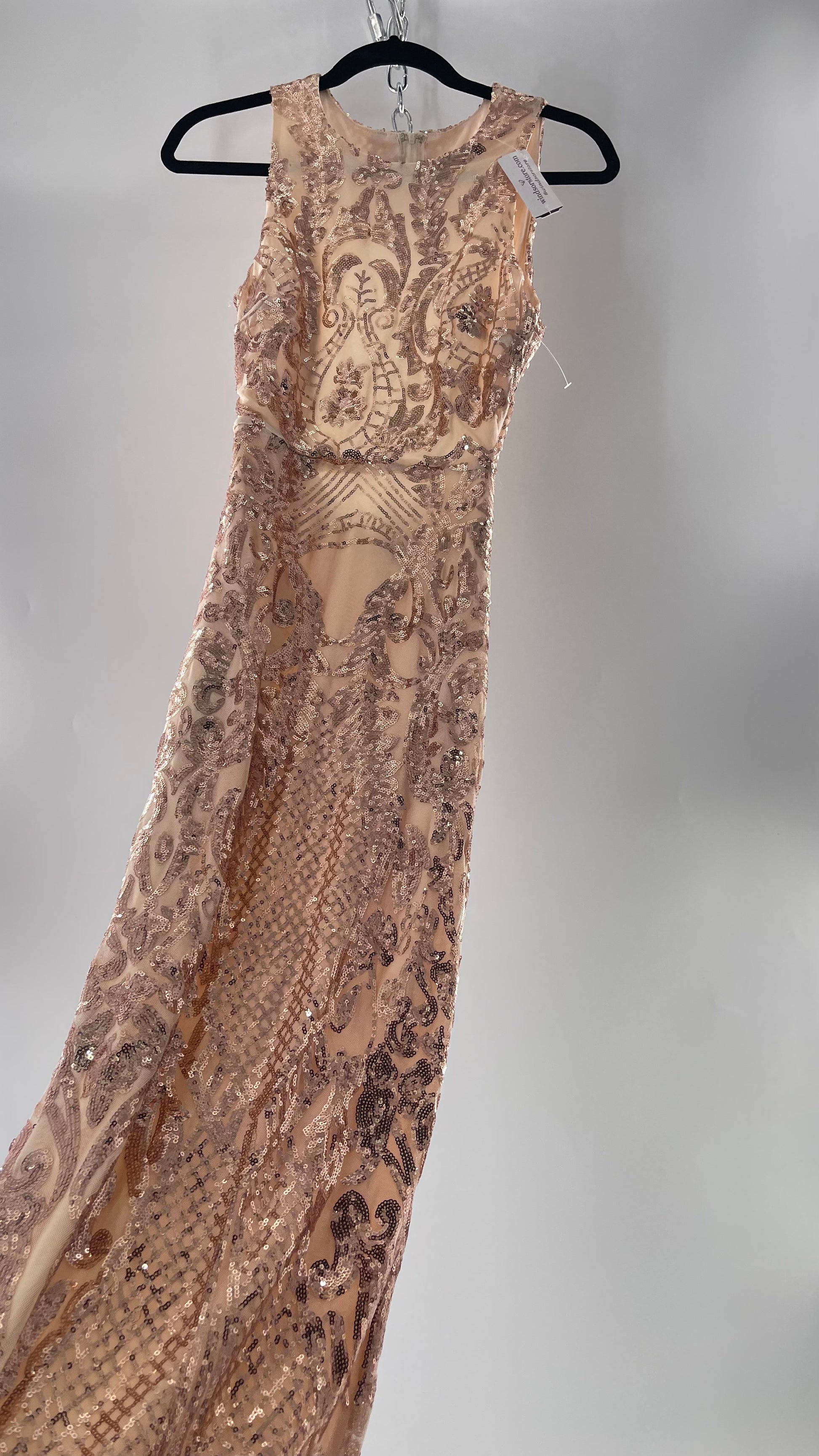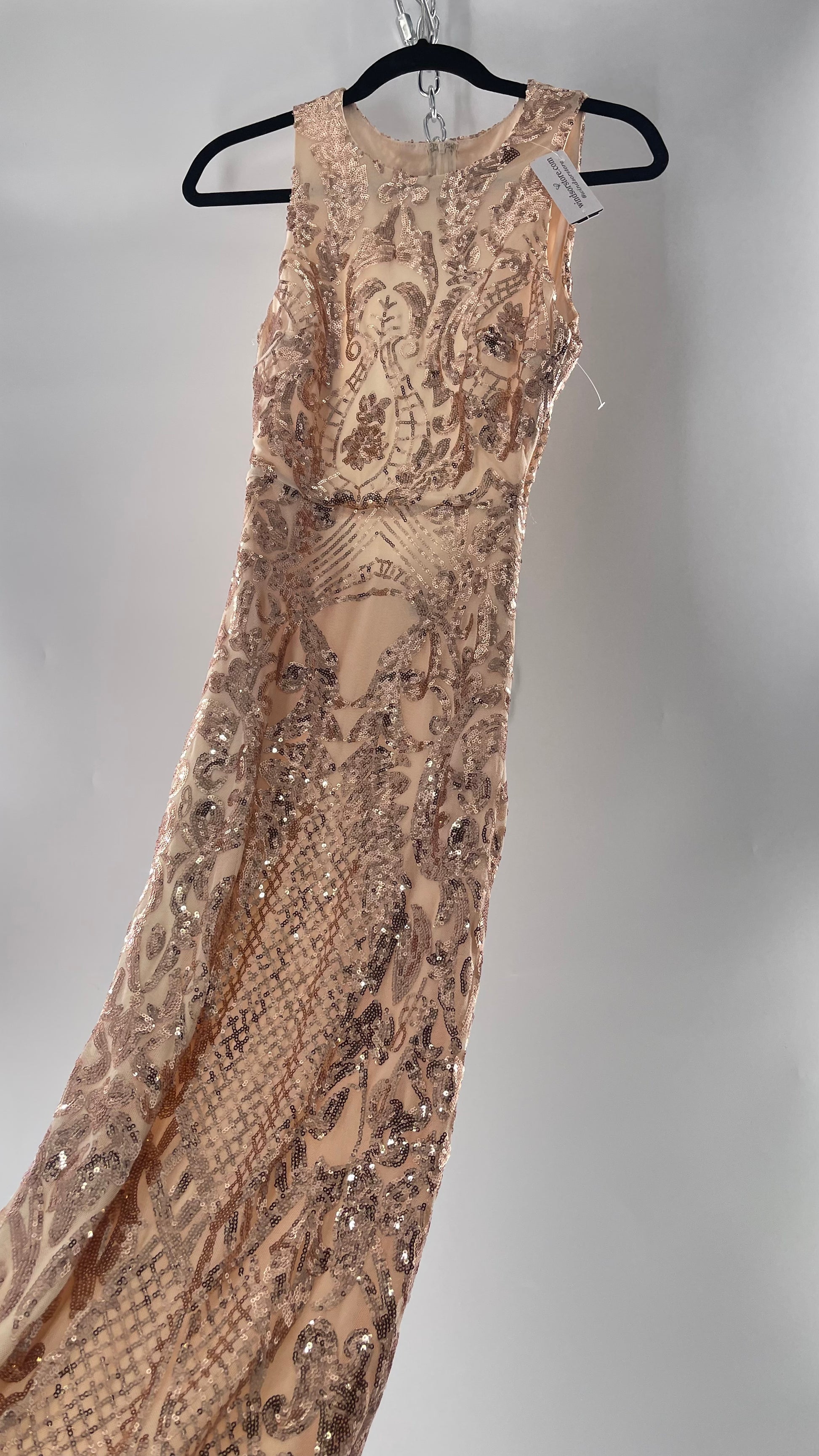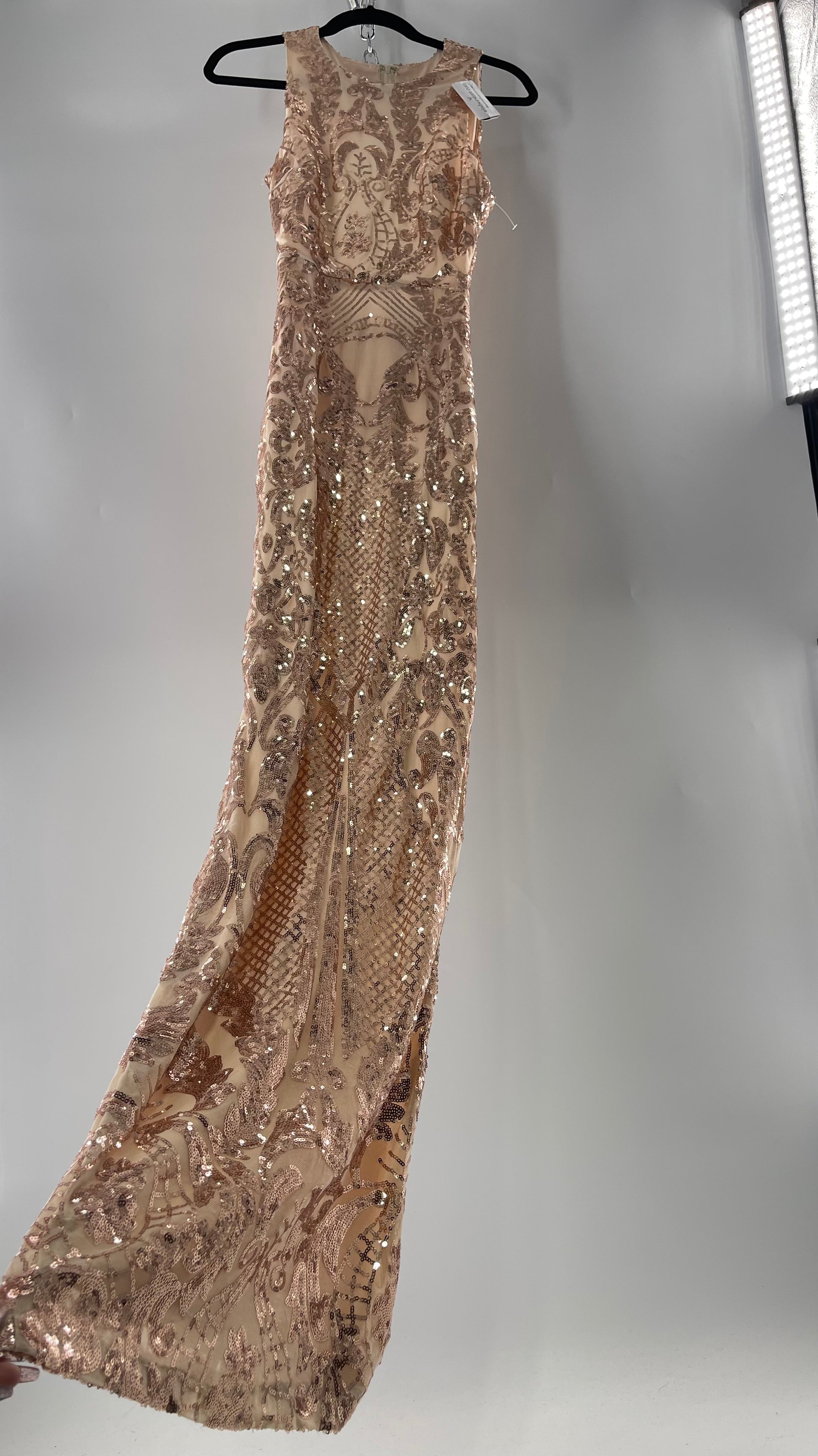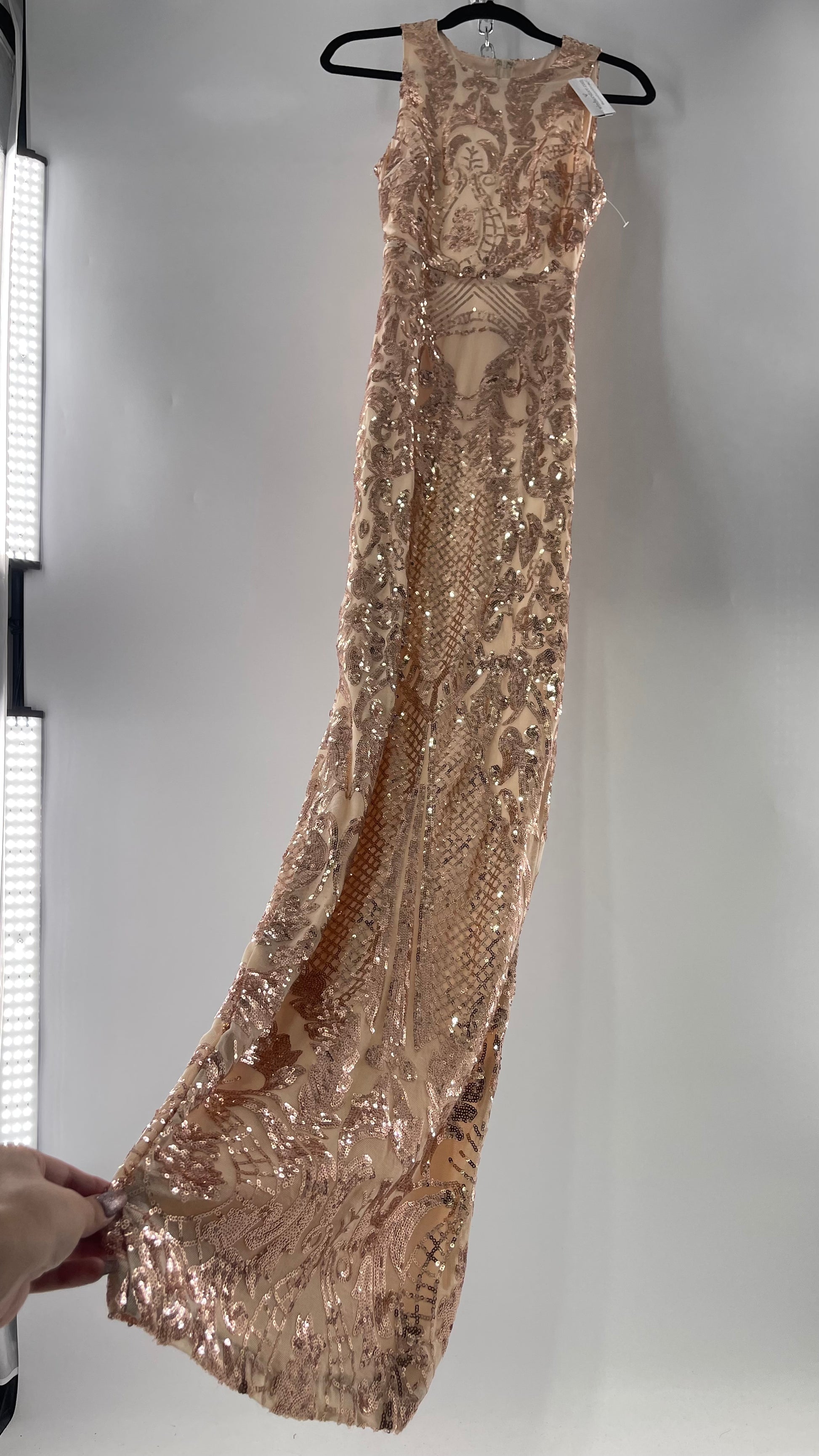 Windsor Rose Gold Sequin Maxi Dress with Side Slit Detail and Open Back (Small)