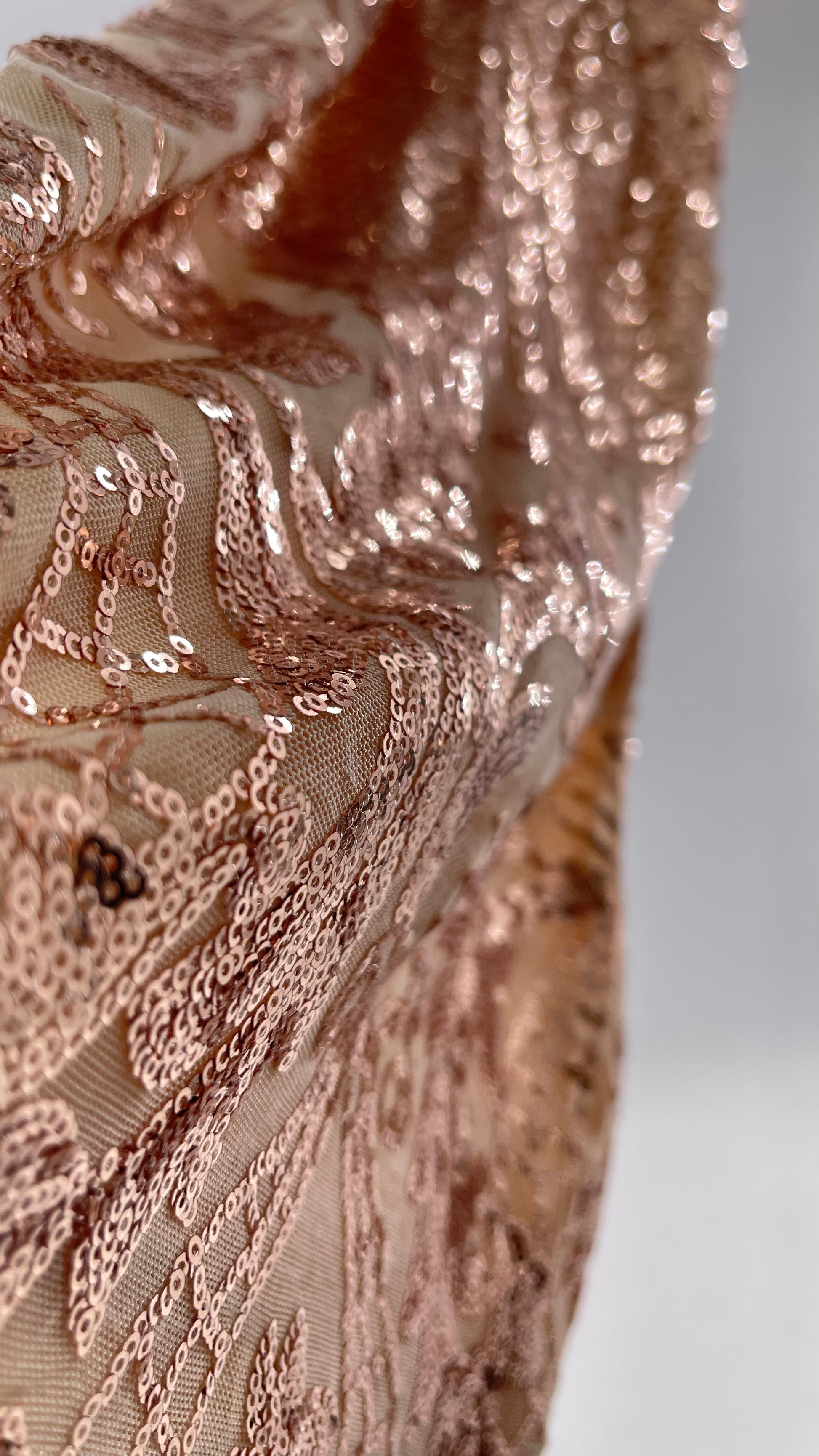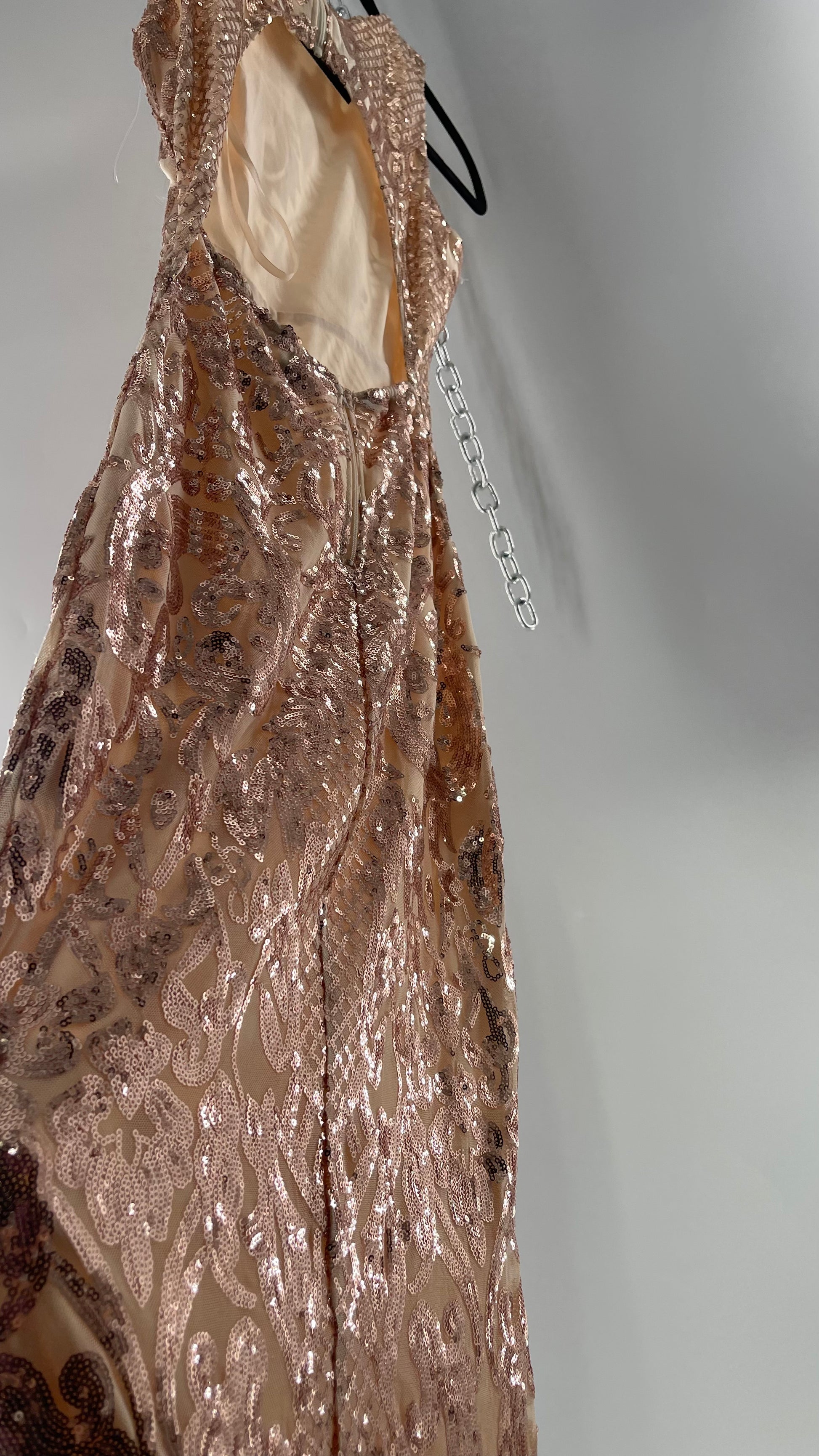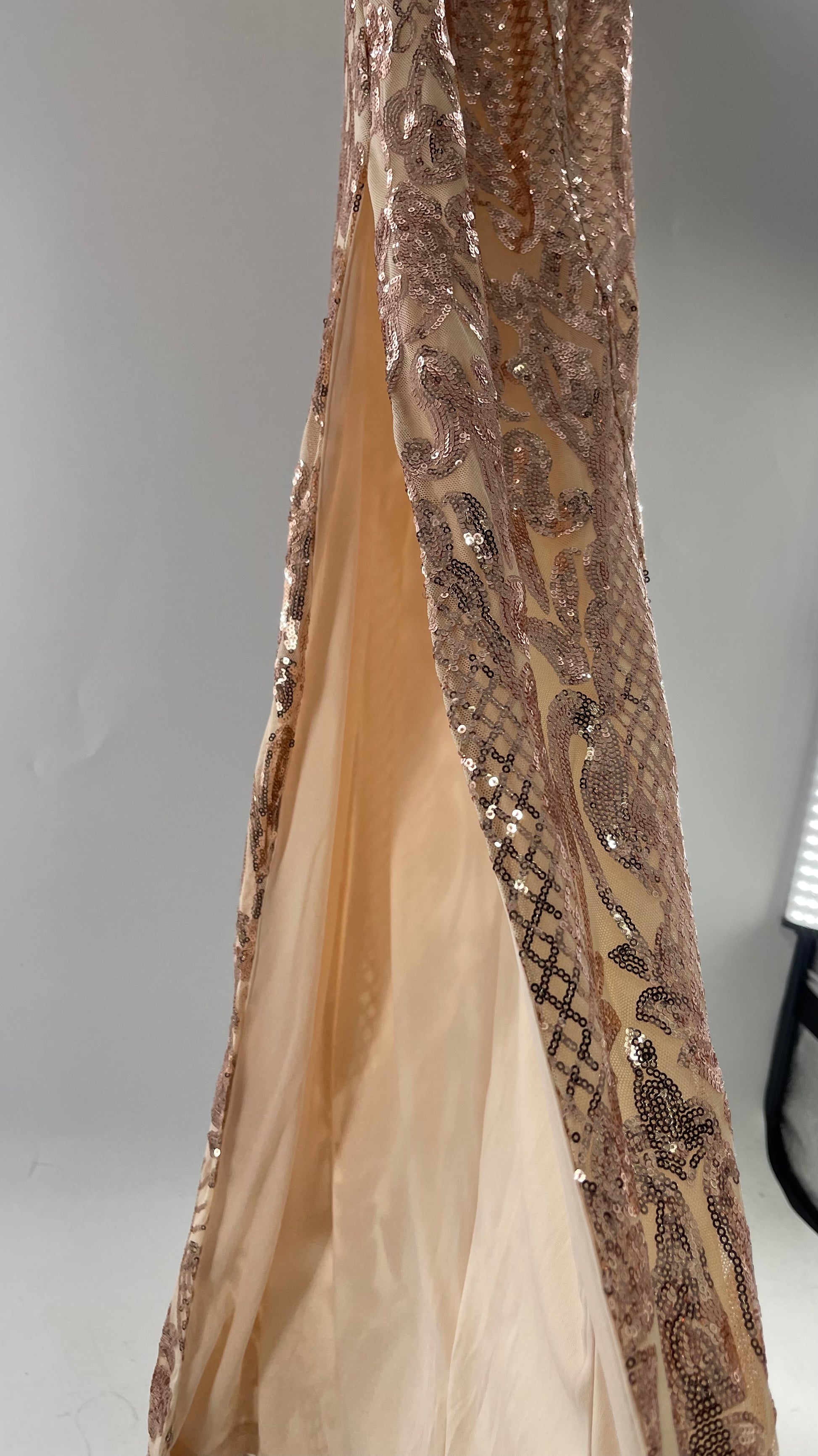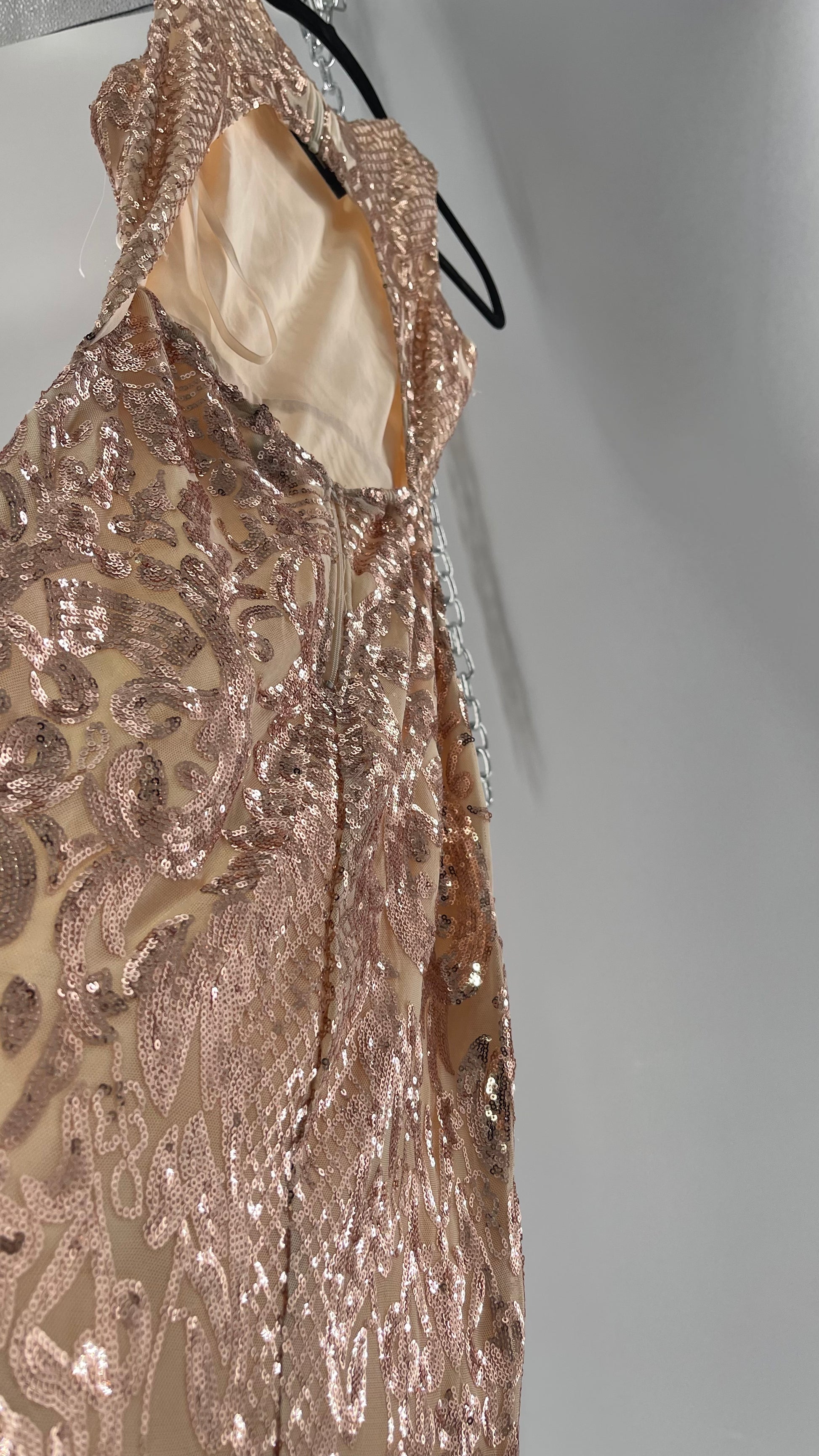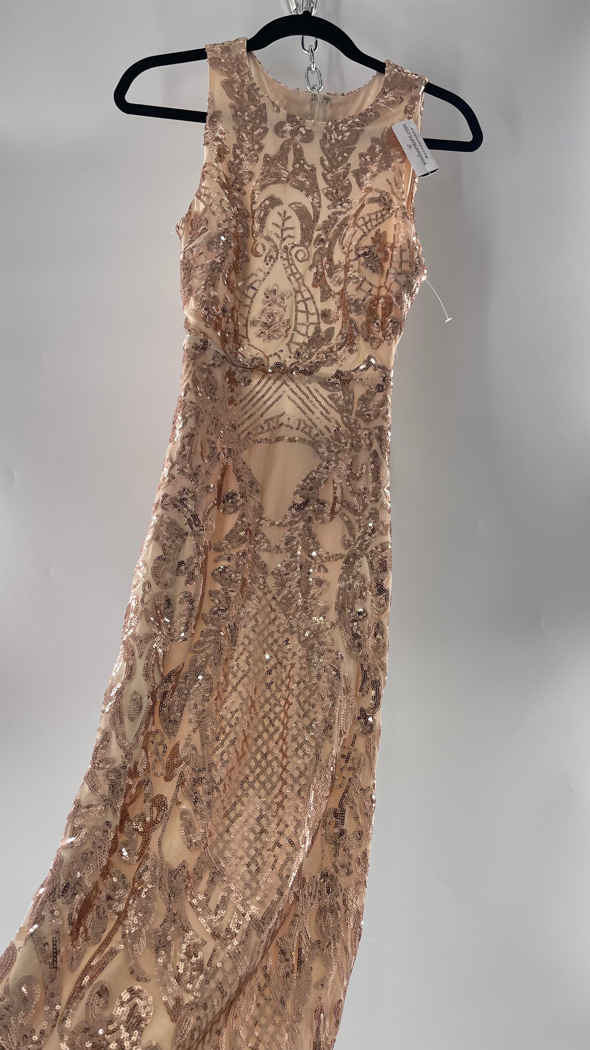 Windsor Rose Gold Sequin Maxi Dress with Side Slit Detail and Open Back (Small)