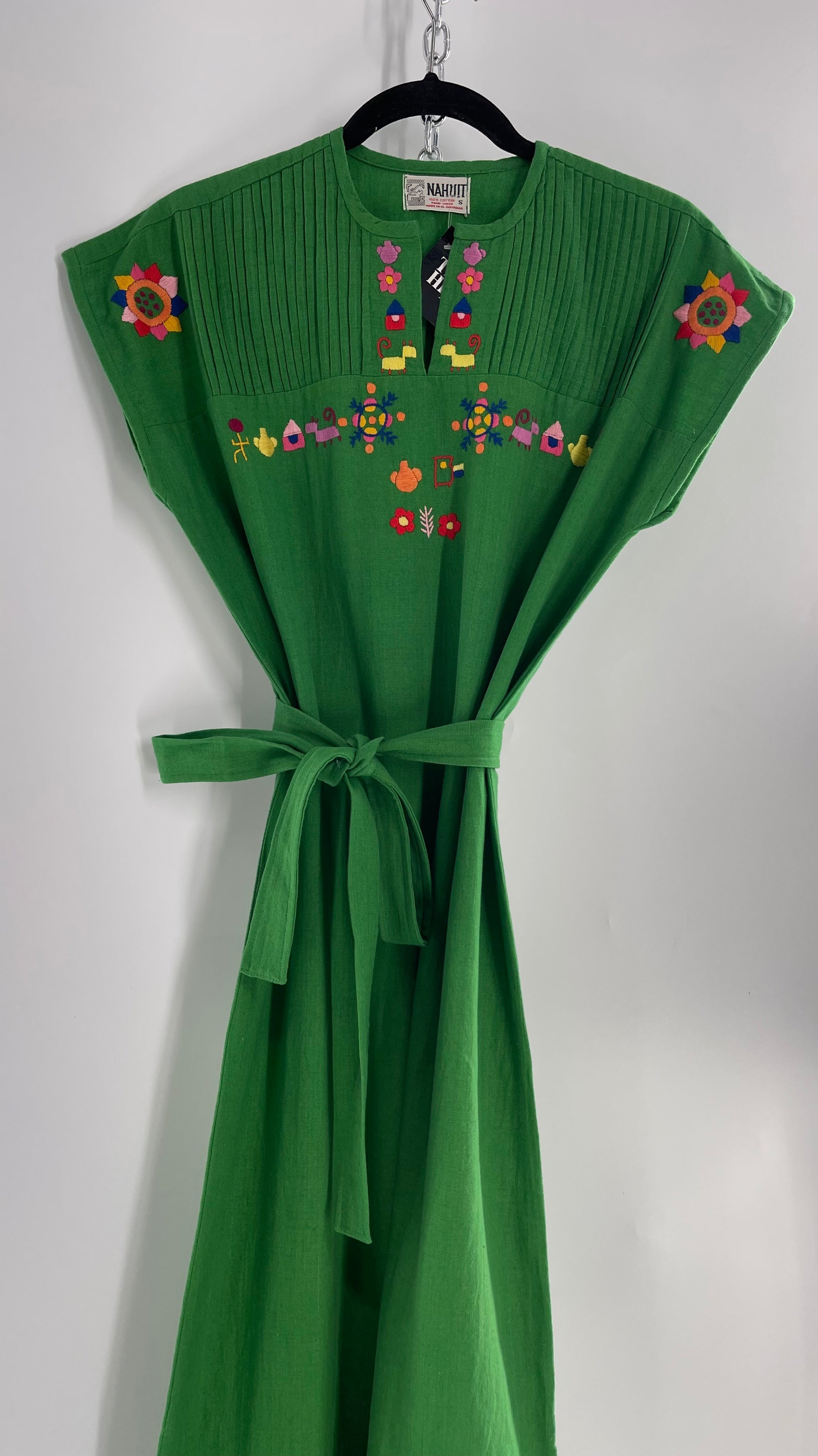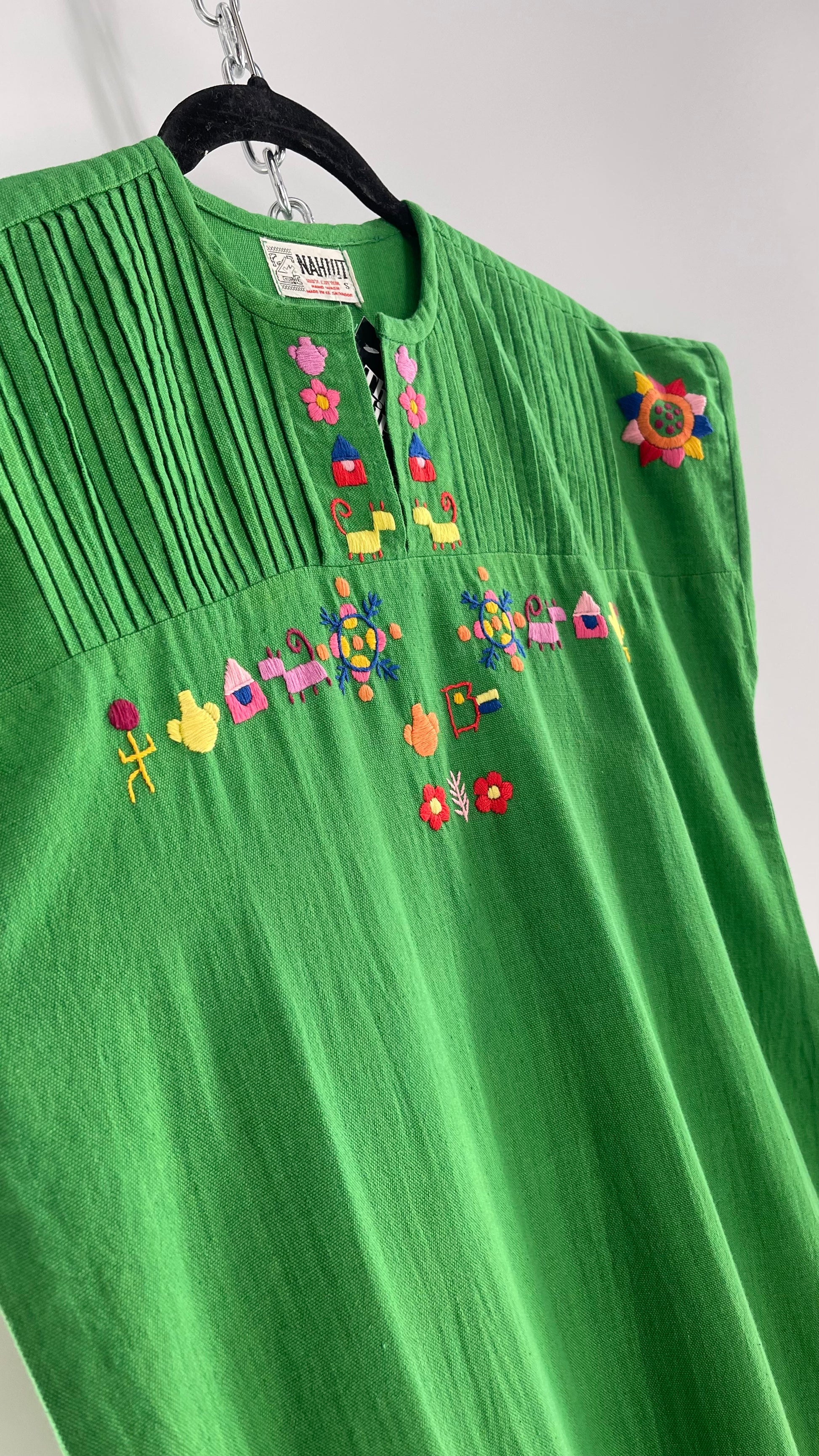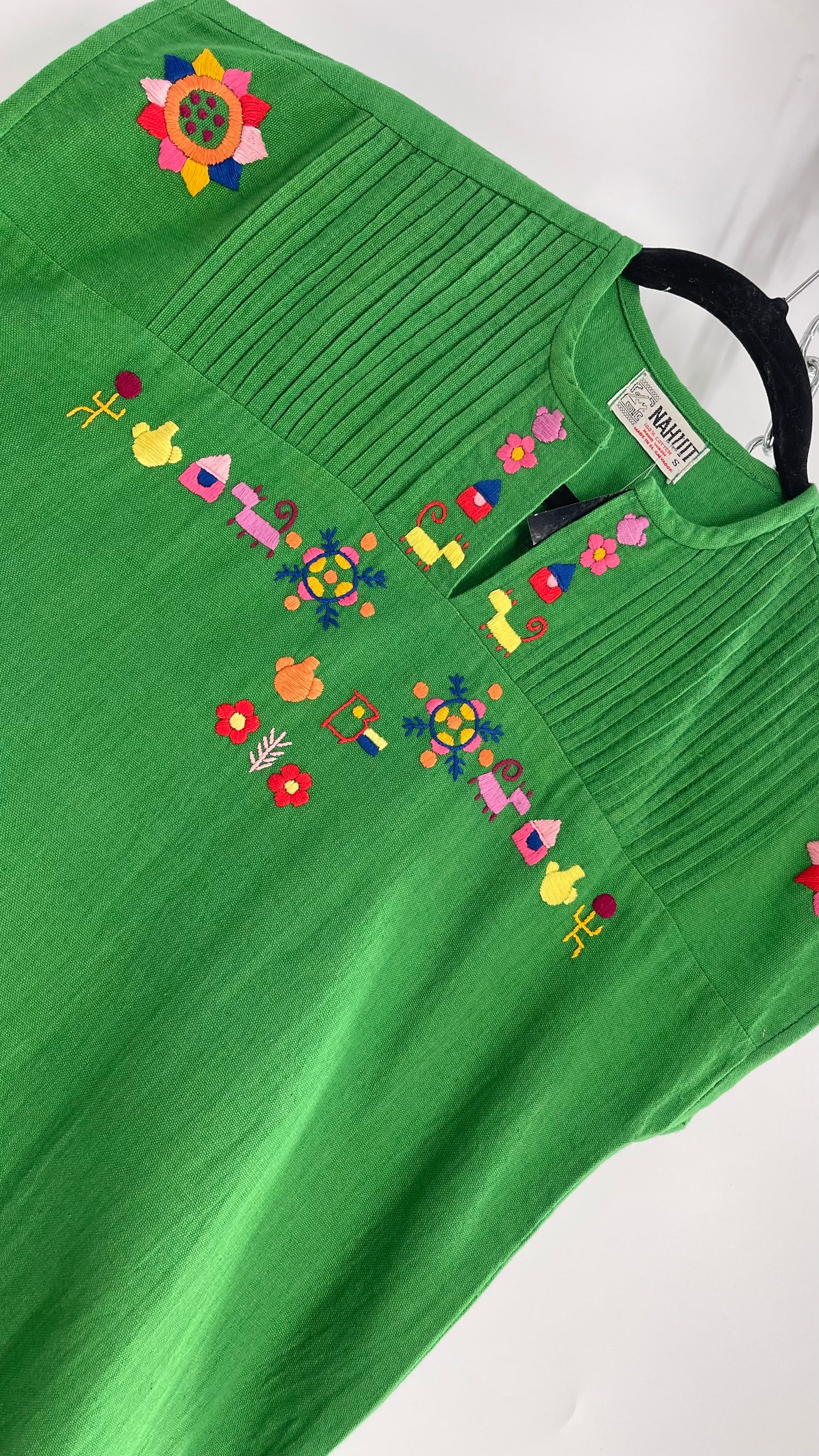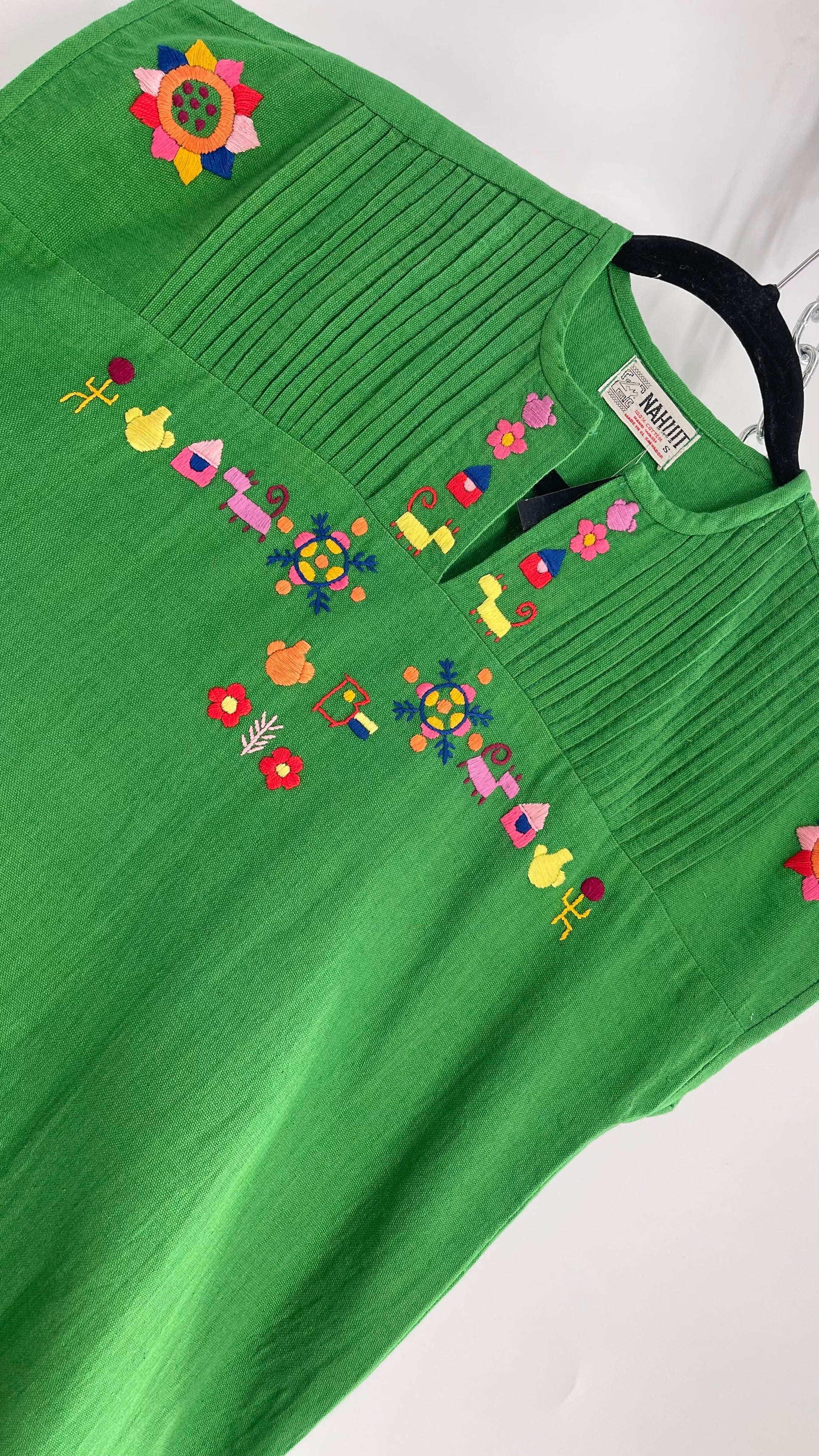 Vintage 1970s NAHUIT 100% Cotton, Hippy/Bohemian Kelly Green, Embroidered Tunic Dress Made In El Salvador (Small)