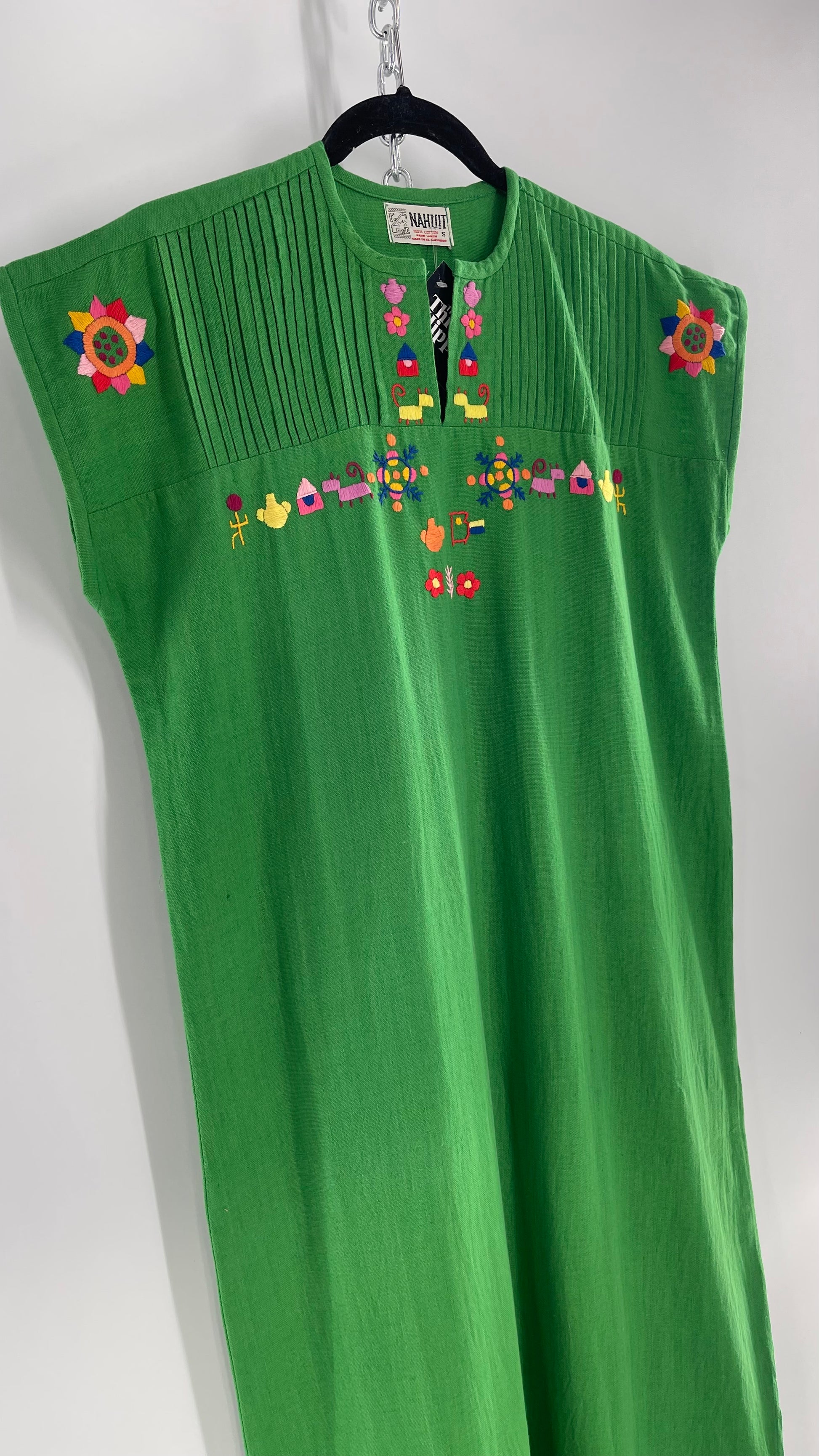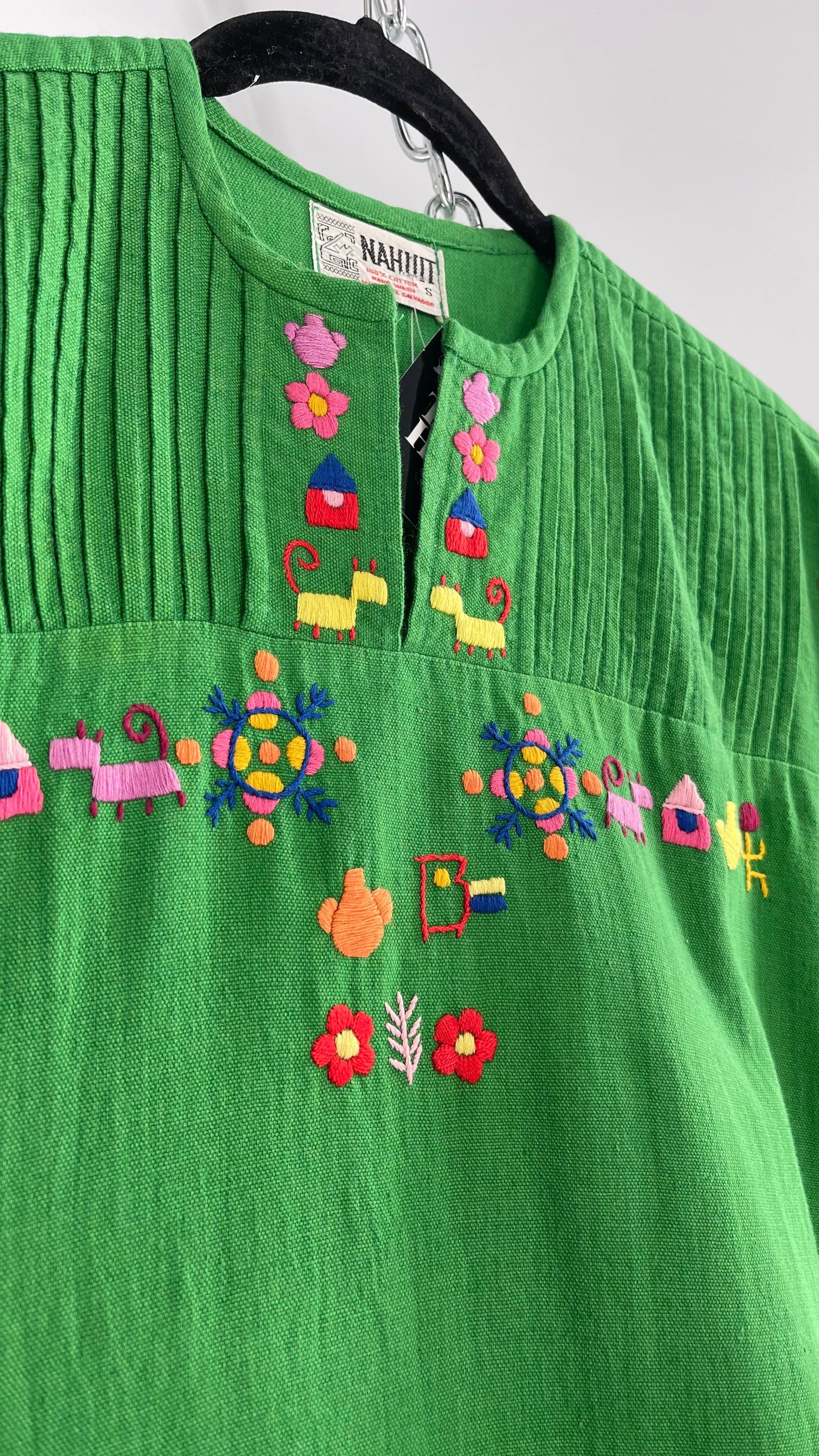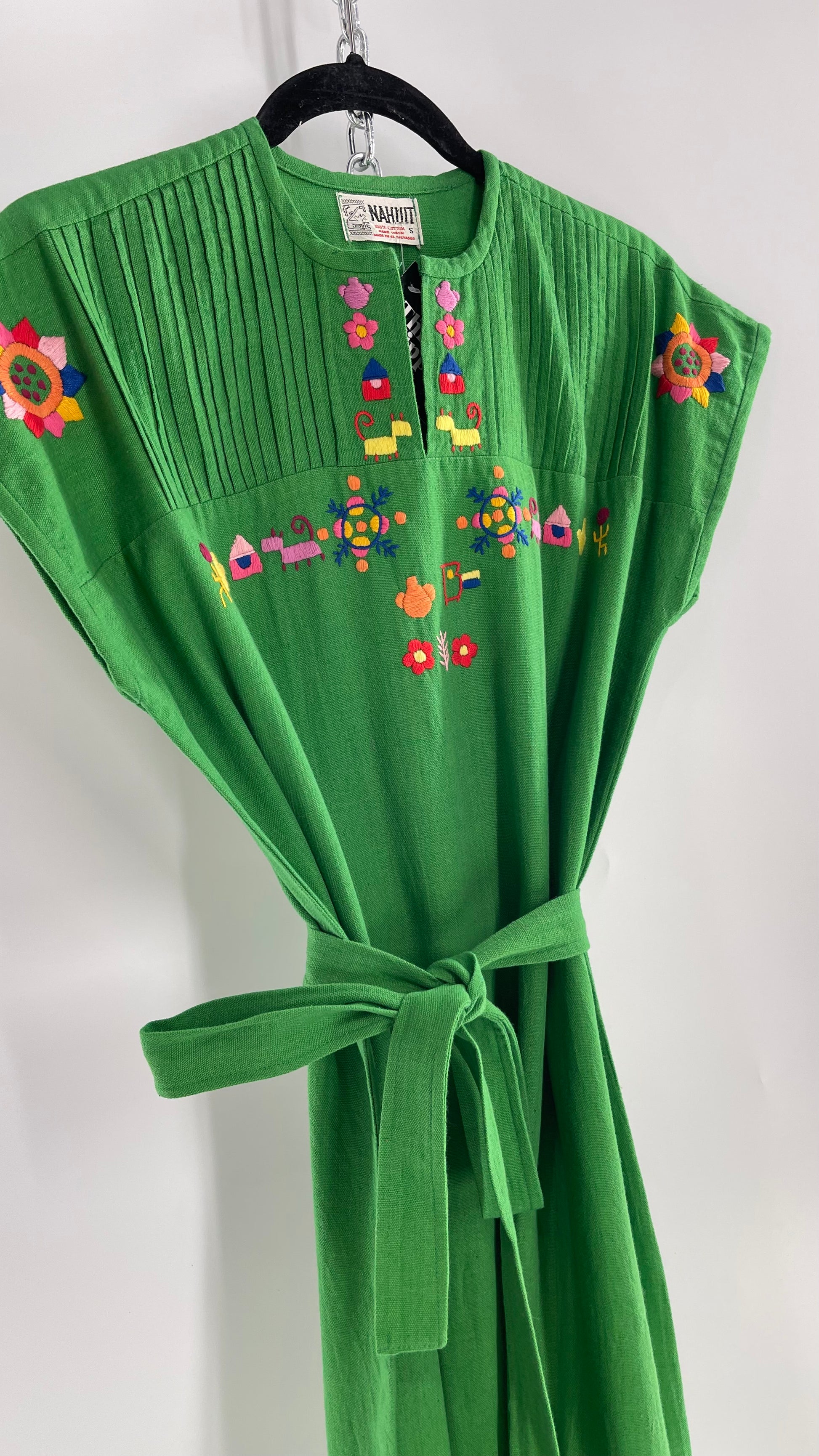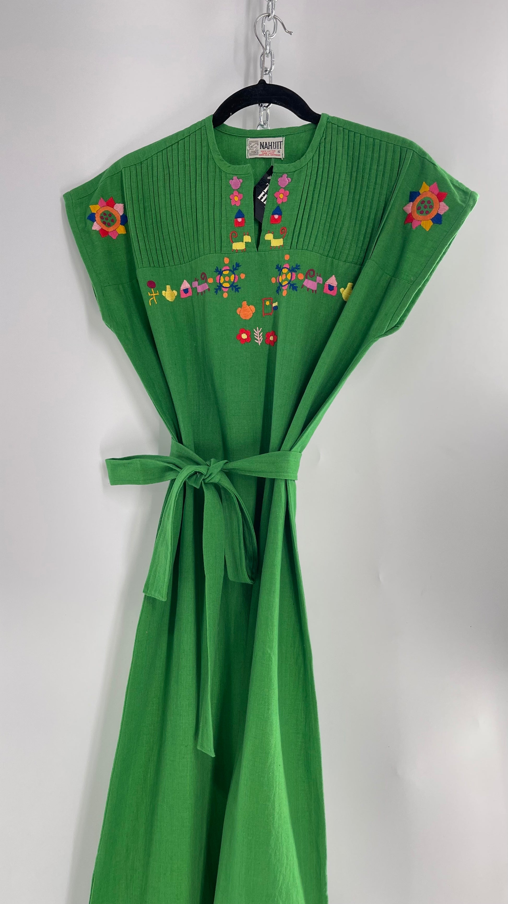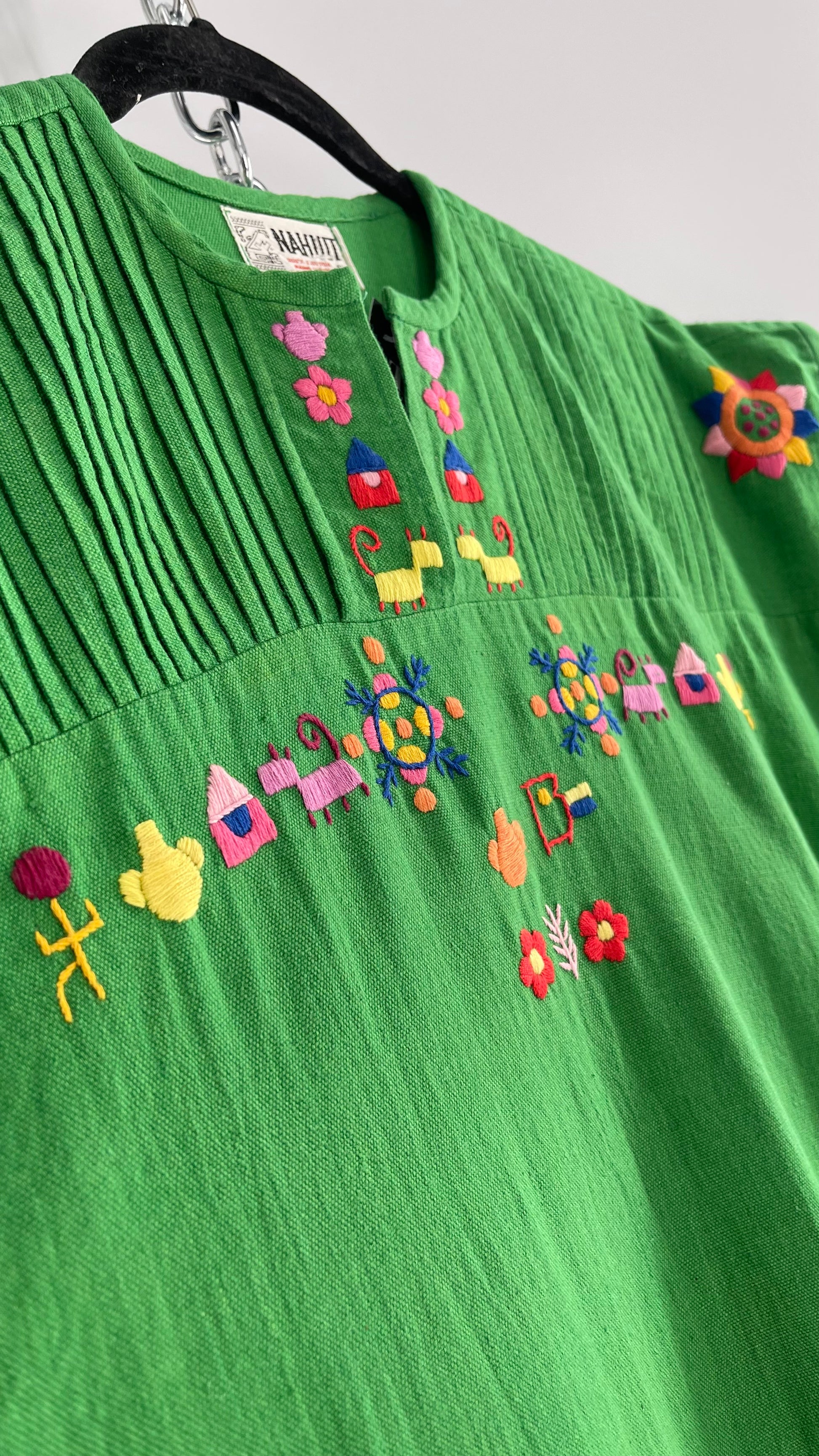 Vintage 1970s NAHUIT 100% Cotton, Hippy/Bohemian Kelly Green, Embroidered Tunic Dress Made In El Salvador (Small)