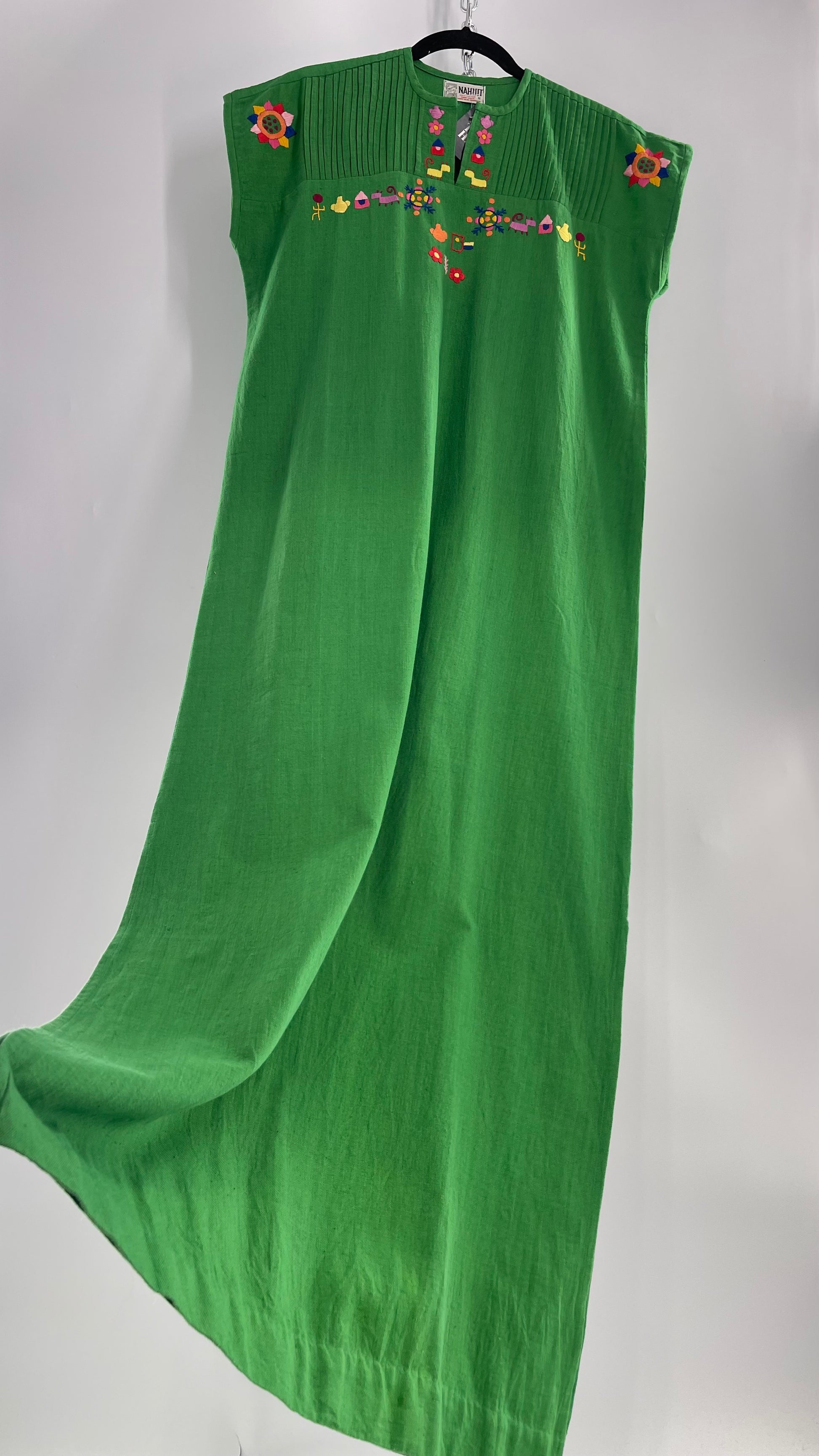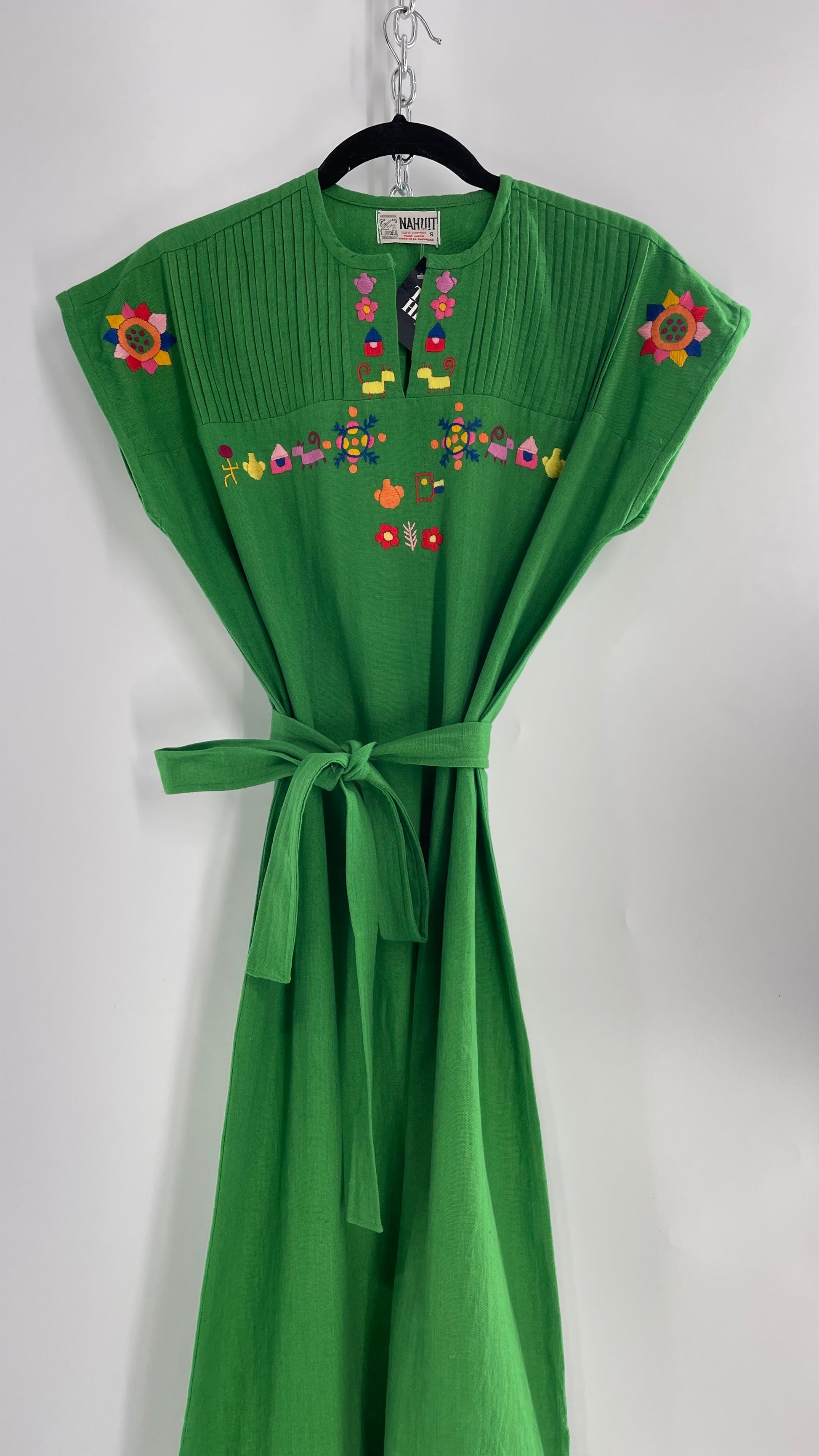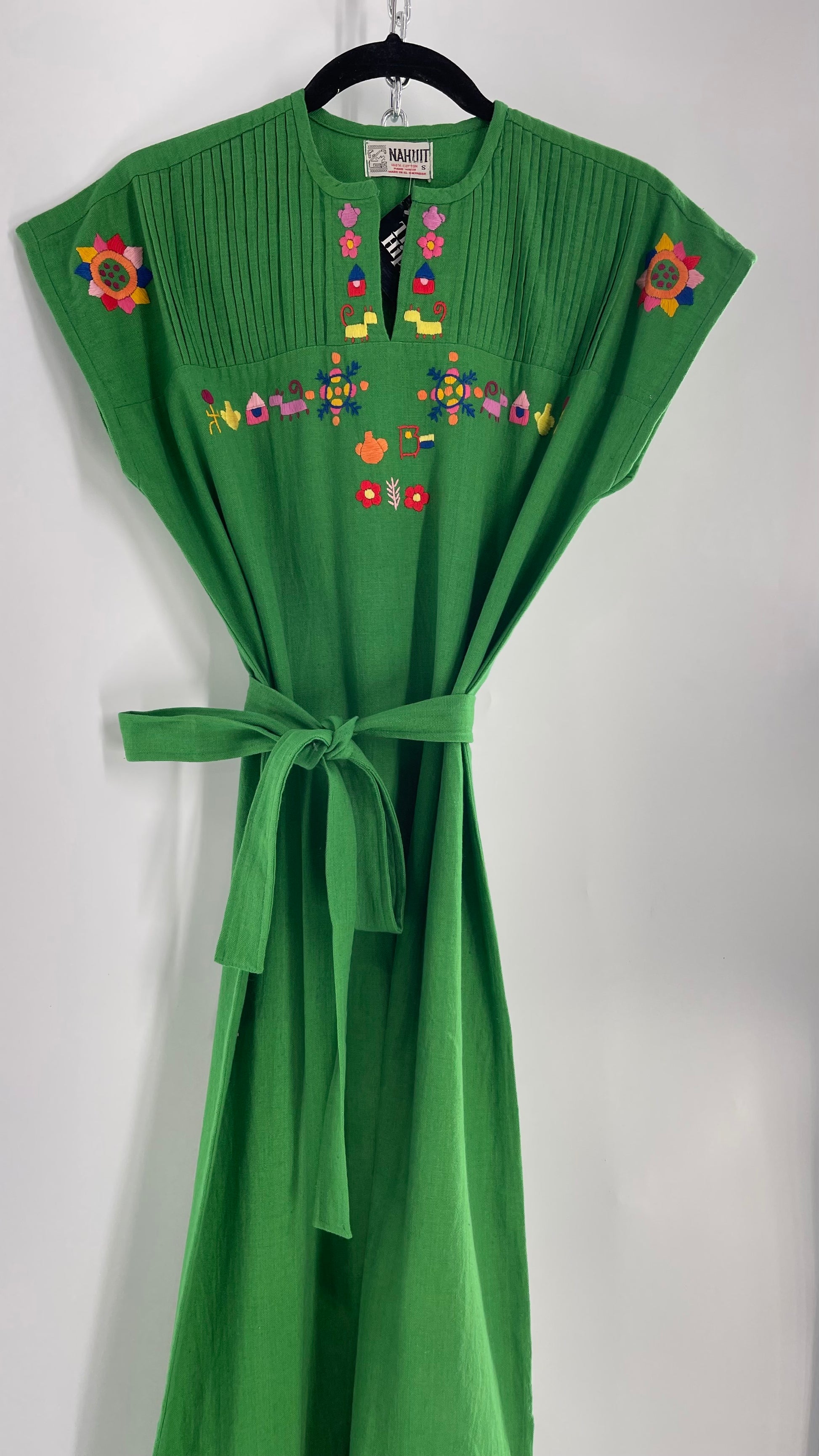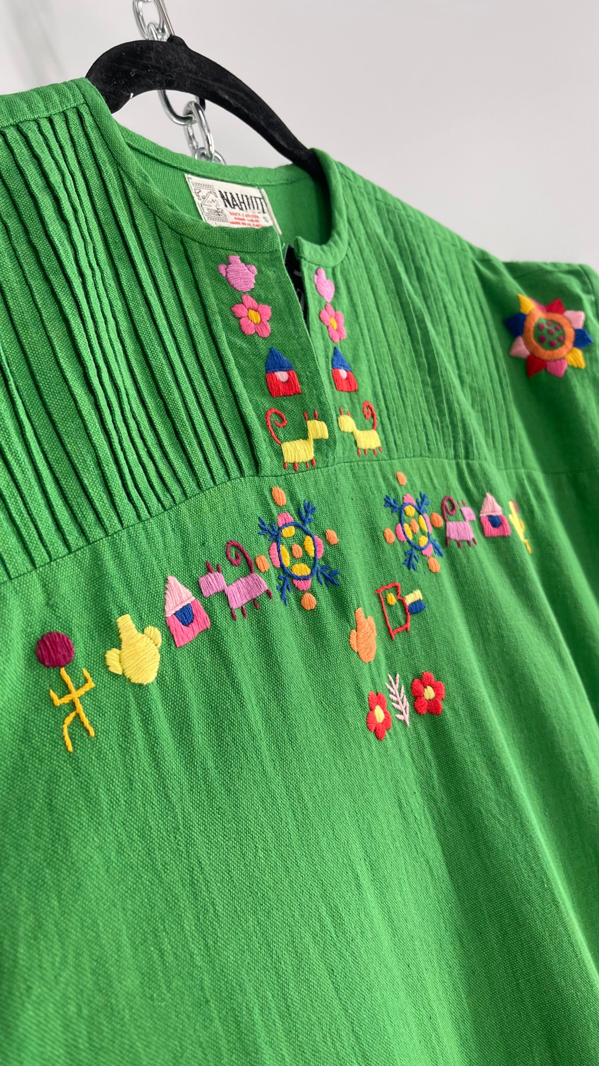 Vintage 1970s NAHUIT 100% Cotton, Hippy/Bohemian Kelly Green, Embroidered Tunic Dress Made In El Salvador (Small)