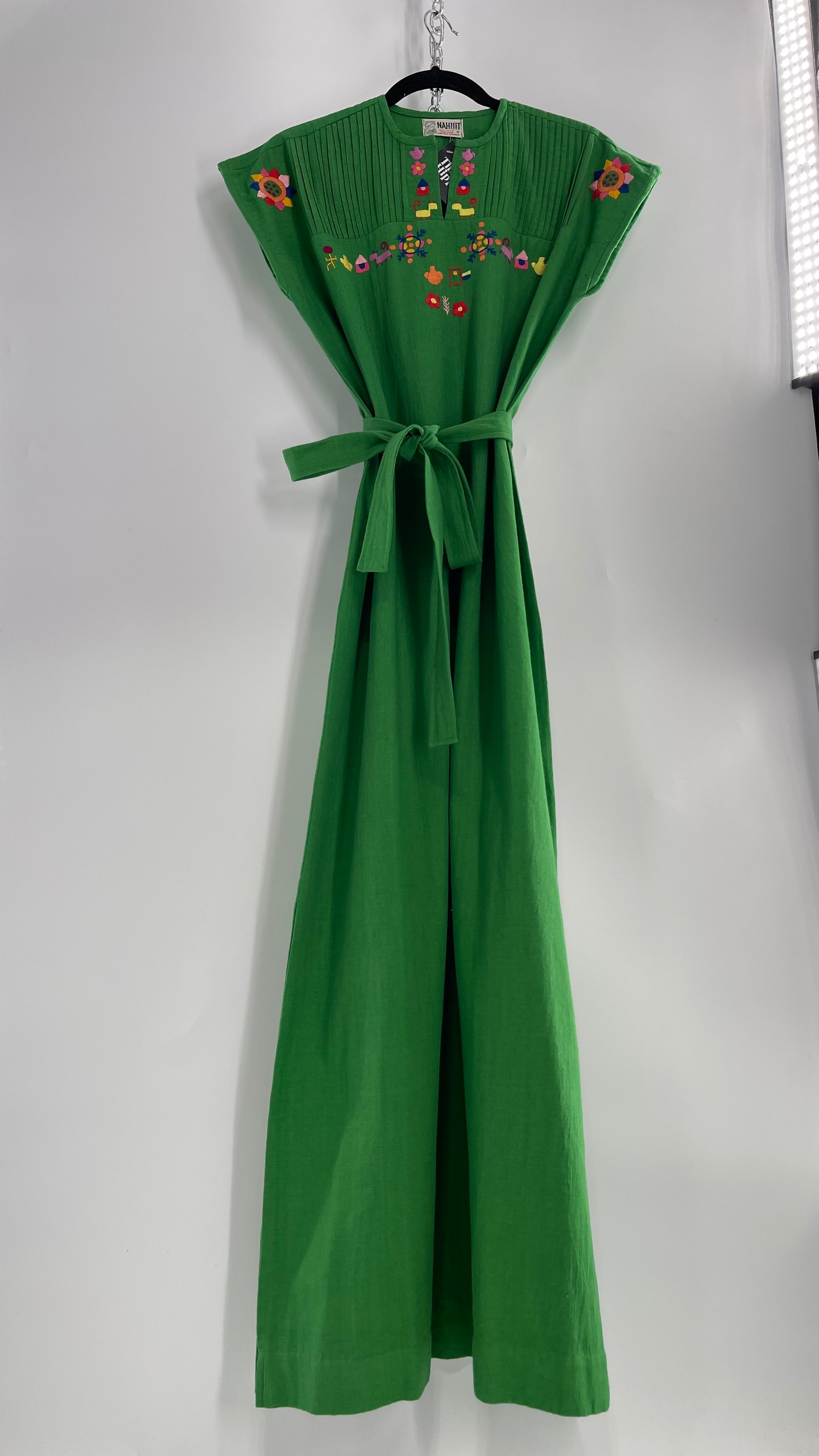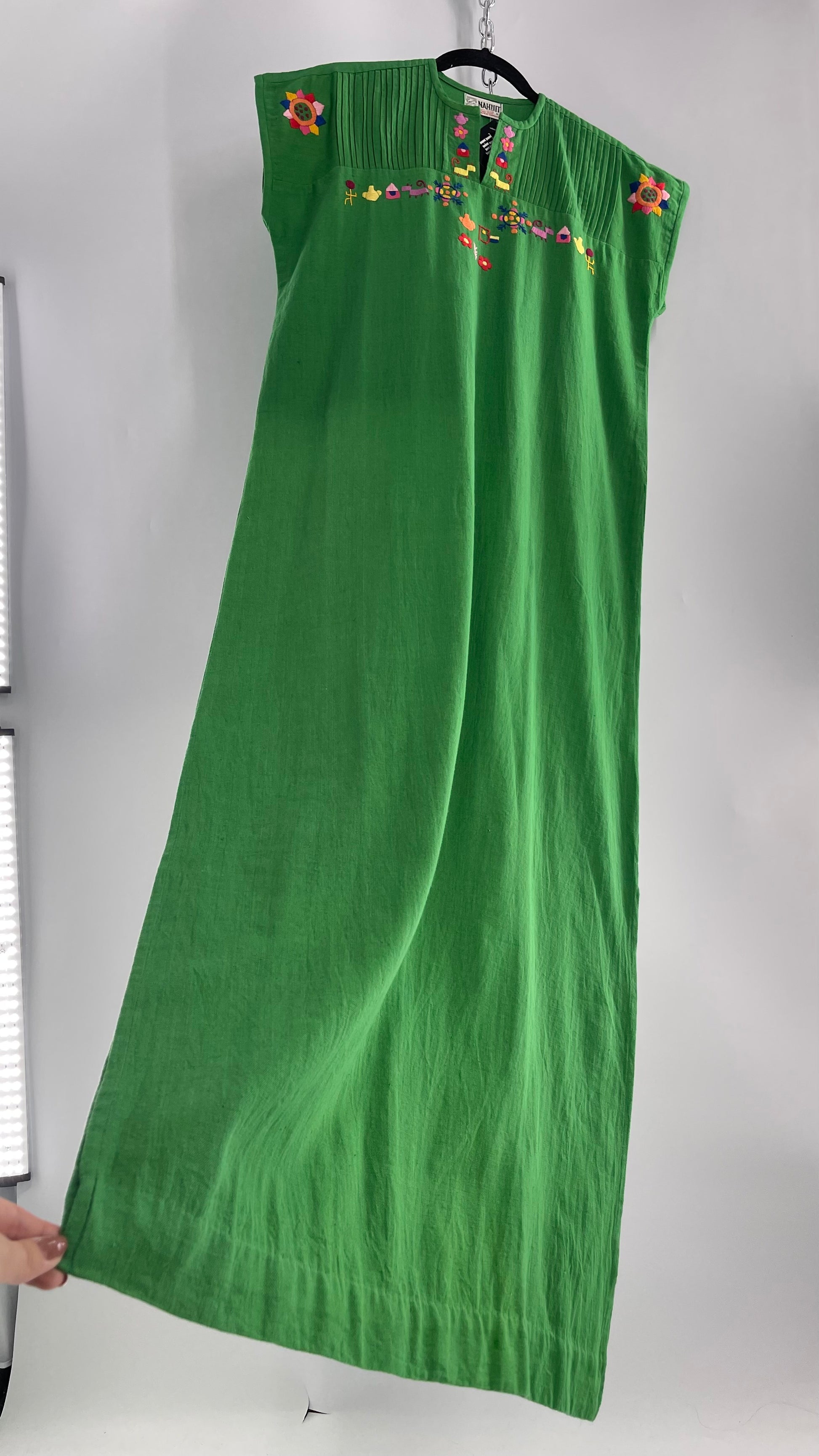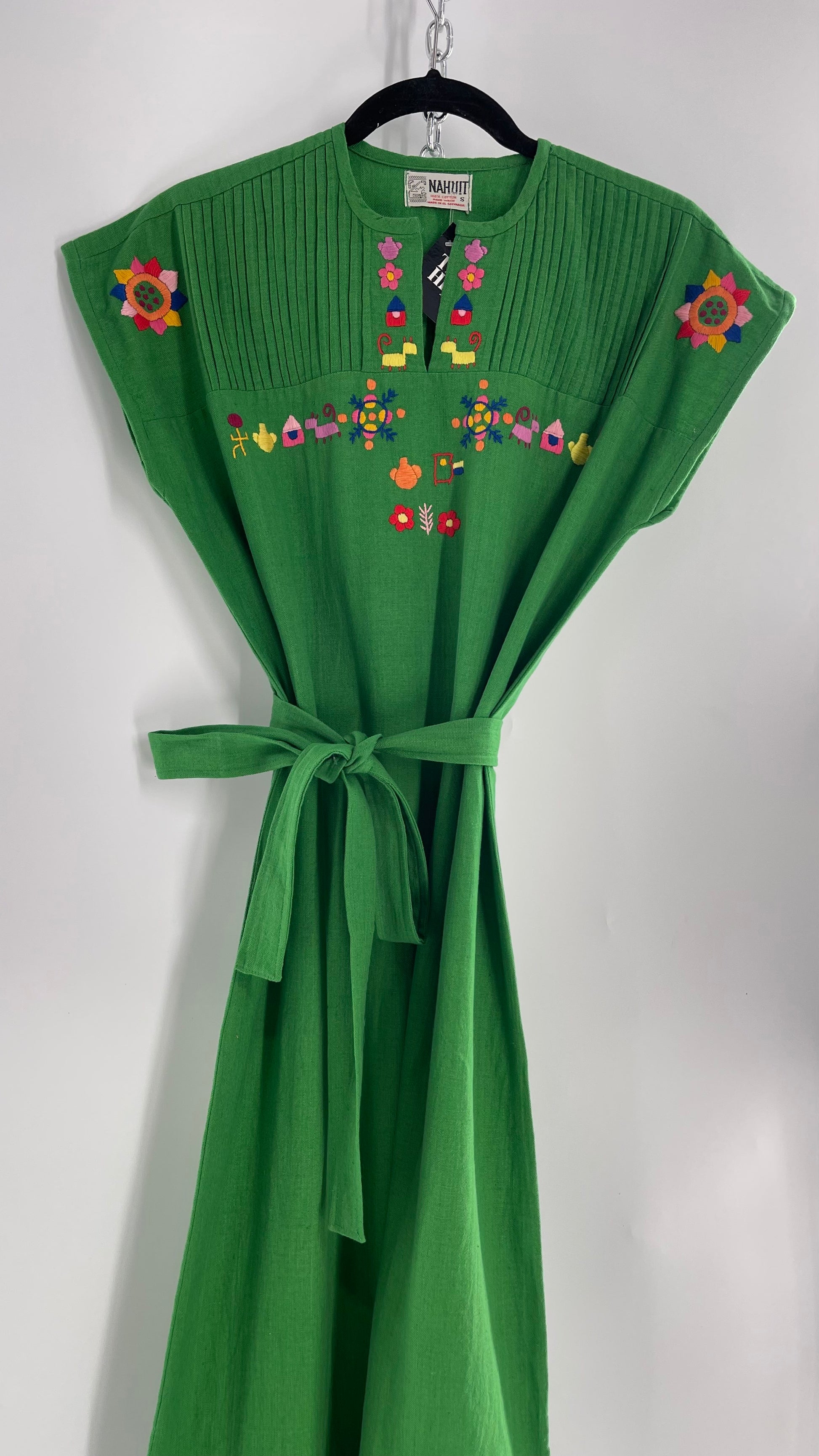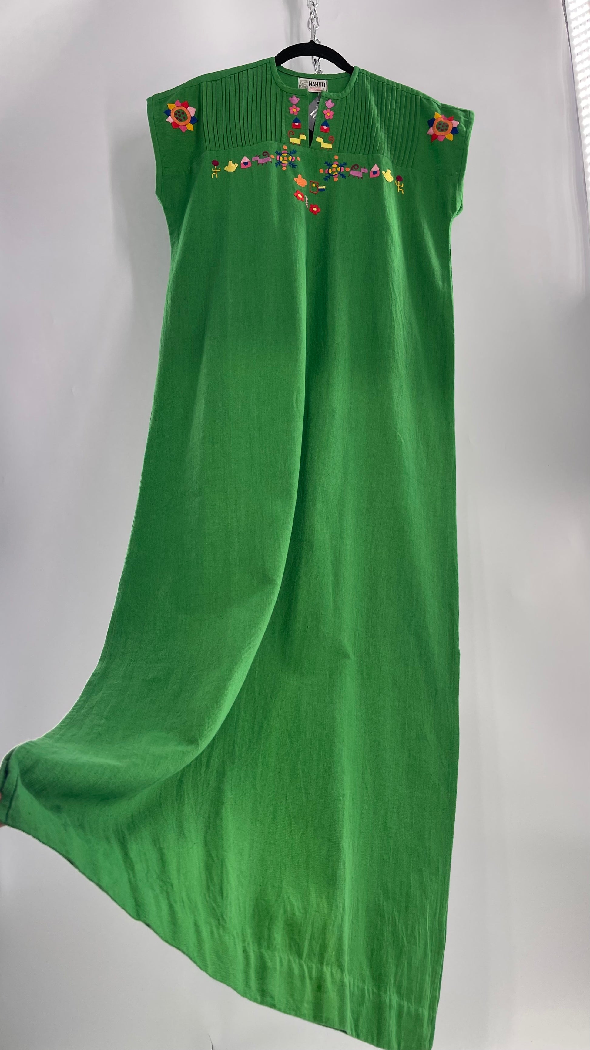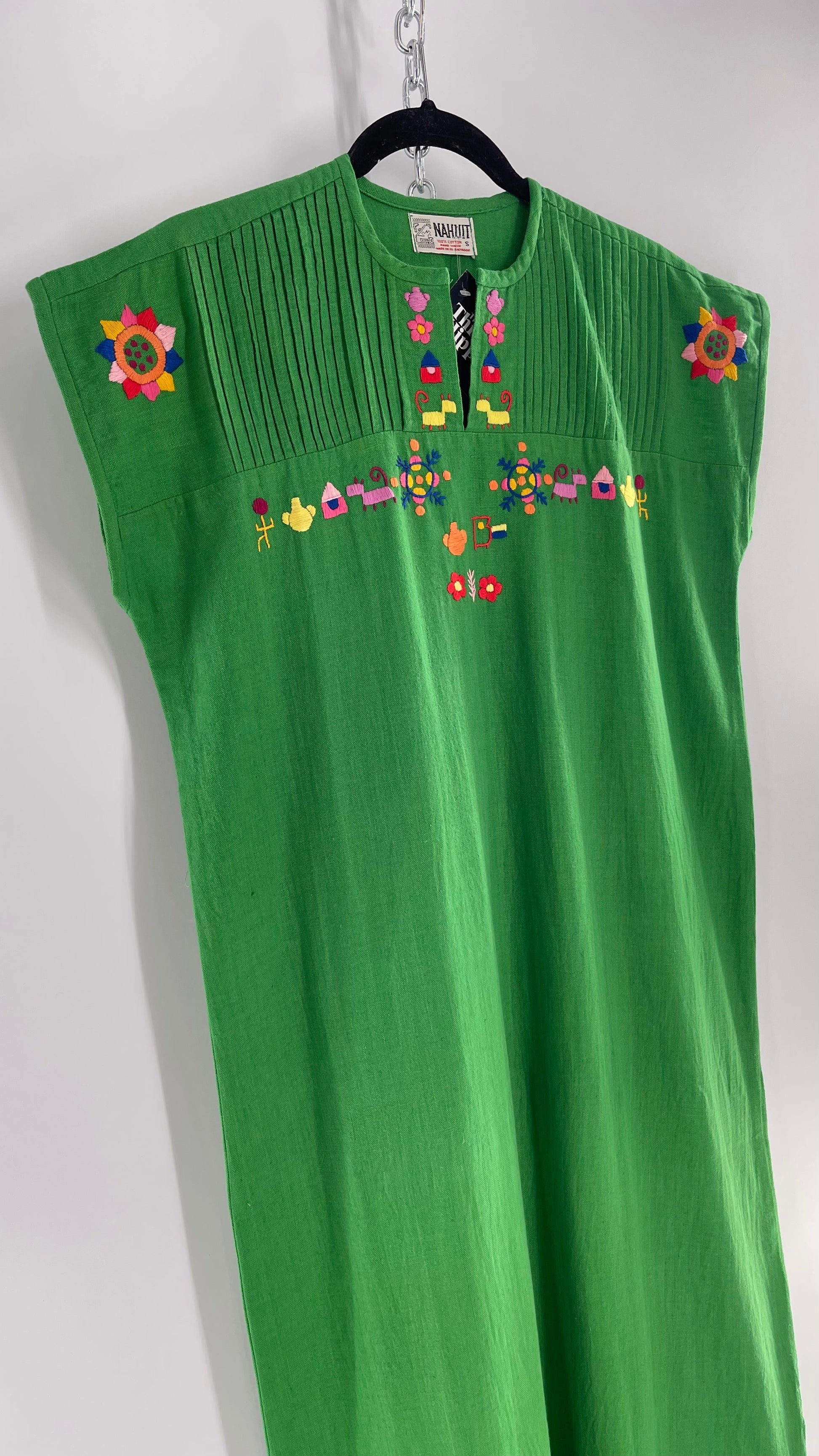 Vintage 1970s NAHUIT 100% Cotton, Hippy/Bohemian Kelly Green, Embroidered Tunic Dress Made In El Salvador (Small)
