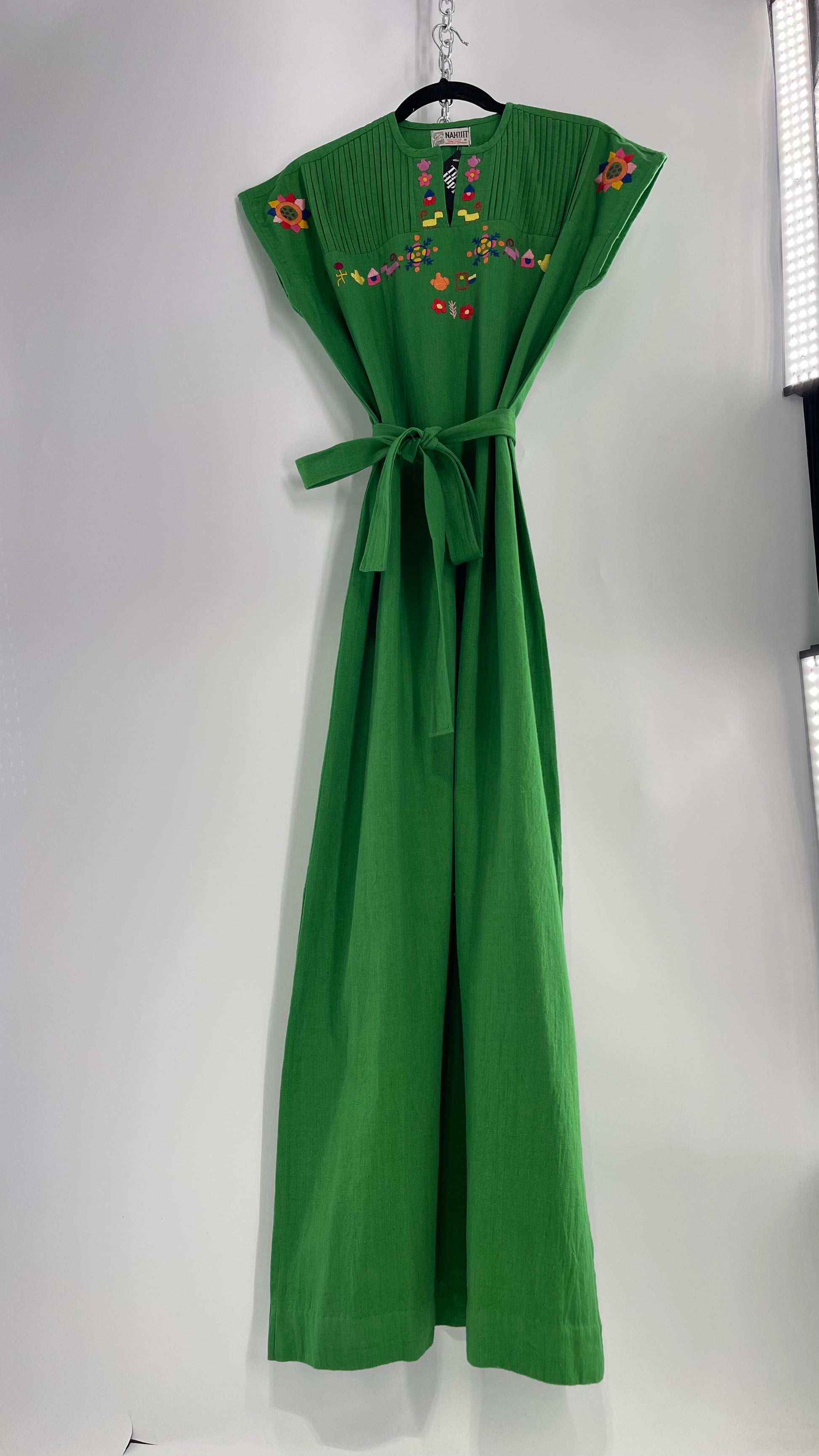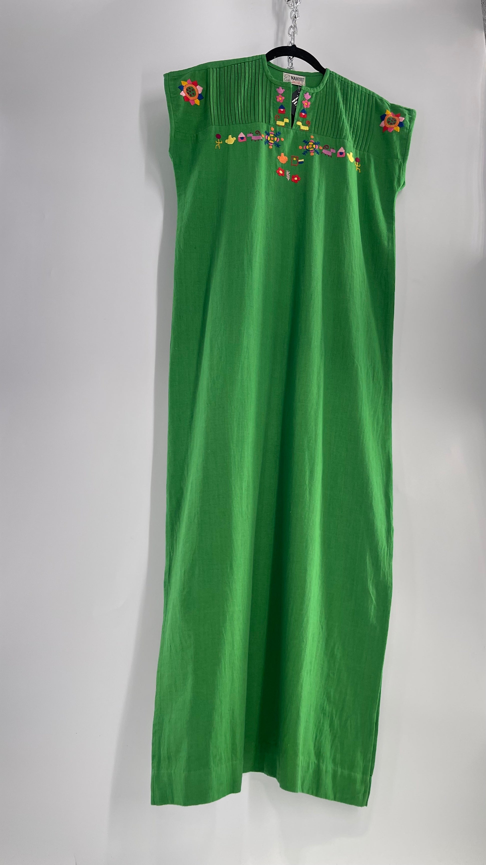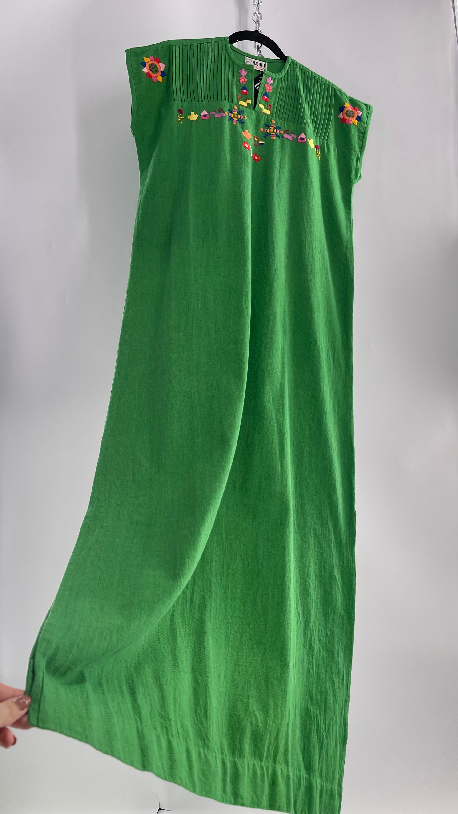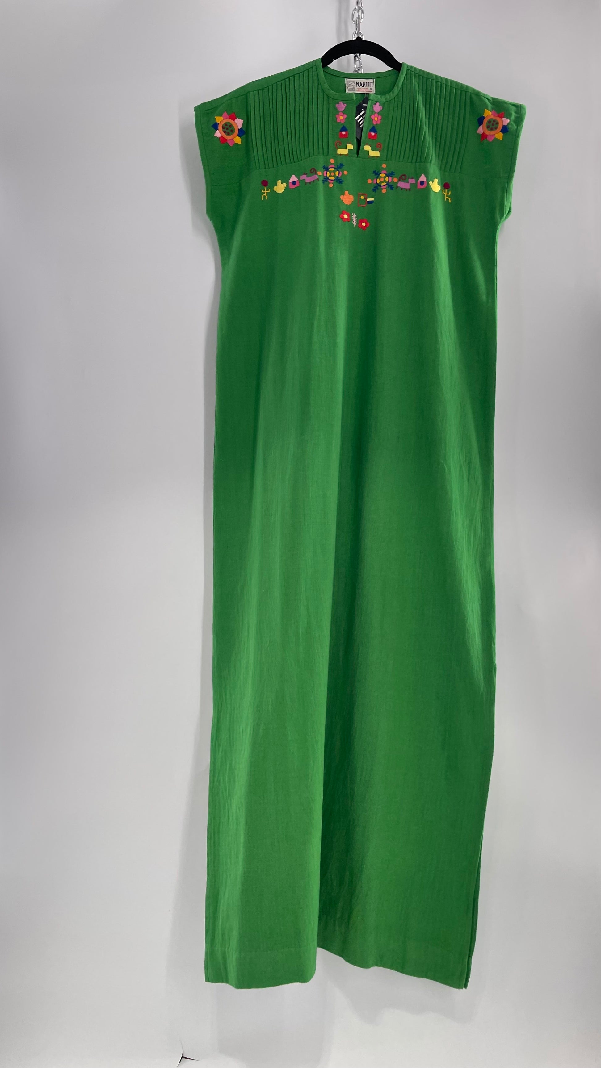 Vintage 1970s NAHUIT 100% Cotton, Hippy/Bohemian Kelly Green, Embroidered Tunic Dress Made In El Salvador (Small)