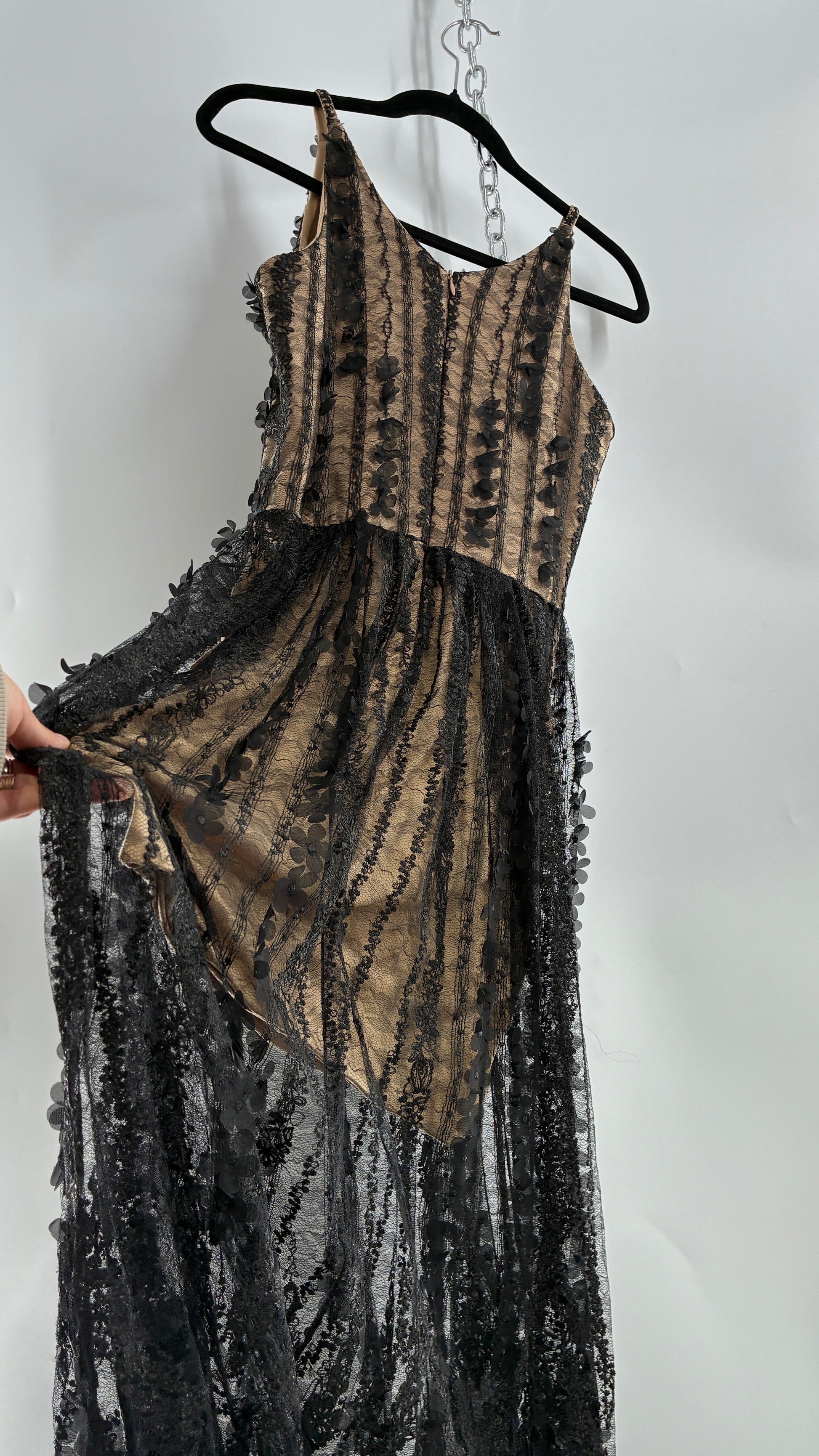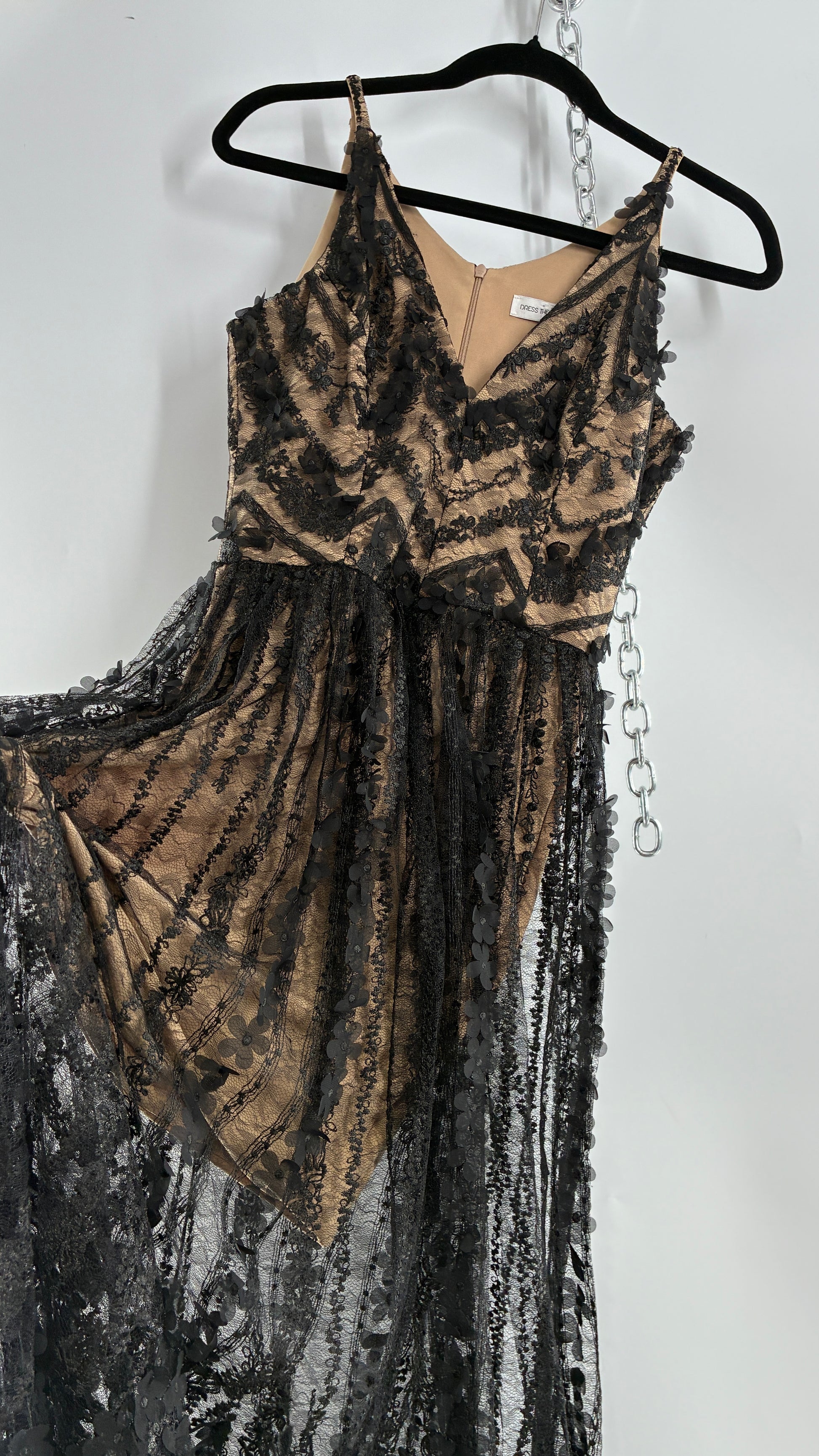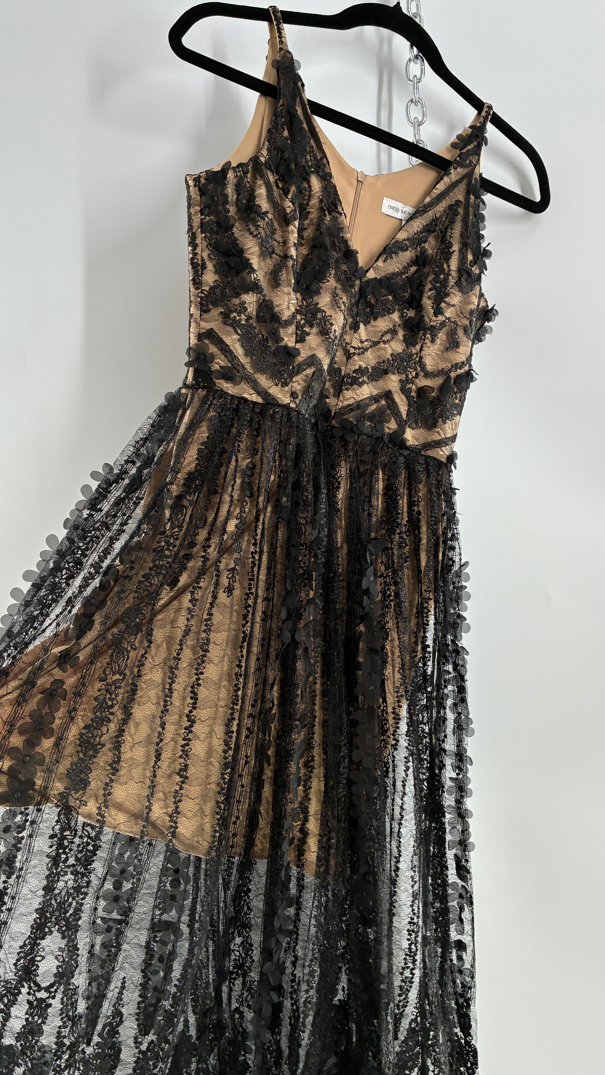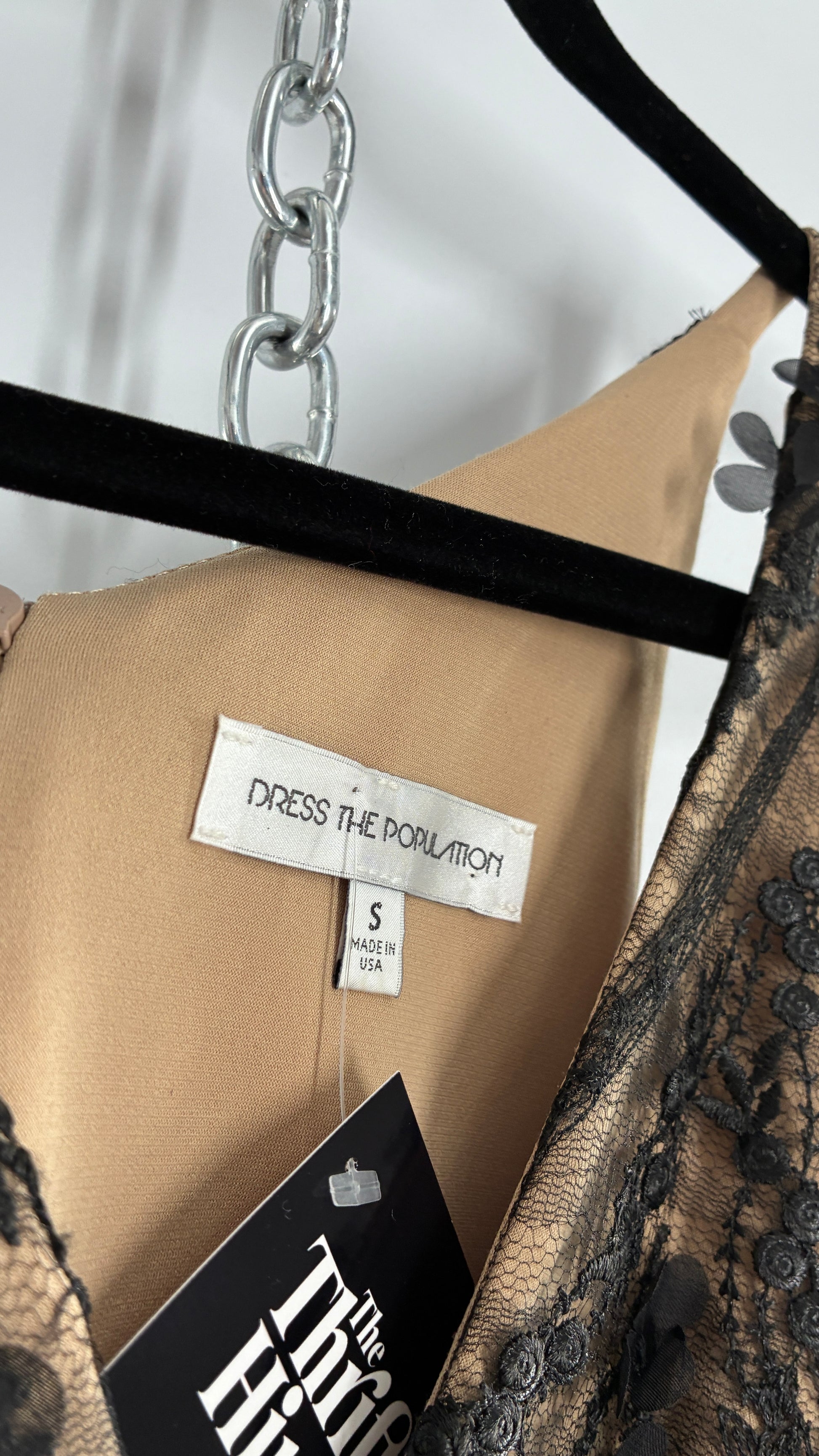 DRESS THE POPULATION Nude Underlay Black 3D Floral Lace Appliqué Overlay Dress (Small)