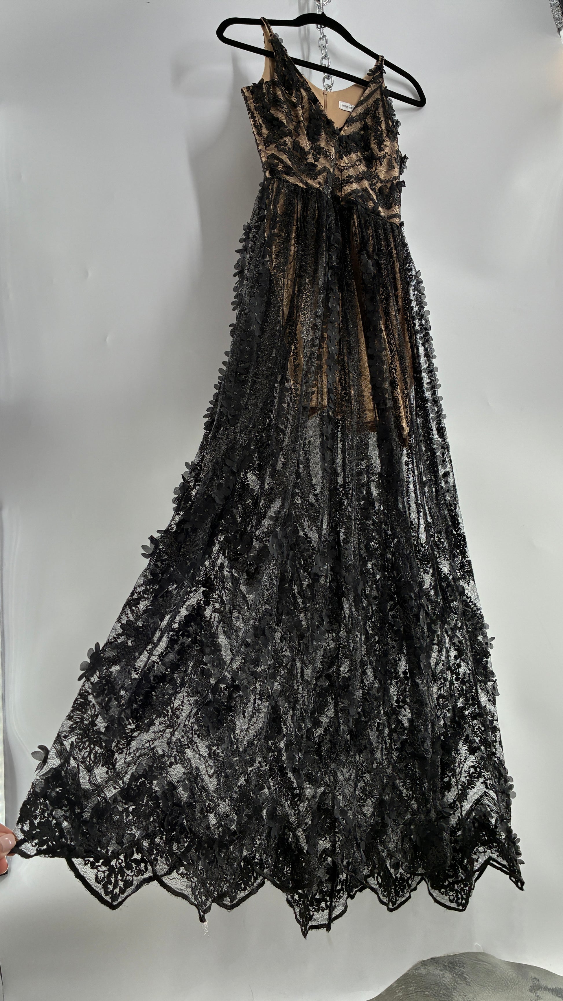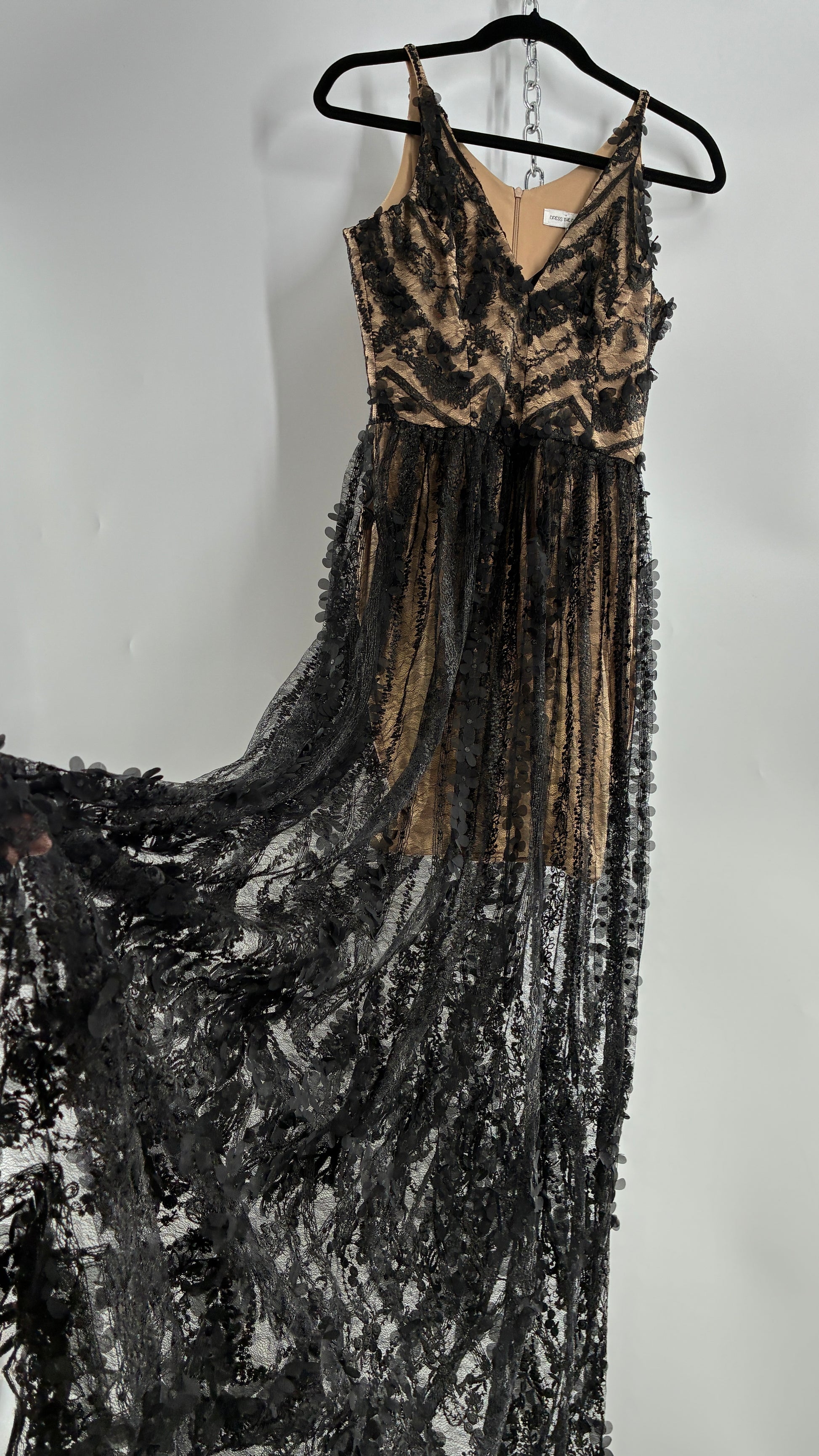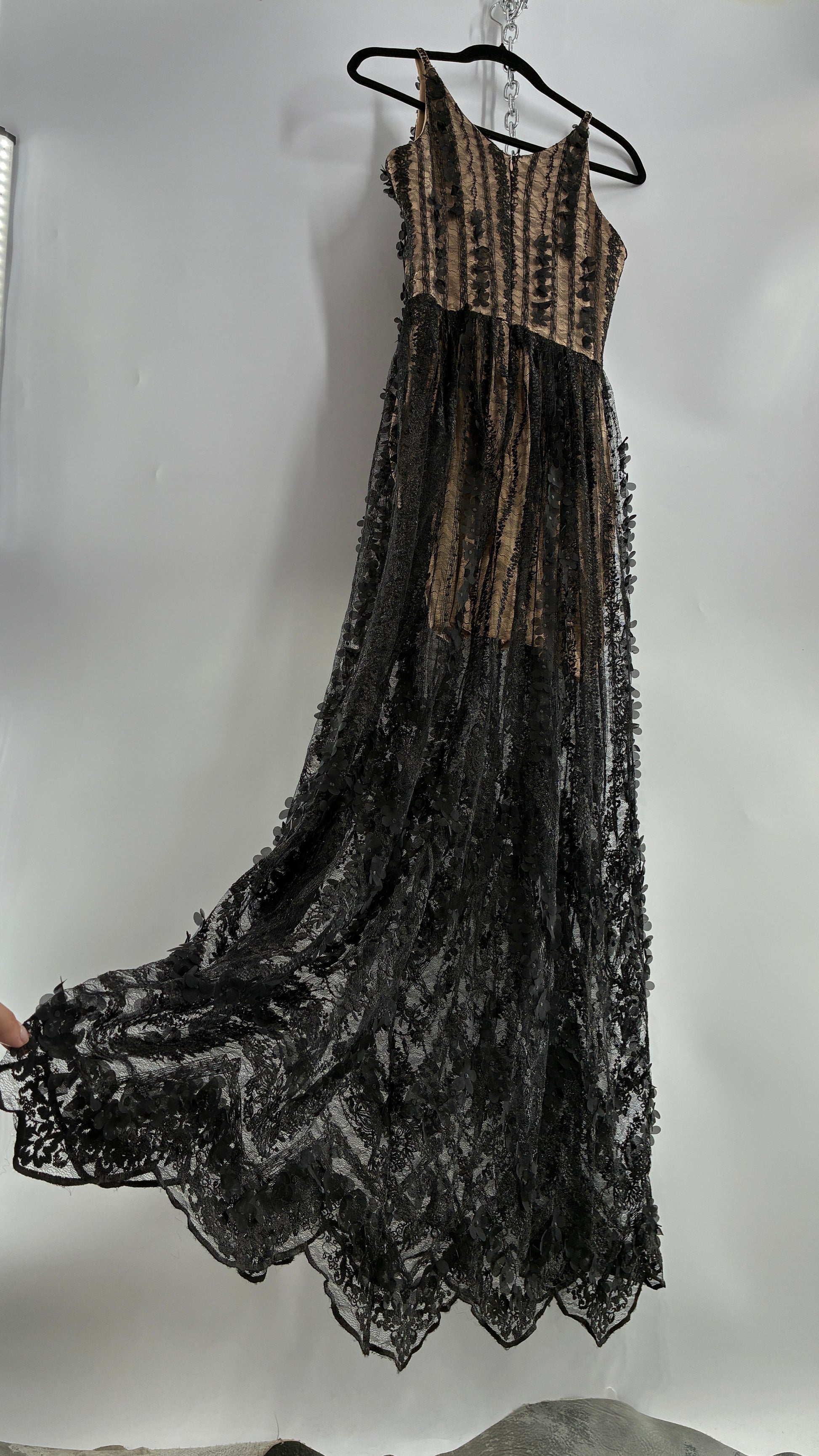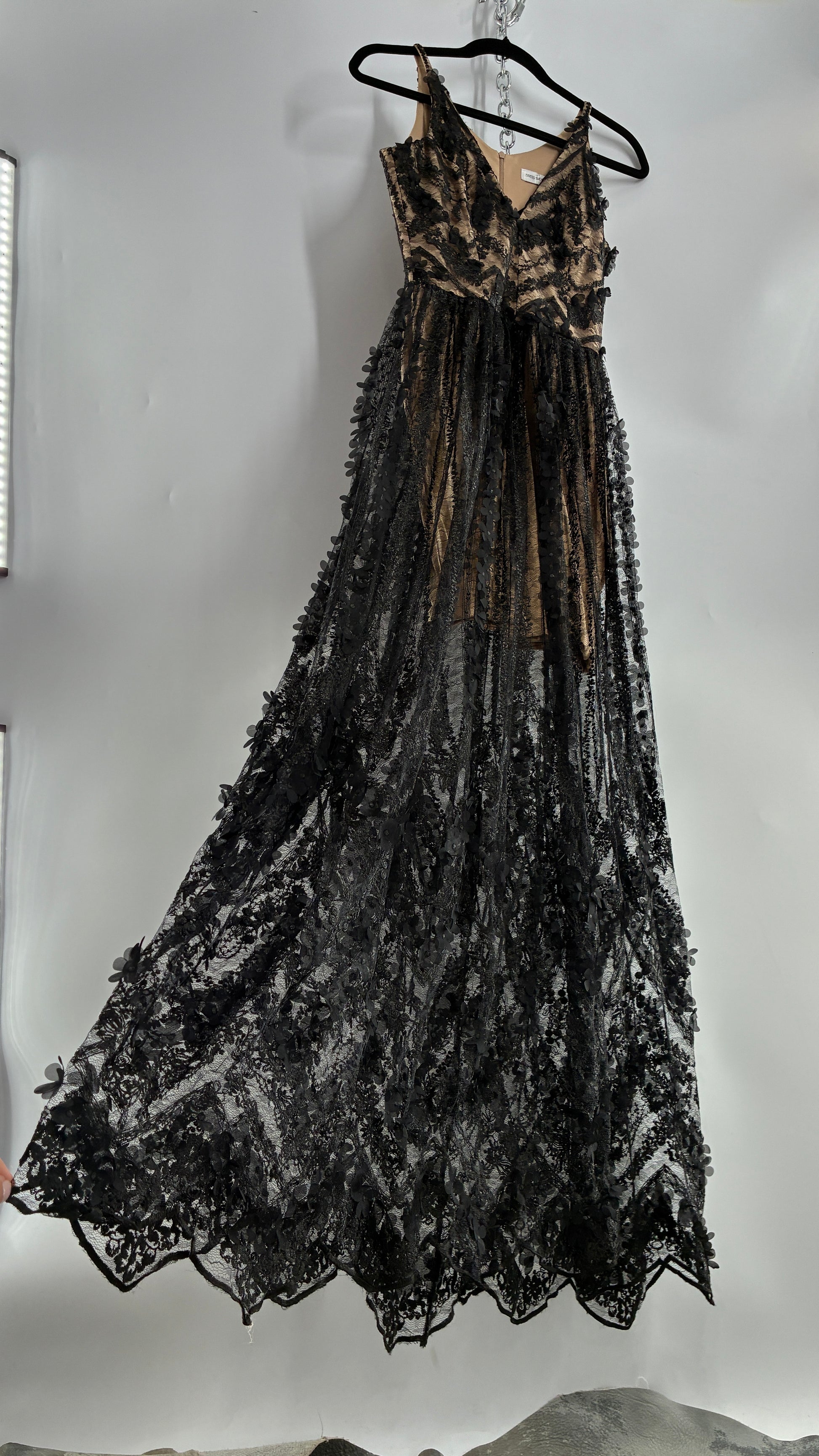 DRESS THE POPULATION Nude Underlay Black 3D Floral Lace Appliqué Overlay Dress (Small)