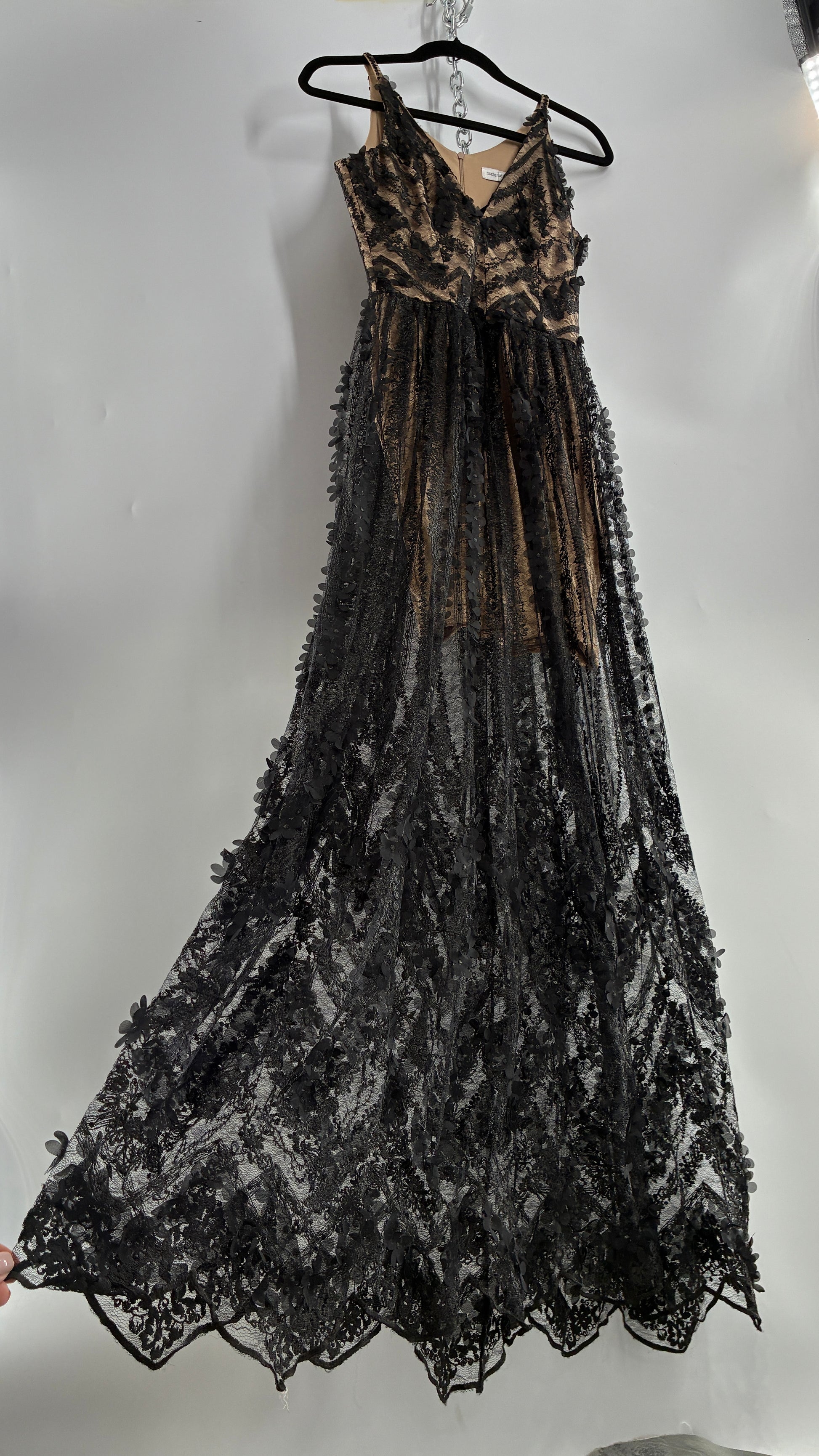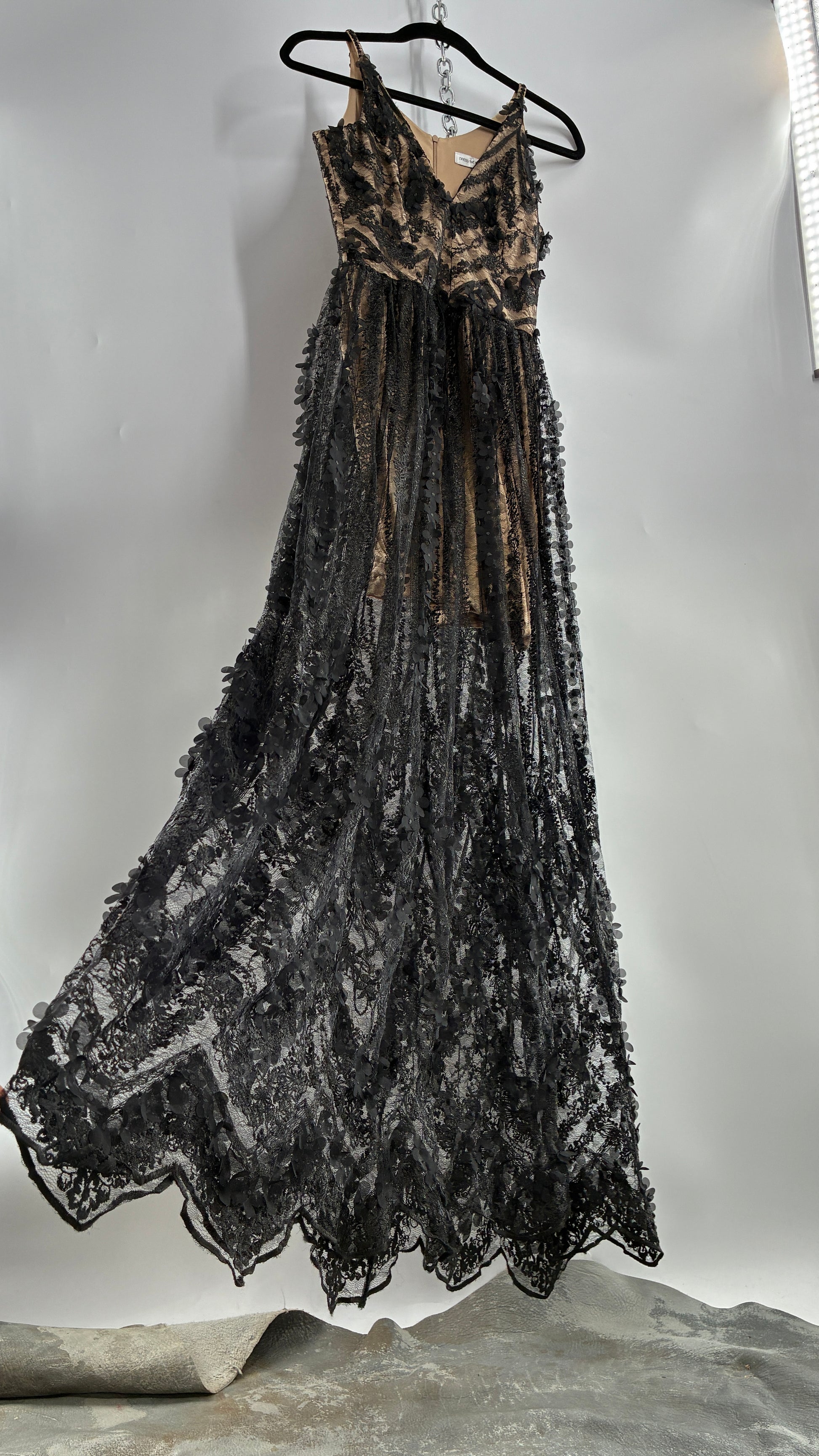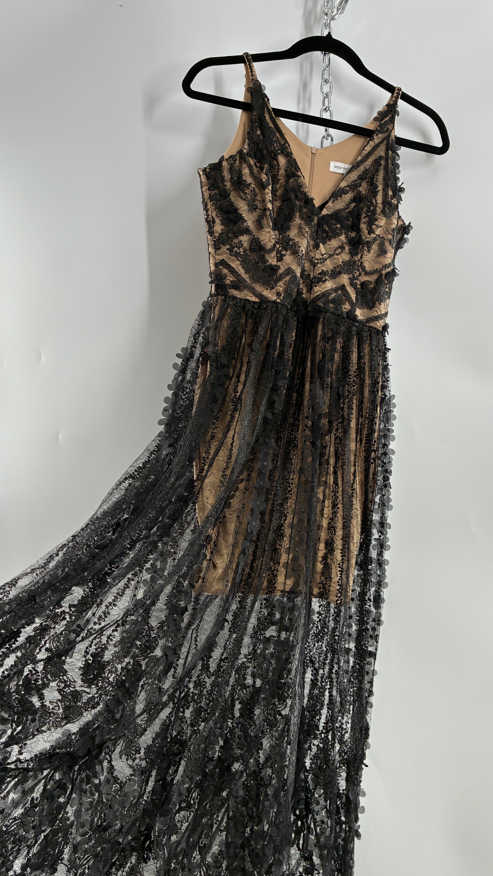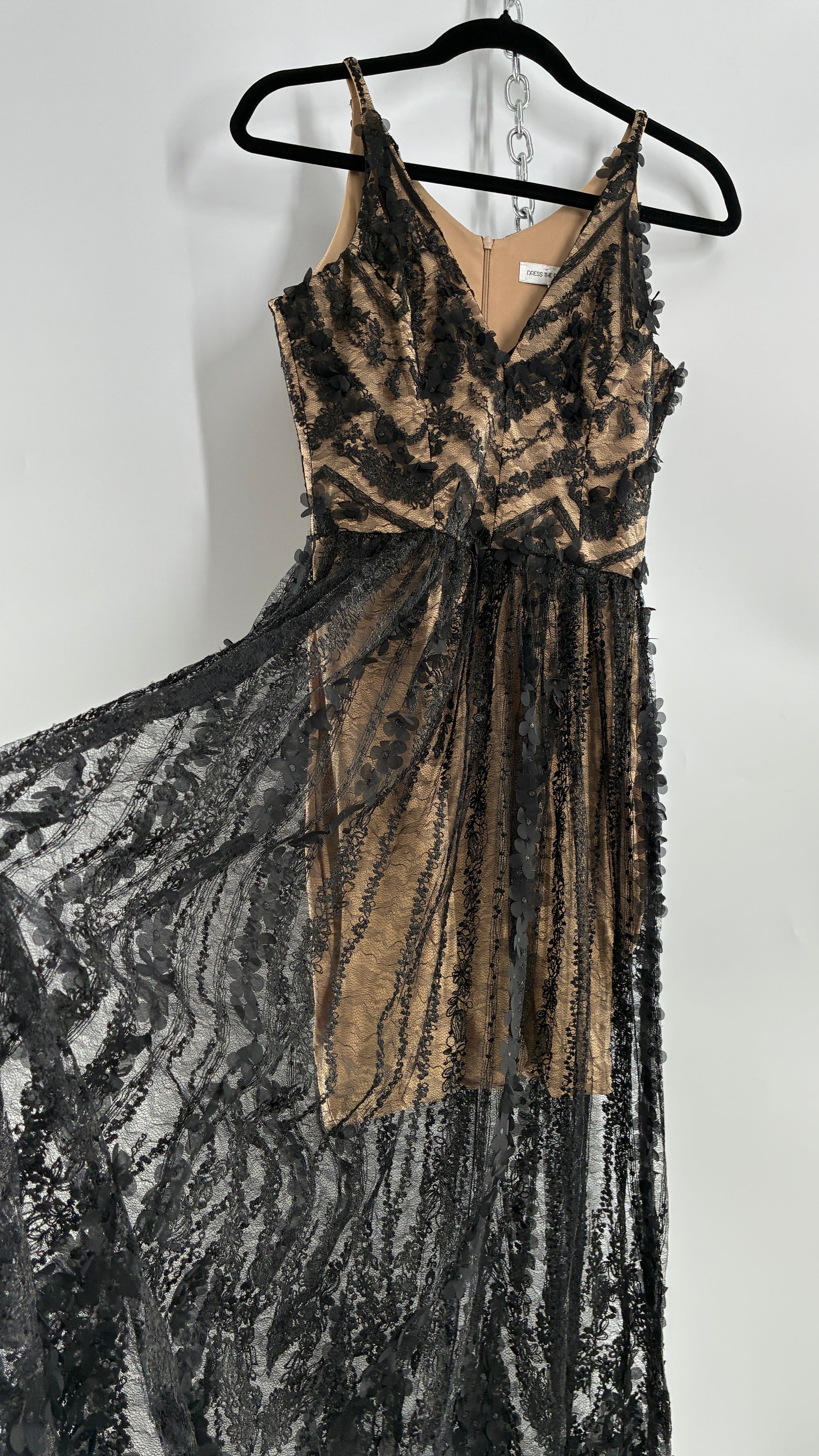 DRESS THE POPULATION Nude Underlay Black 3D Floral Lace Appliqué Overlay Dress (Small)