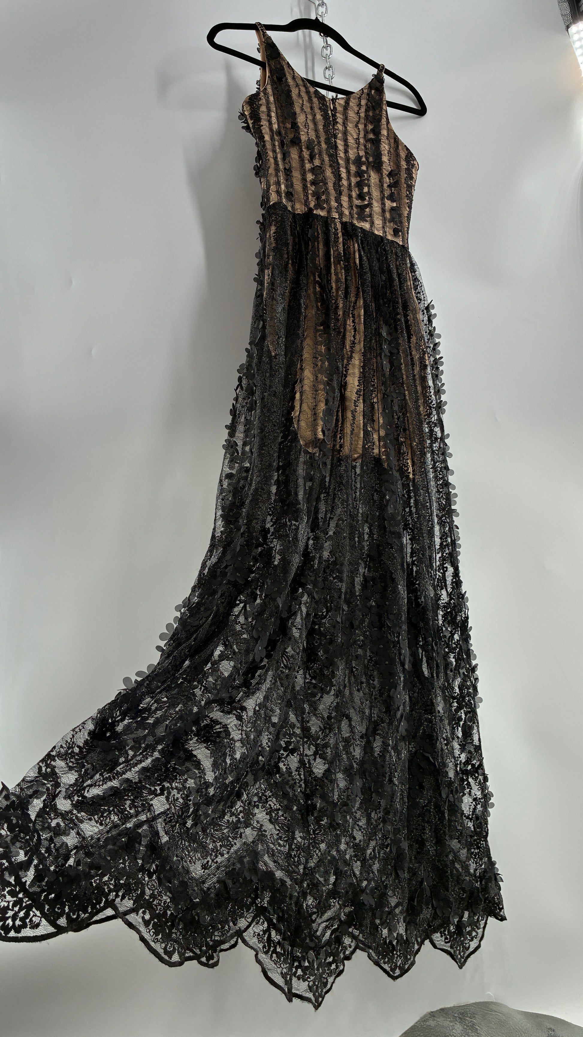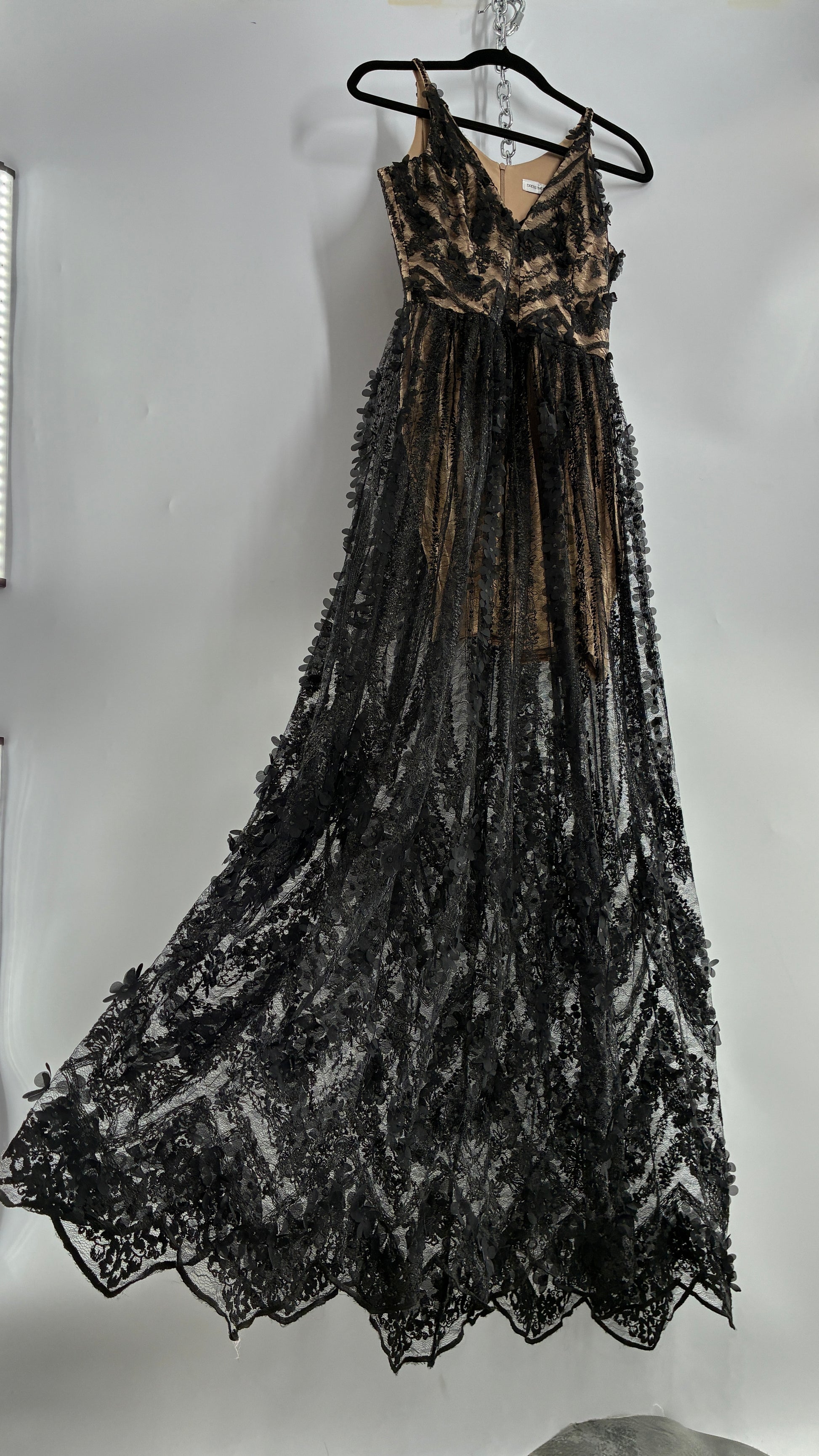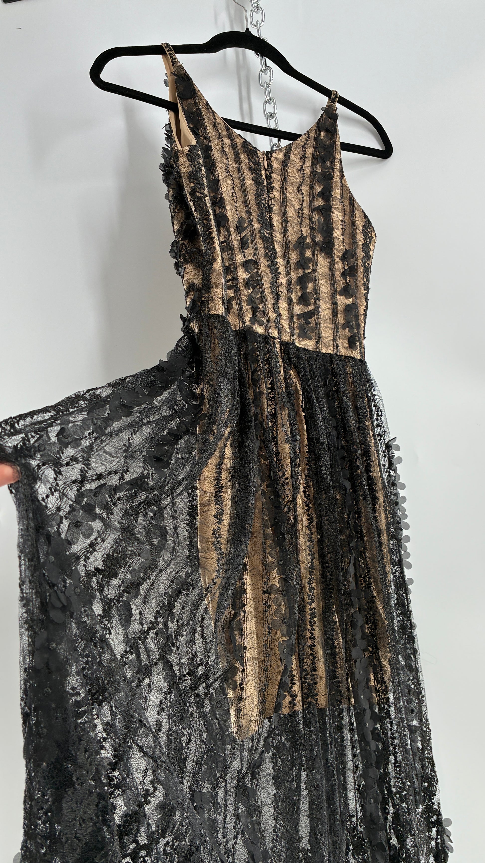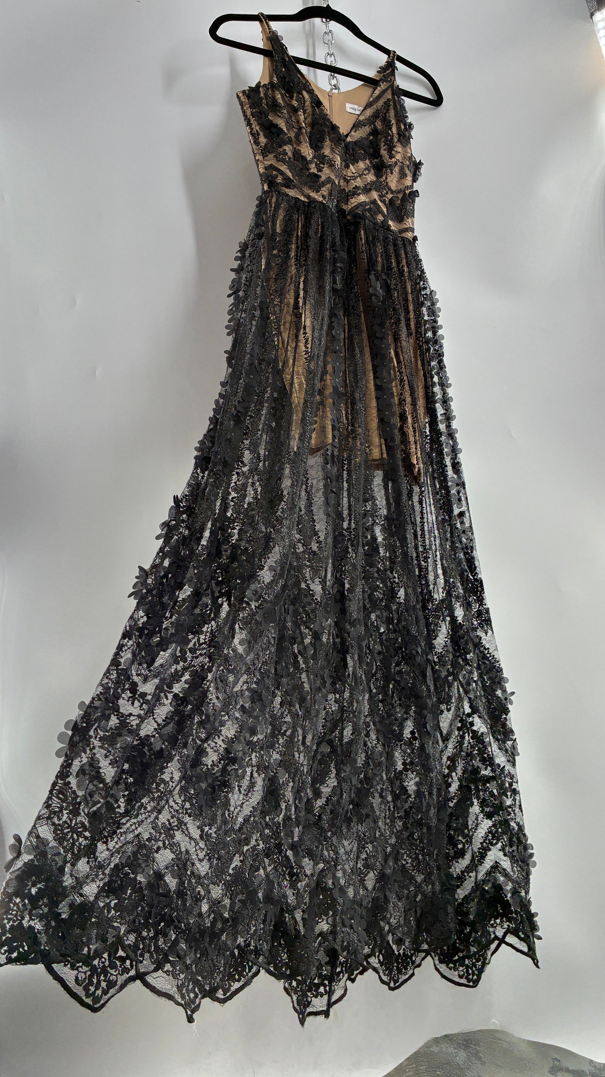 DRESS THE POPULATION Nude Underlay Black 3D Floral Lace Appliqué Overlay Dress (Small)