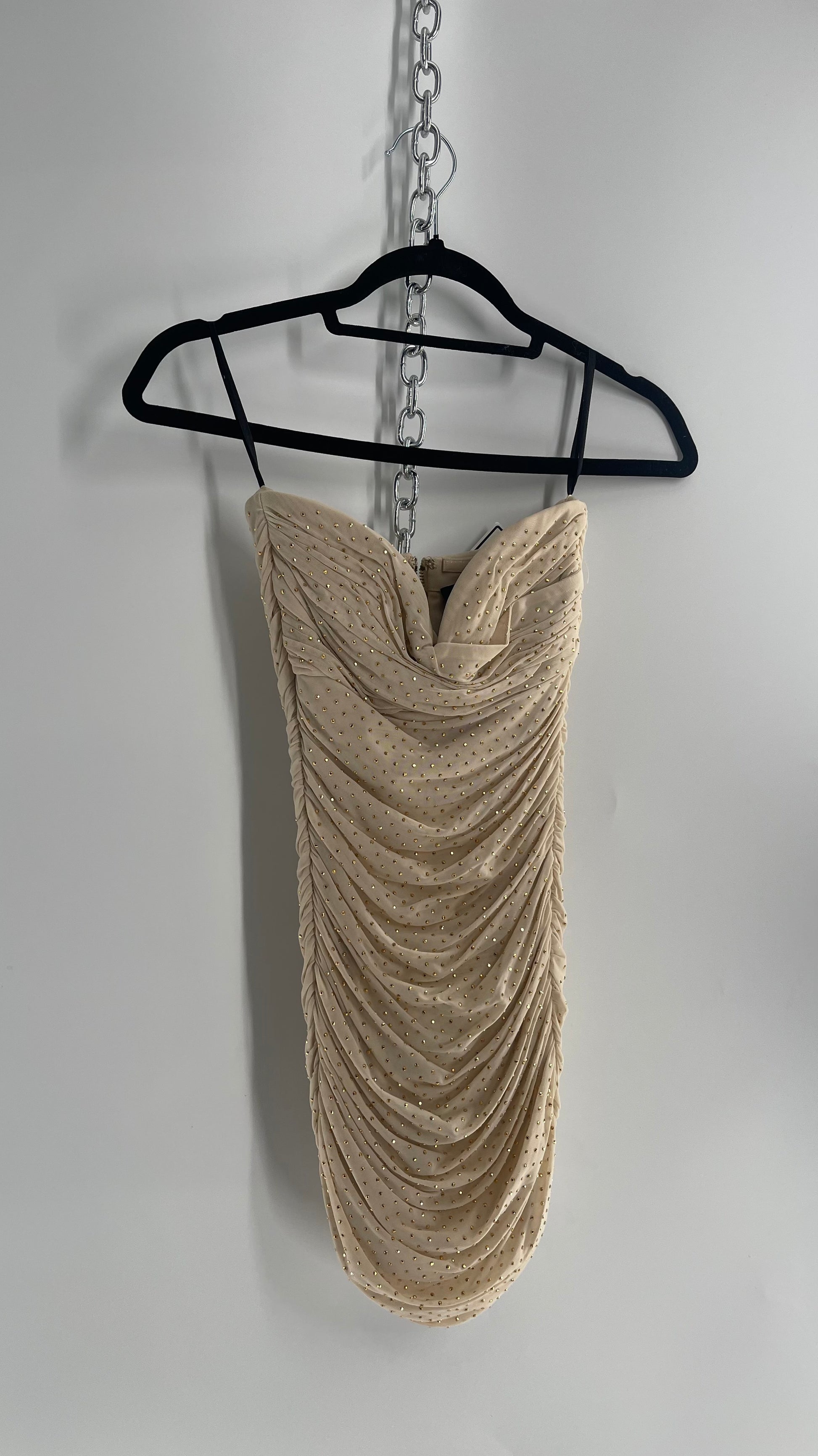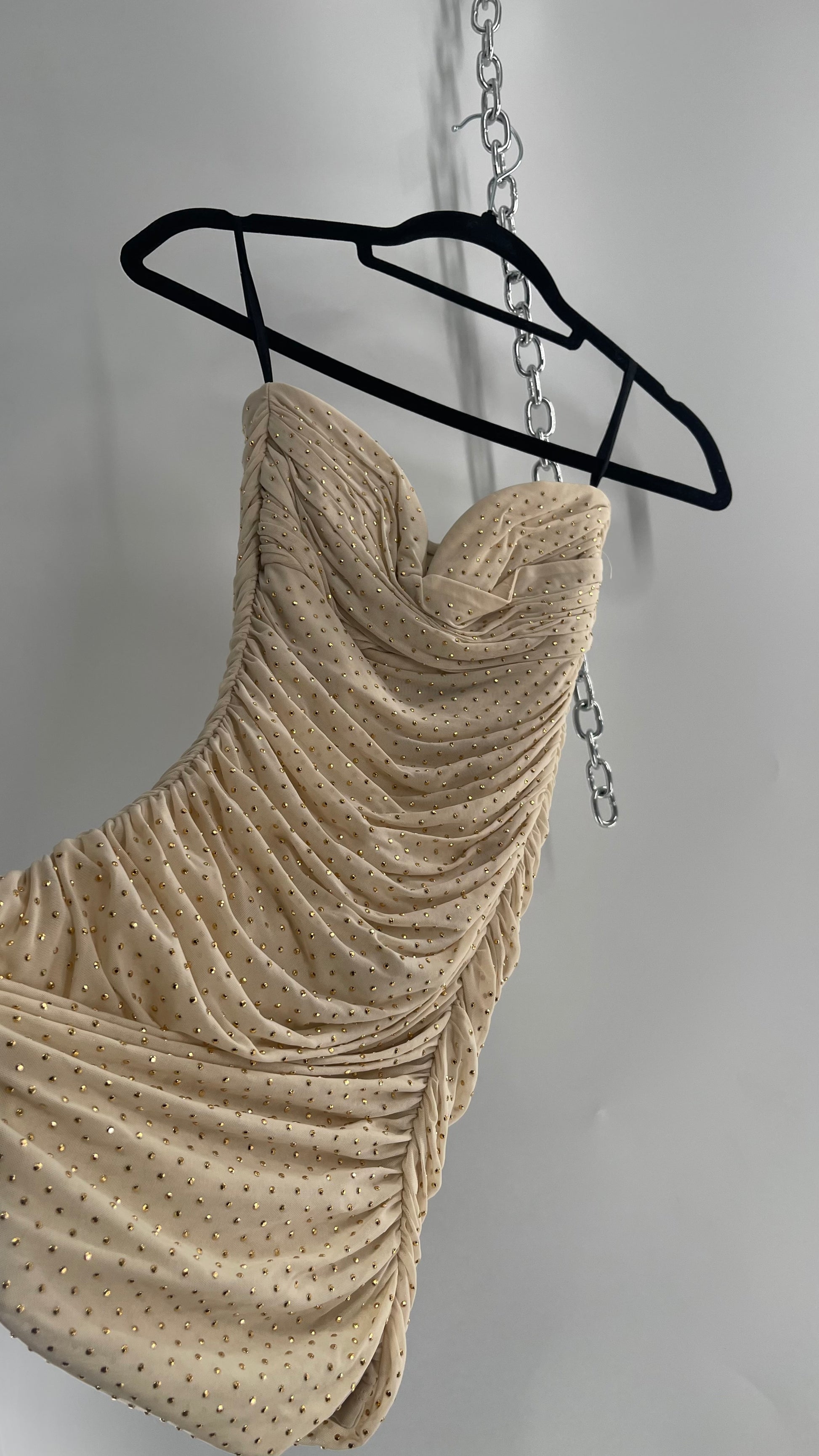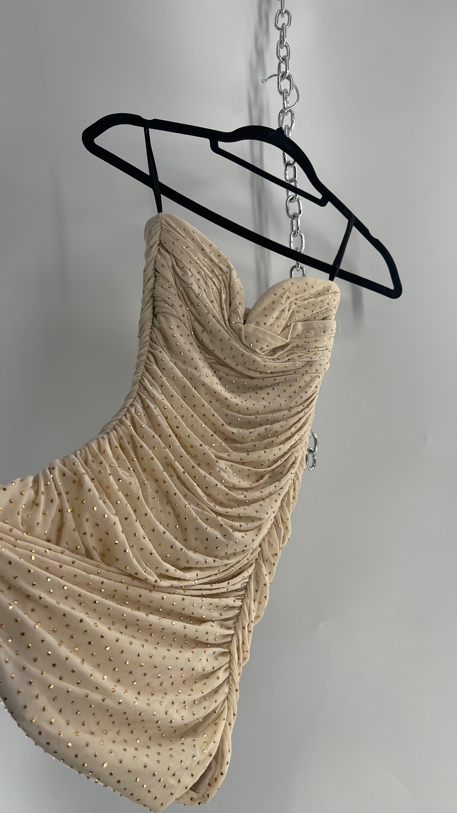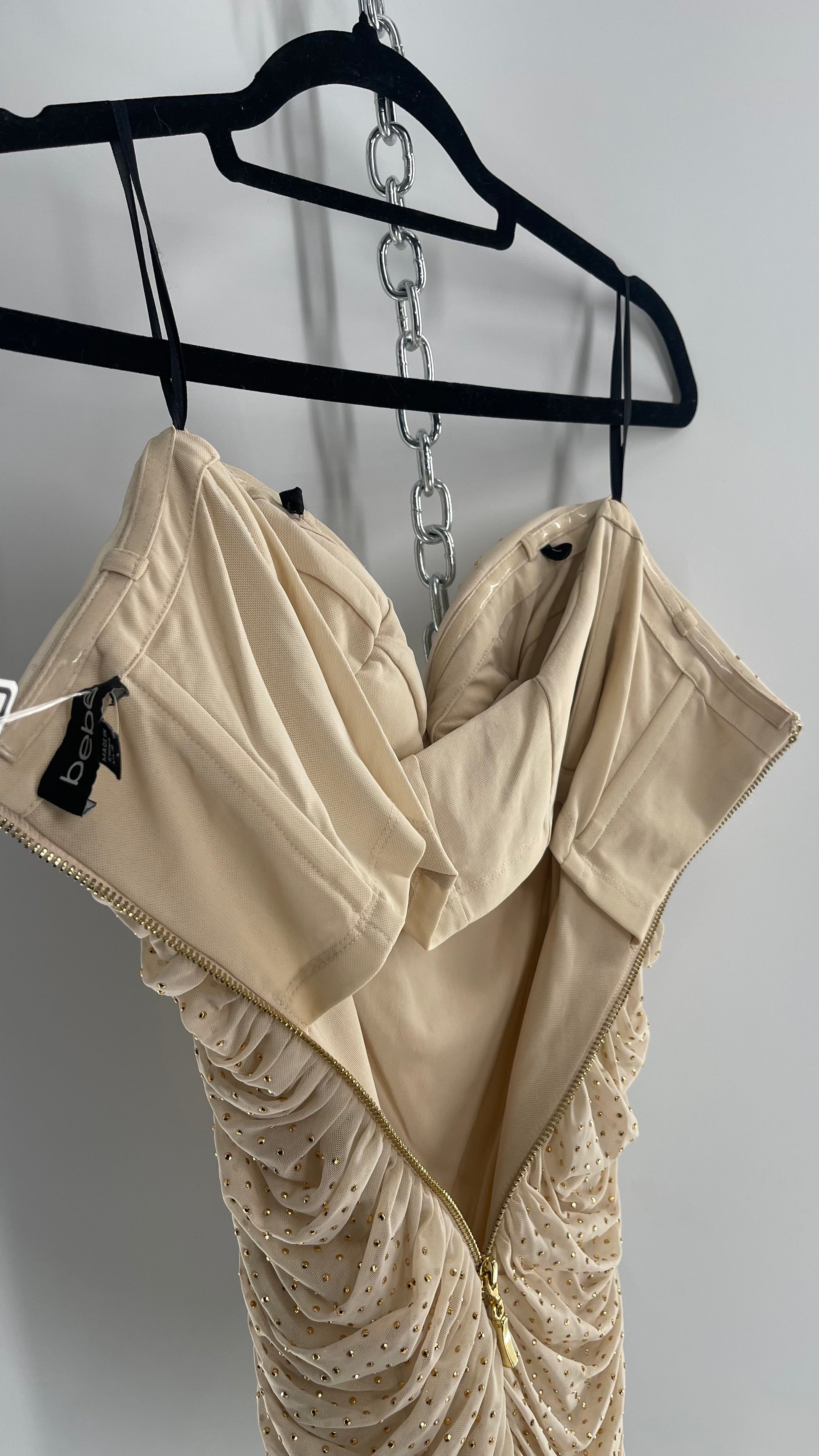 Bebe Beige Gold Studded, Ruched Mini Dress with Built In Corset