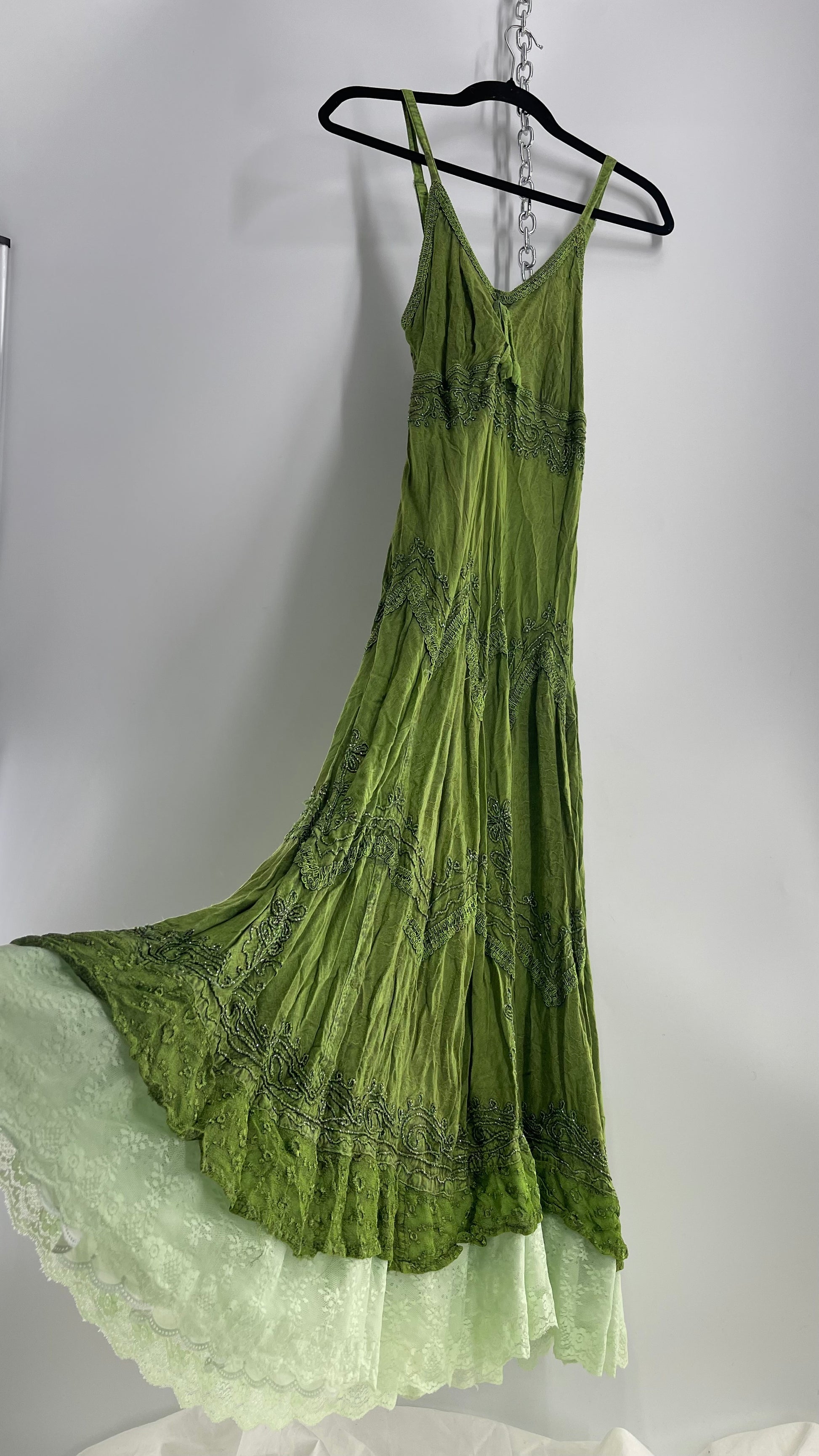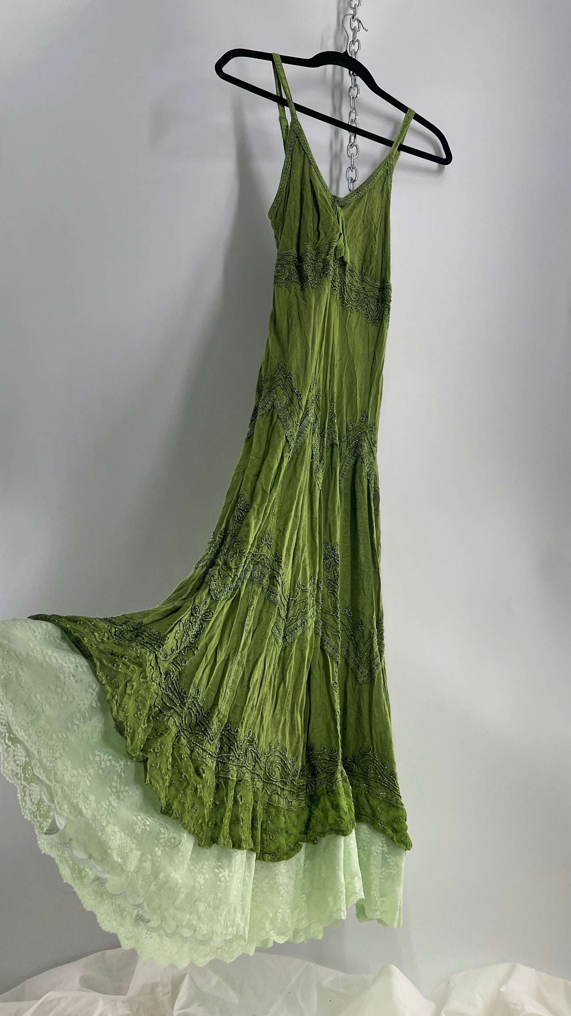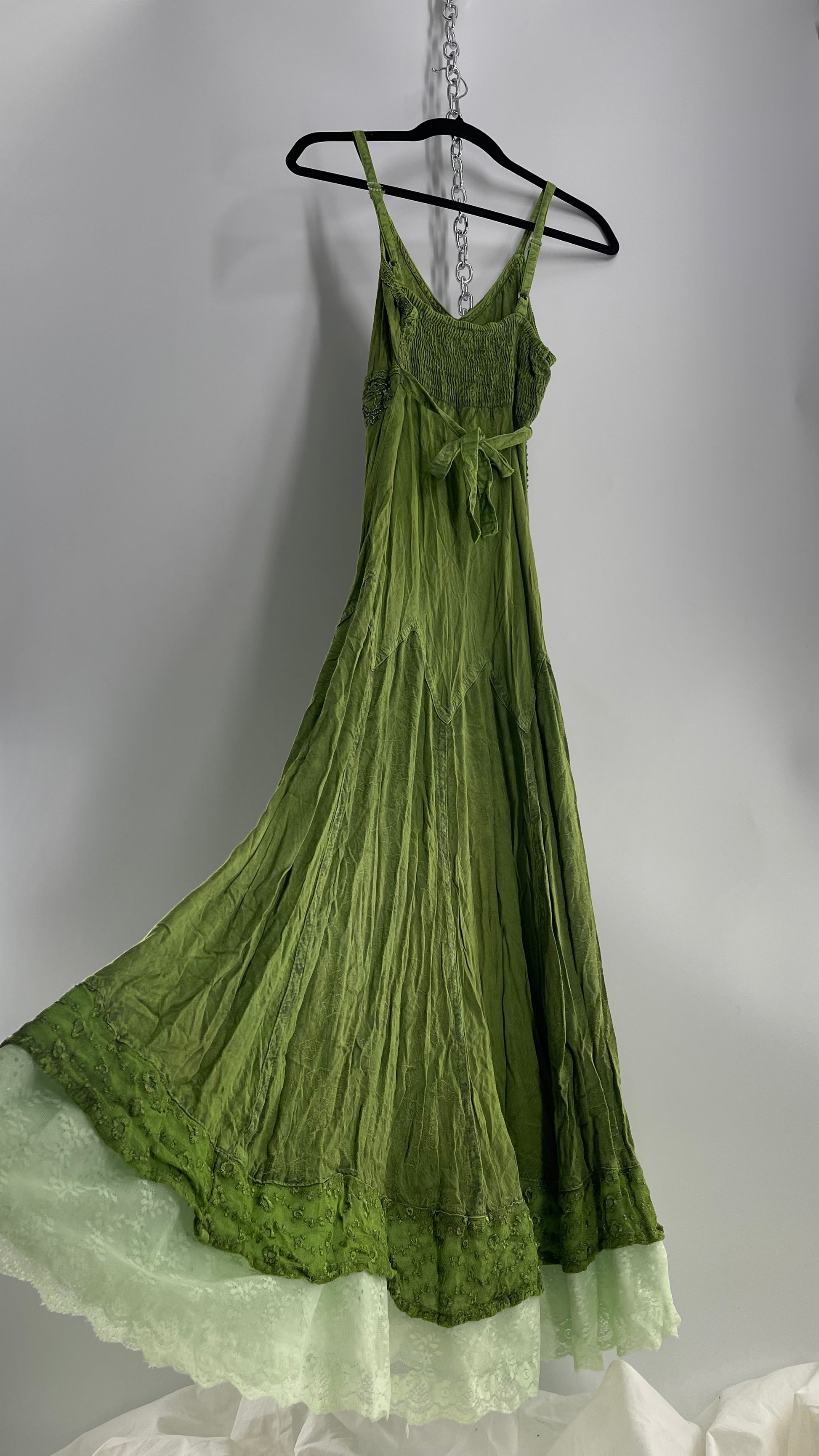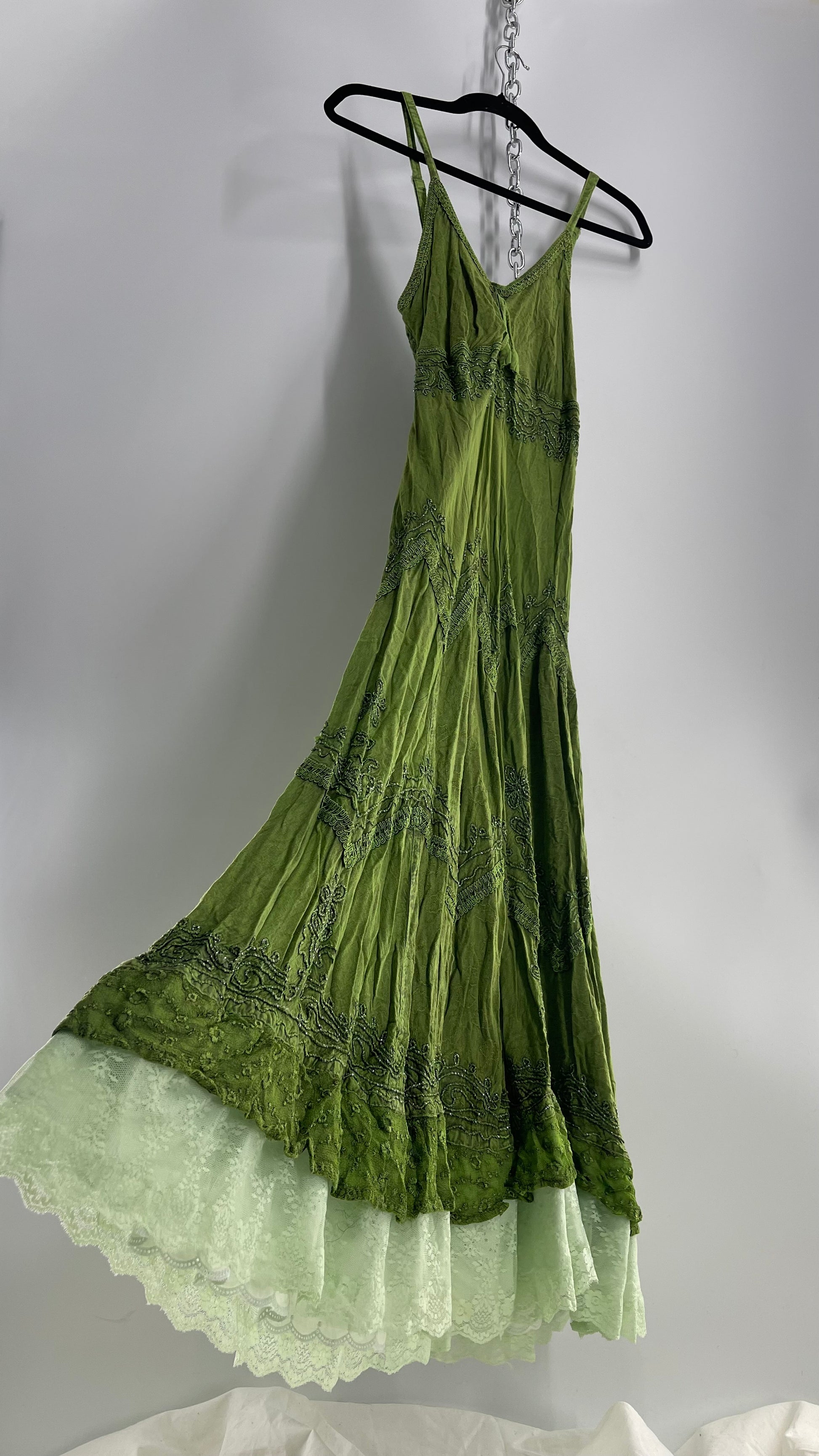 Vintage 1990s SAKKAS Hippy Green Full Length Dress with Voluminous Lace Hem (S/M)