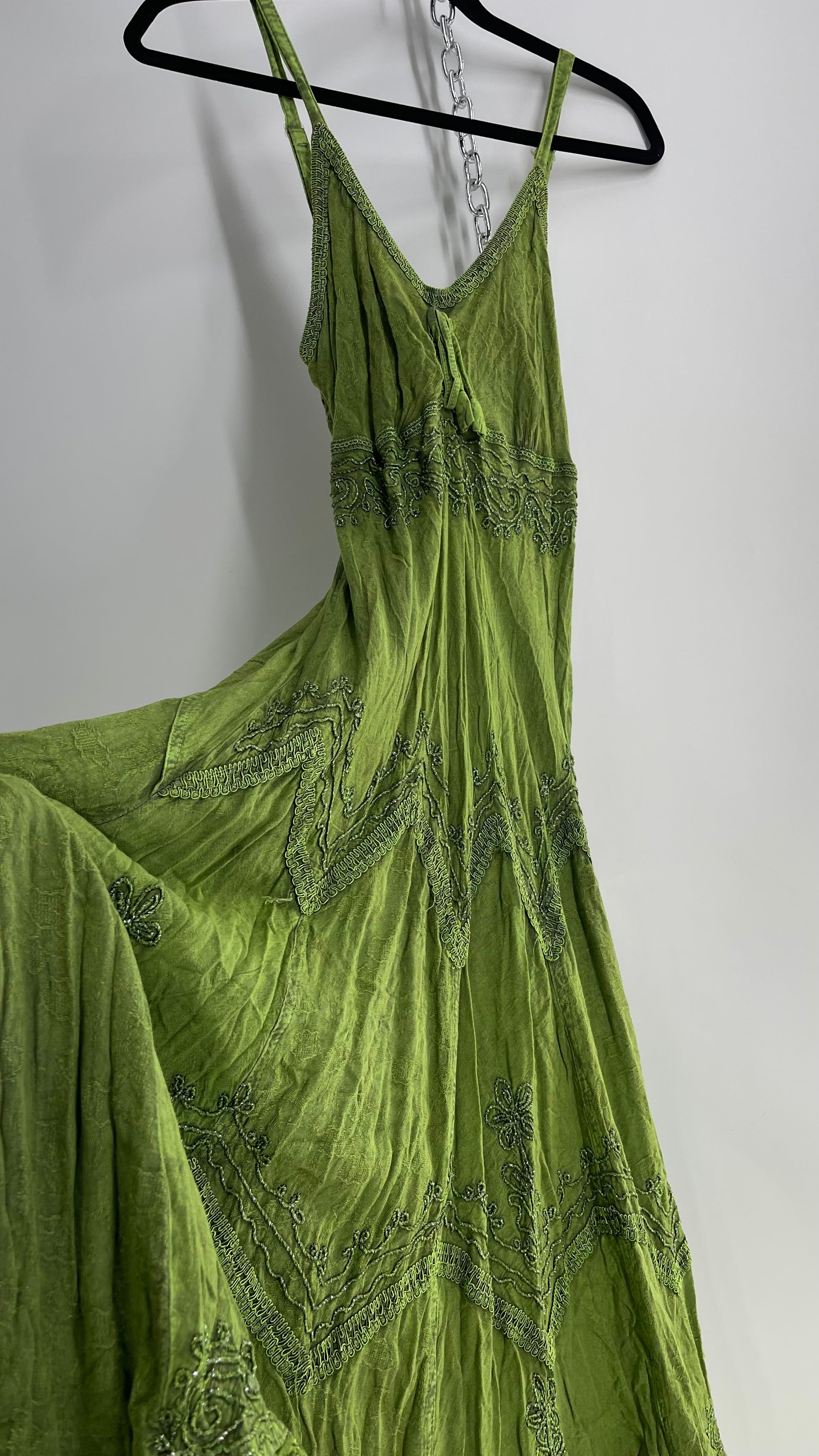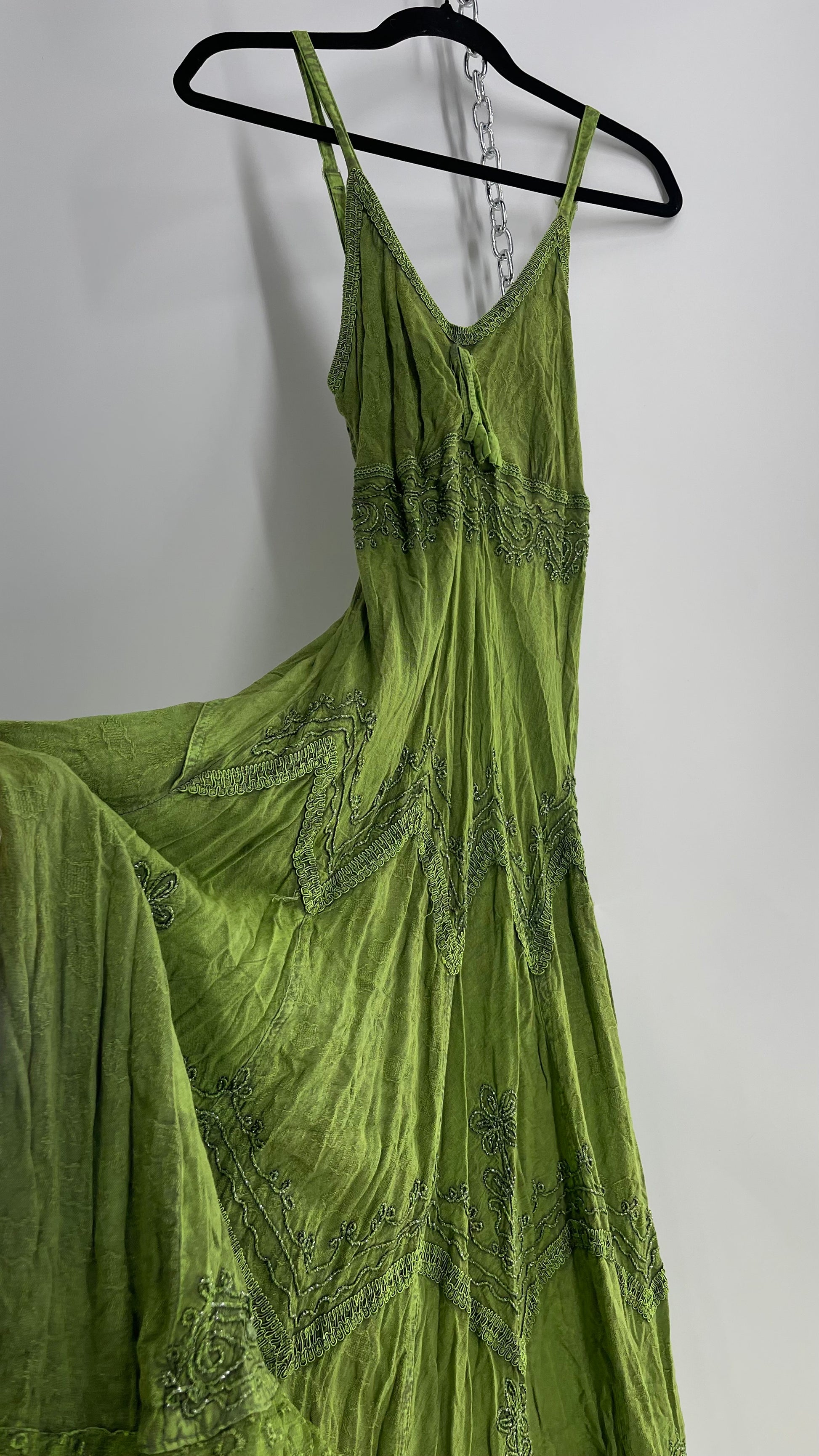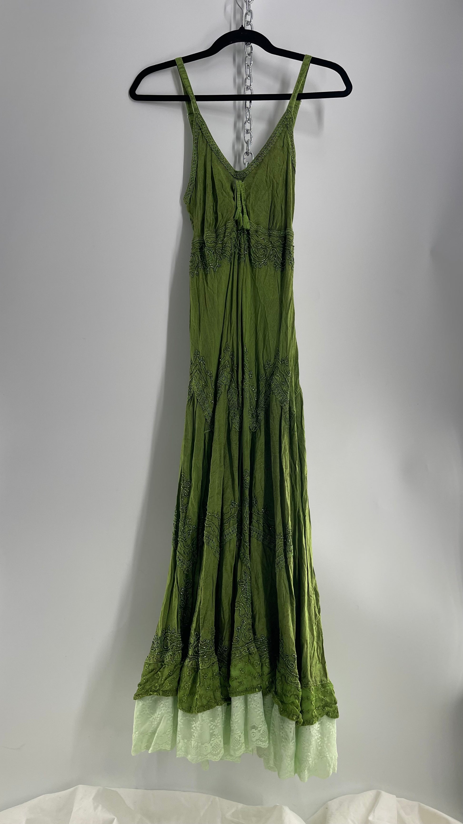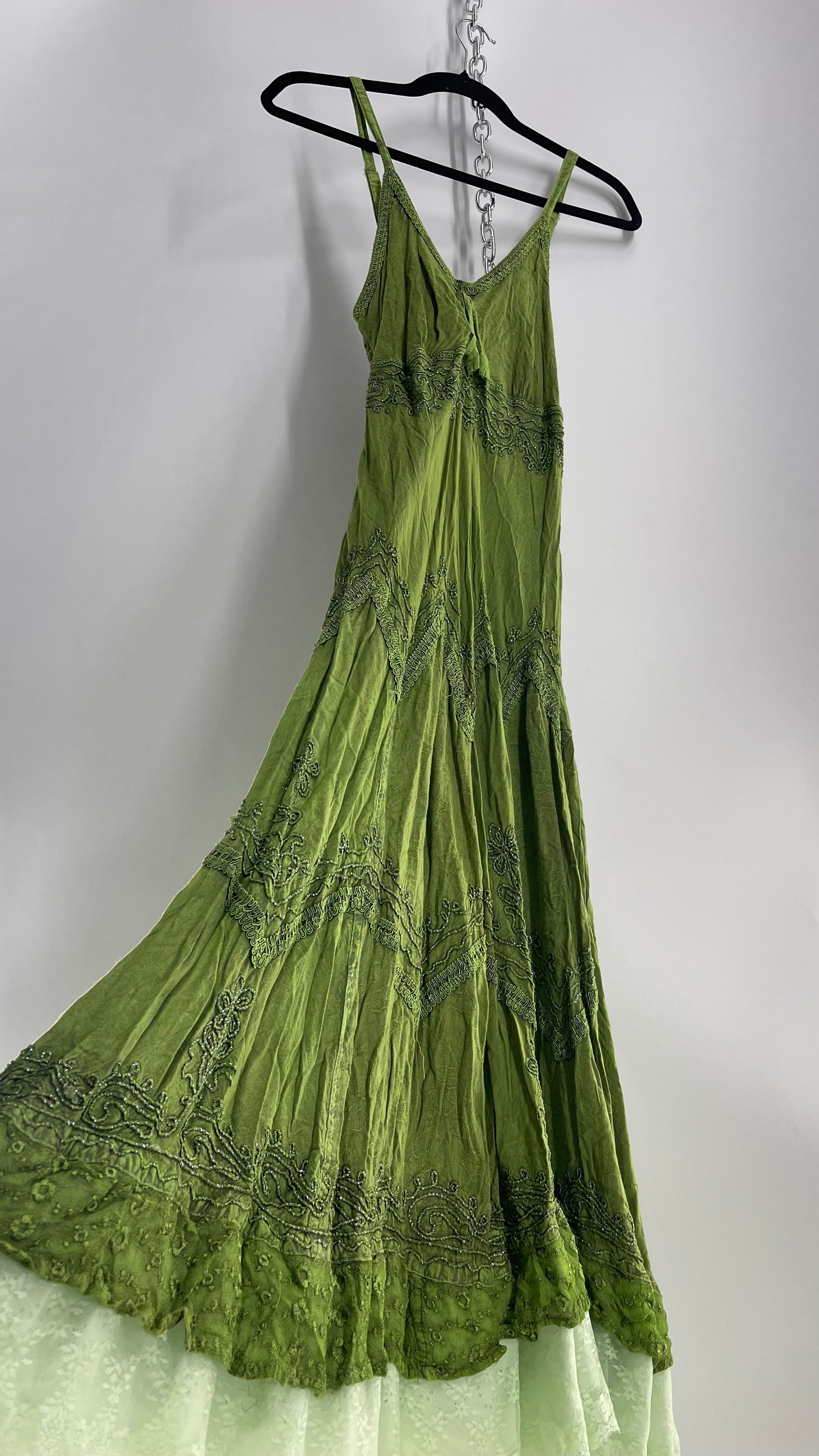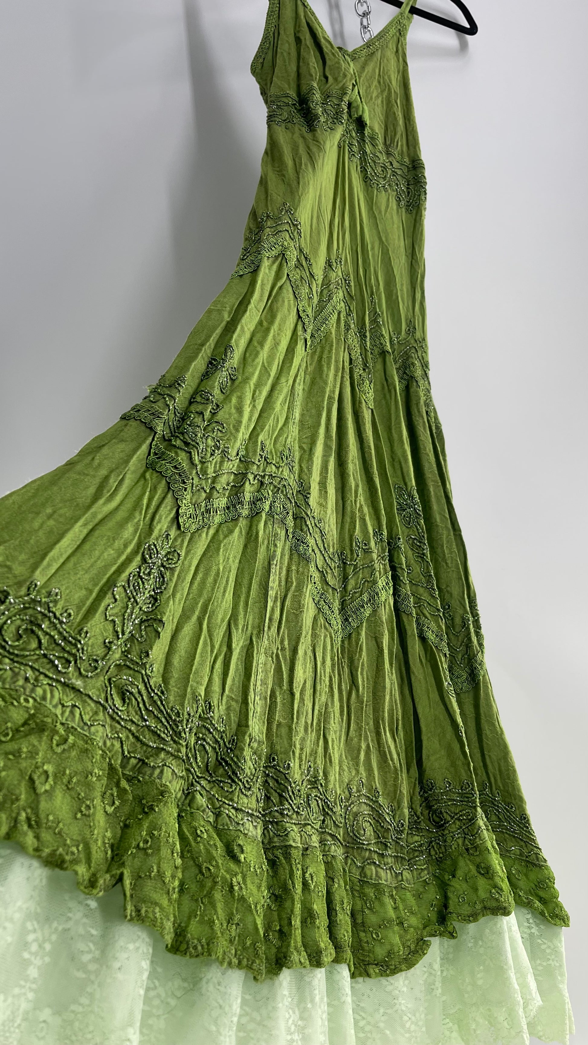 Vintage 1990s SAKKAS Hippy Green Full Length Dress with Voluminous Lace Hem (S/M)