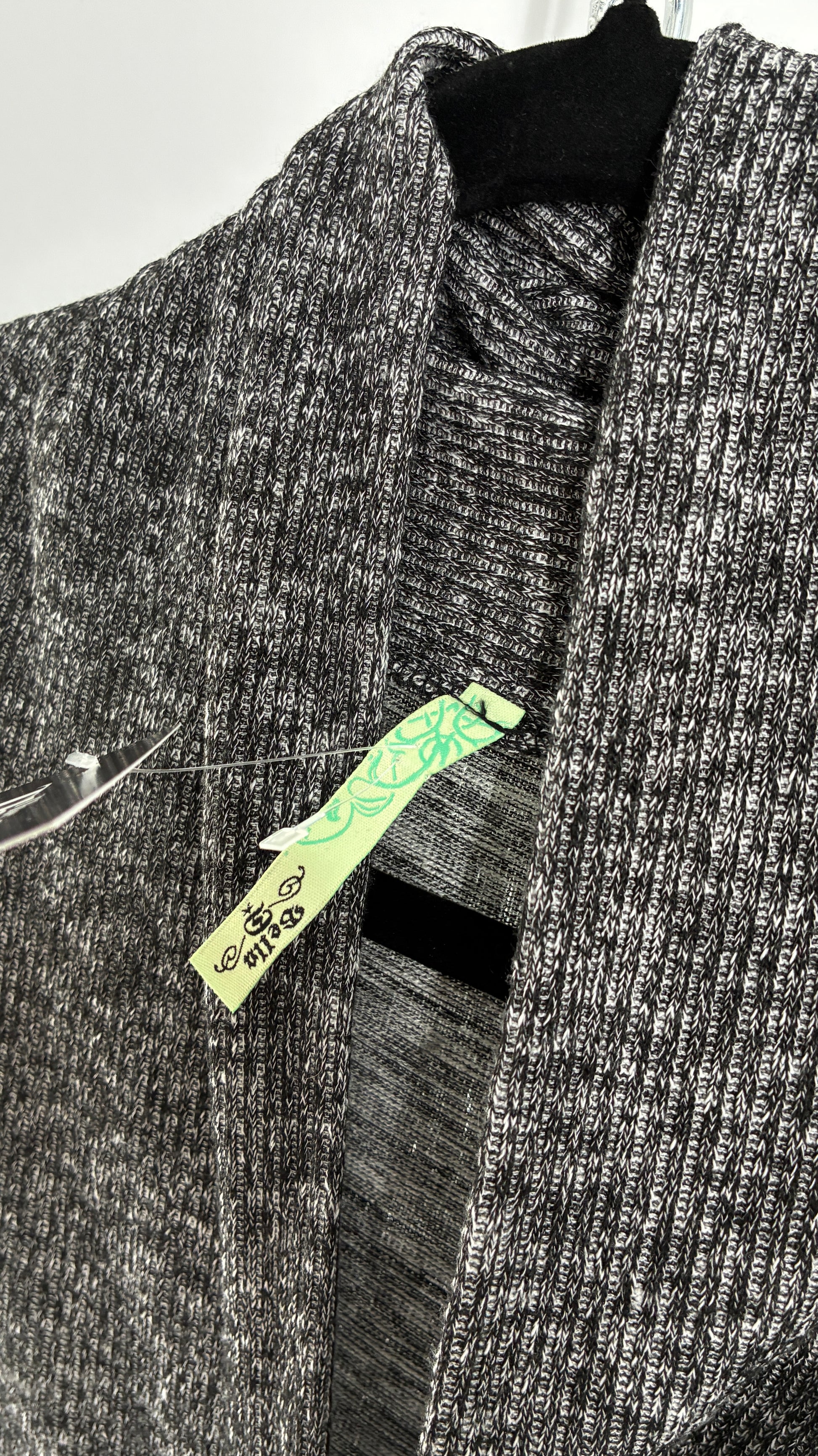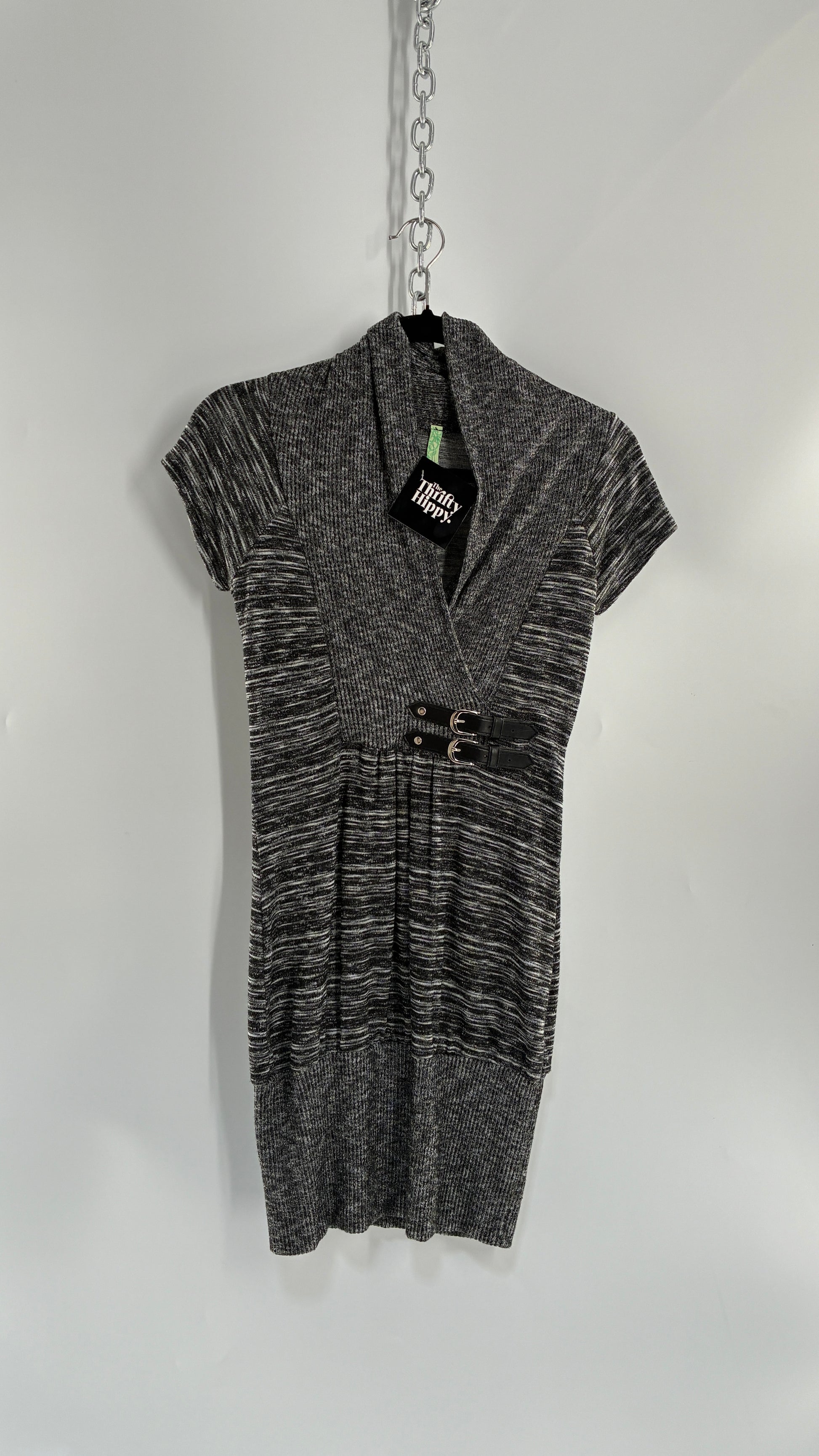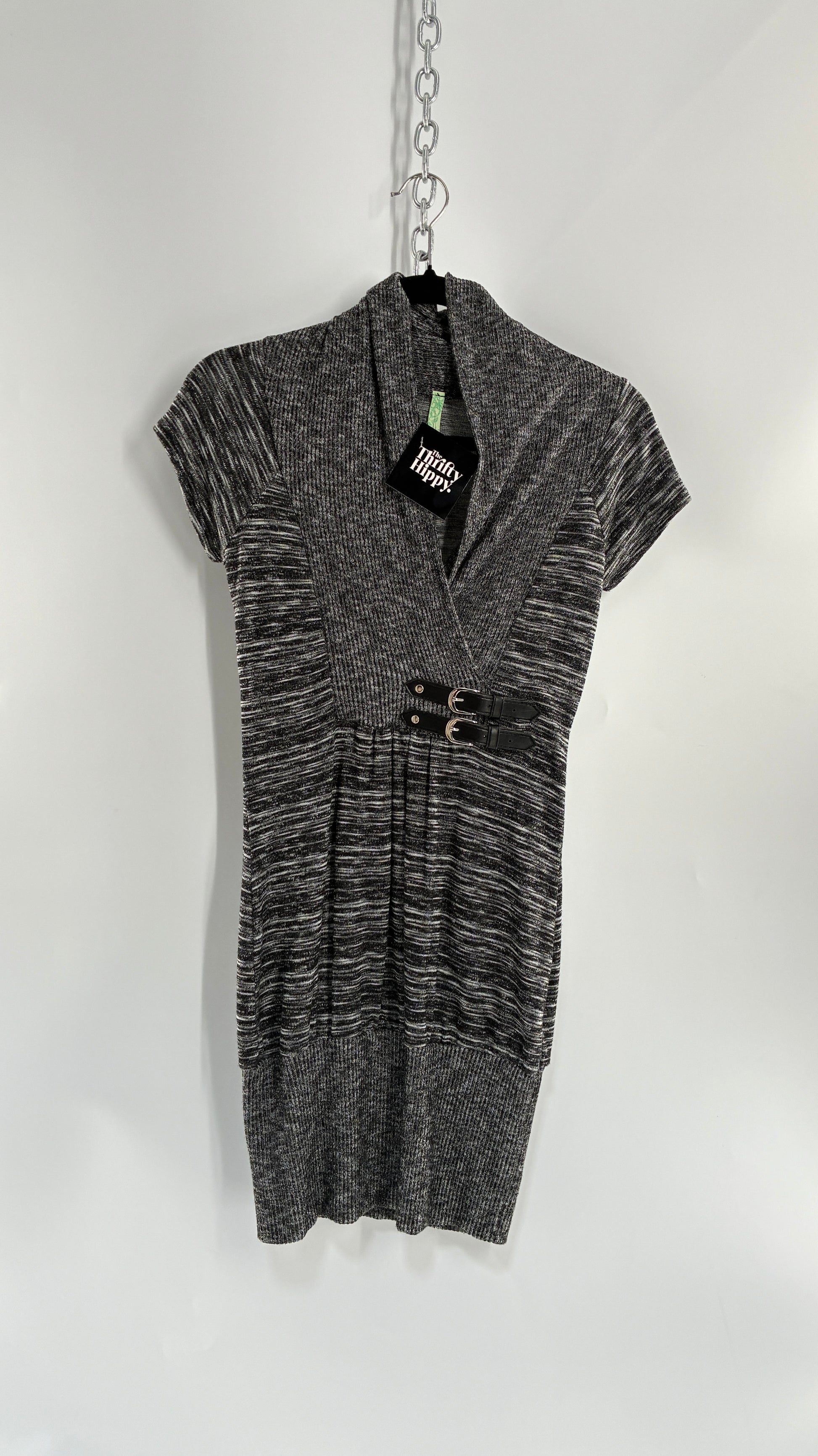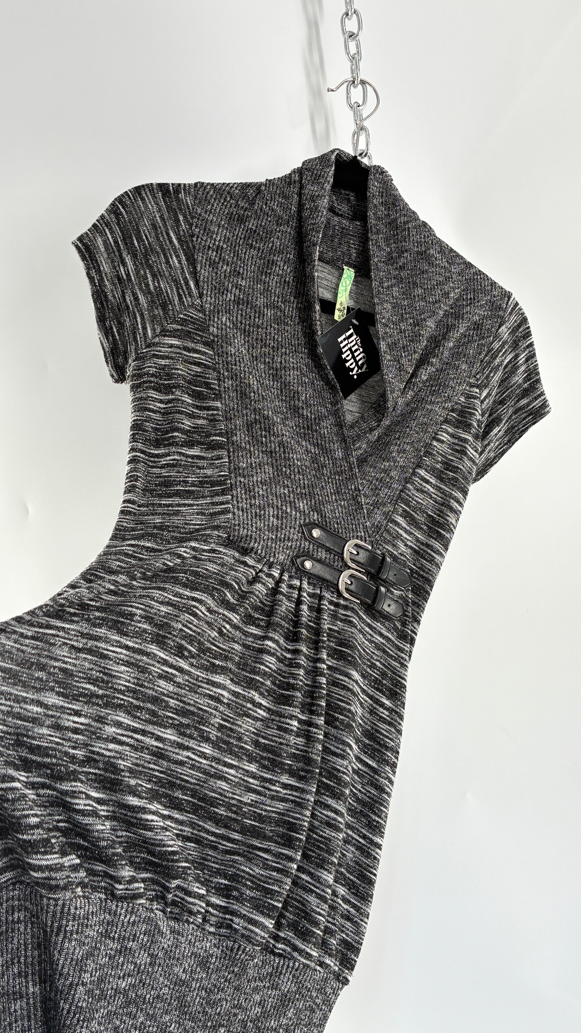 Vintage BELLA Knit Grey and Black Knit Bubble Hem Mini Dress with Under Bust Buckles (Small)