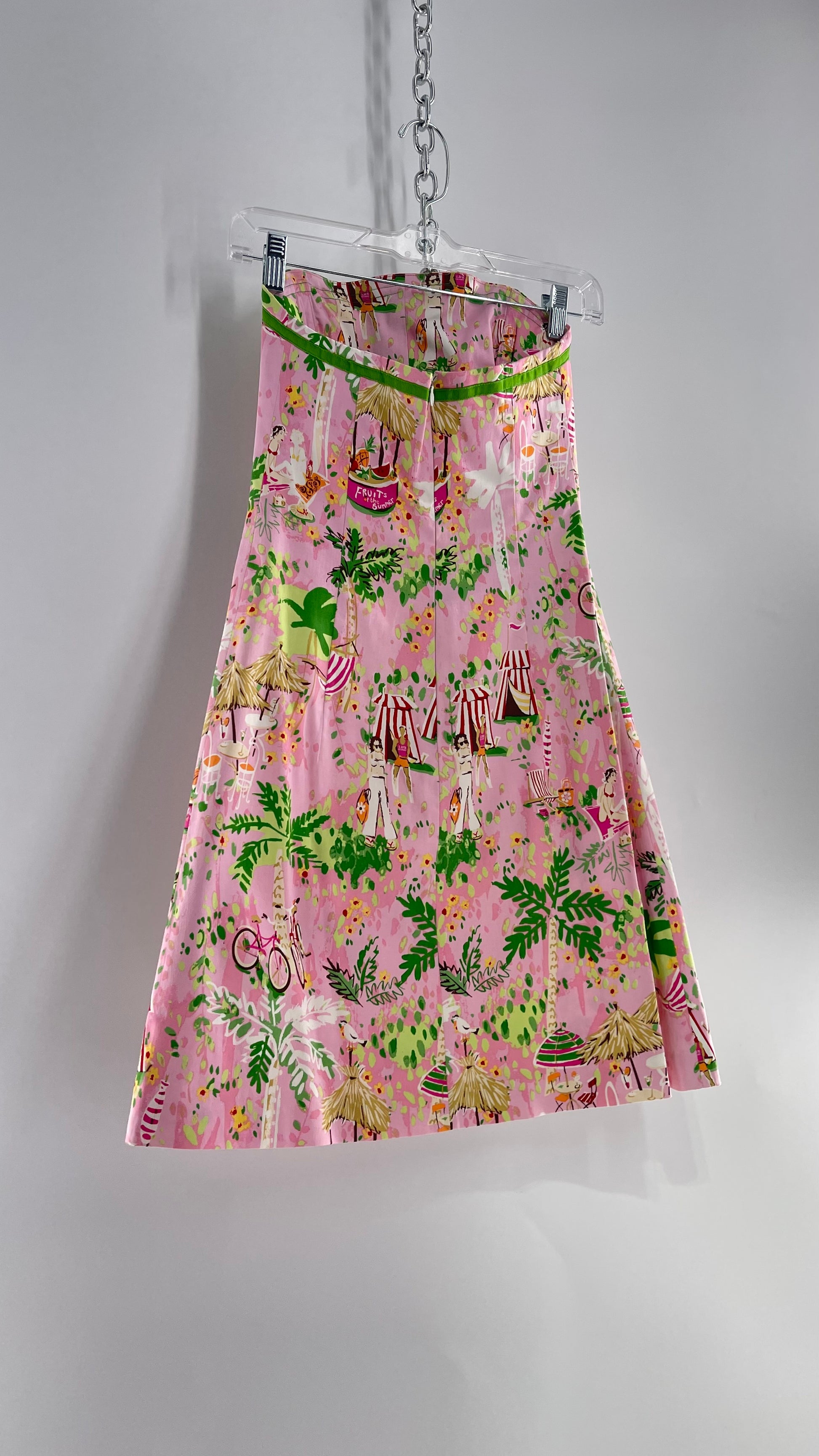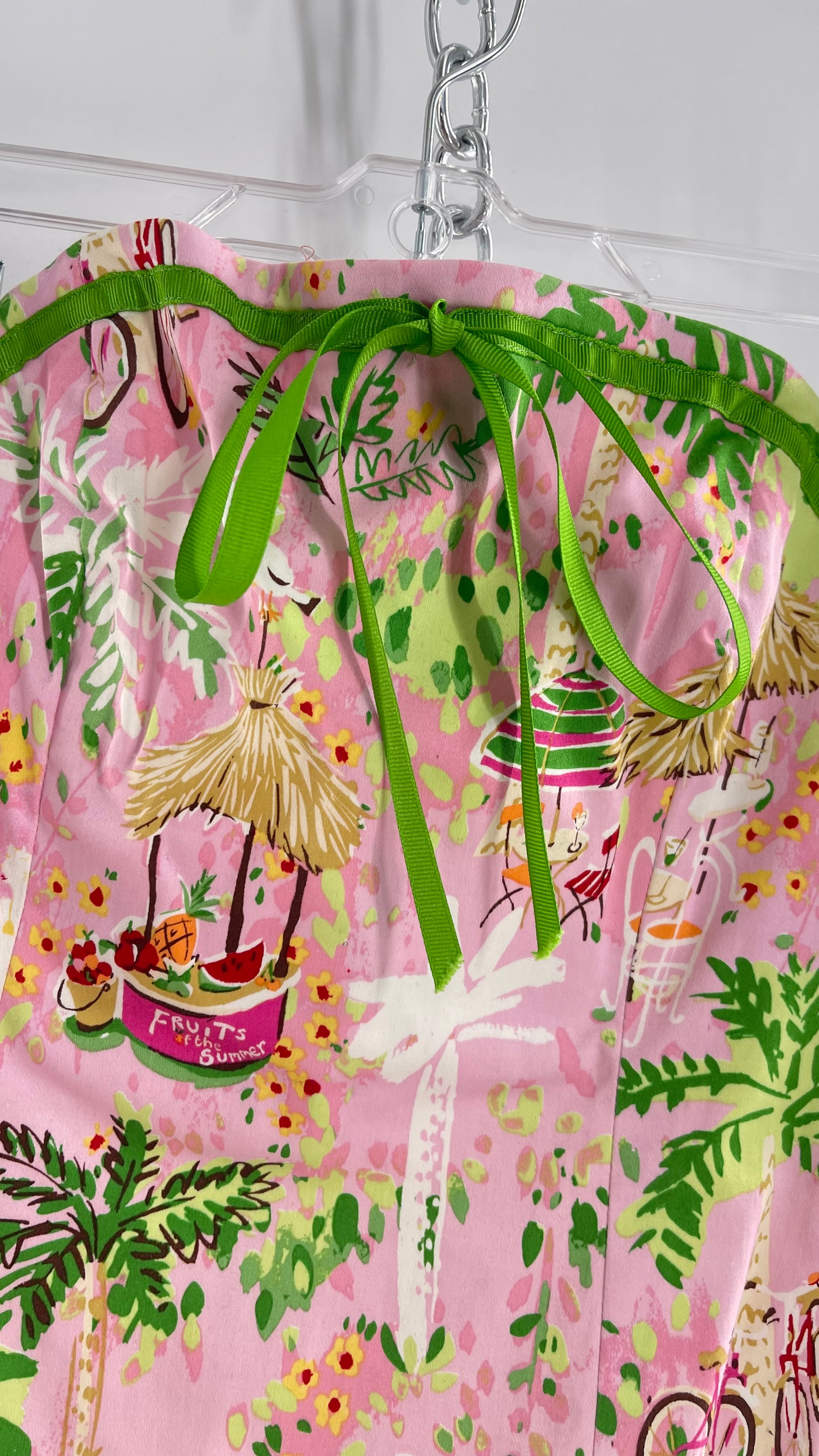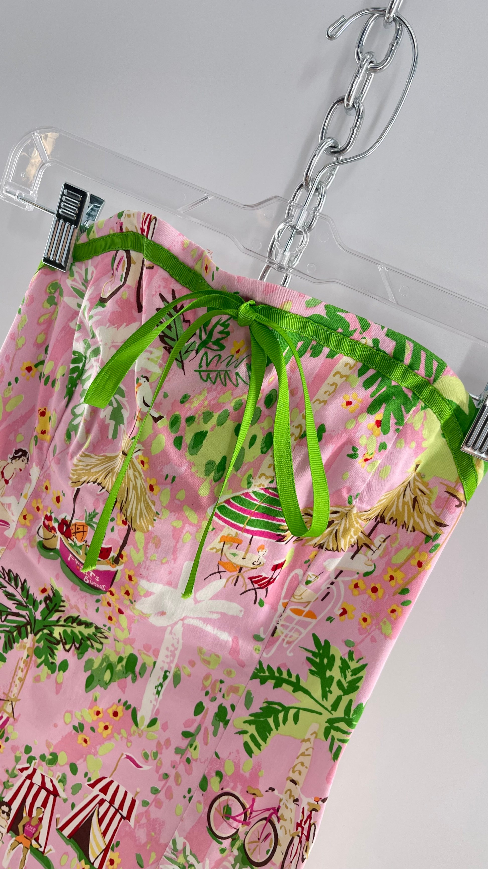 Vintage Handmade Pink Sketchbook 90s Print Mini Dress with Green Ribbon and Built In Boning (XS)