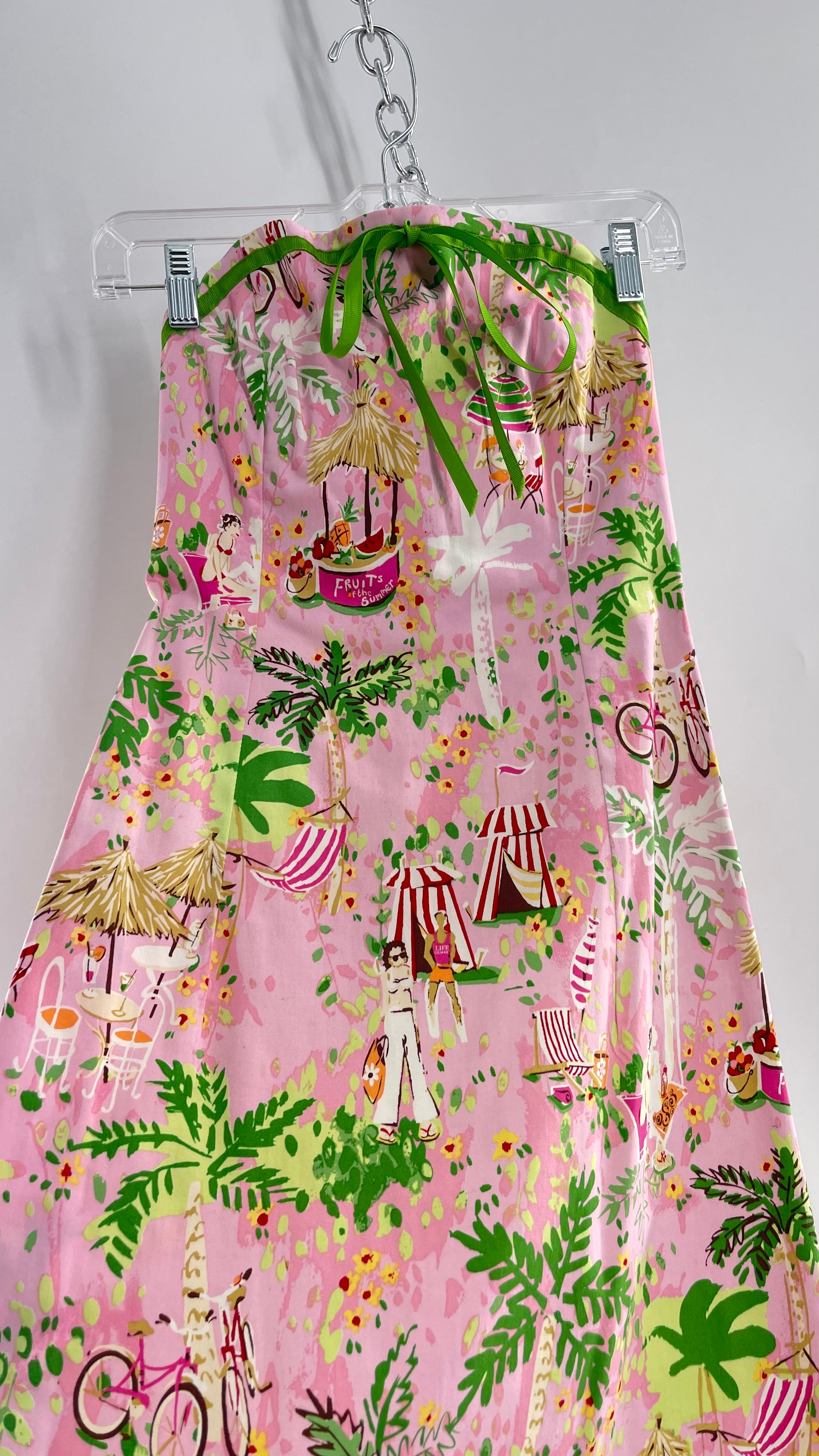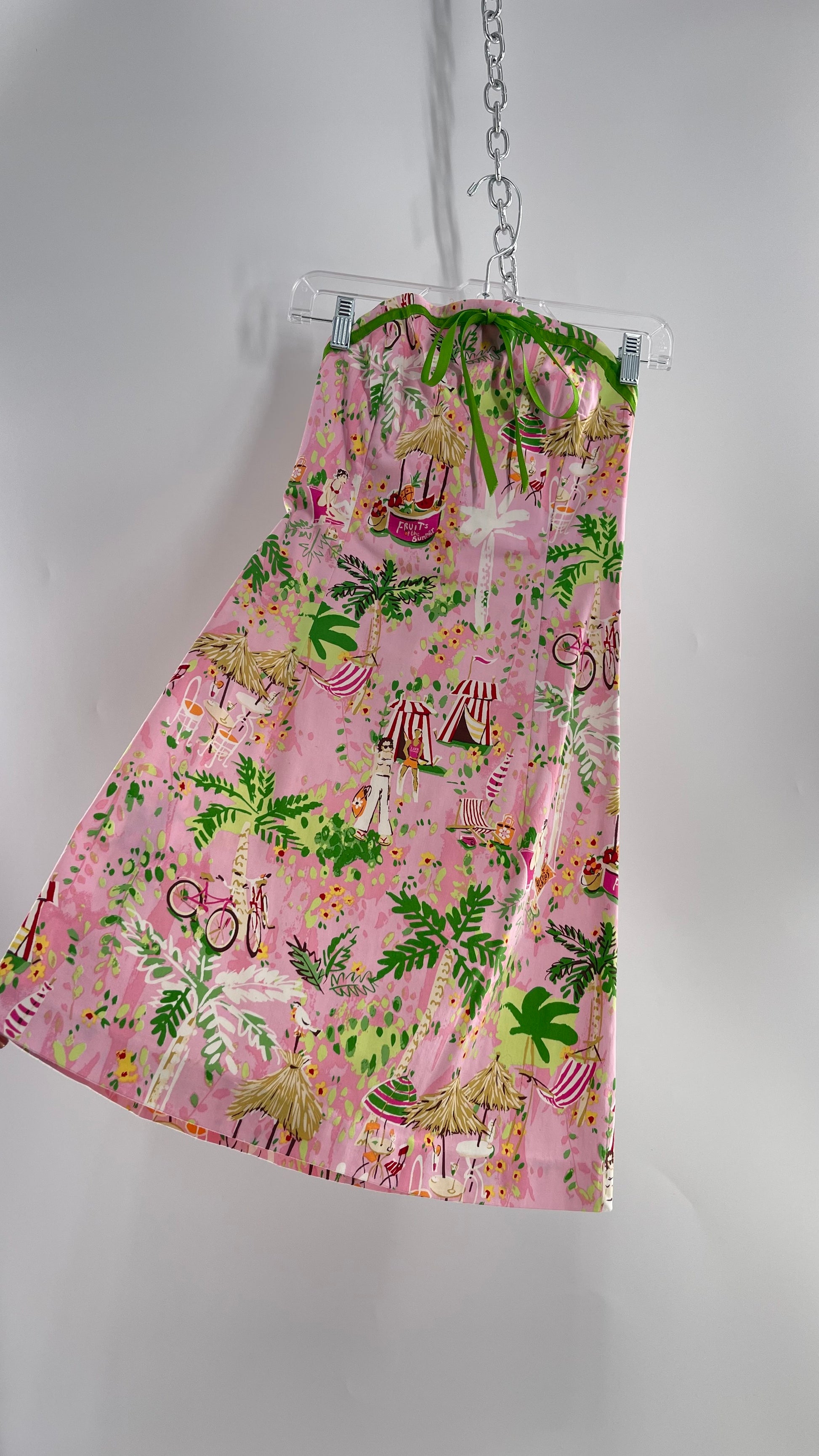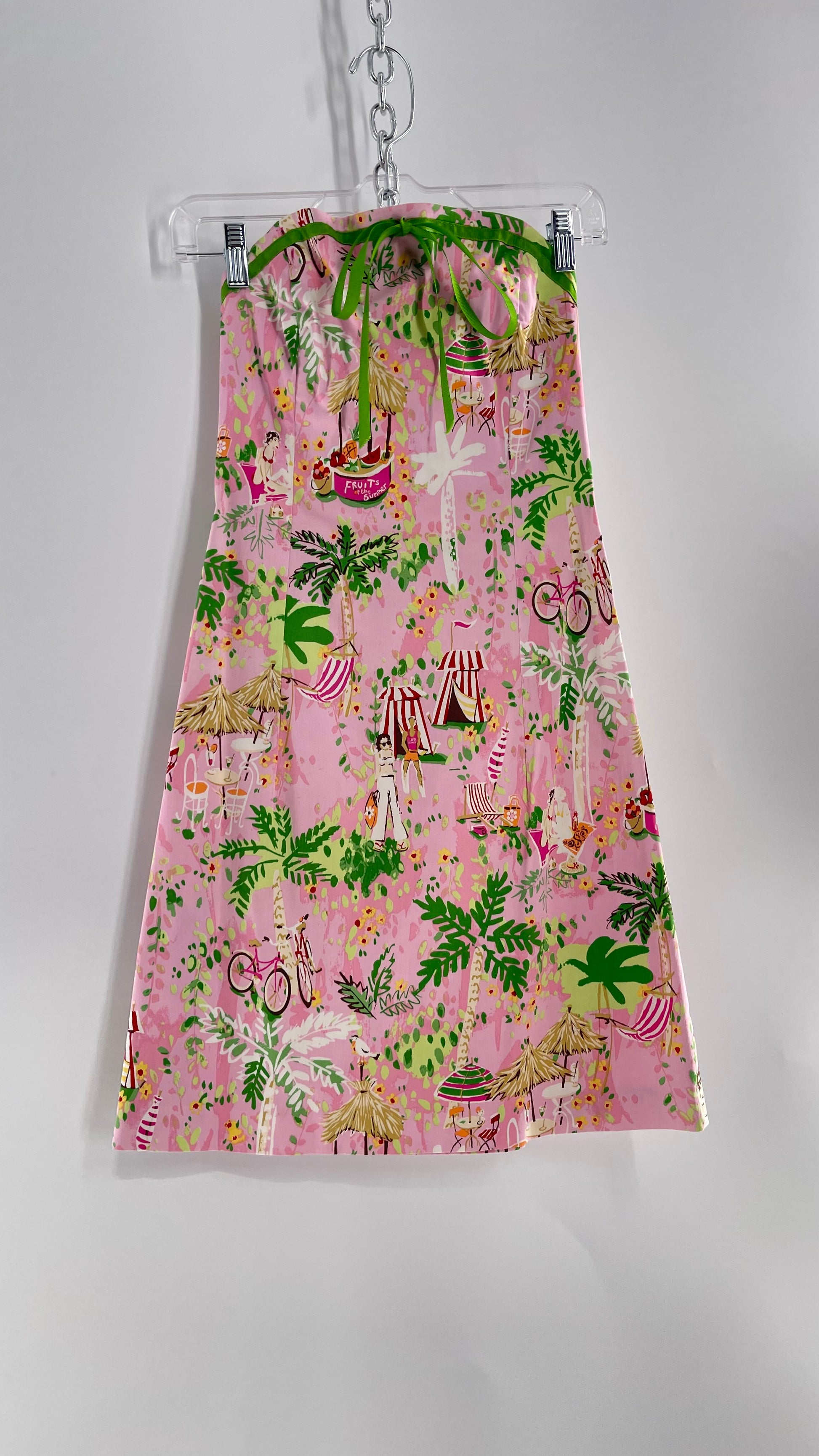 Vintage Handmade Pink Sketchbook 90s Print Mini Dress with Green Ribbon and Built In Boning (0/2)