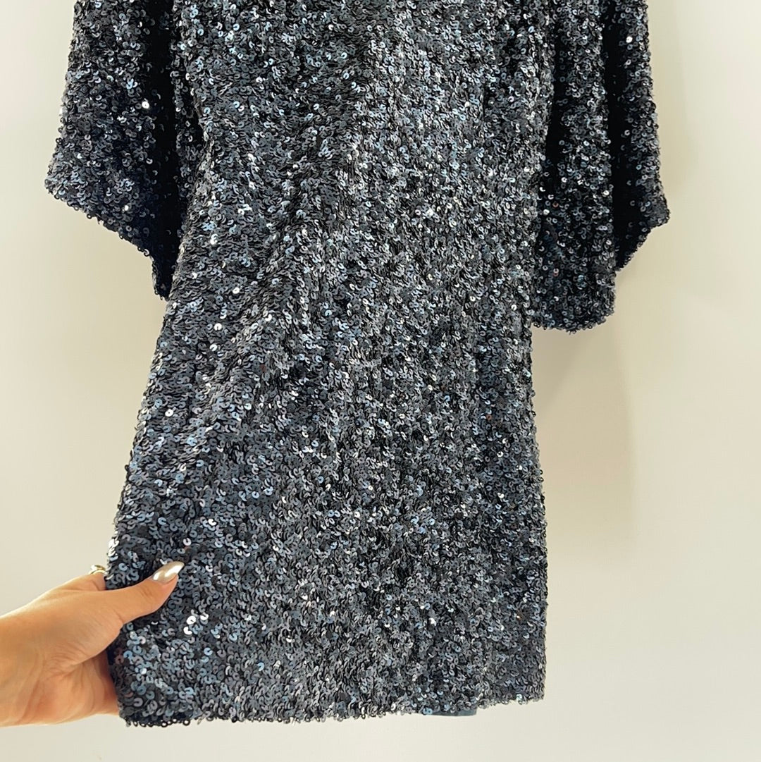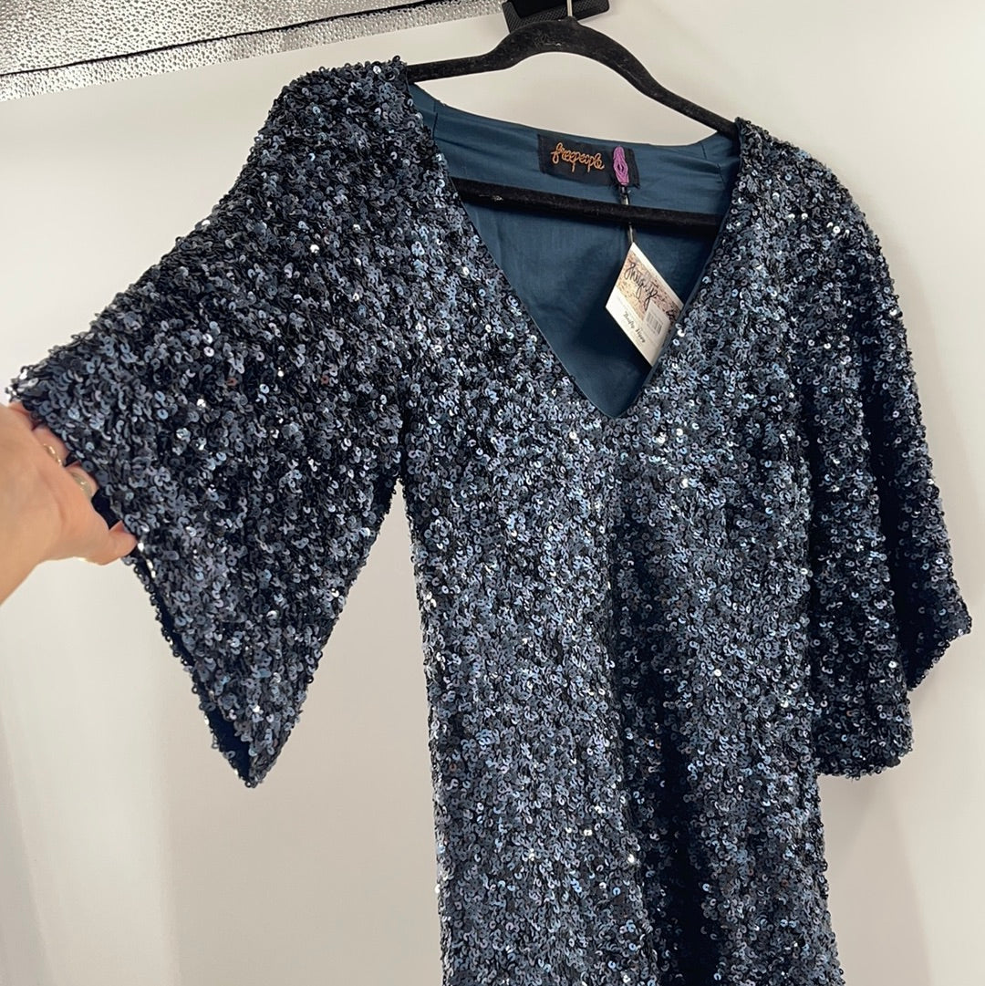 Free People midnight blue sequin dress with tight fitting body and loose t-shirt sleeves