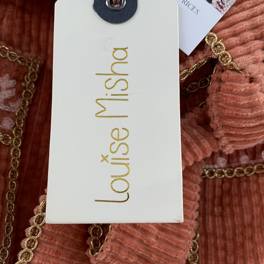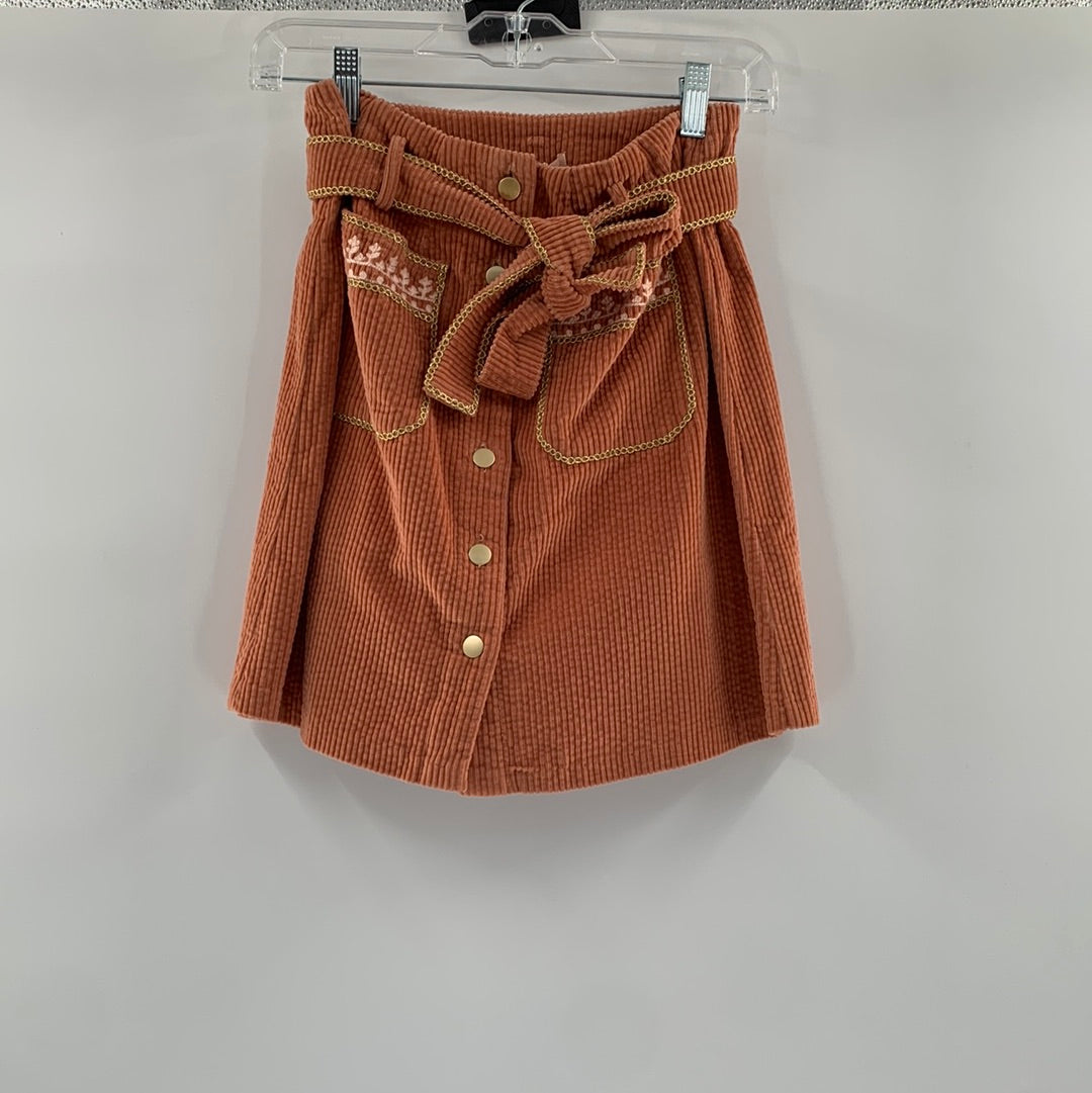 NWT Anthropologie Louise Misha Pink/Terracotta corduroy mini skirt with button up front, gold ribbon lined belt and embroidered pockets
