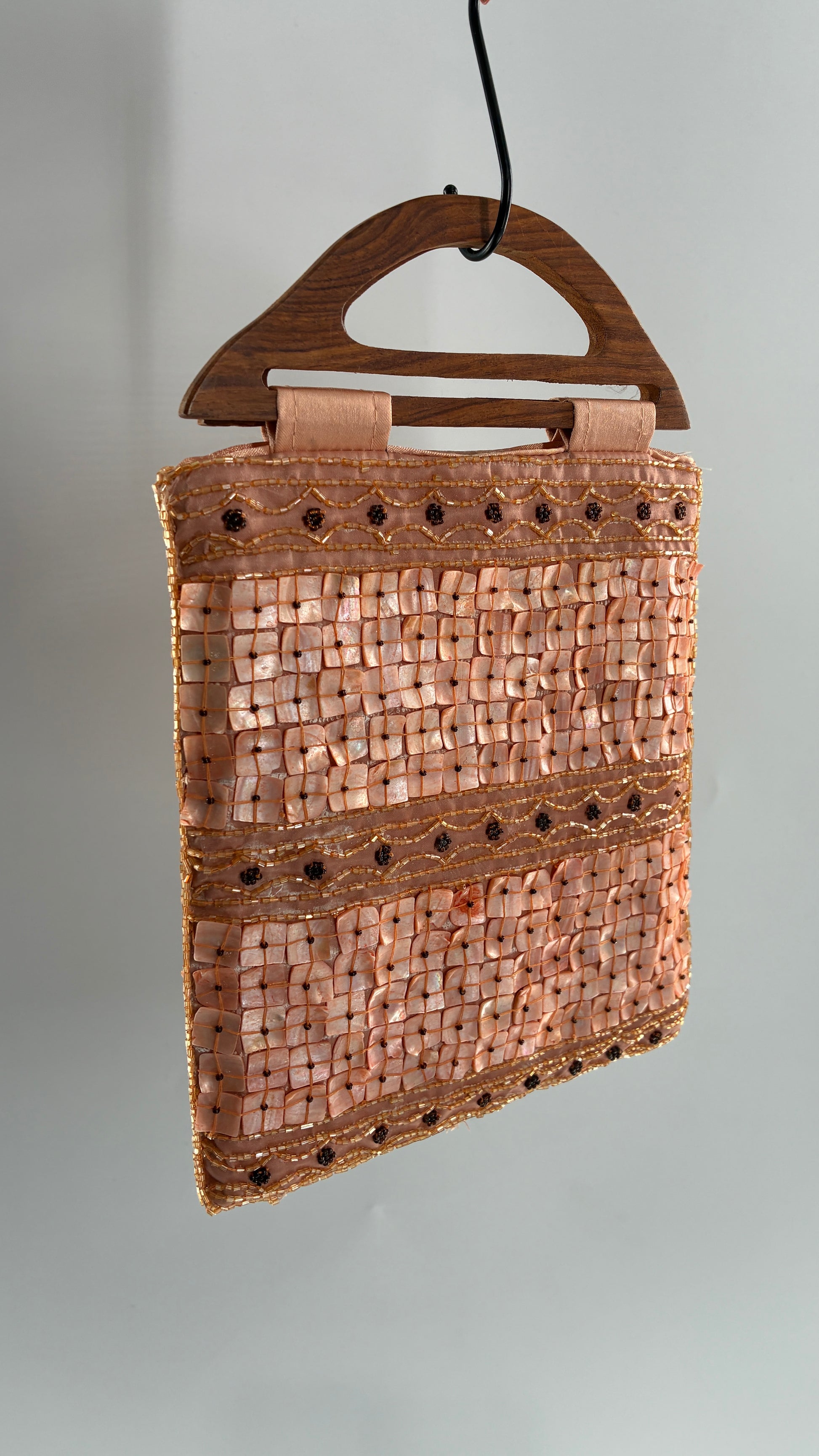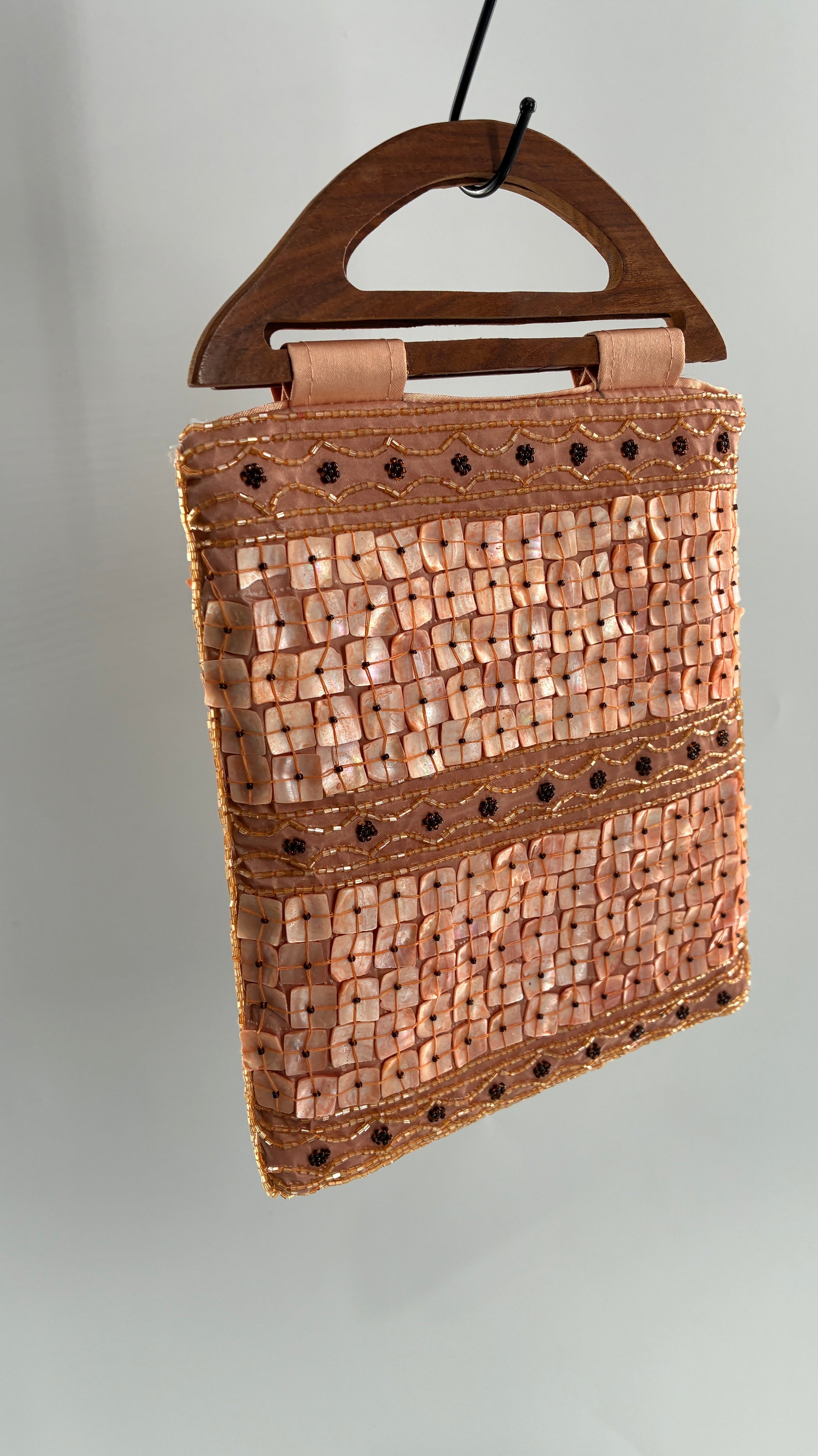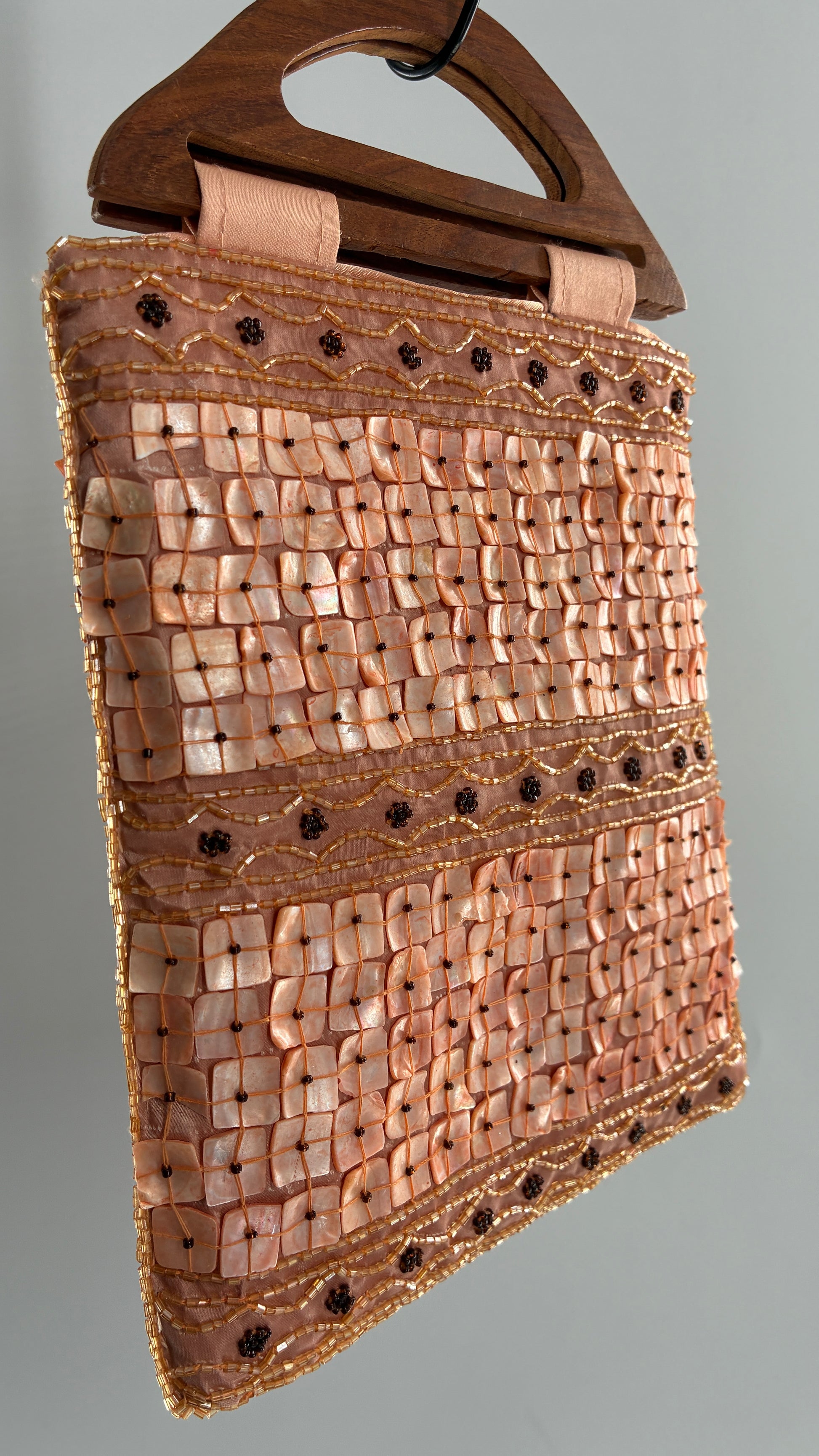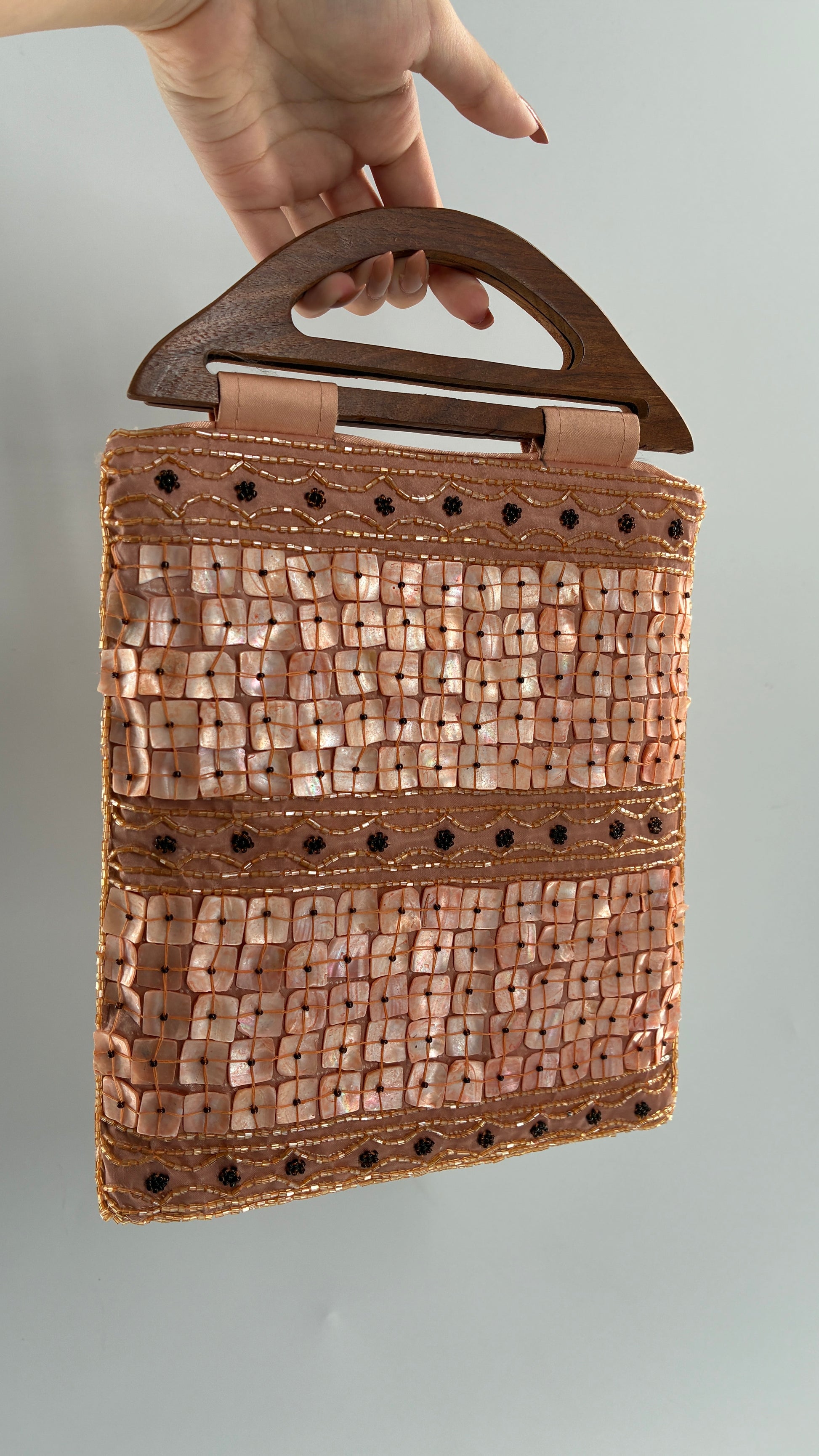 Vintage Pink Seashell Beaded Long Bag with Wooden Handle