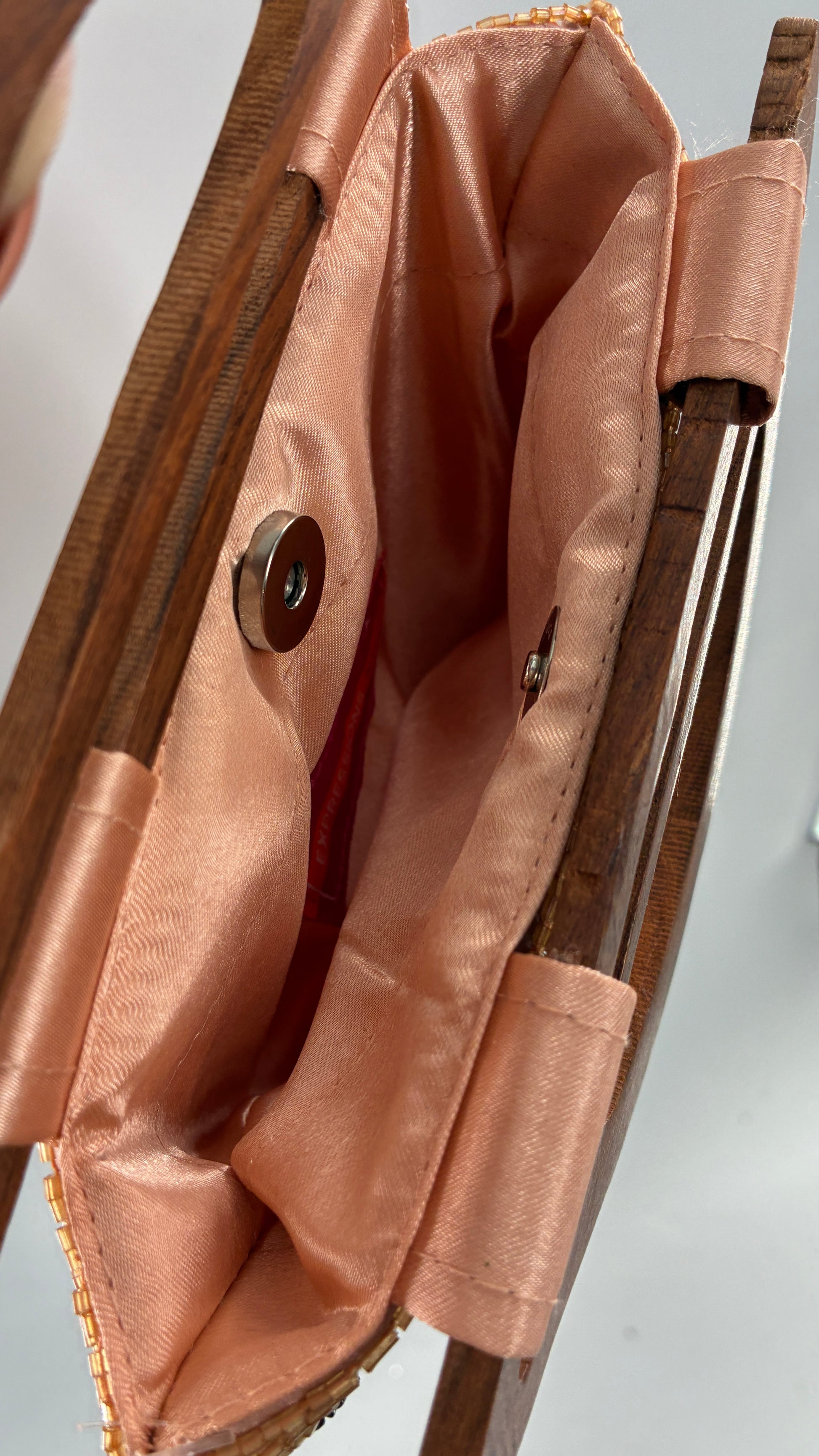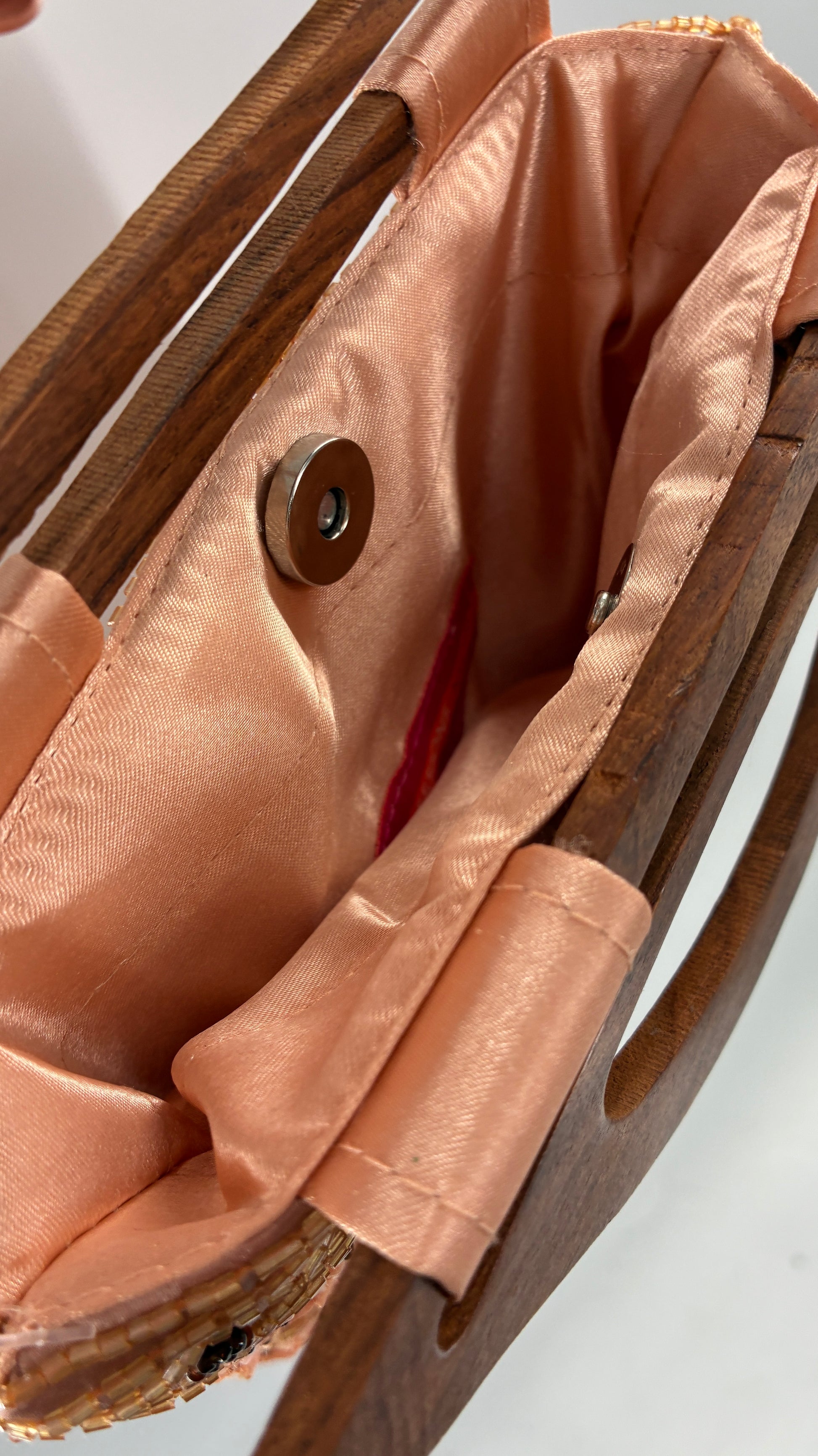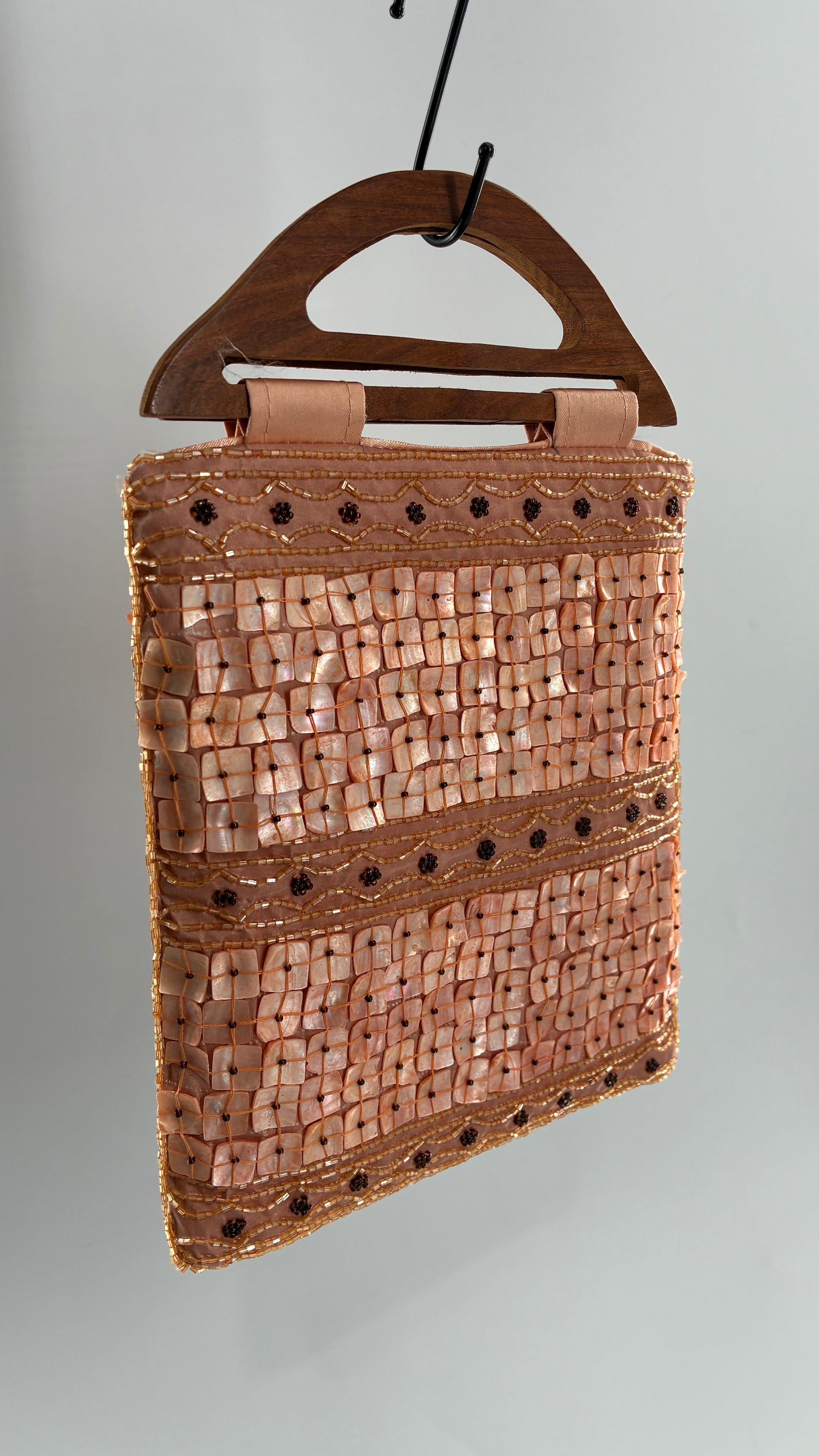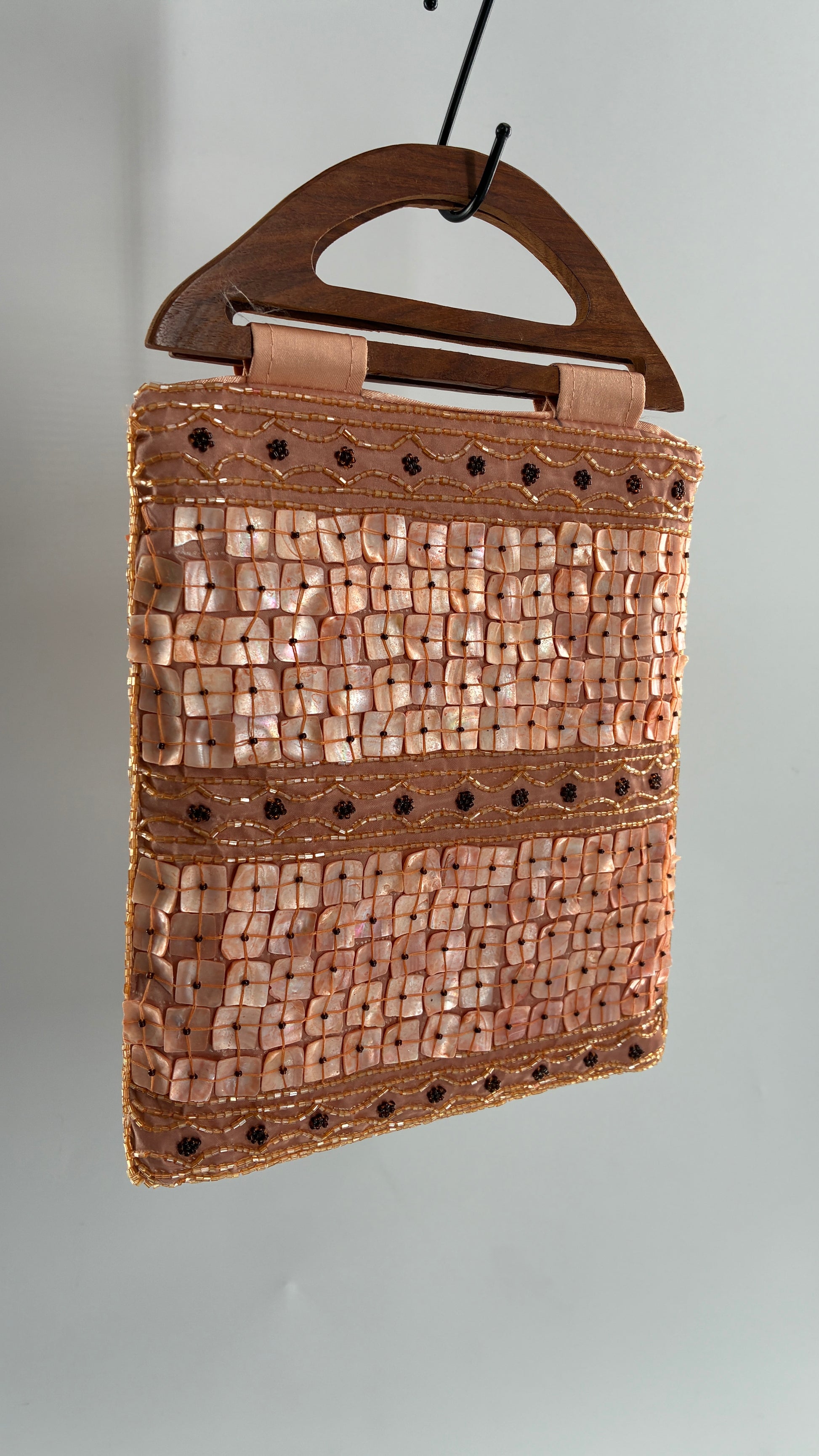 Vintage Pink Seashell Beaded Long Bag with Wooden Handle
