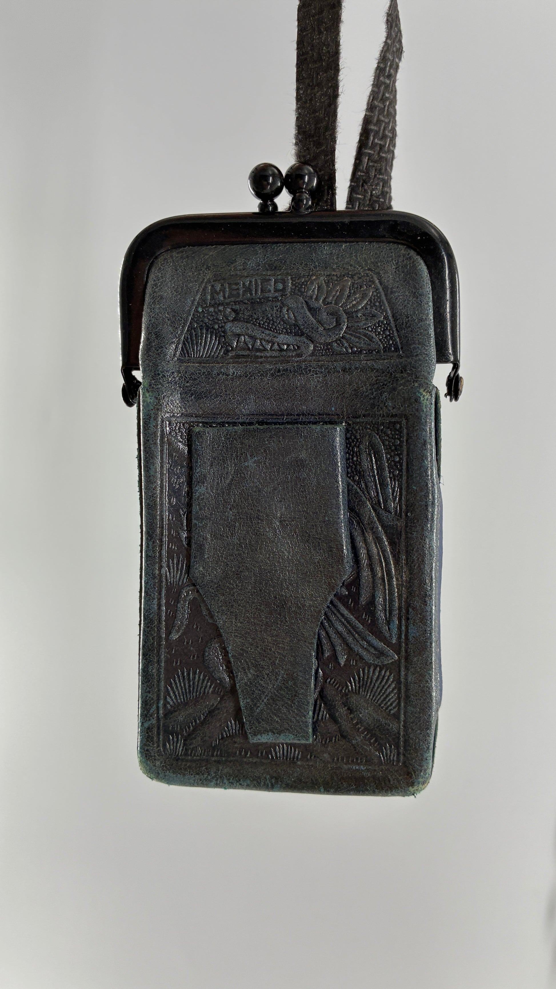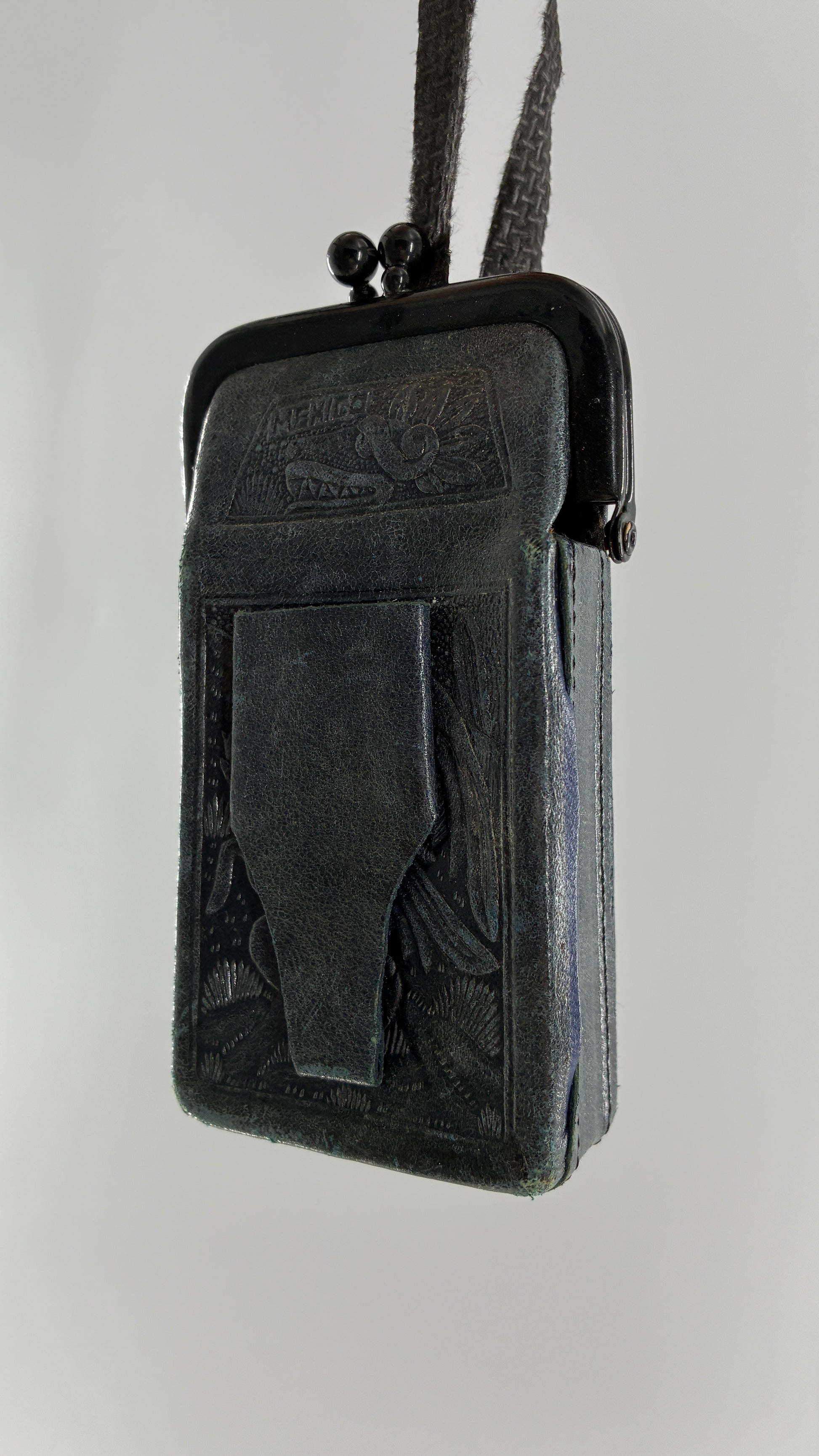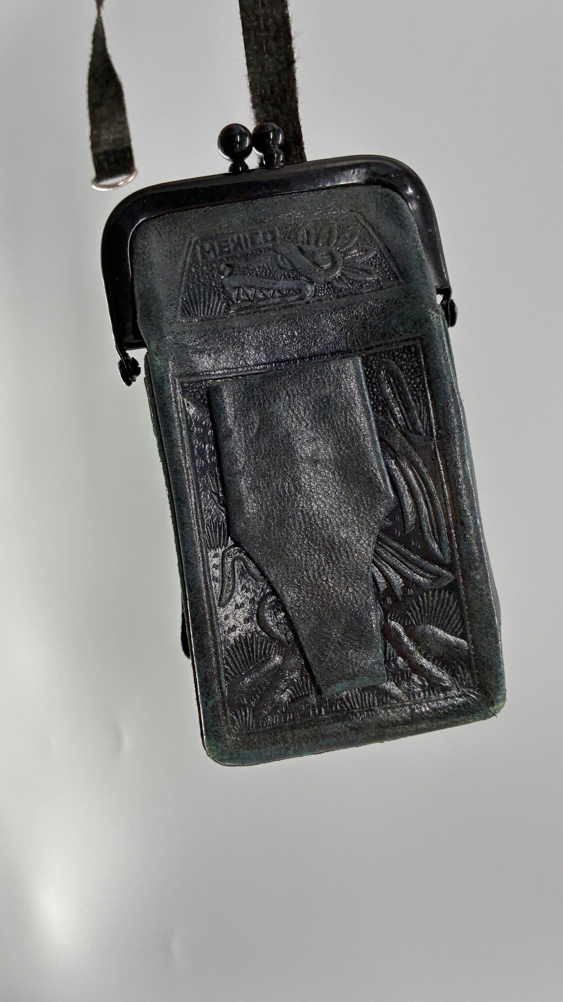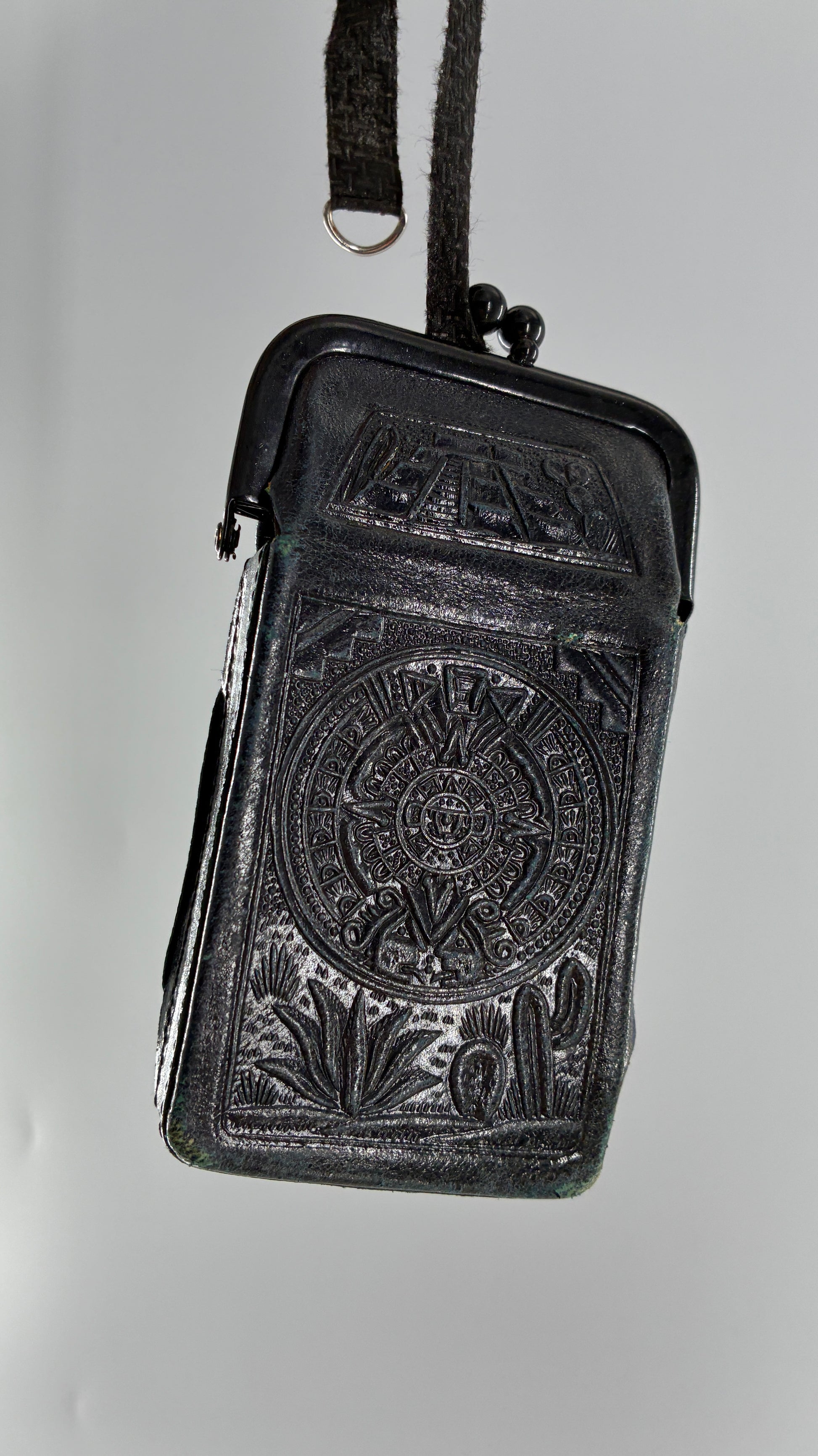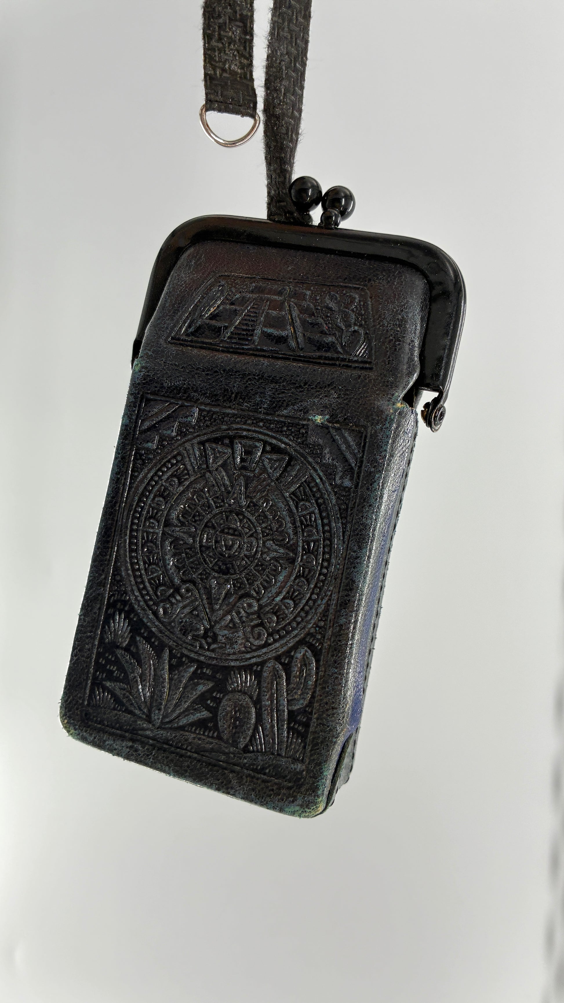 Vintage Mexican Black Engraved Leather Cigarette Pouch with Lighter Holster
