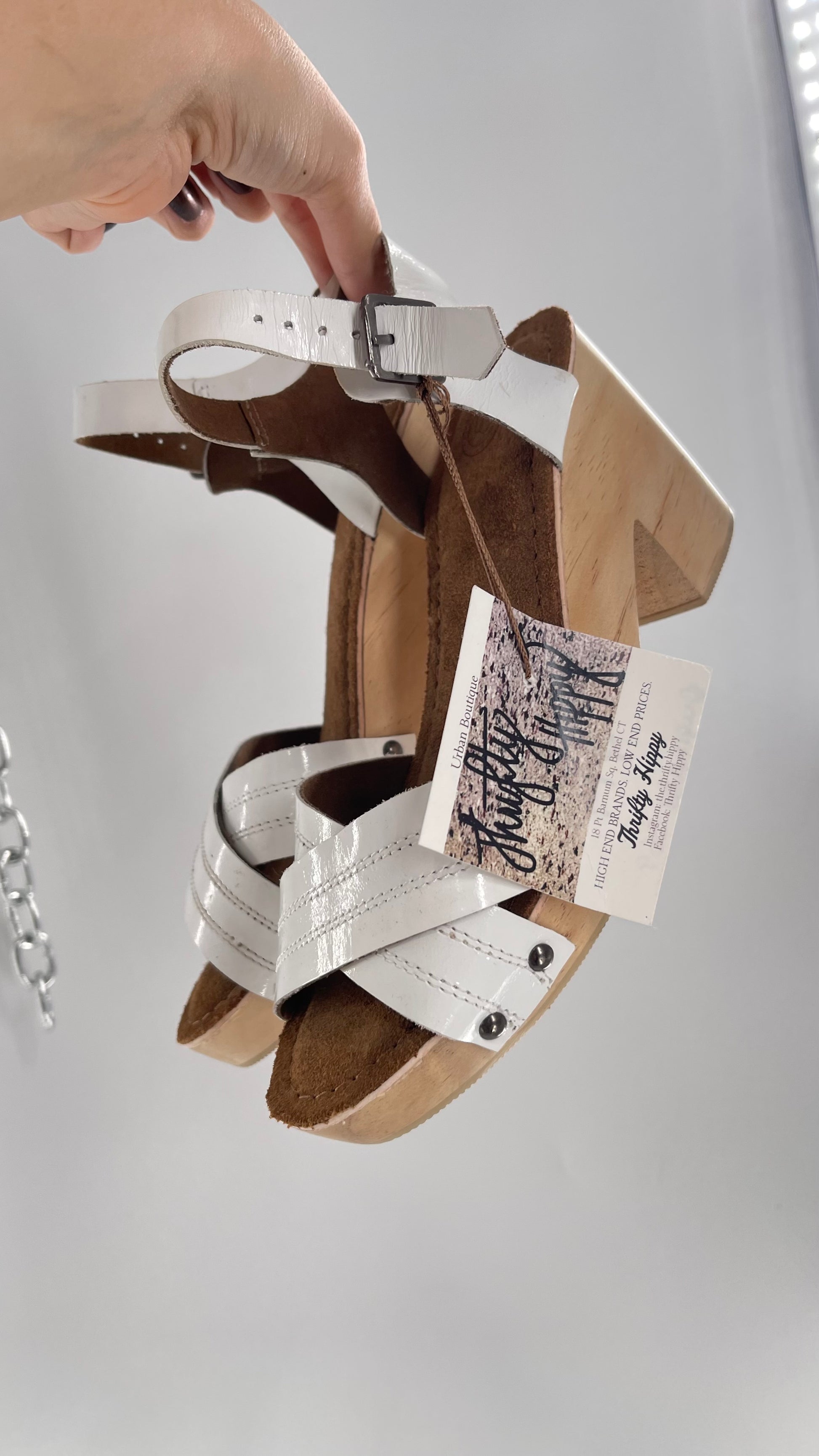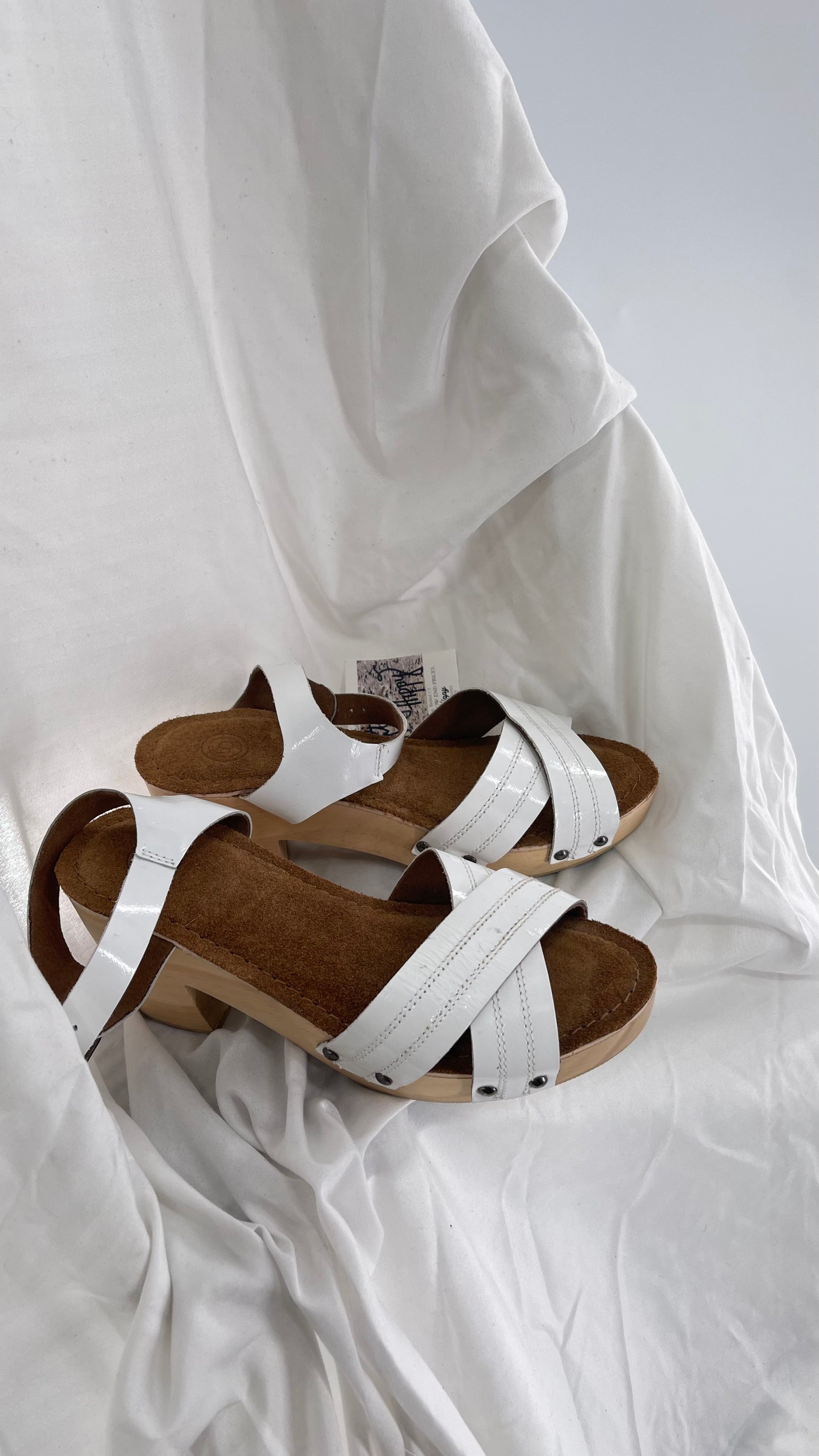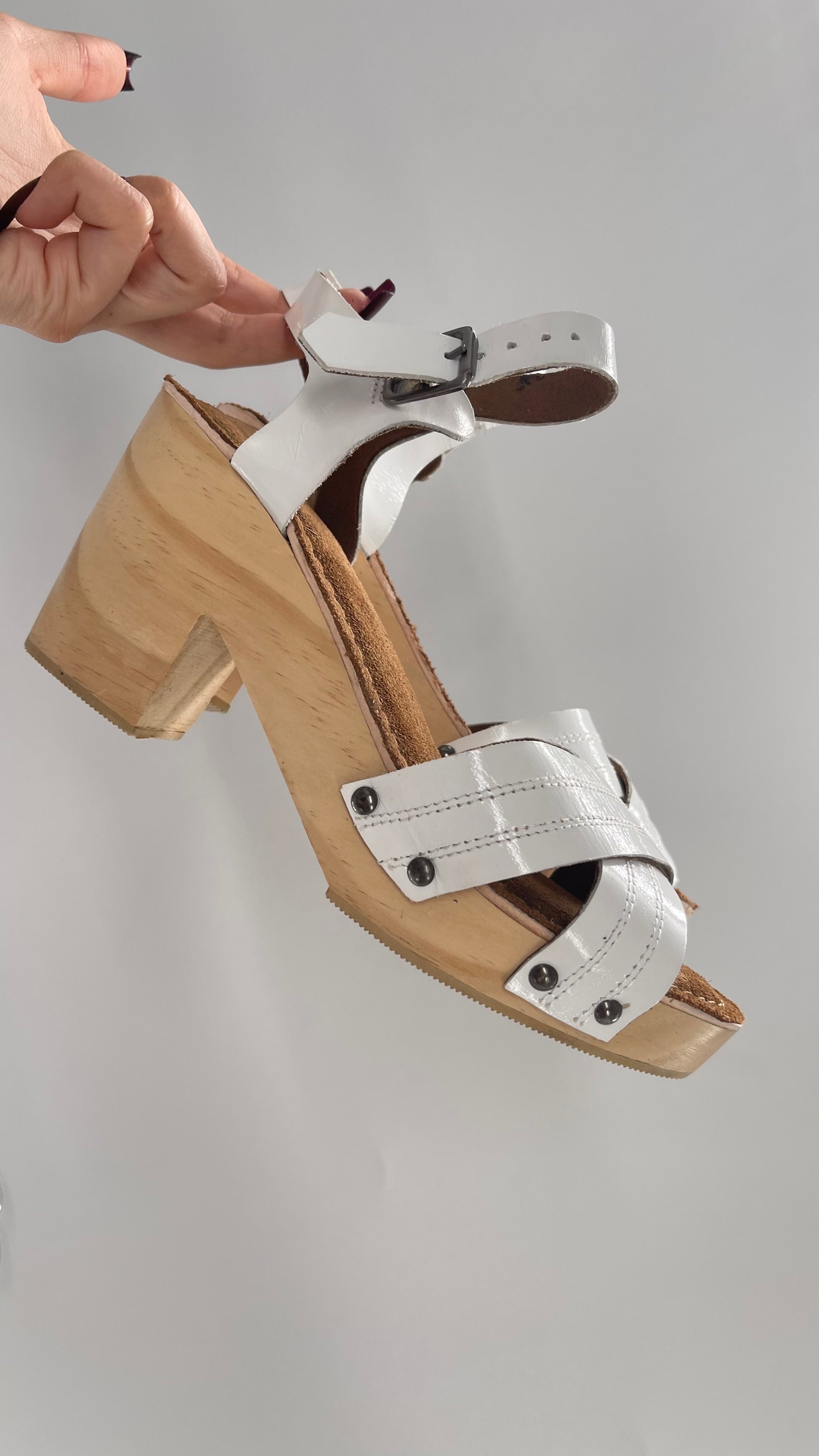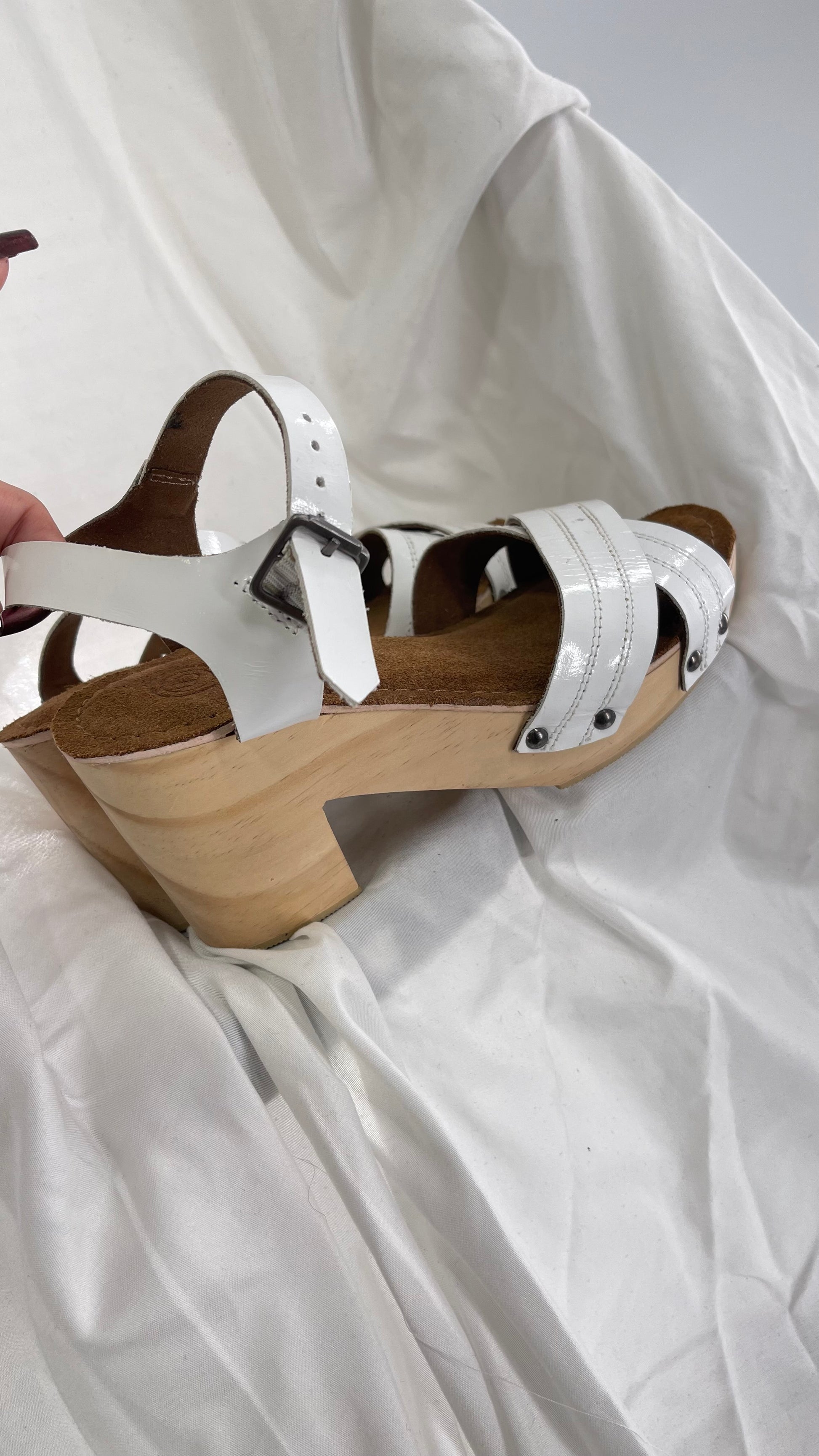 Urban Outfitters White Patent Clogs with Wooden Heel (6)