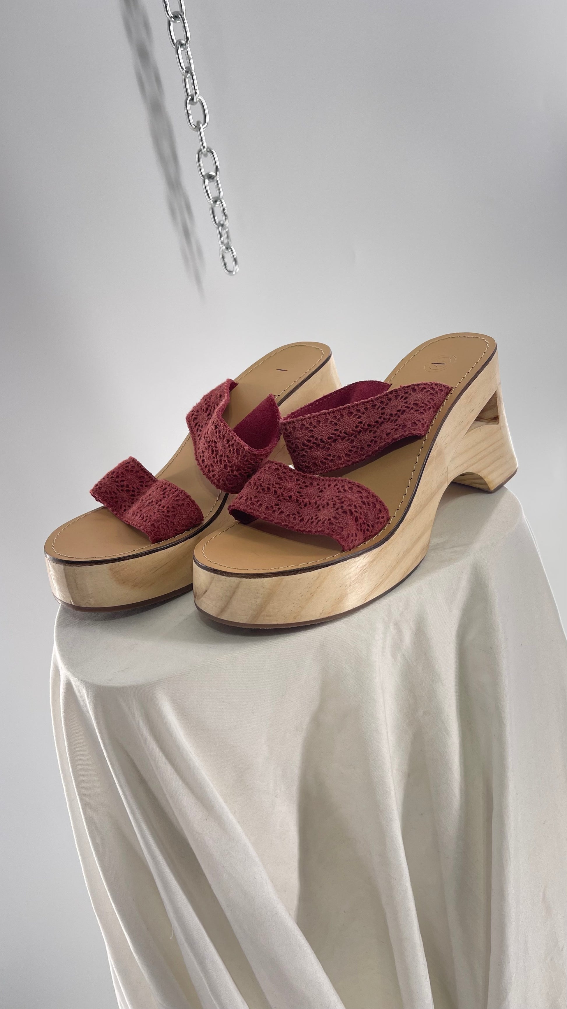Urban Outfitters Wooden Clog with Leather and Lace Maroon Red Straps