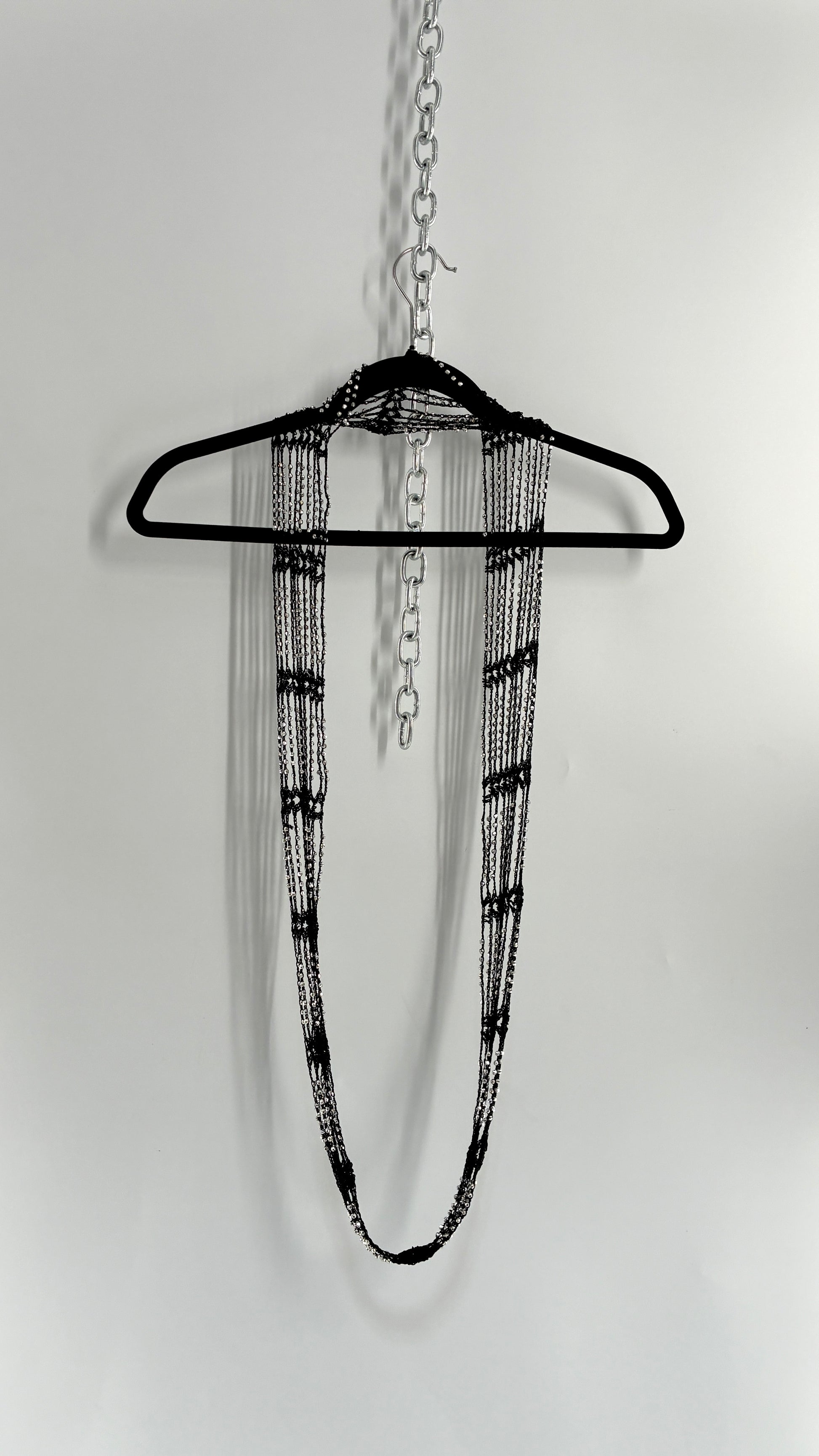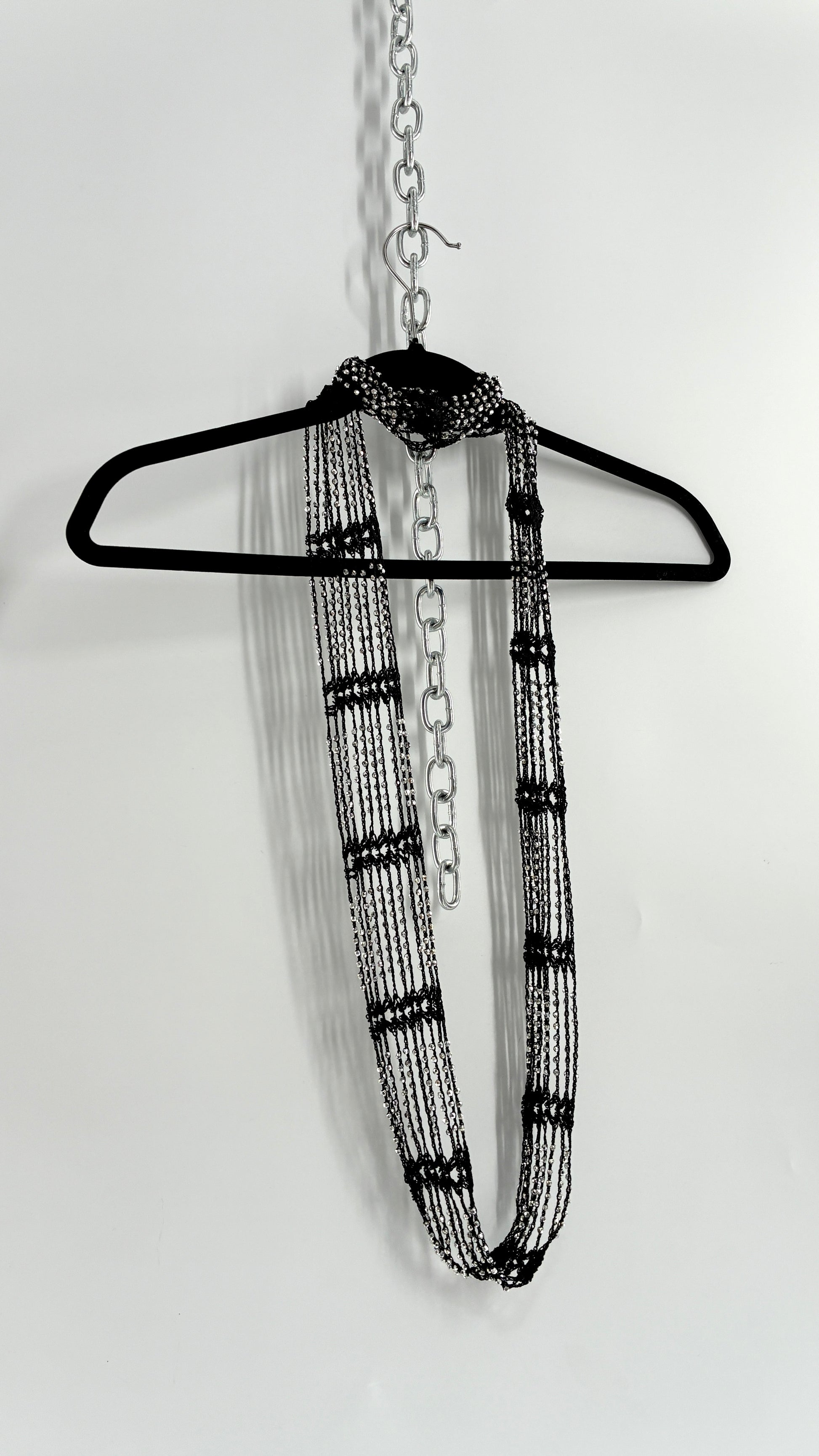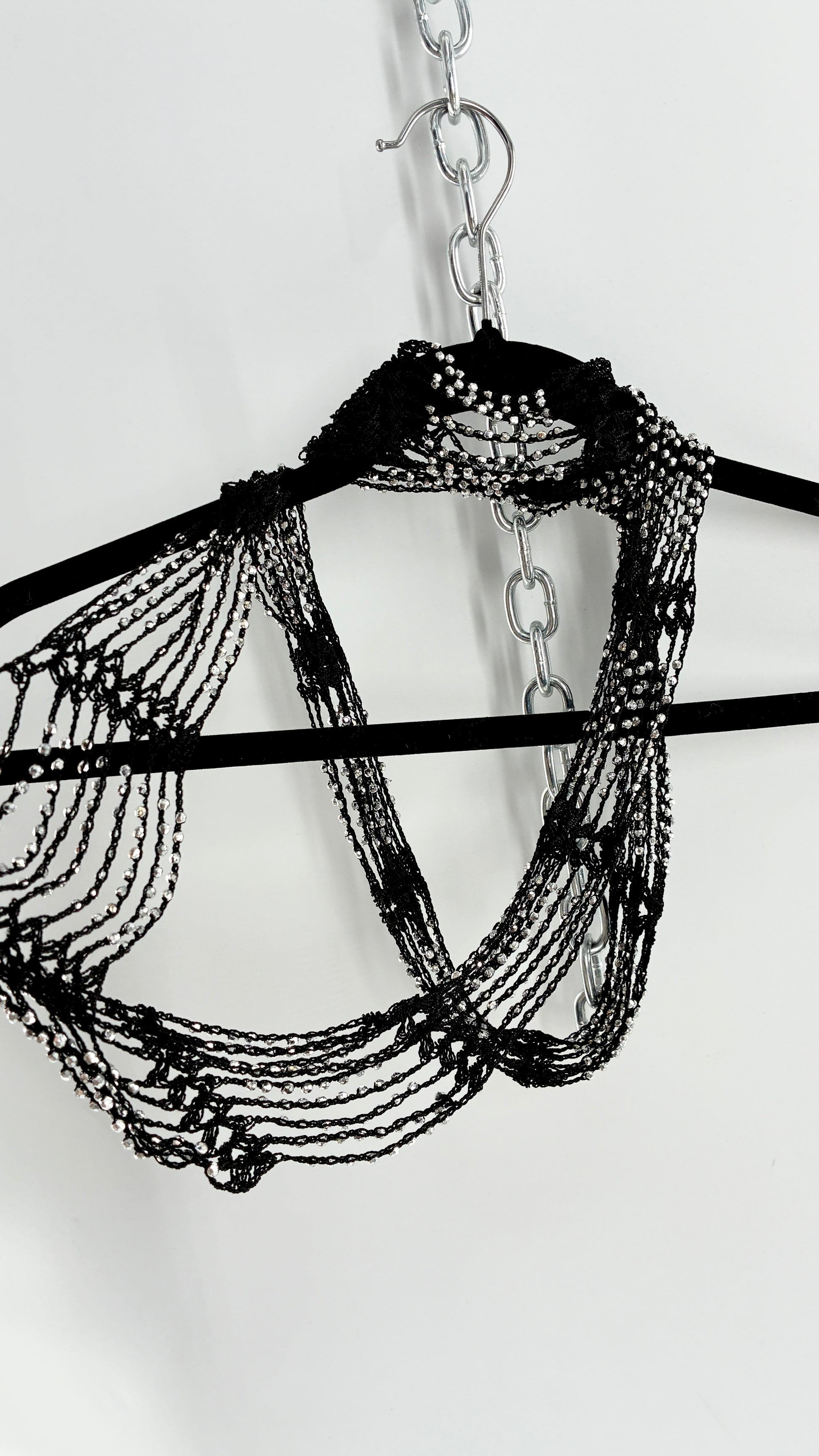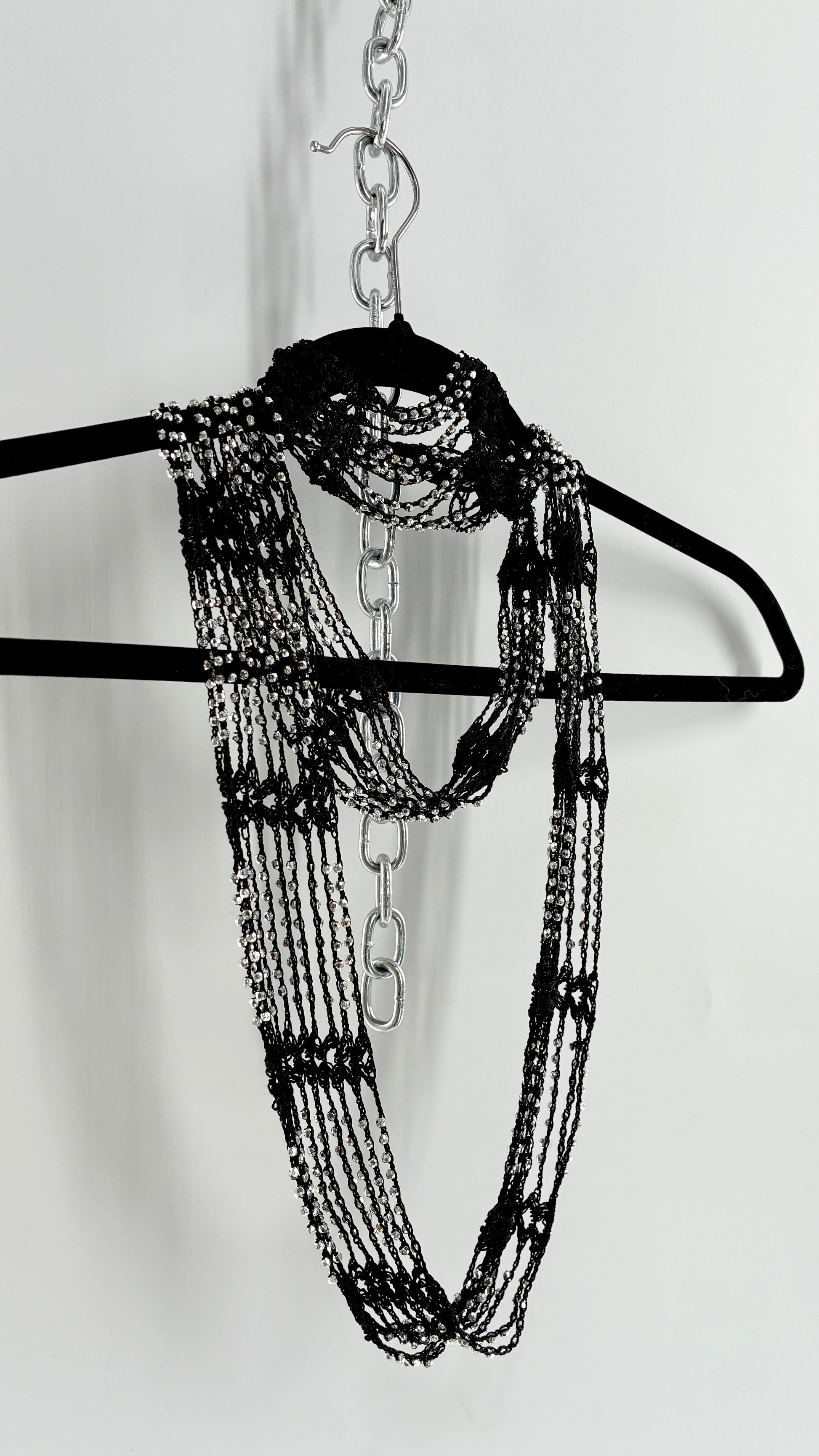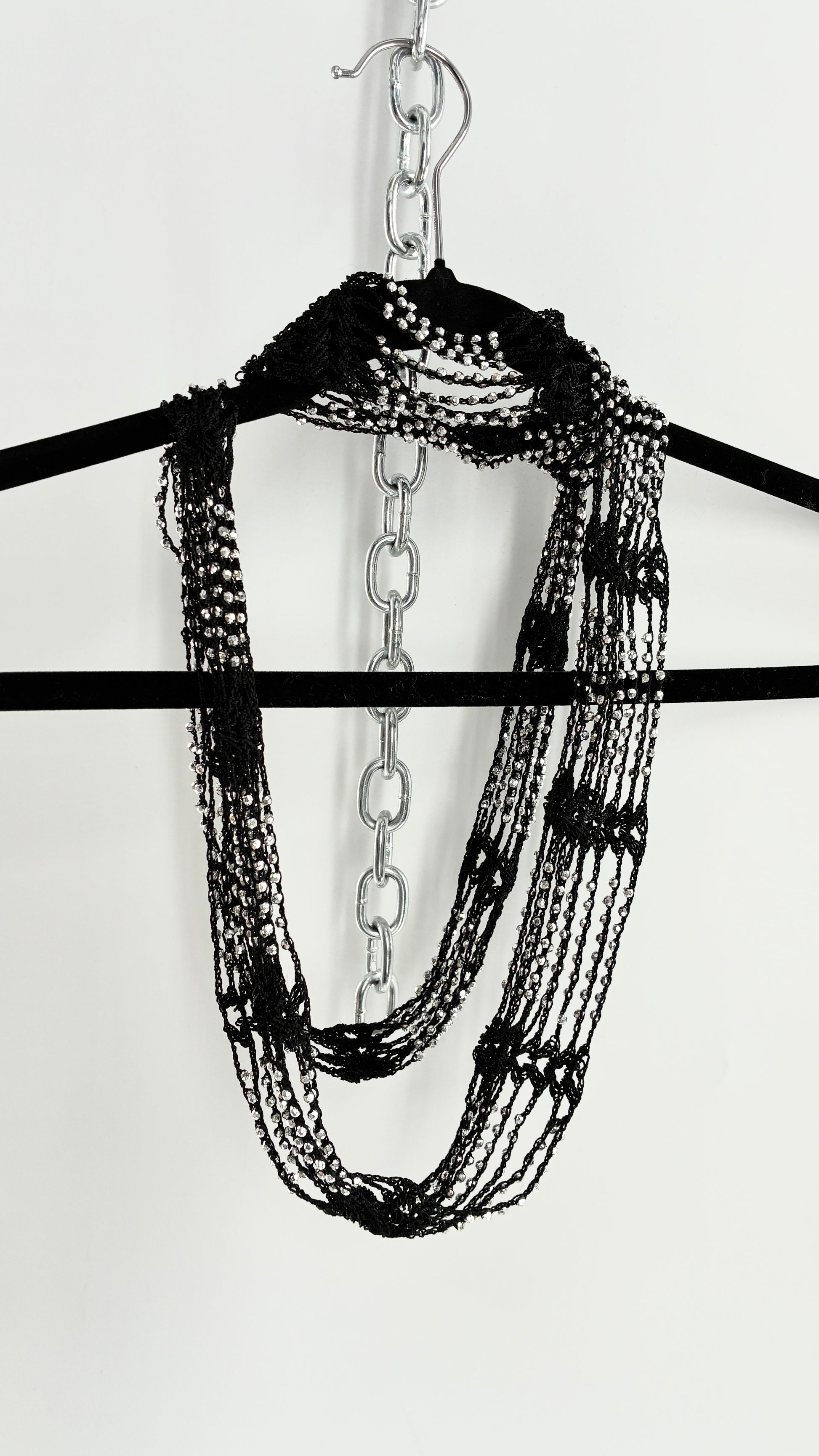 Vintage Black Crochet Infinity Scarf with Silver Pebble Beading