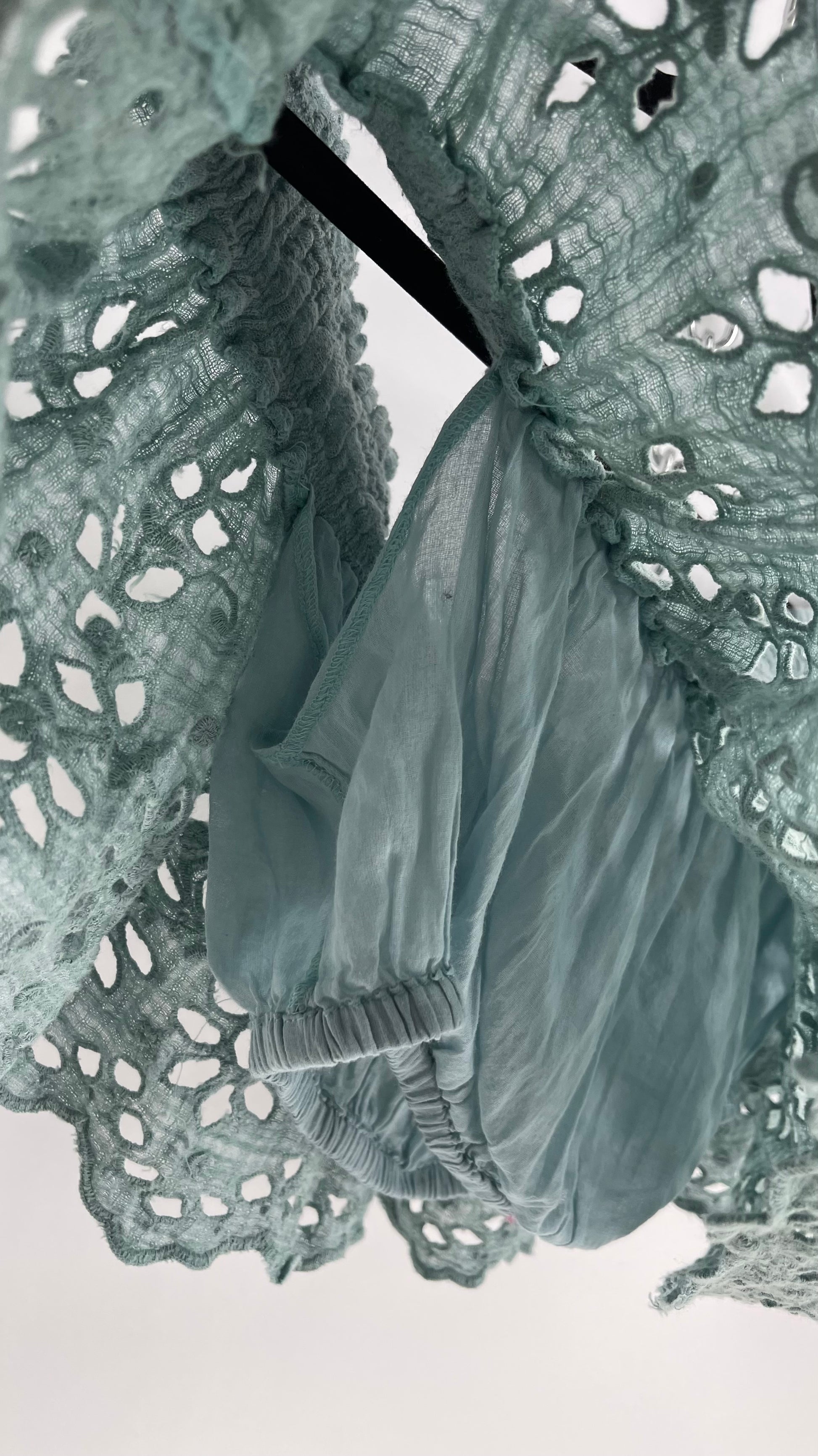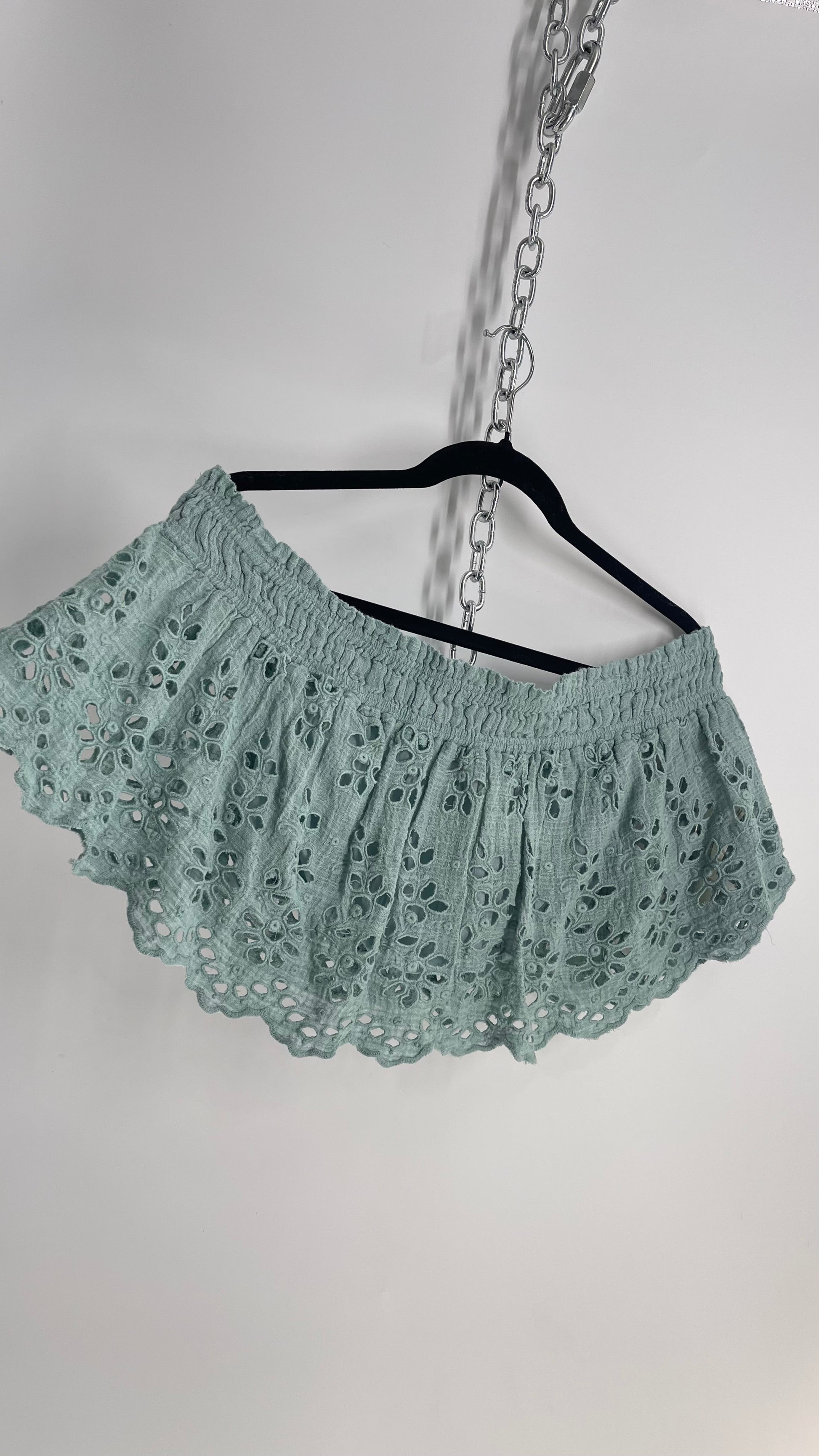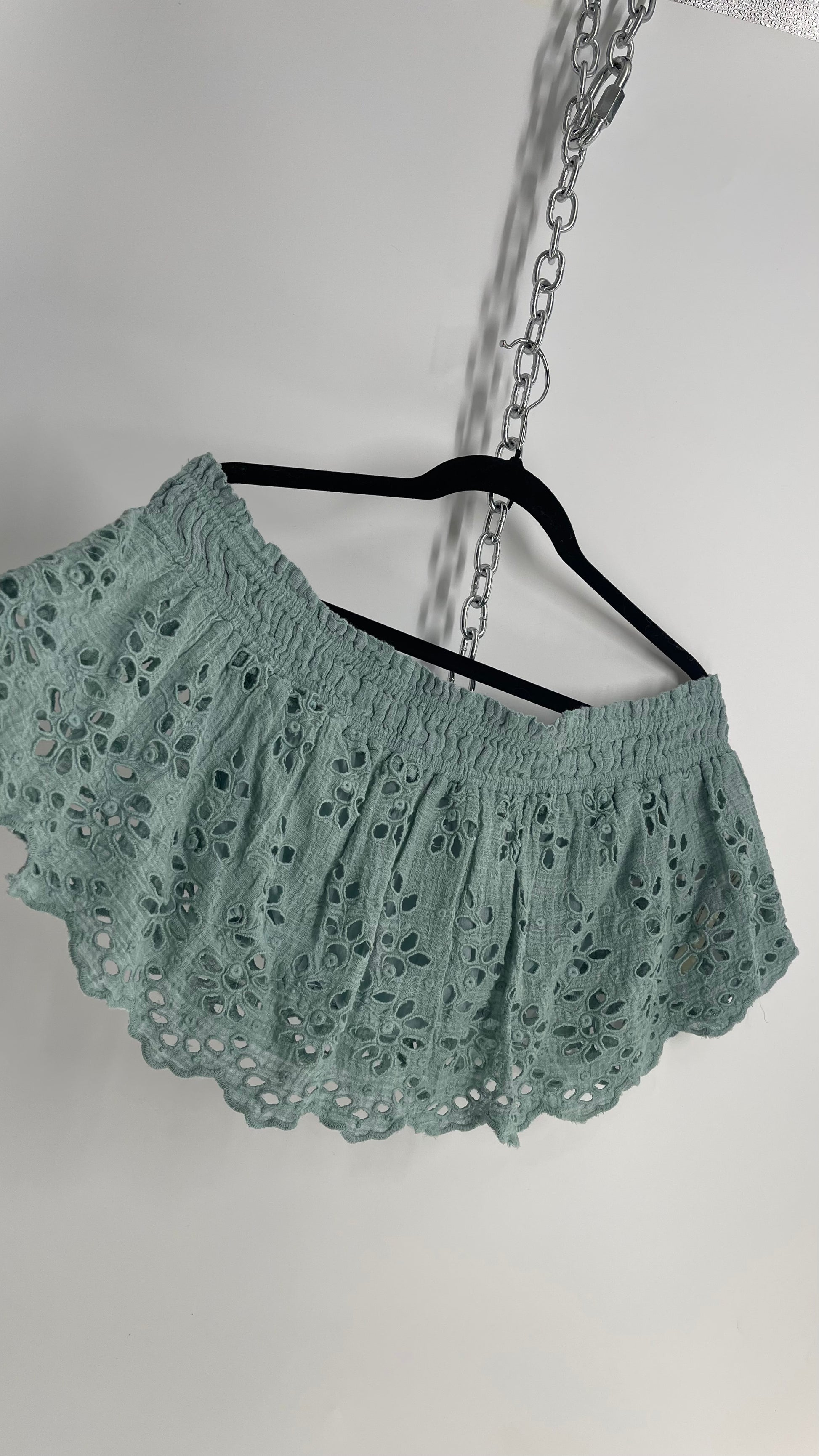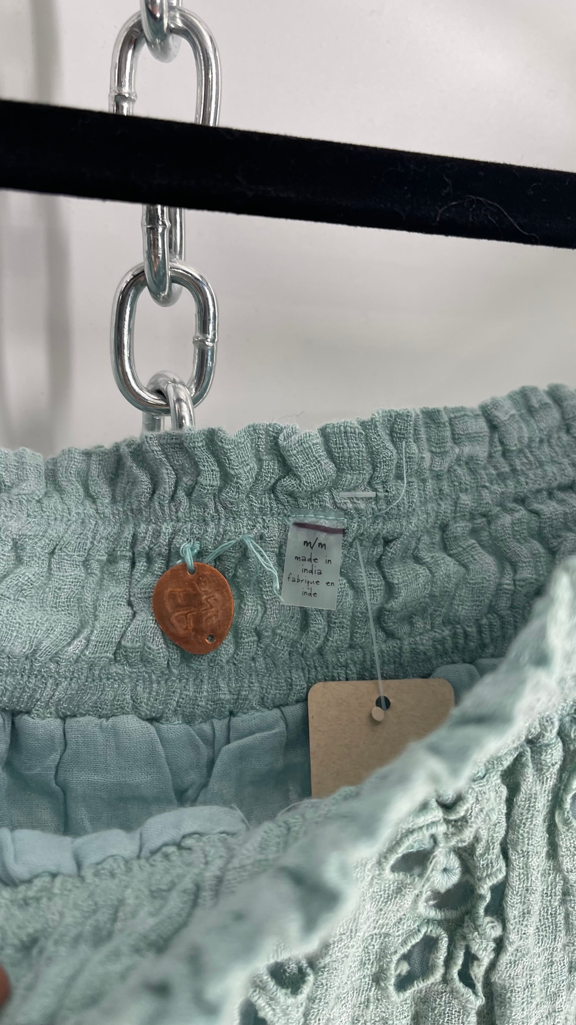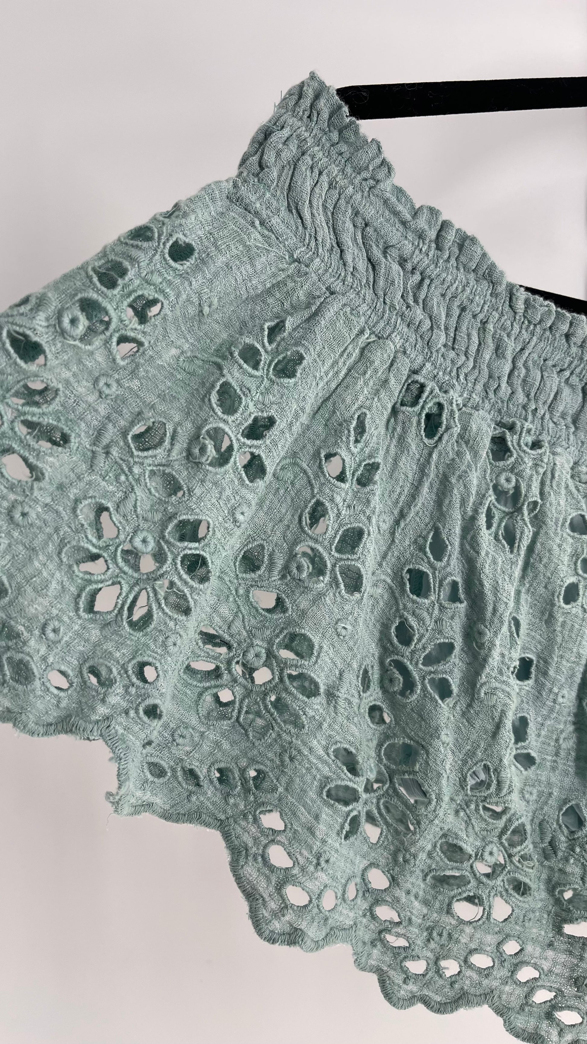 Free People Eyelet Cotton Teal Blue Off the Shoulder Ruffle Bandeau (Medium)
