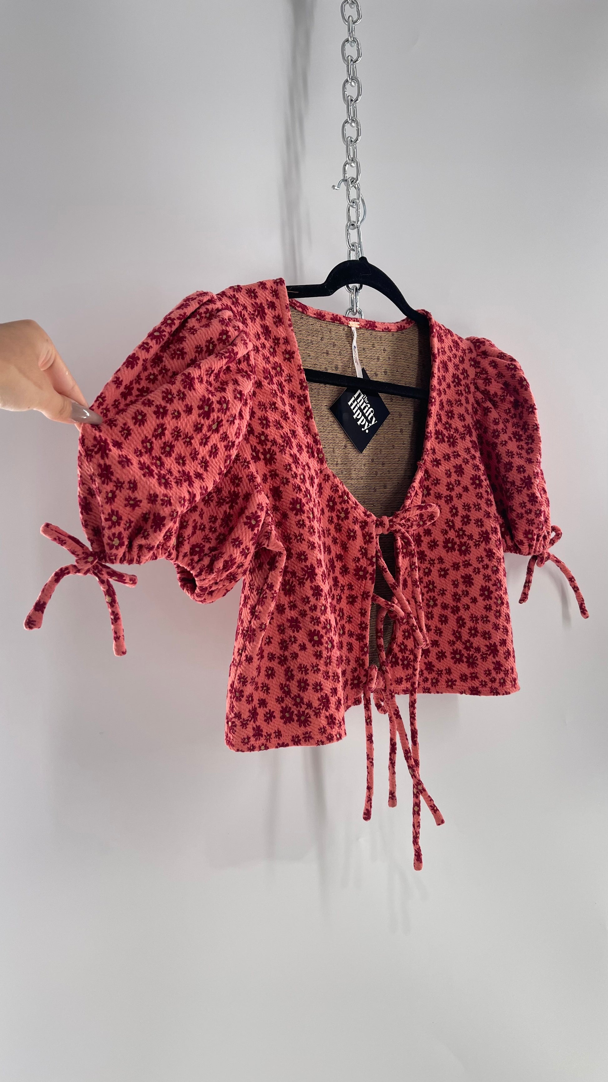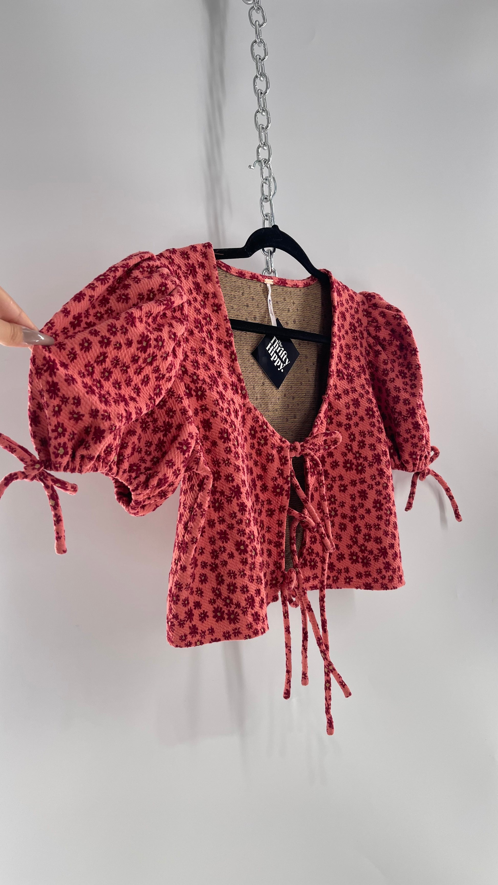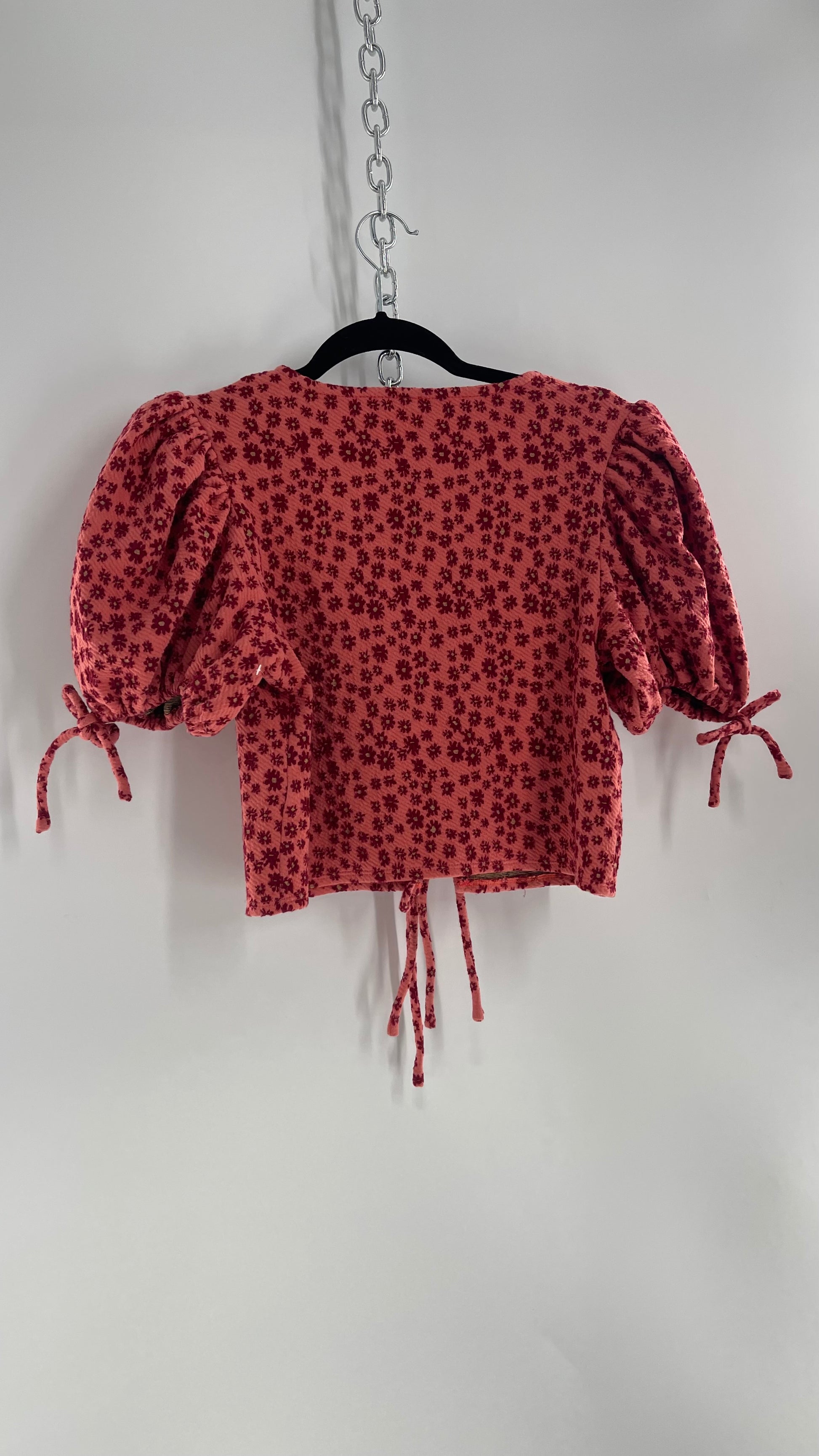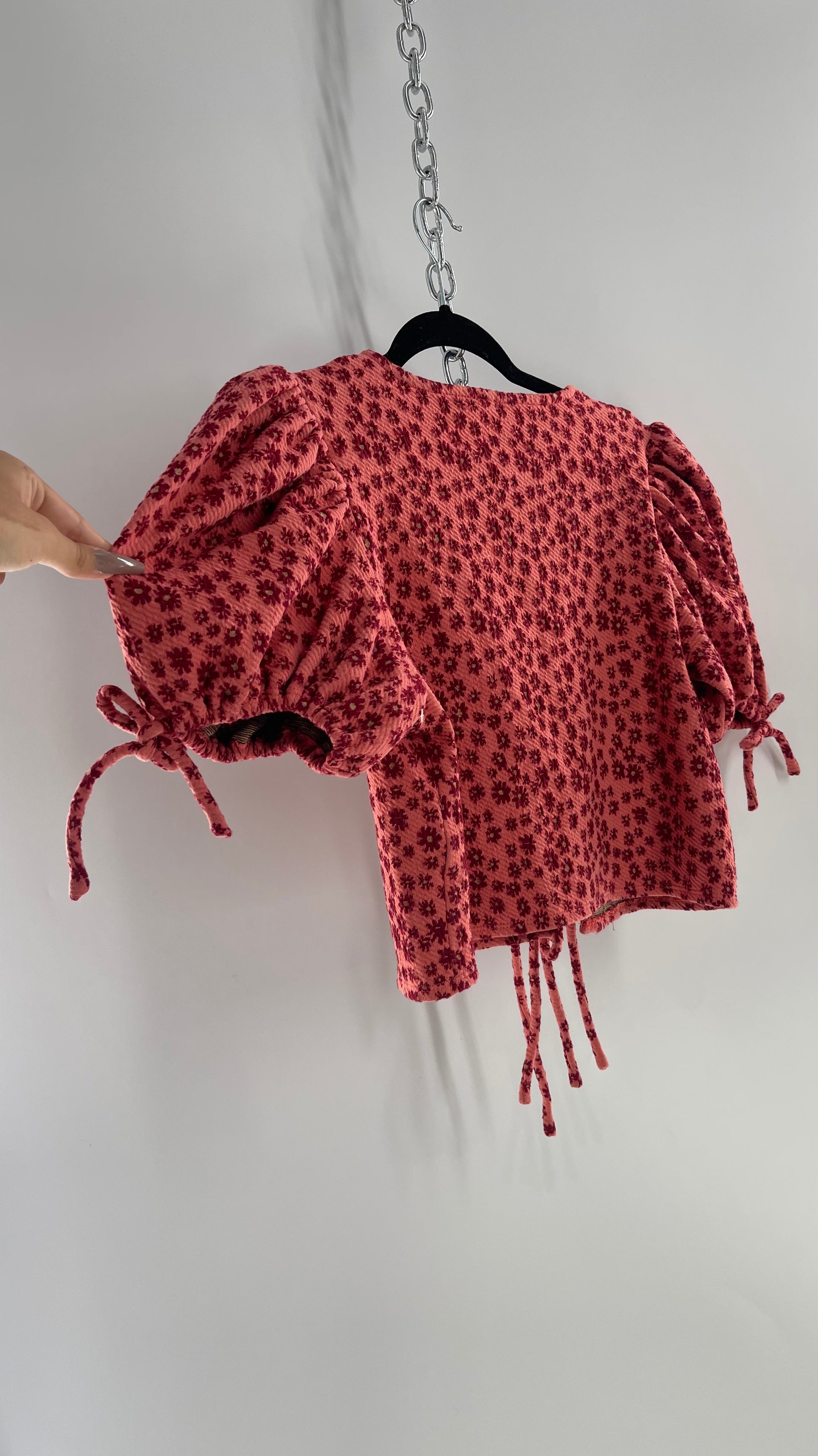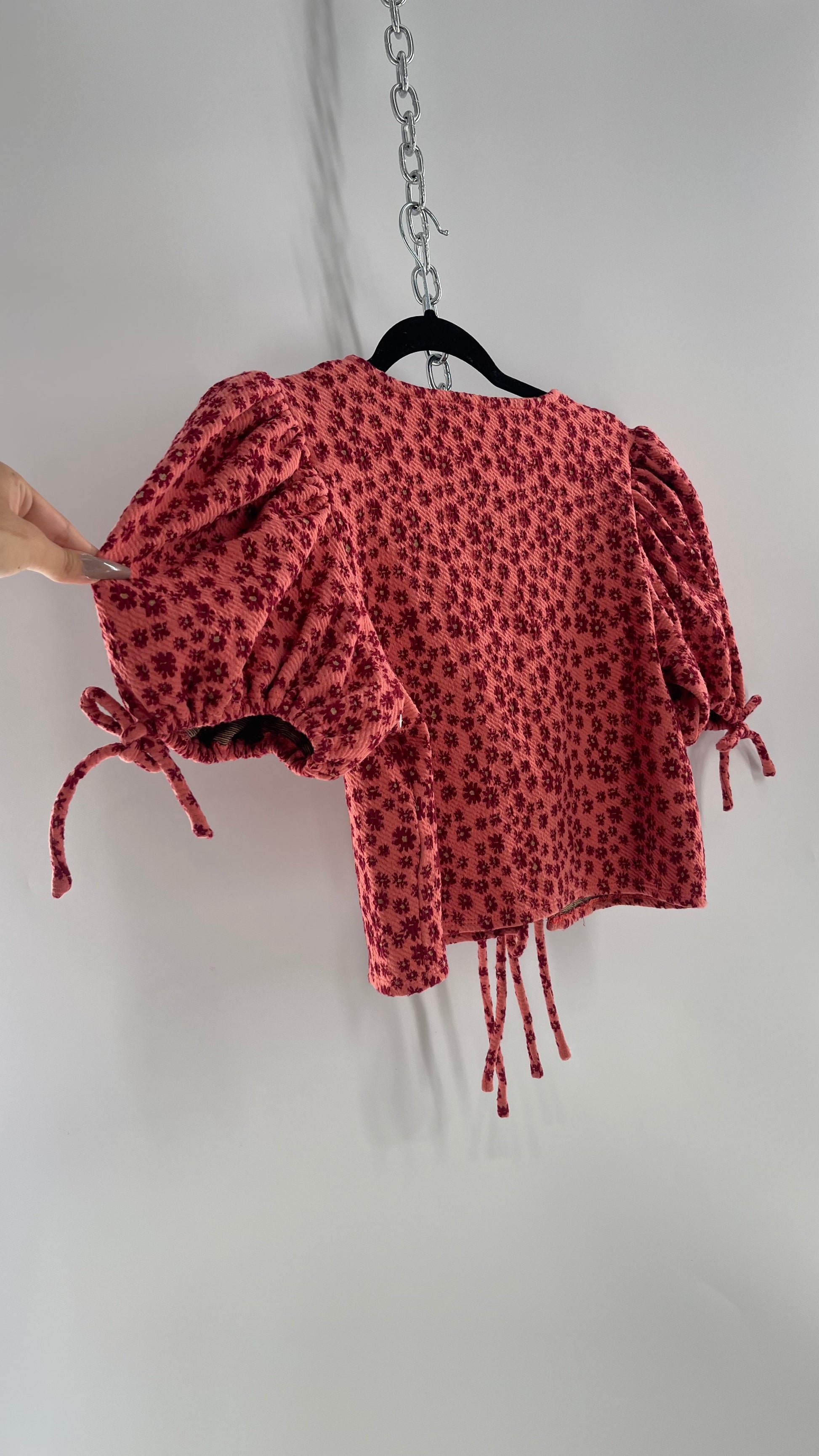 Free People Salmon Pink Thick Puff Sleeve Floral Tie Front Blouse (Small)