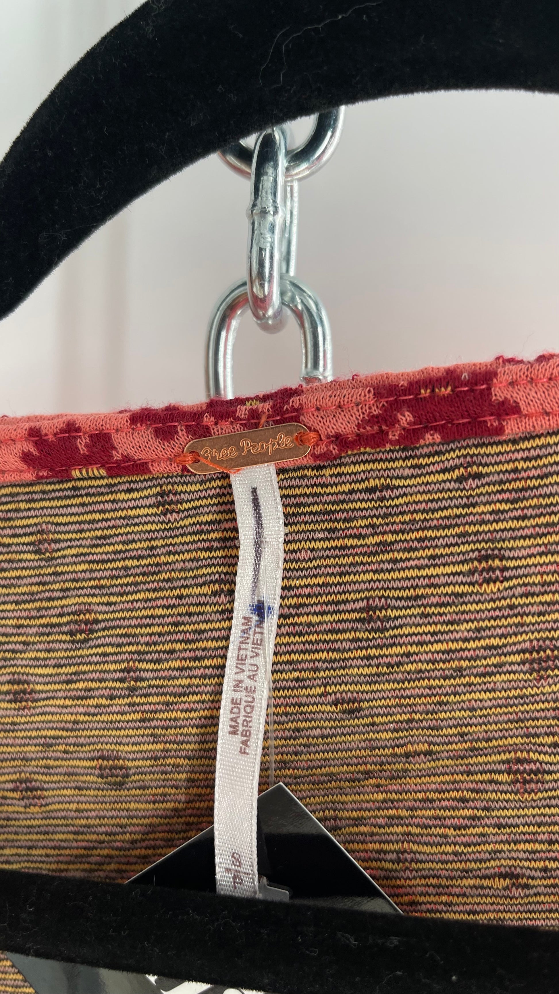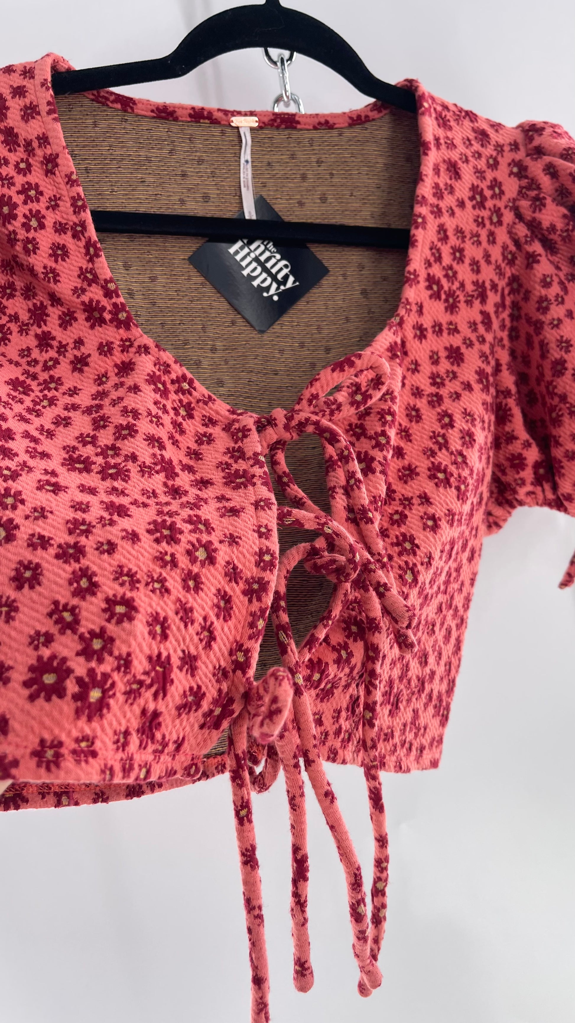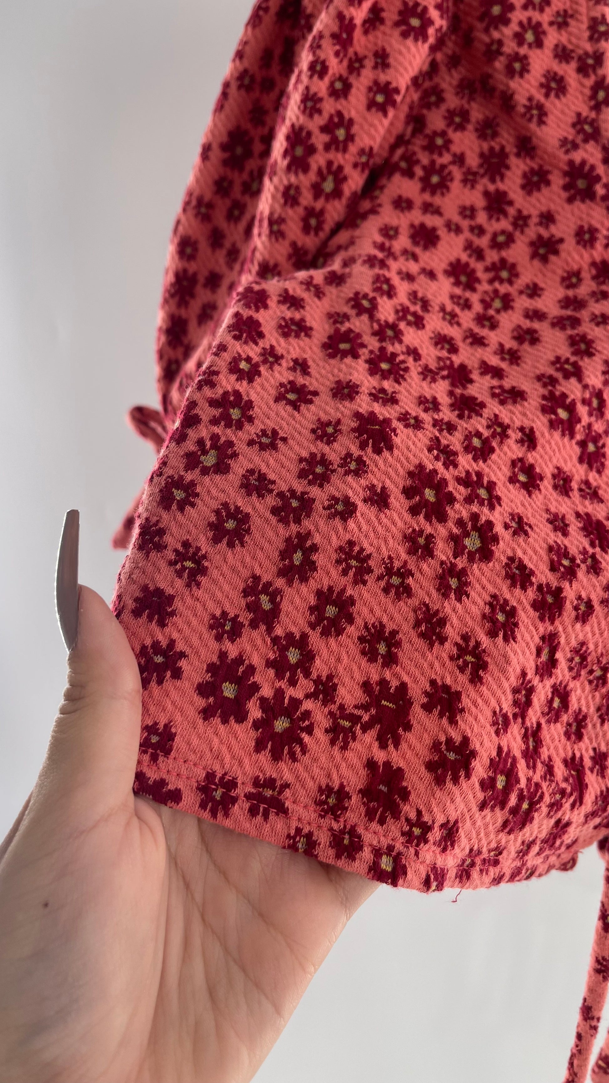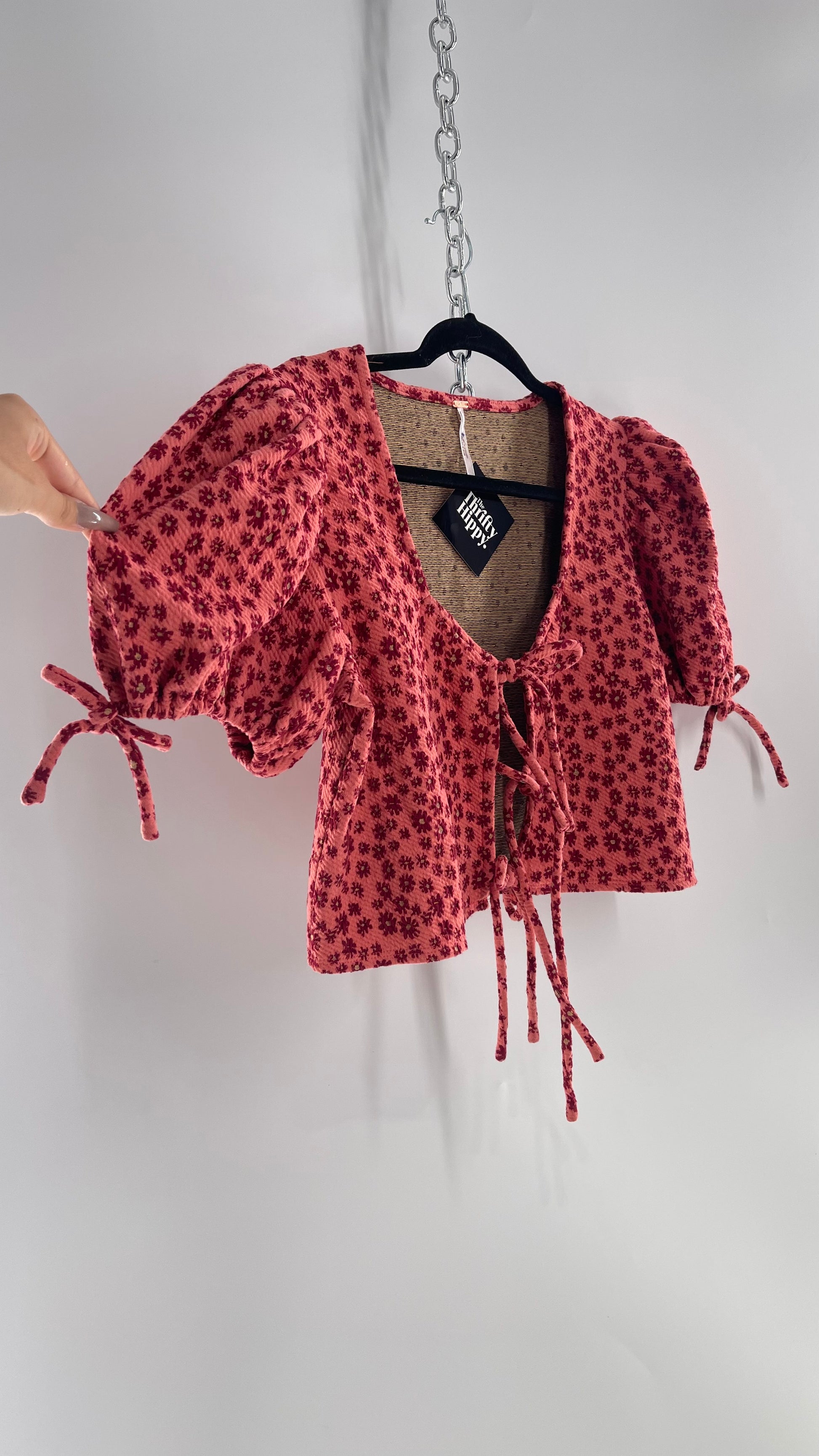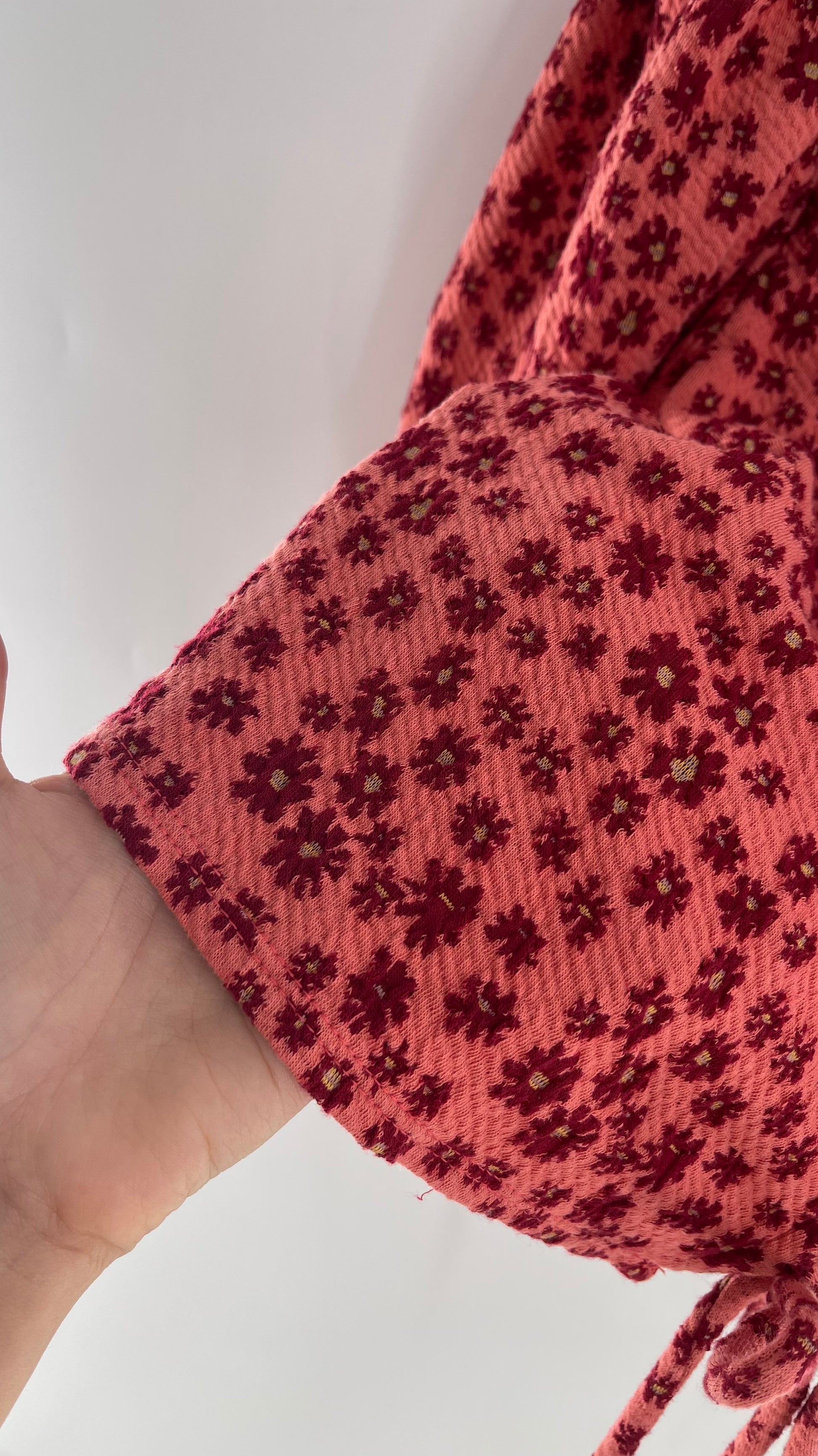Free People Salmon Pink Thick Puff Sleeve Floral Tie Front Blouse (Small)