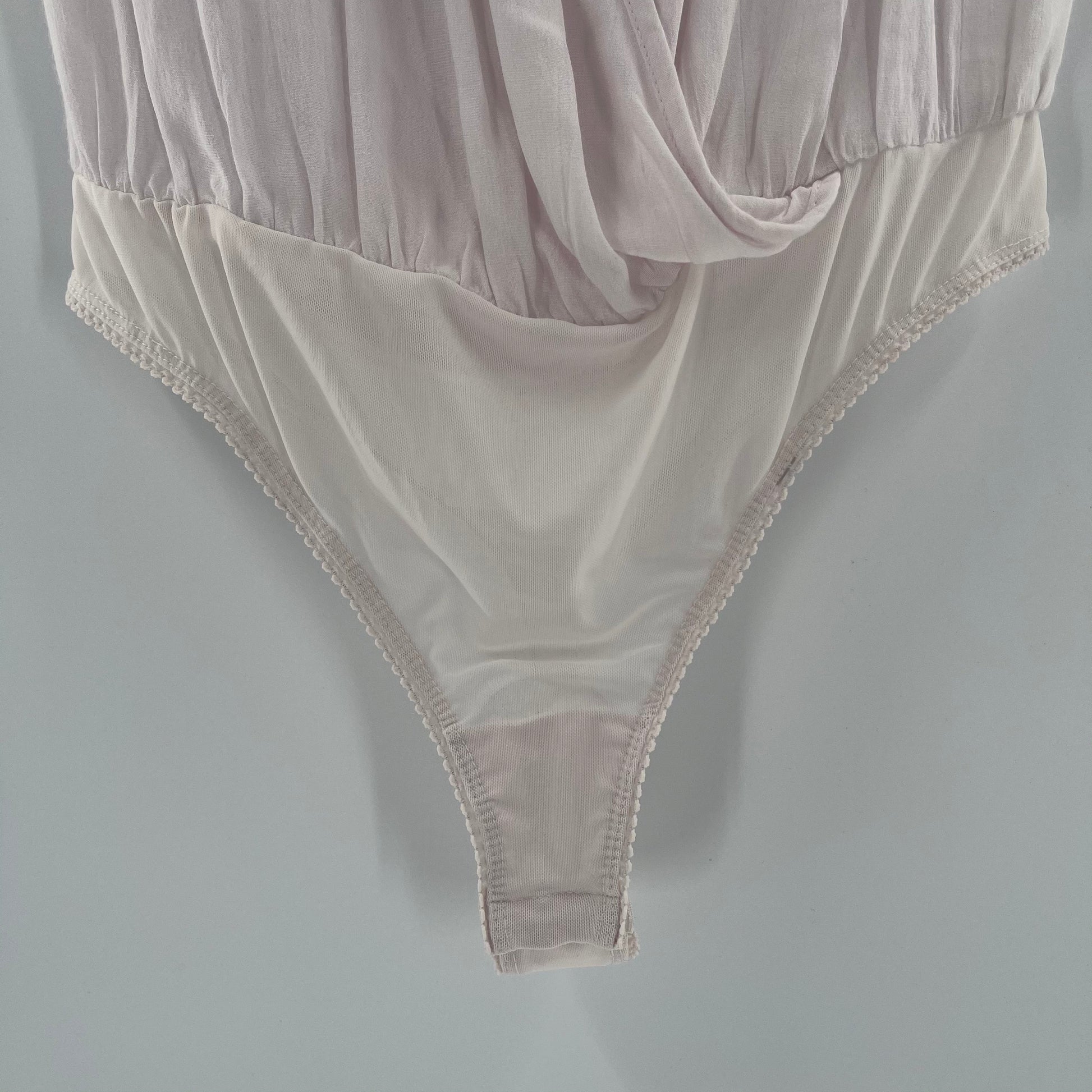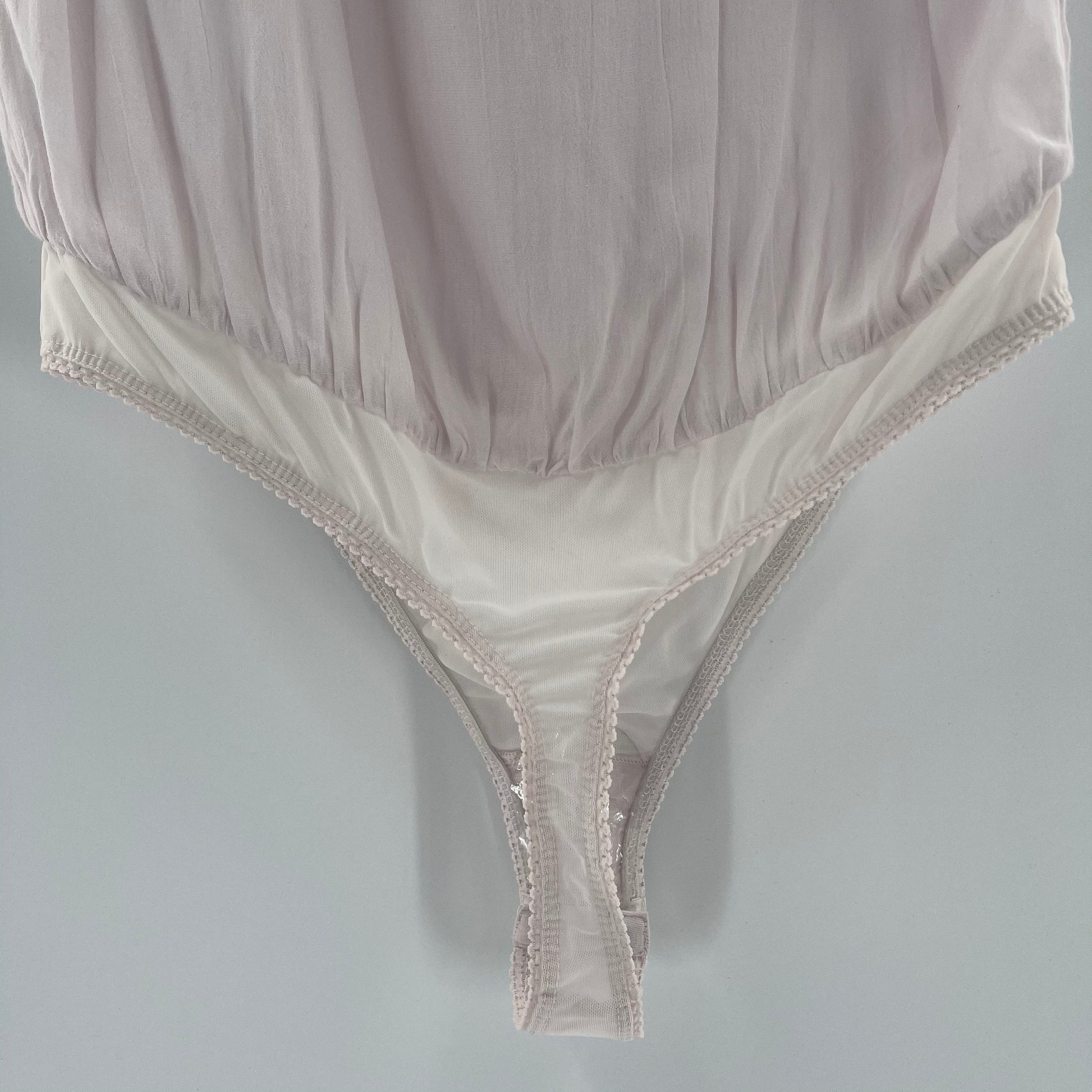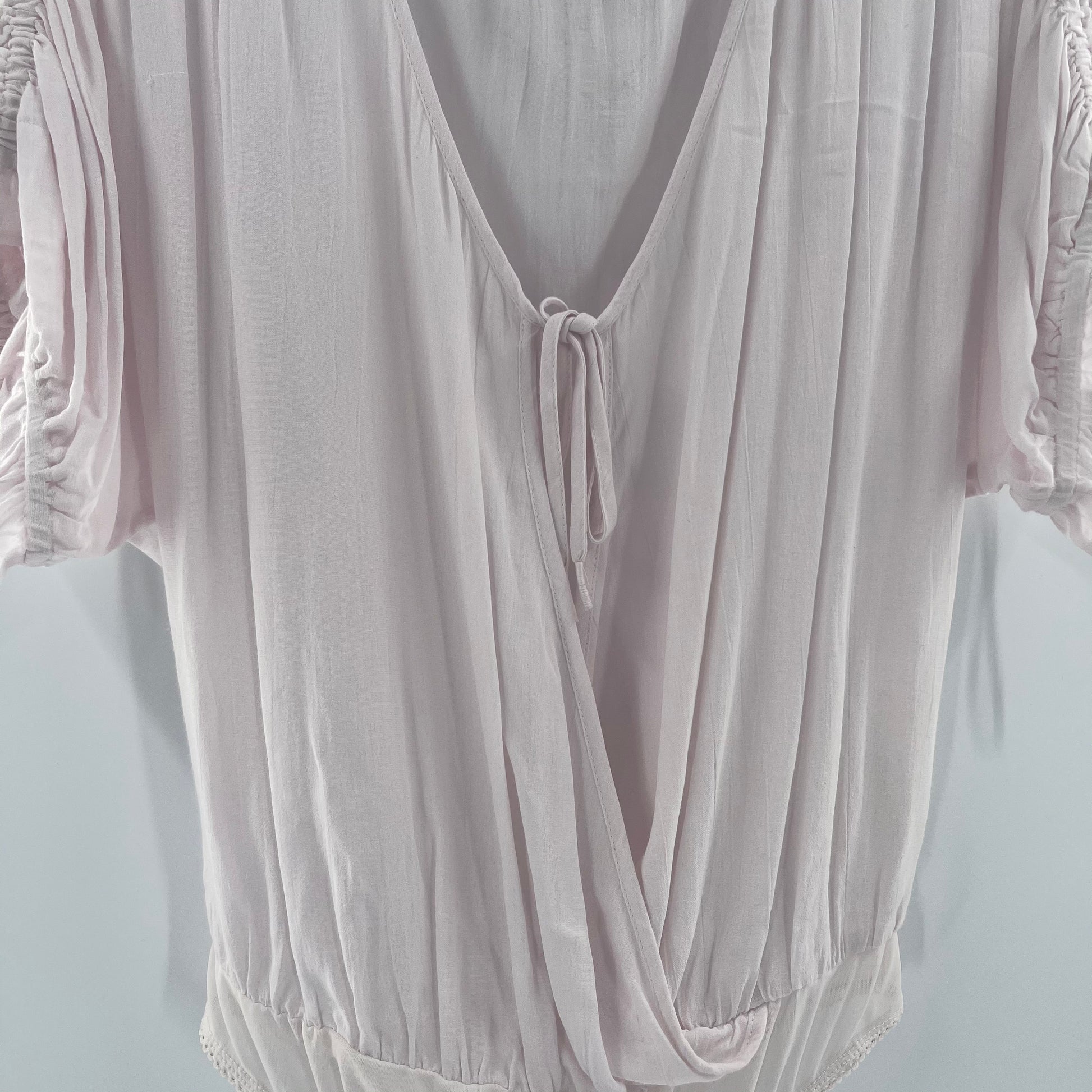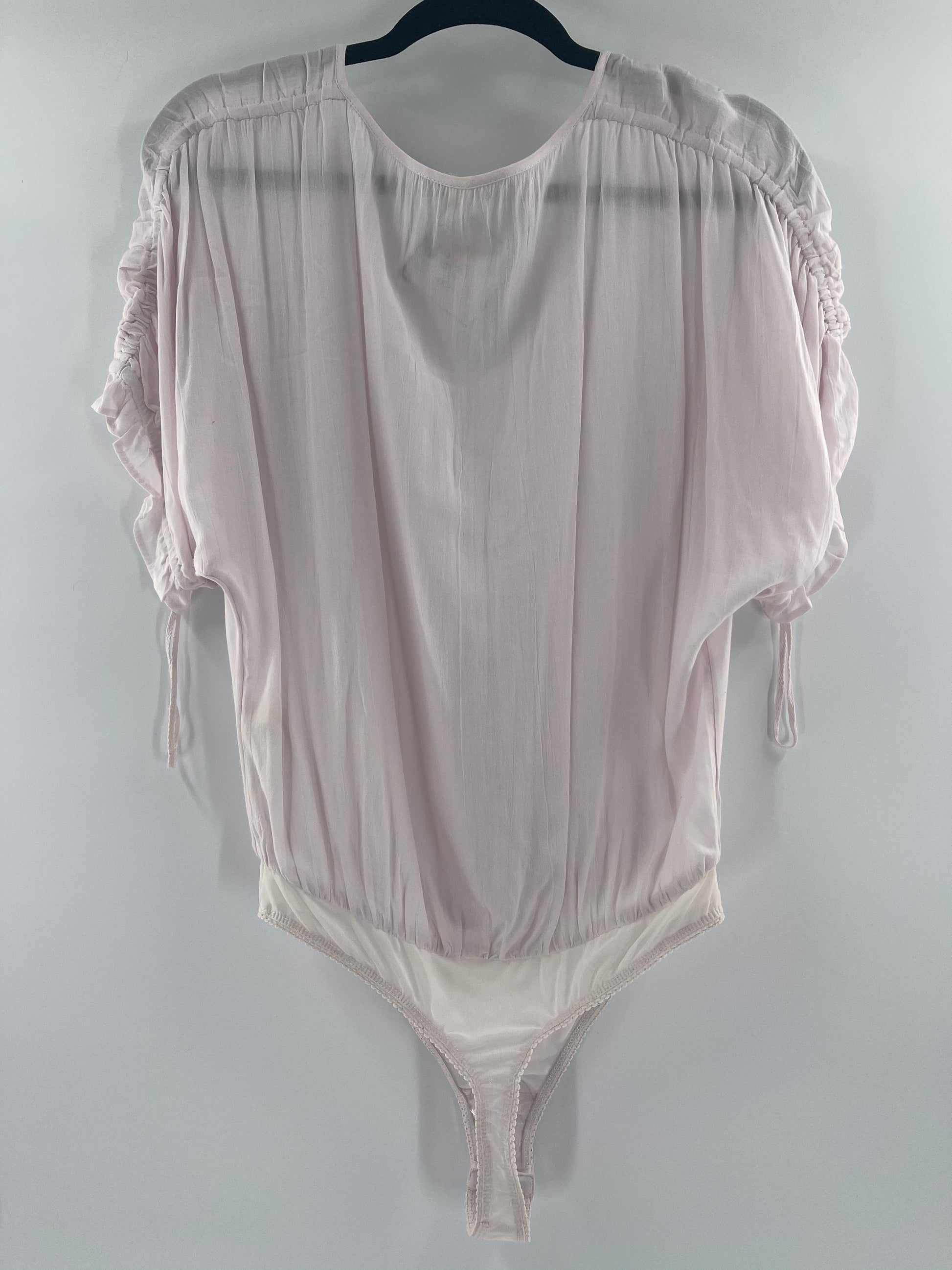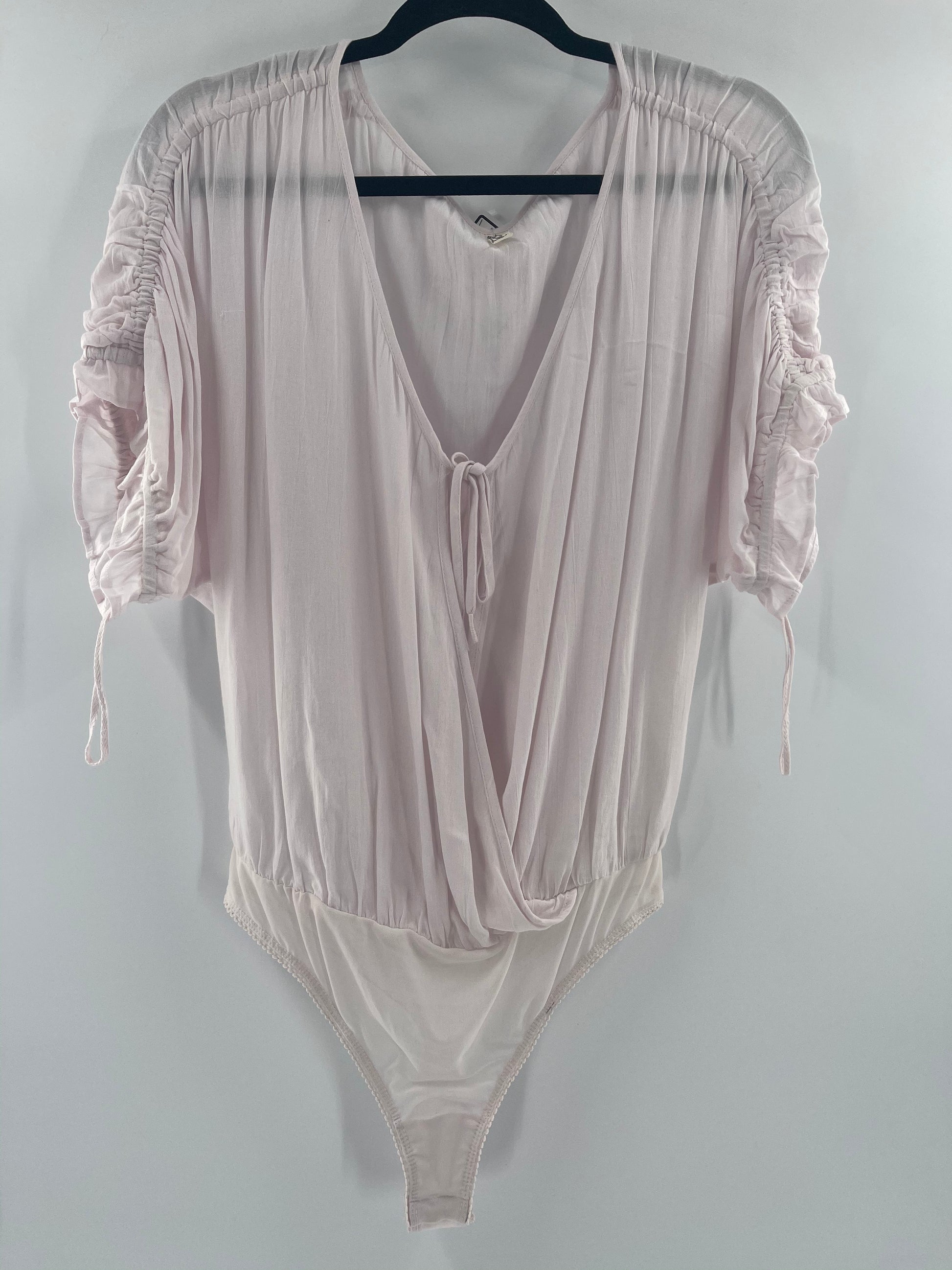 Intimately Free People light pink bodysuit with mesh scalloped lace hem thong and prairie style tie front neckline with ruched sleeves