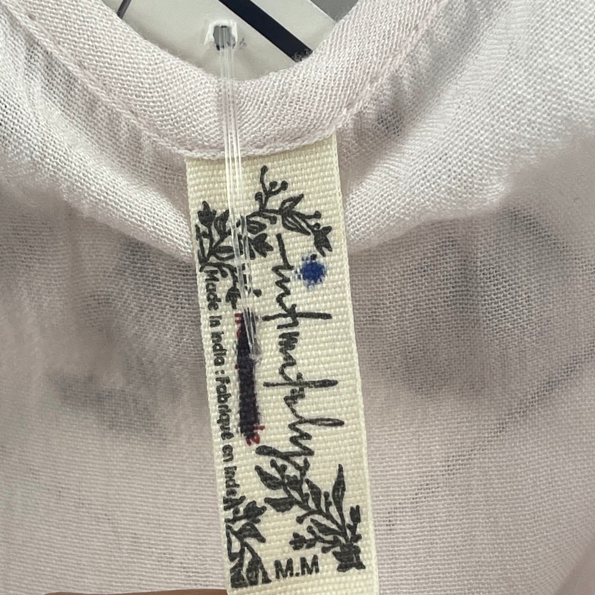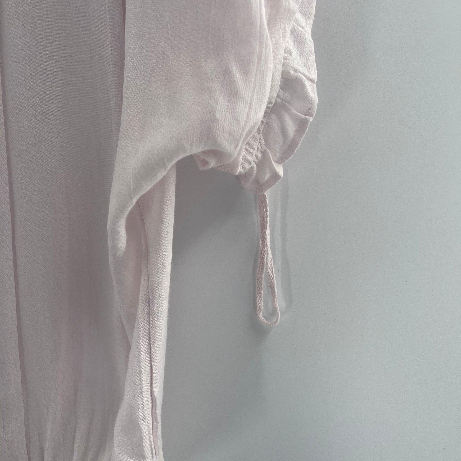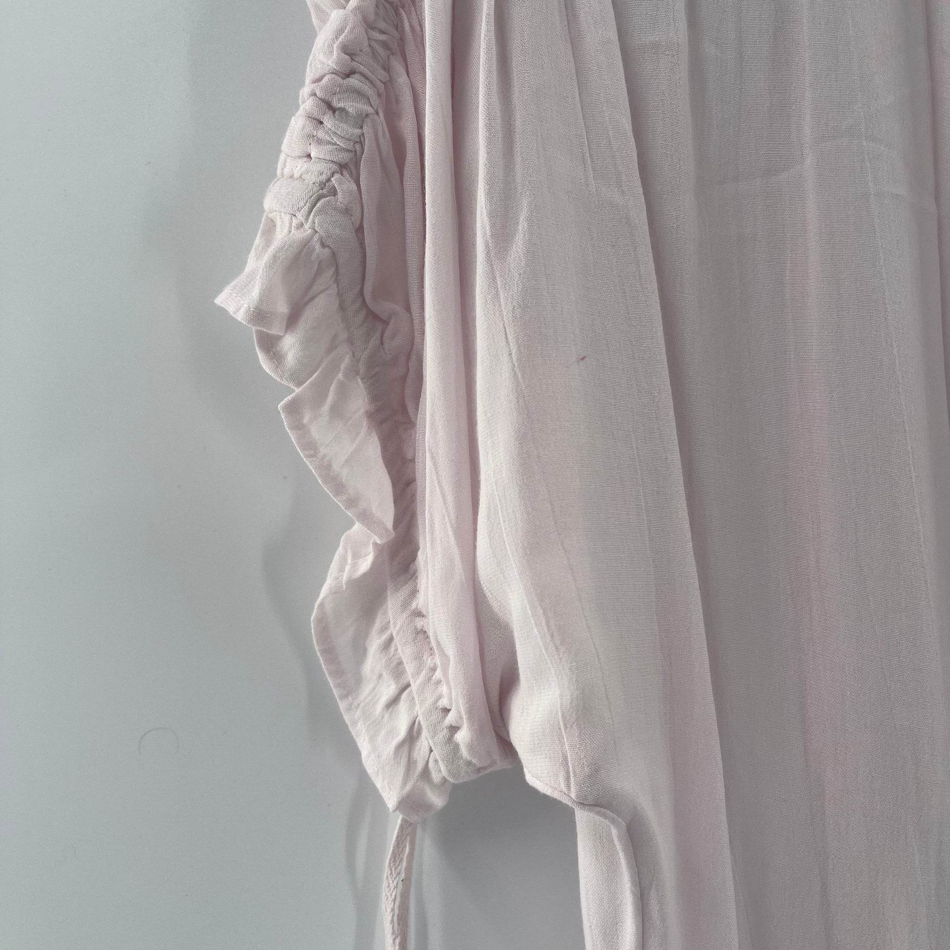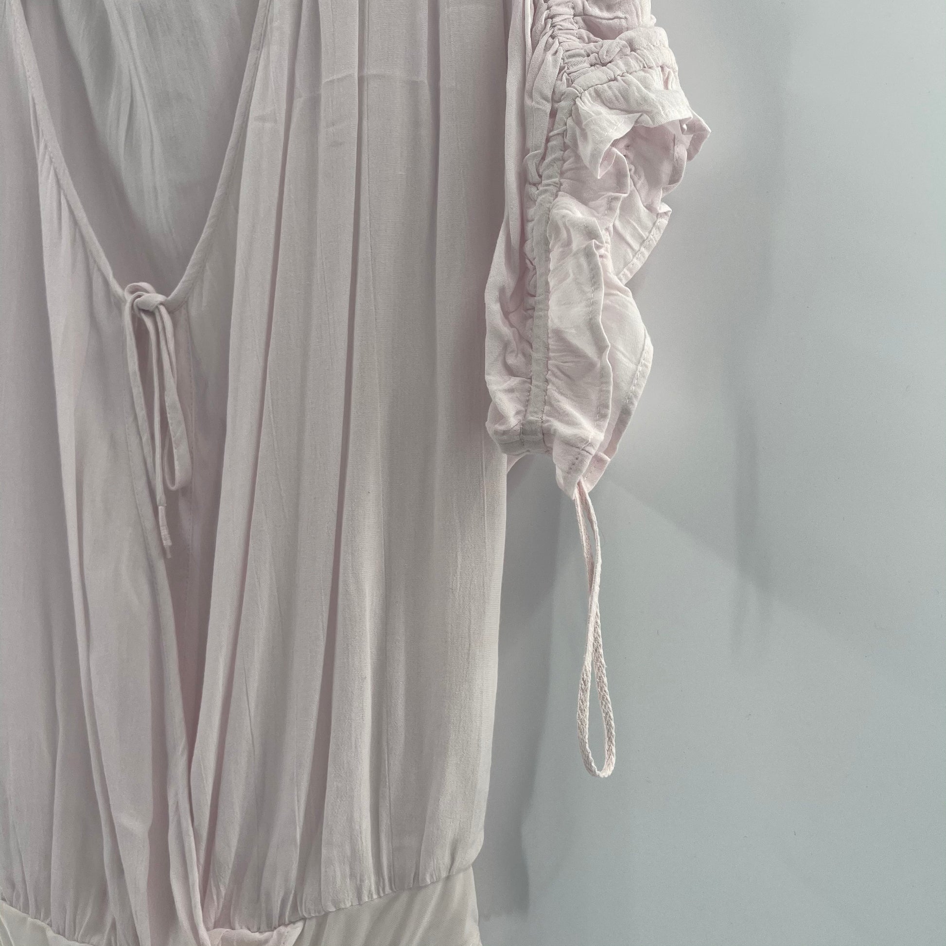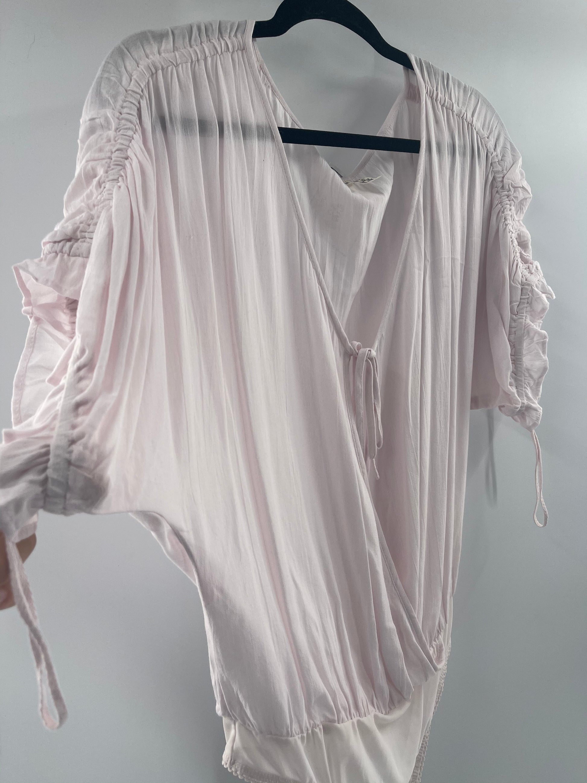 Intimately Free People light pink bodysuit with mesh scalloped lace hem thong and prairie style tie front neckline with ruched sleeves