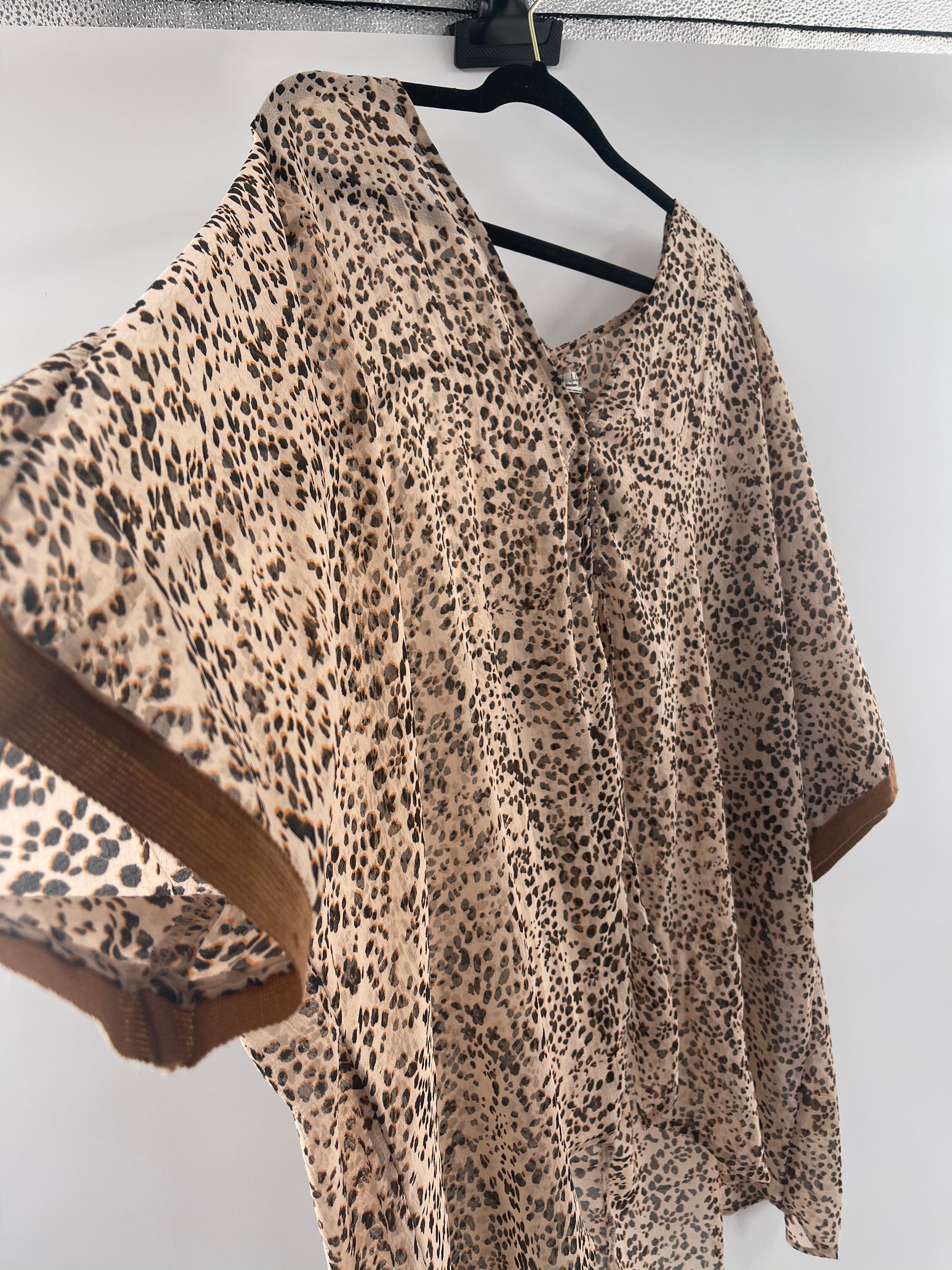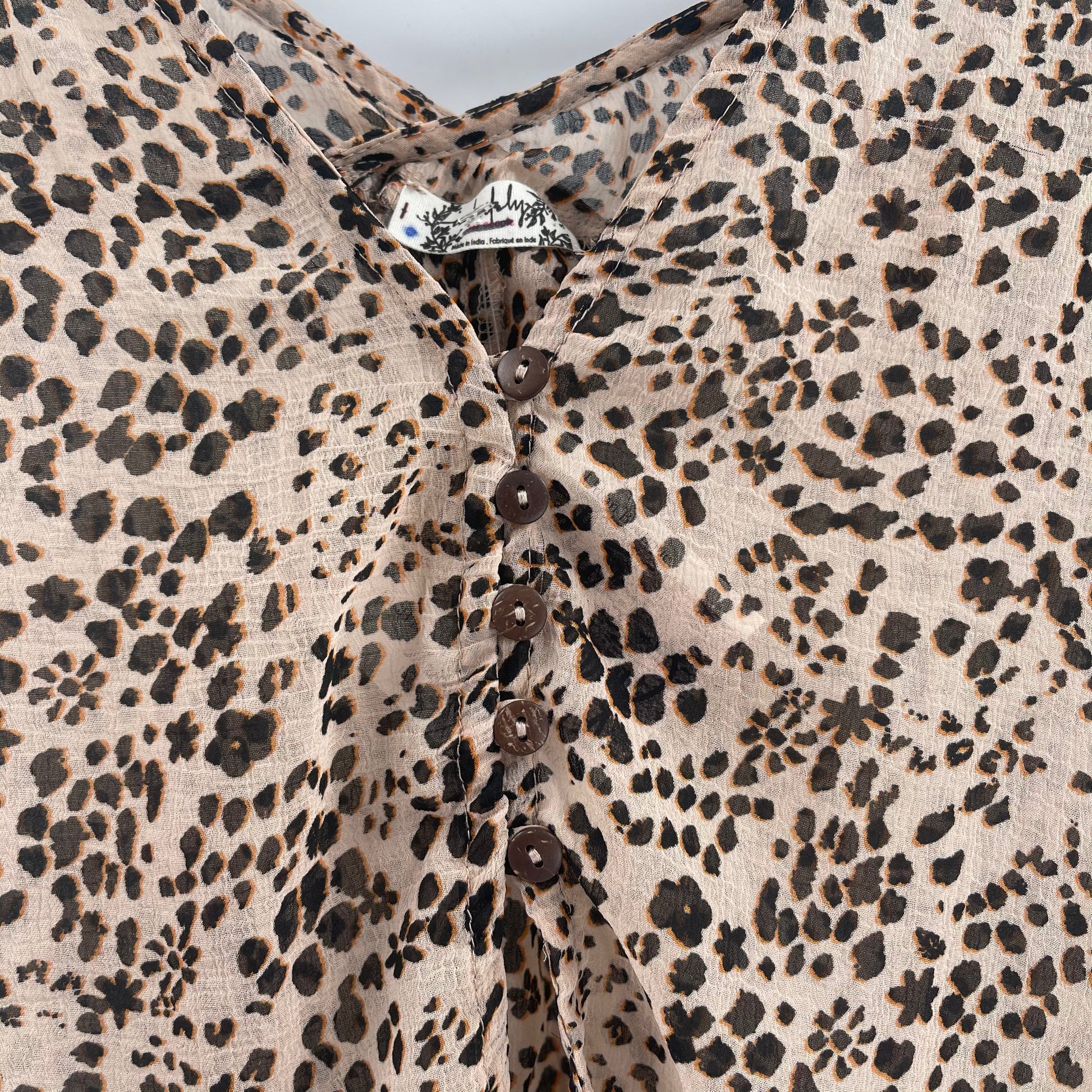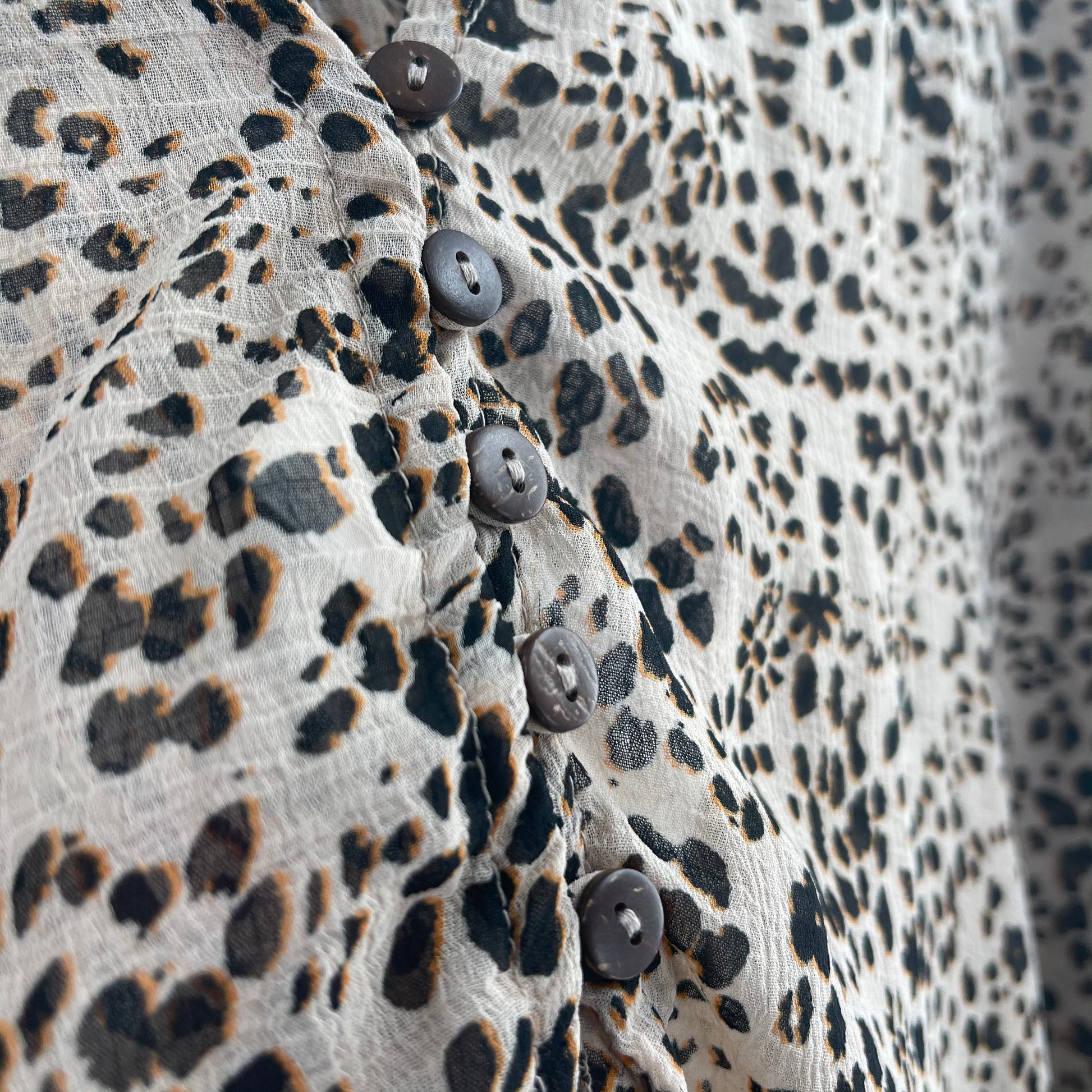 Free People oversized cheetah print blouse with wooden buttons, vented front, and slightly tapered short sleeves