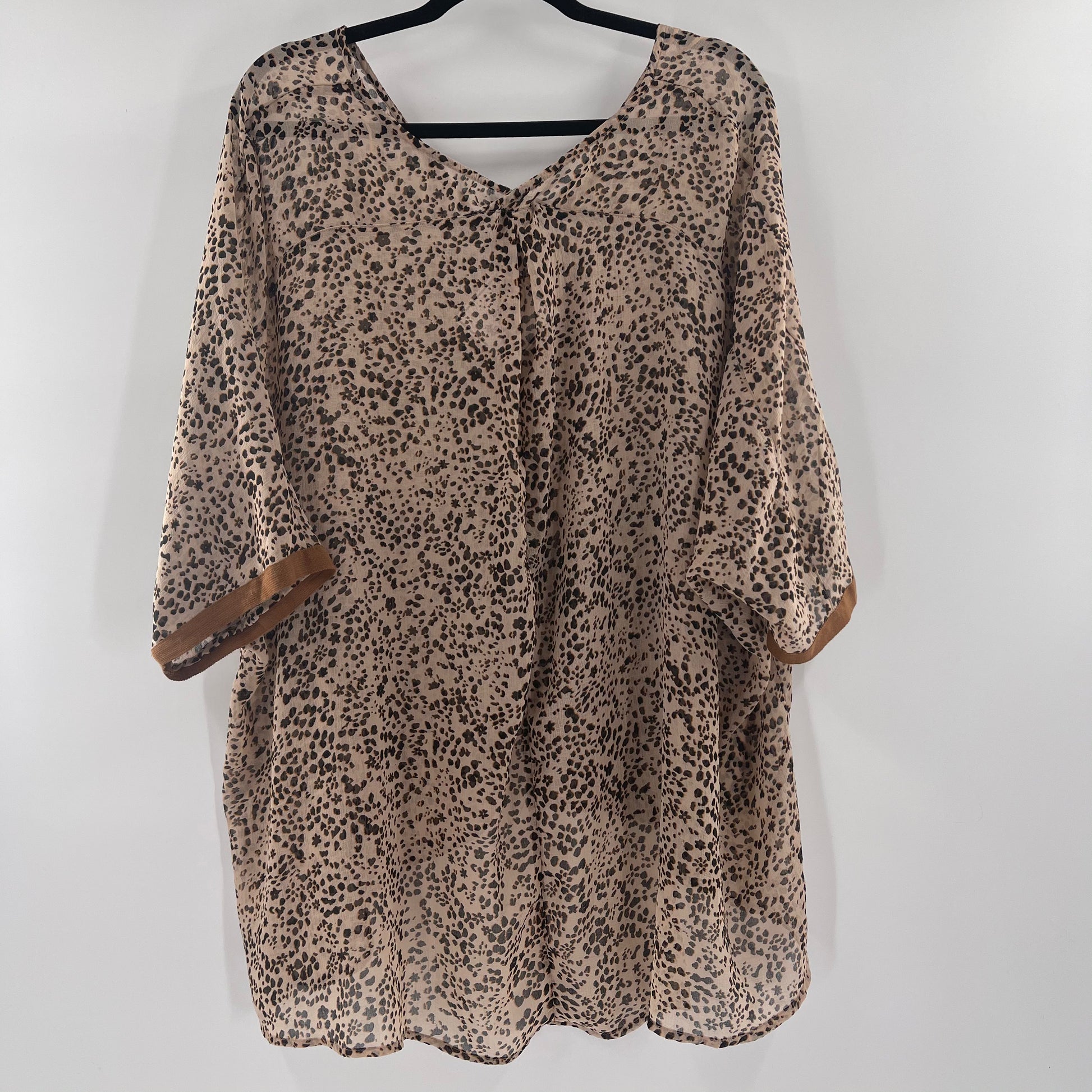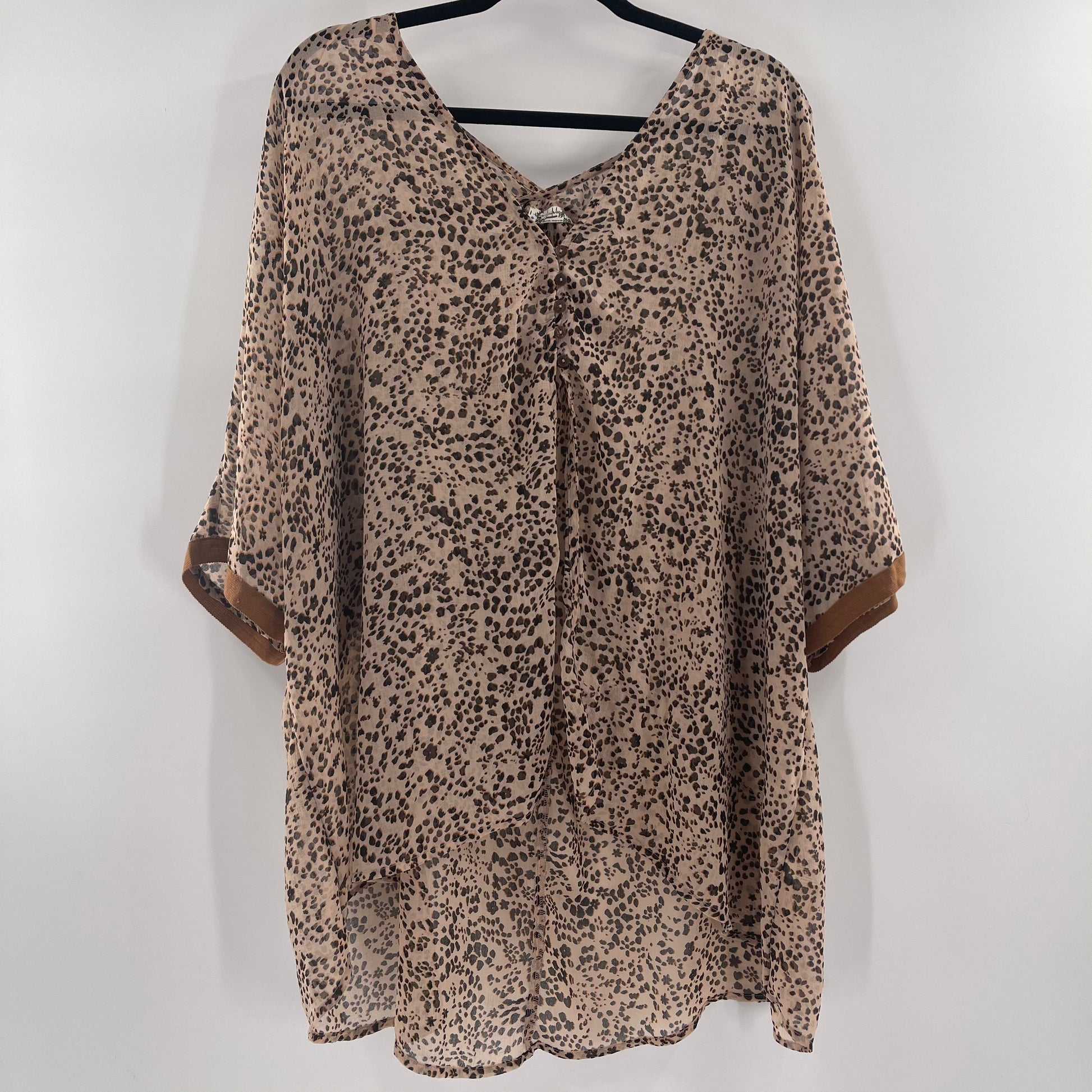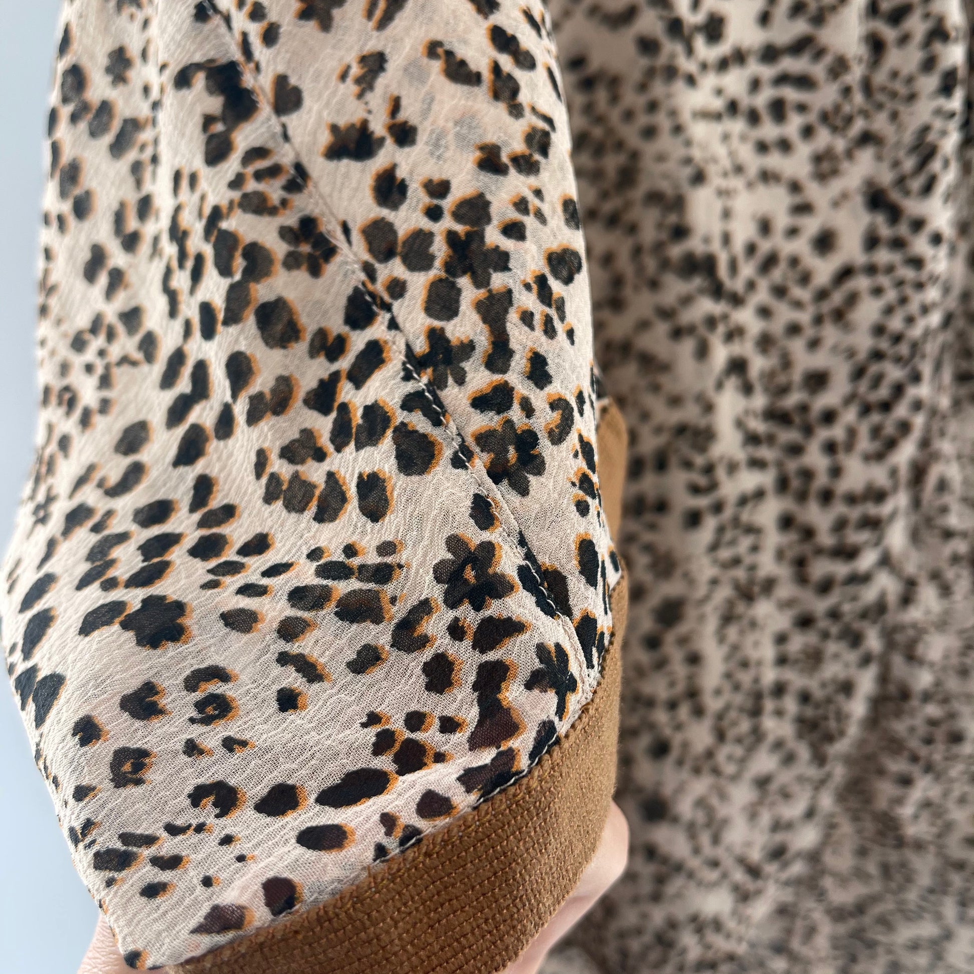 Free People oversized cheetah print blouse with wooden buttons, vented front, and slightly tapered short sleeves