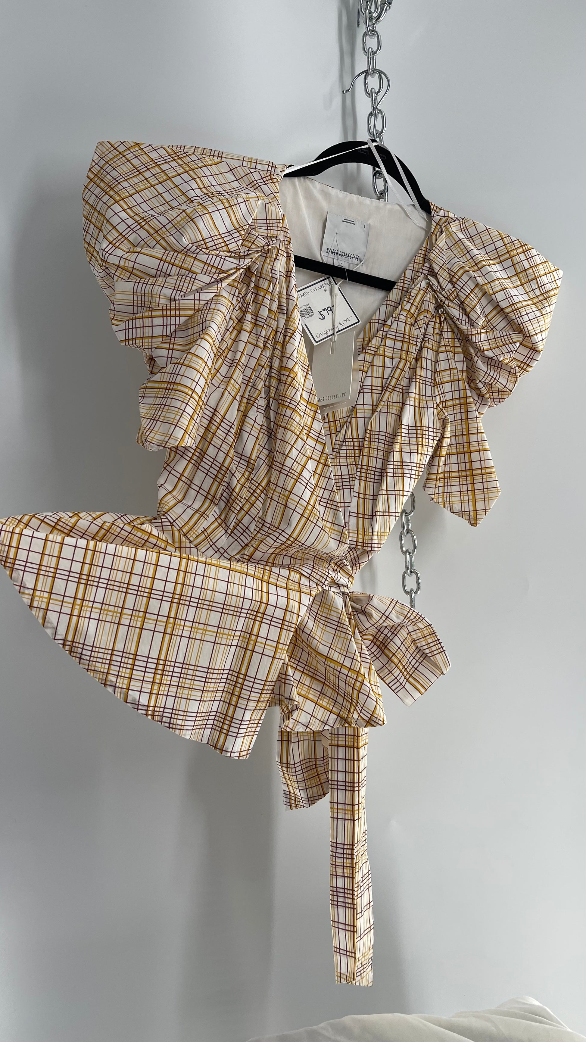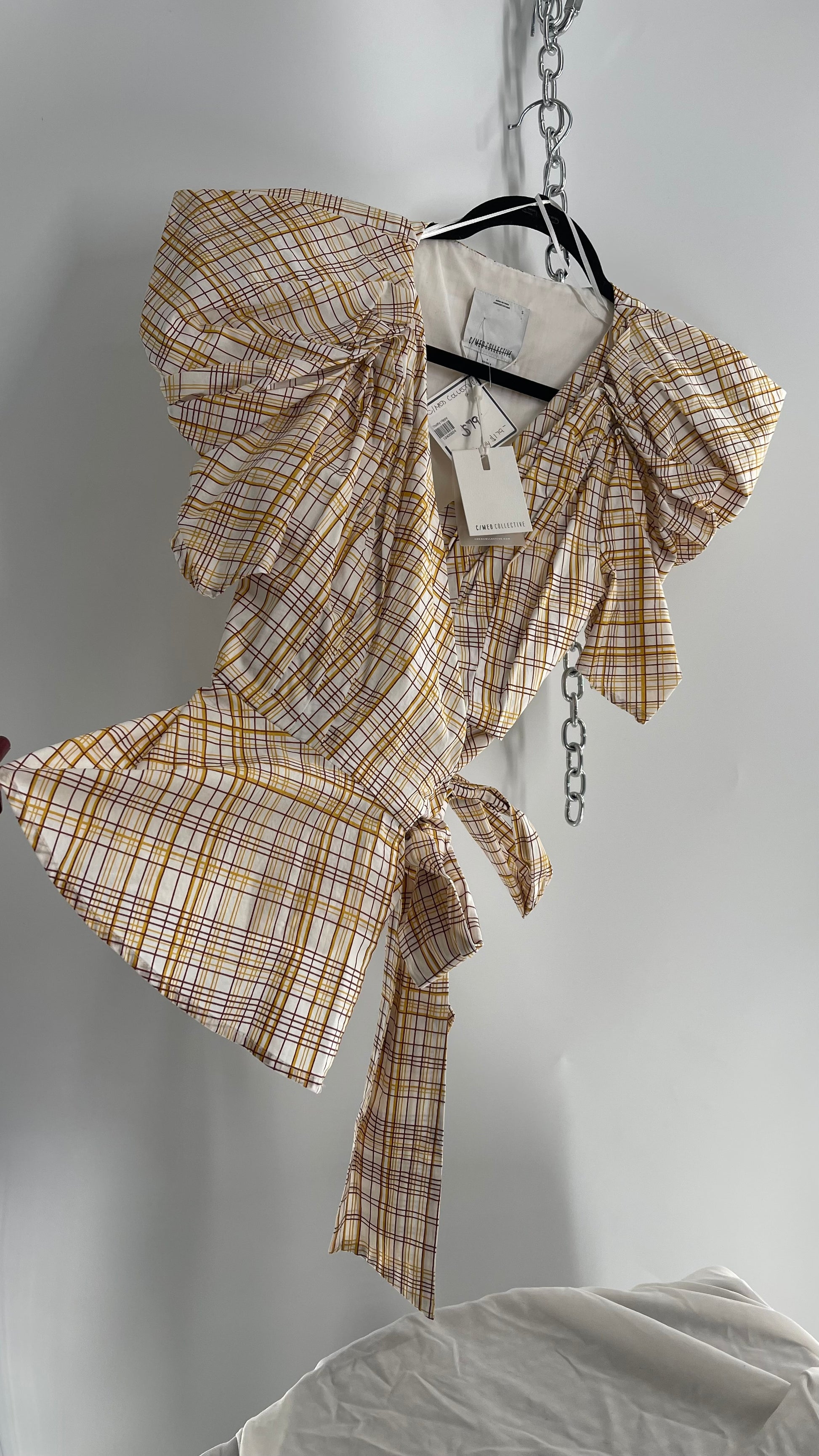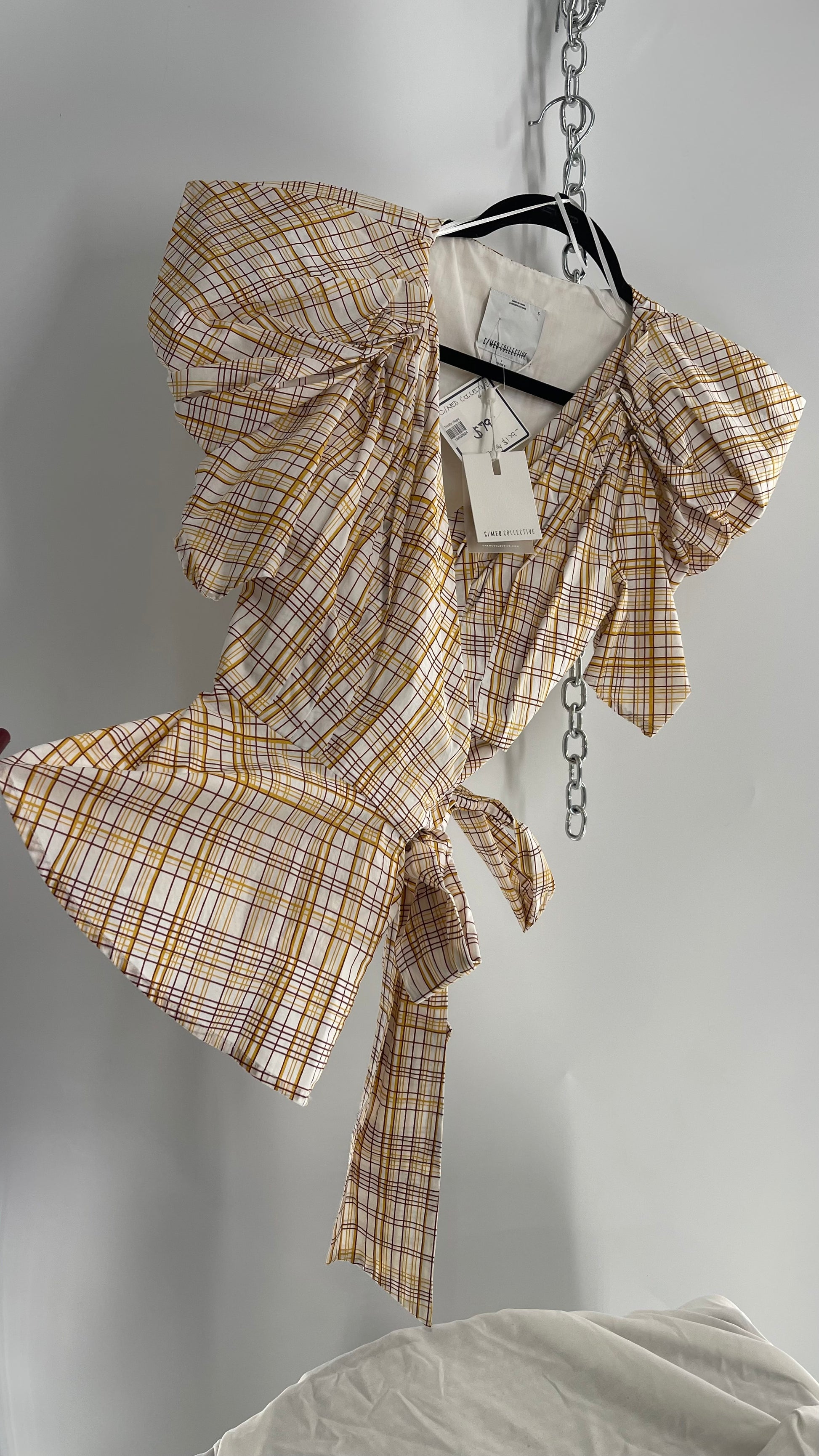 Anthropologie NWT C/MEO COLLECTIVE peplum top with puff sleeves, pleated bust, wrap around detail and yellow/brown plaid pattern